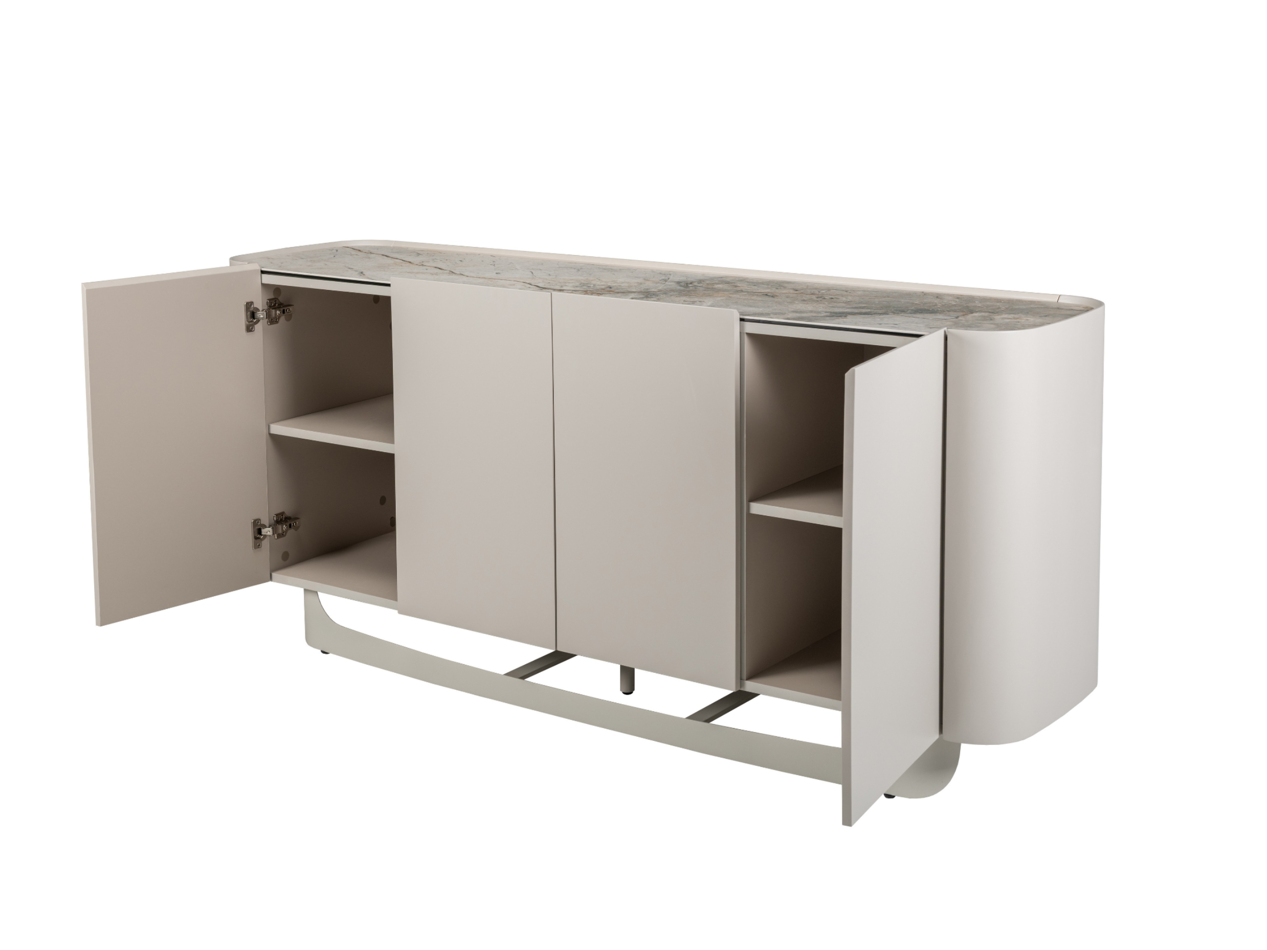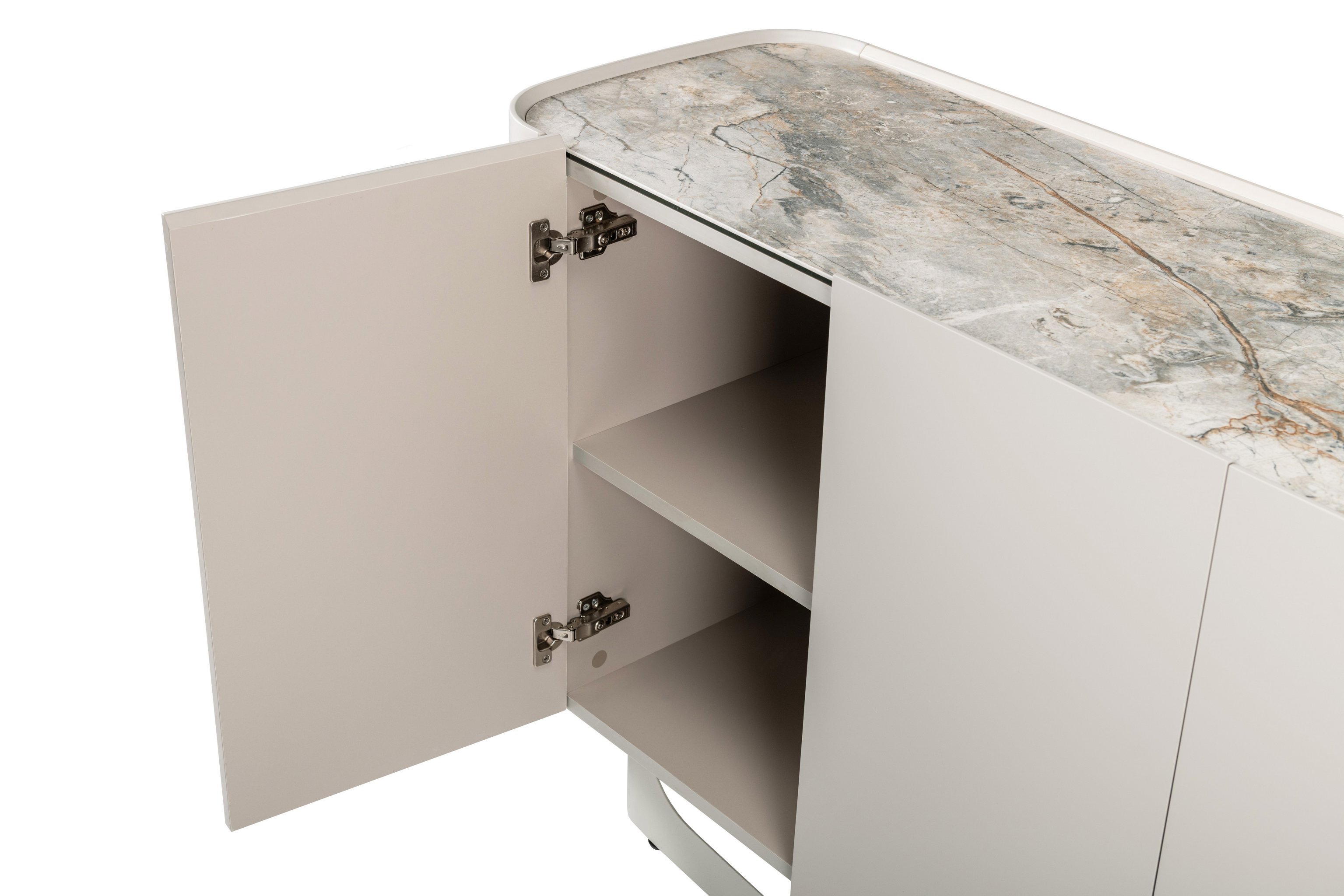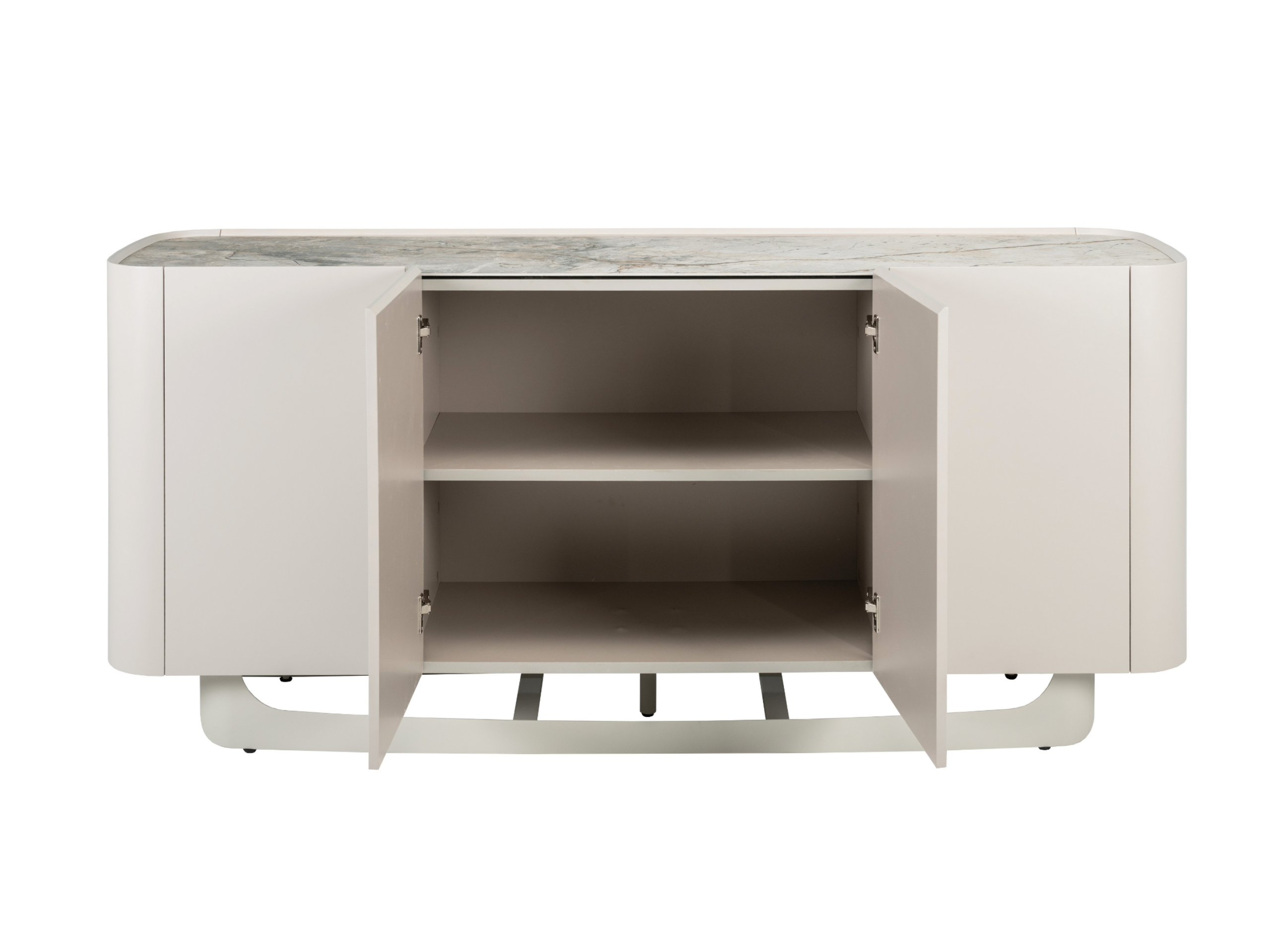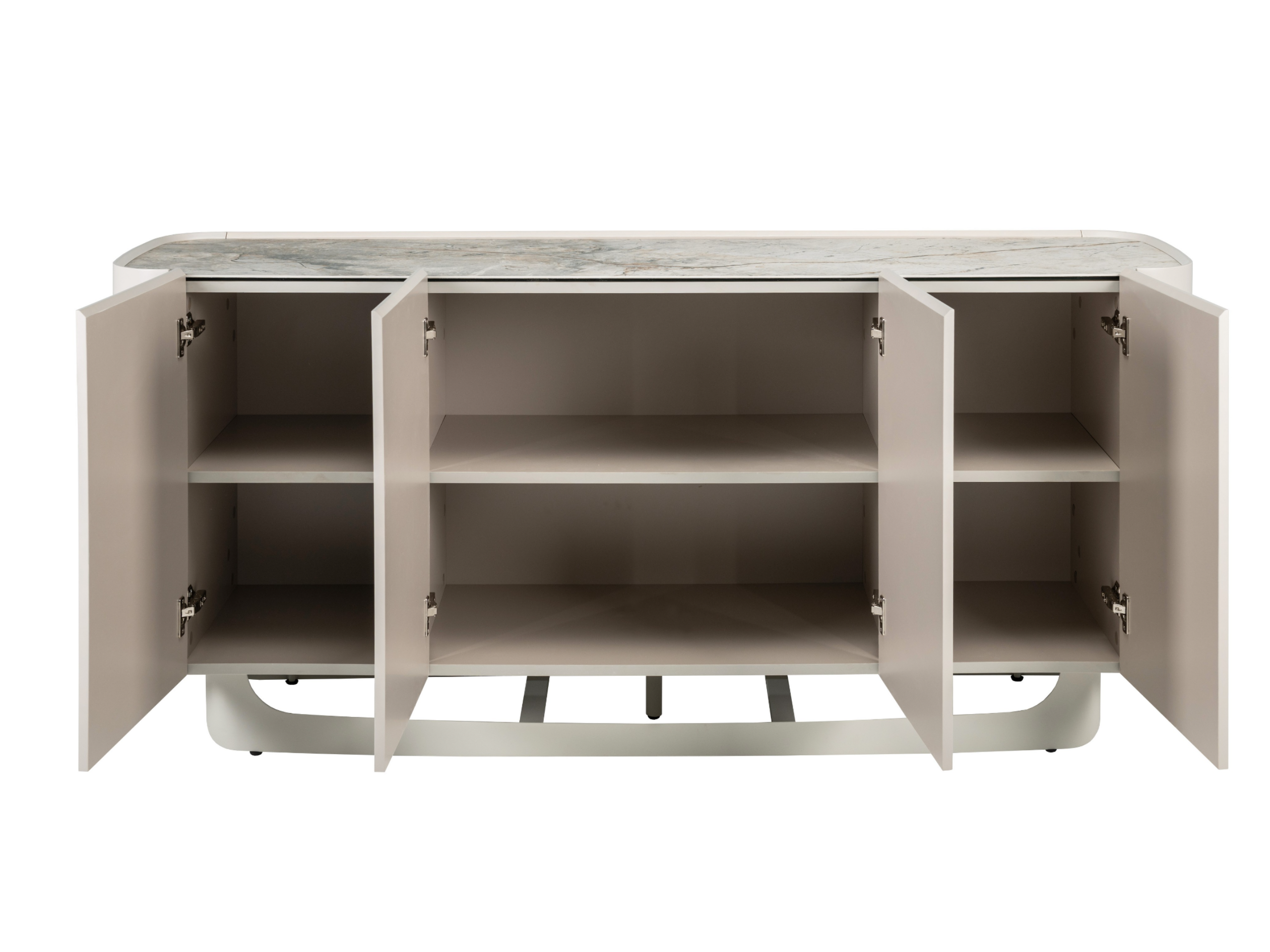 Буфет «Арно» сілвер рівер + айворі перетворює звичне зберігання речей на естетичне задоволення. Стільниця з матової кераміки, доповнена гартованим склом, нагадує фактуру природного каменю: глибокі переливи відтінку сілвер рівер створюють враження живої поверхні, яка оживає при денному чи штучному світлі.
