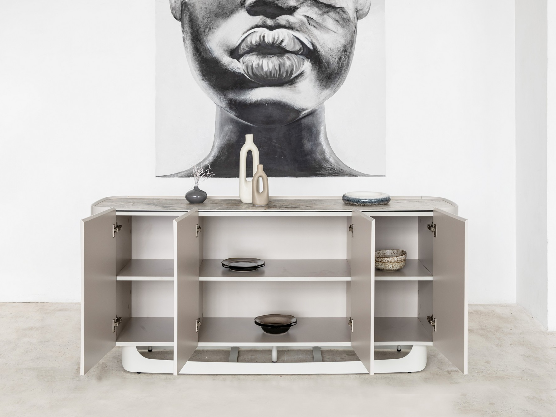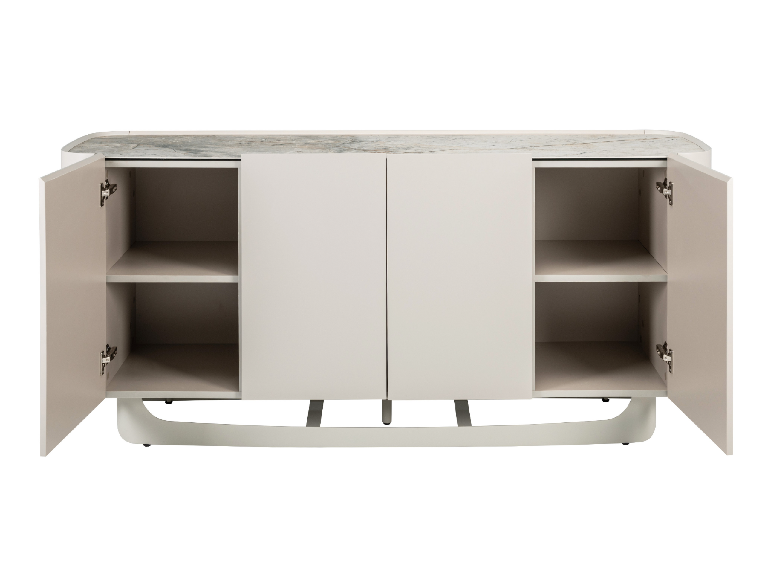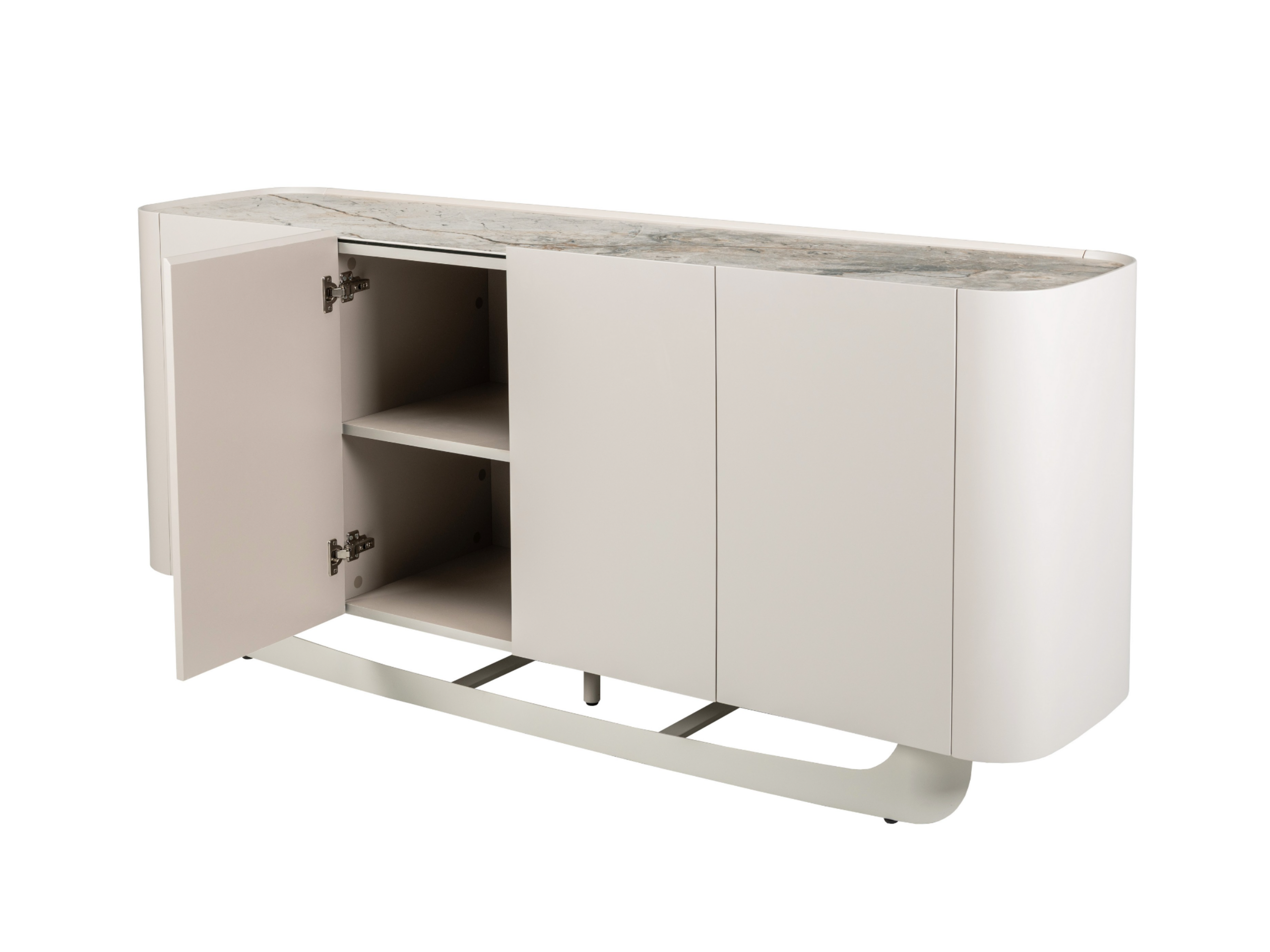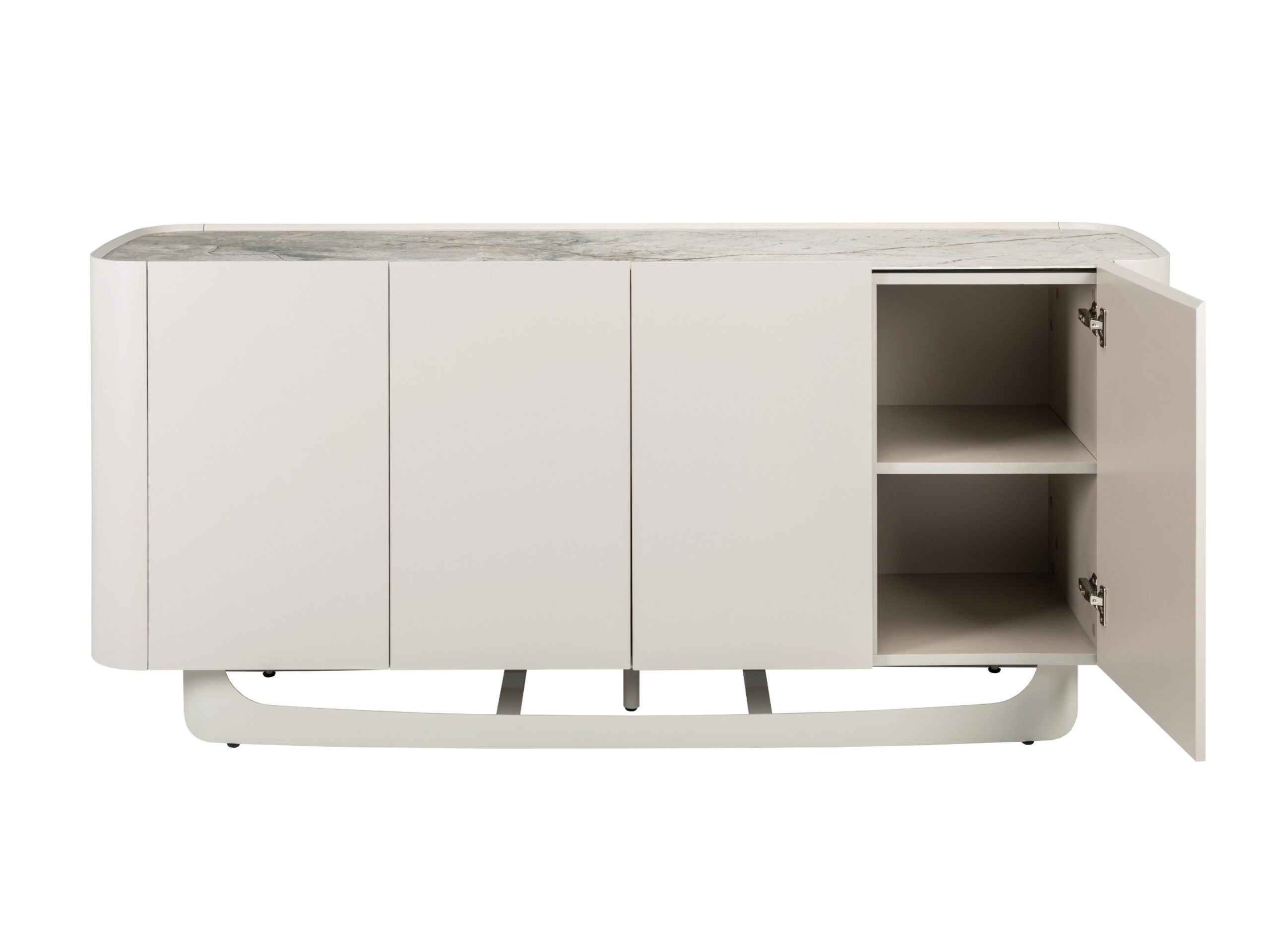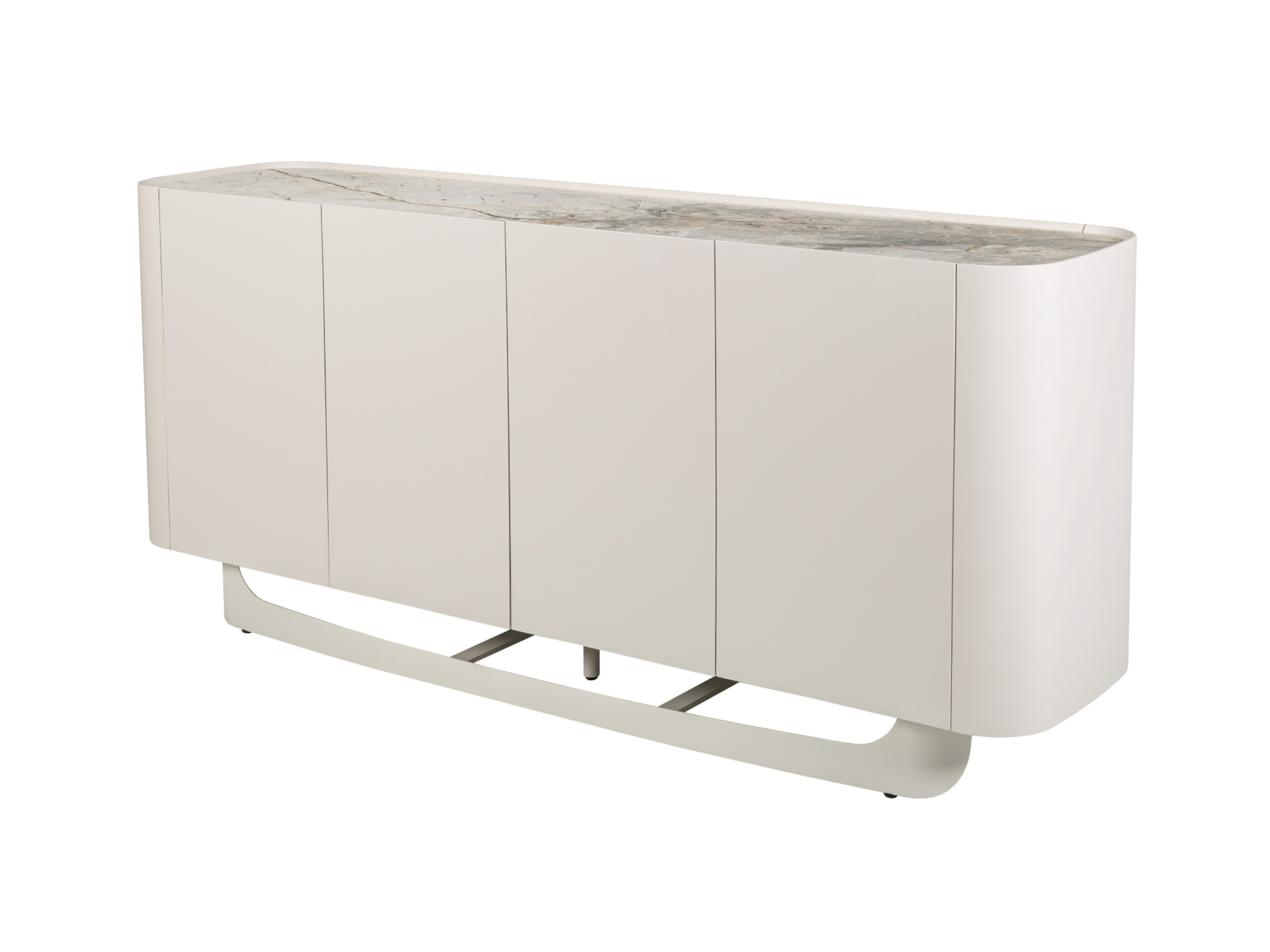 Буфет «Арно» сілвер рівер + айворі перетворює звичне зберігання речей на естетичне задоволення. Стільниця з матової кераміки, доповнена гартованим склом, нагадує фактуру природного каменю: глибокі переливи відтінку сілвер рівер створюють враження живої поверхні, яка оживає при денному чи штучному світлі.
