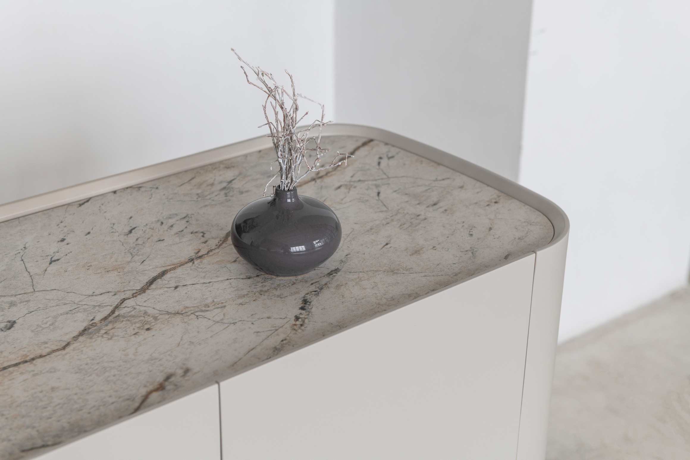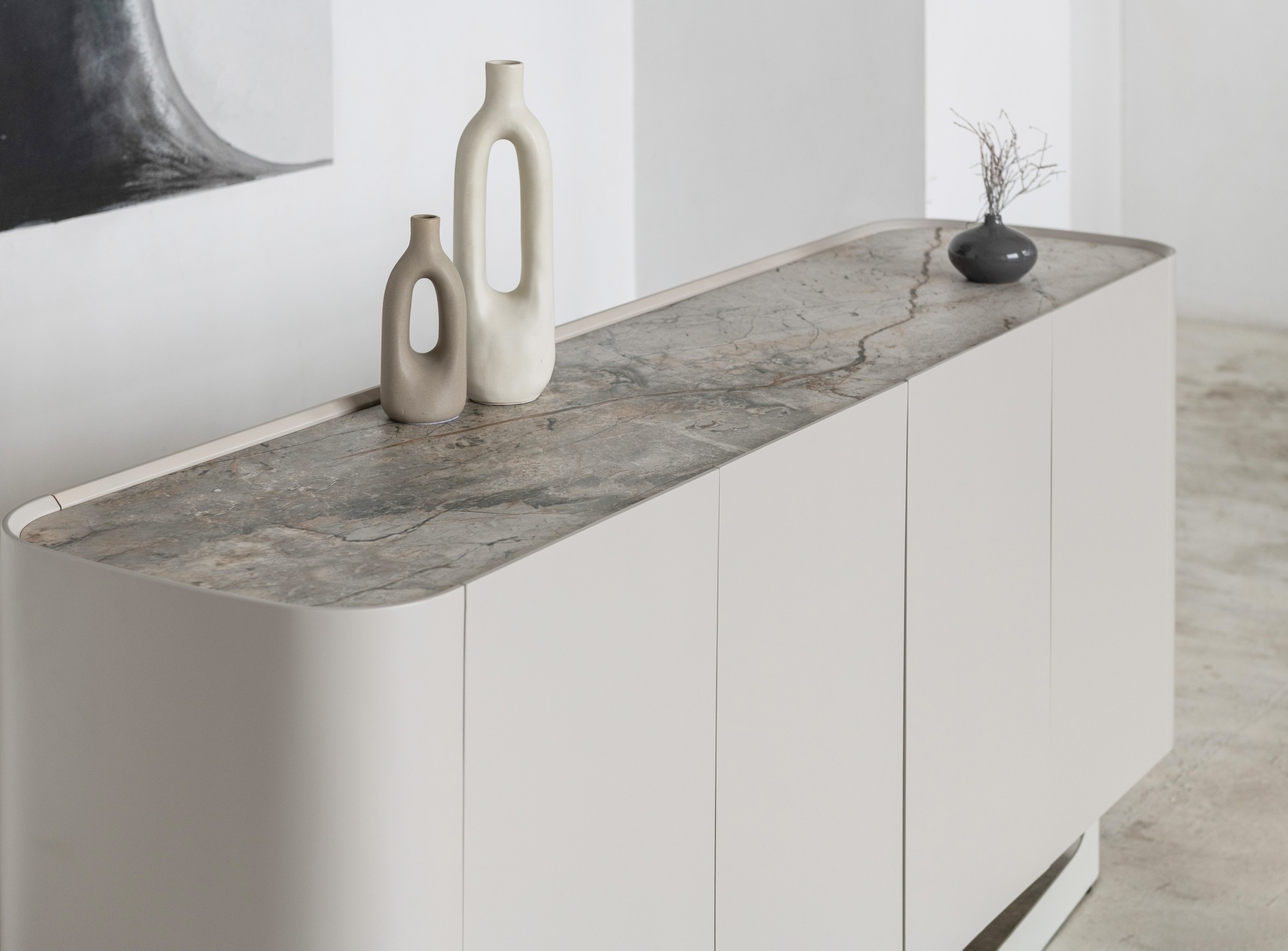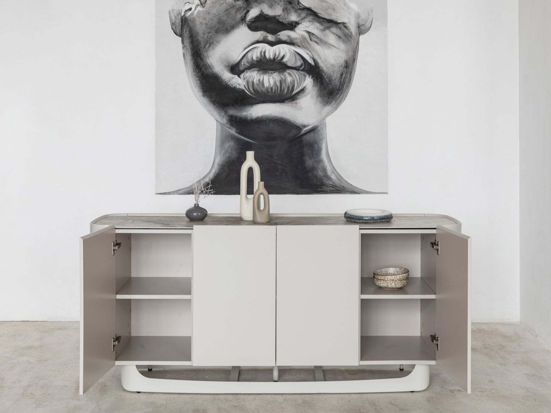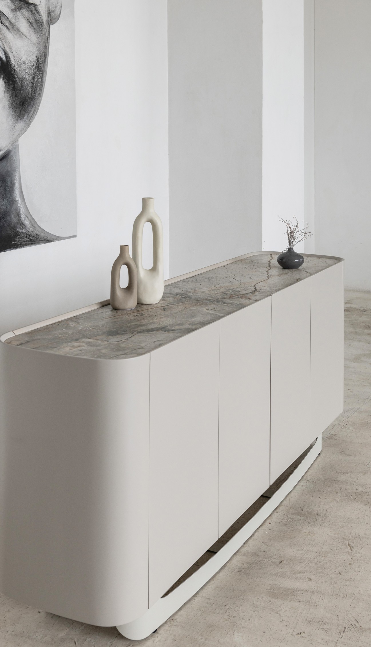 Буфет «Арно» сілвер рівер + айворі перетворює звичне зберігання речей на естетичне задоволення. Стільниця з матової кераміки, доповнена гартованим склом, нагадує фактуру природного каменю: глибокі переливи відтінку сілвер рівер створюють враження живої поверхні, яка оживає при денному чи штучному світлі.