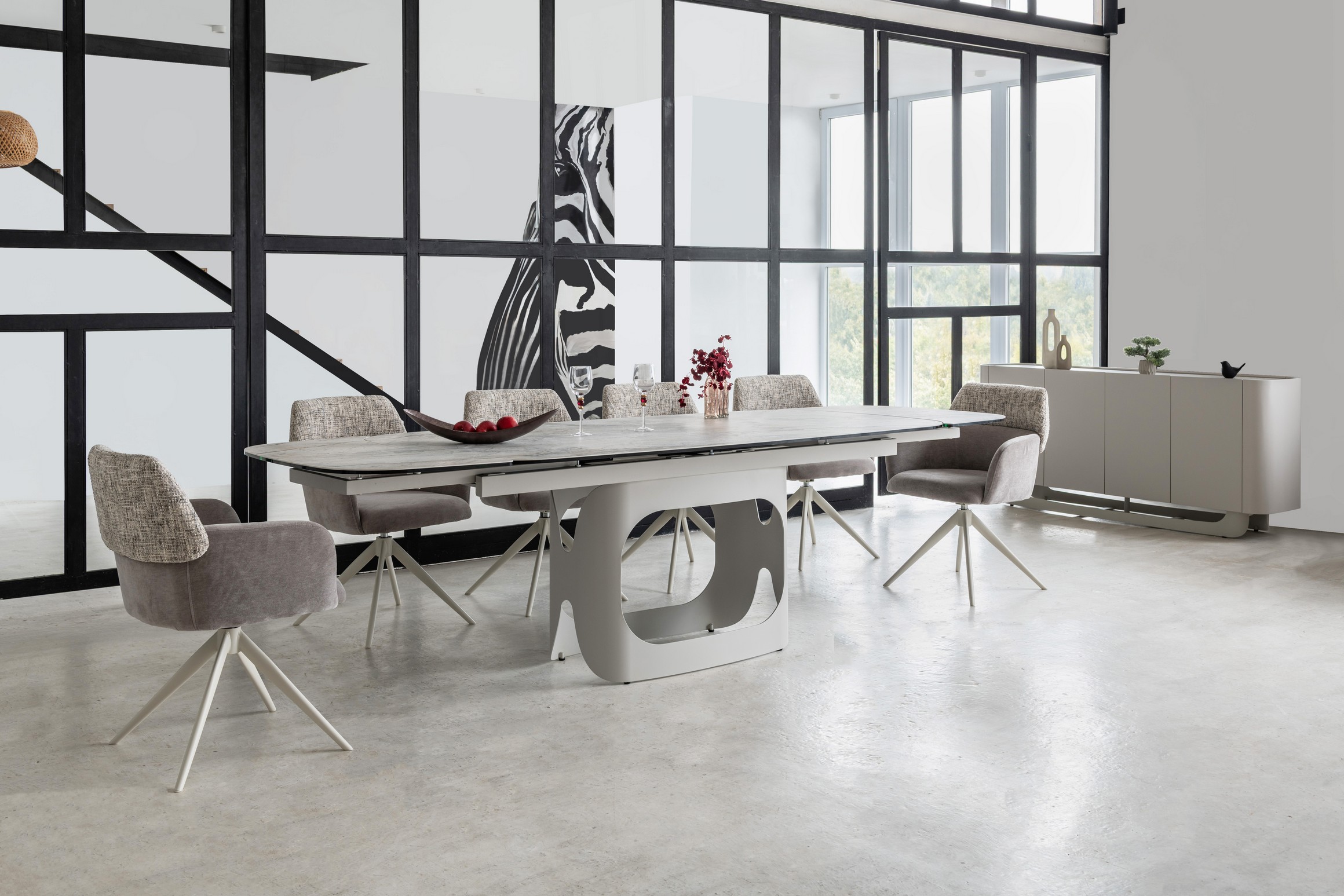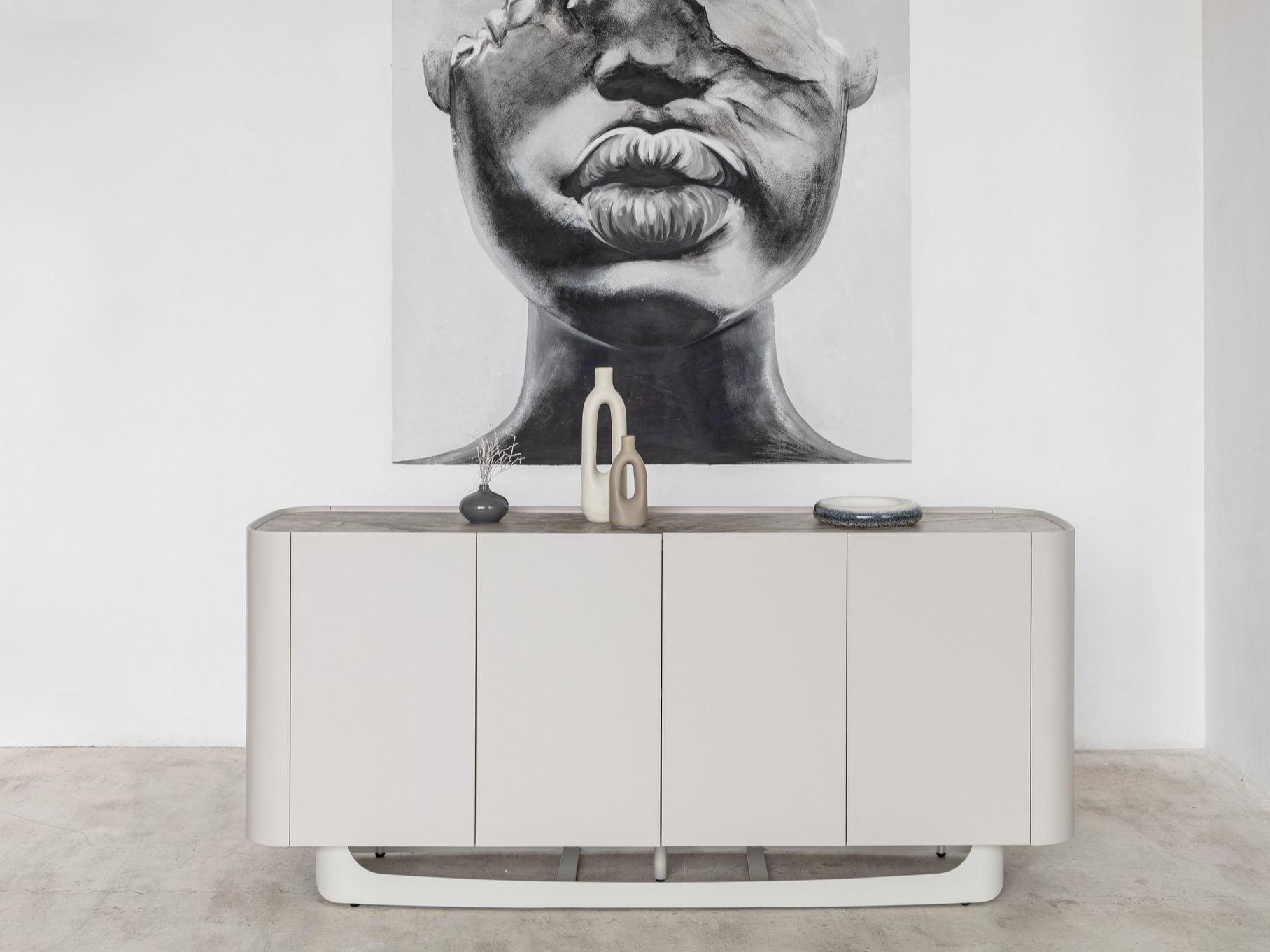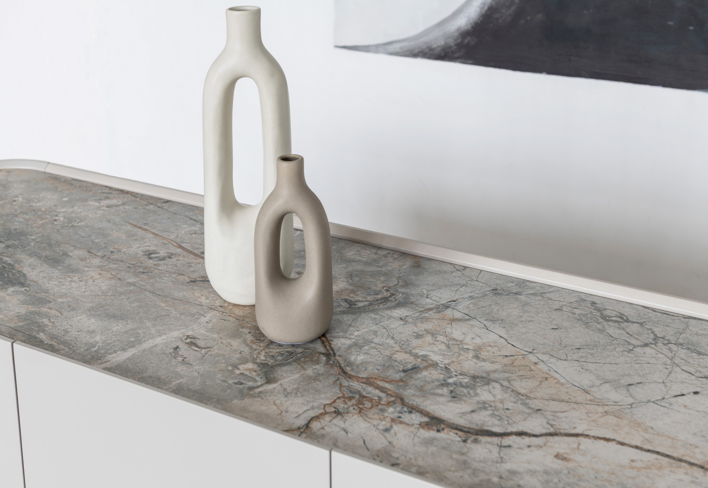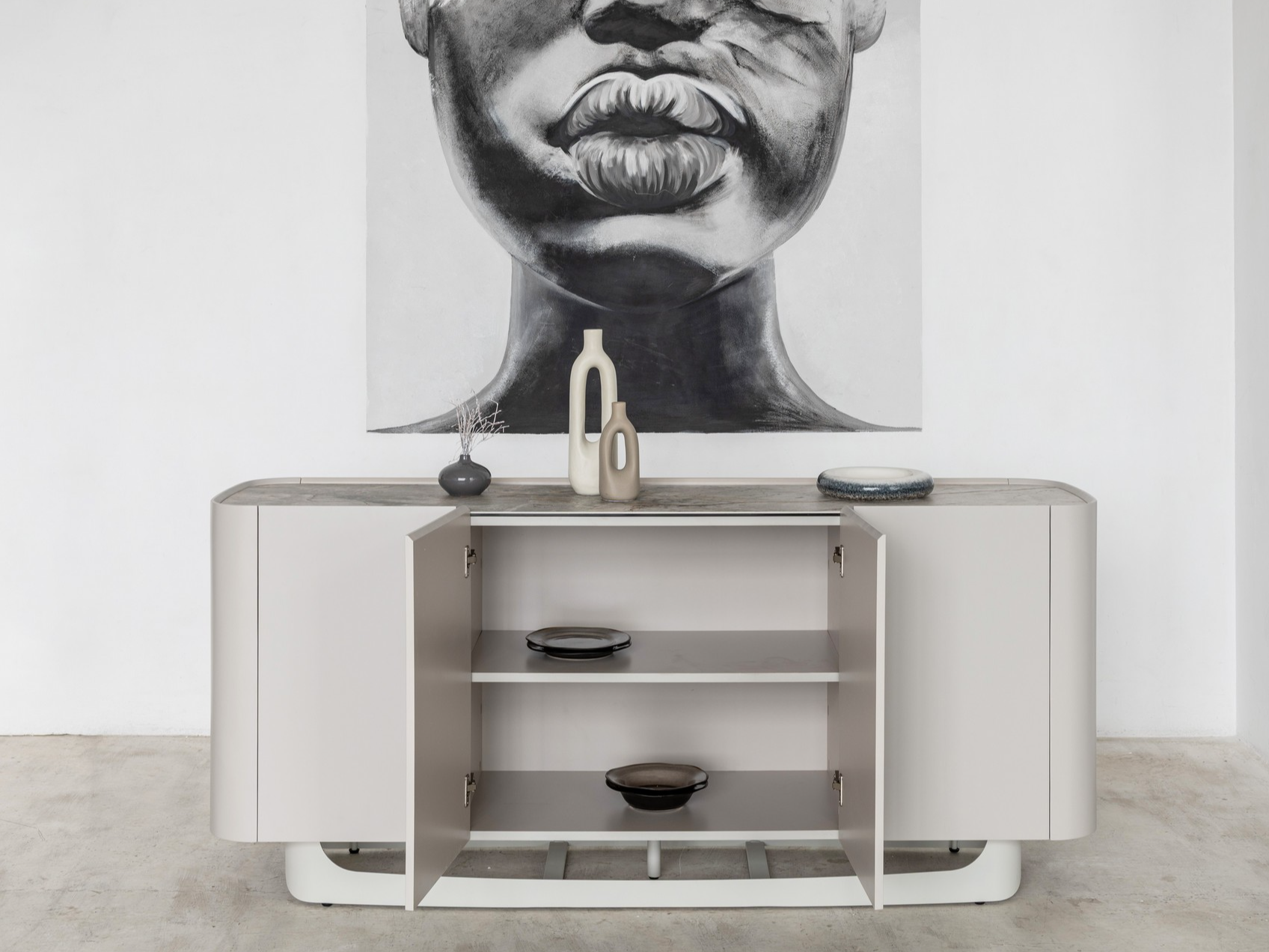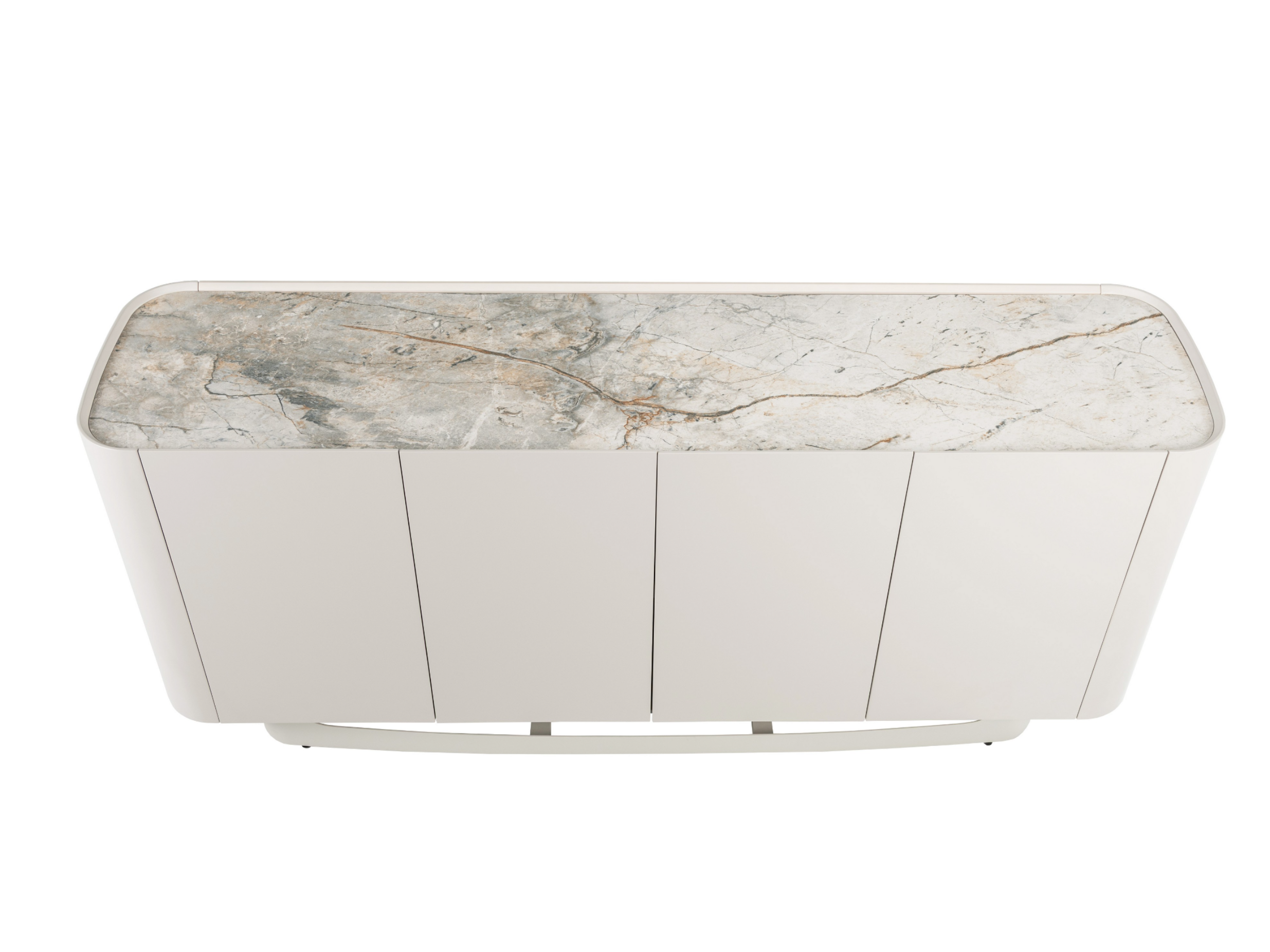 Буфет «Арно» сілвер рівер + айворі перетворює звичне зберігання речей на естетичне задоволення. Стільниця з матової кераміки, доповнена гартованим склом, нагадує фактуру природного каменю: глибокі переливи відтінку сілвер рівер створюють враження живої поверхні, яка оживає при денному чи штучному світлі.