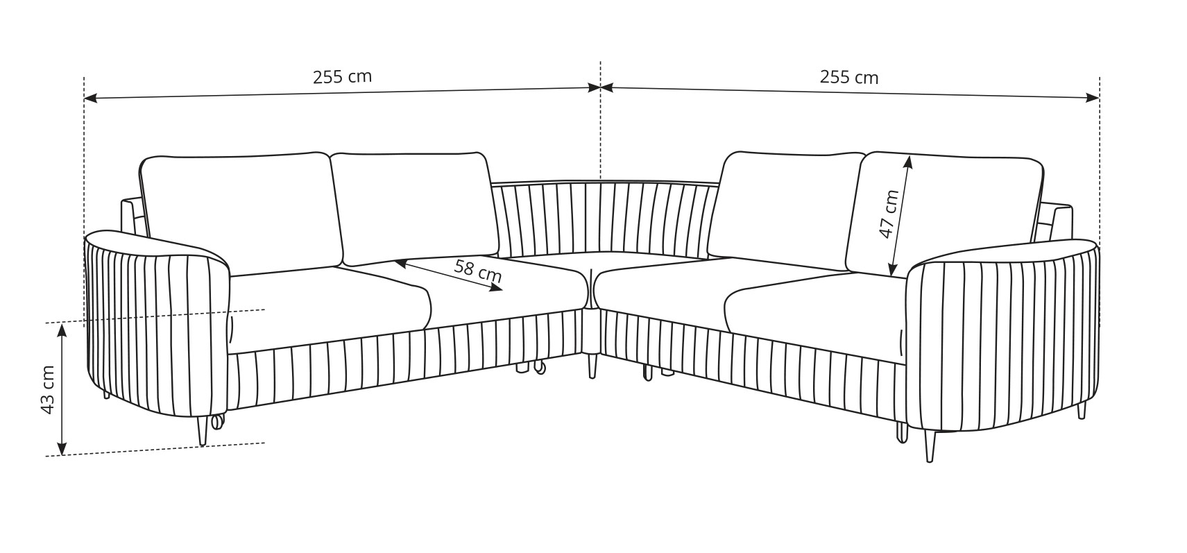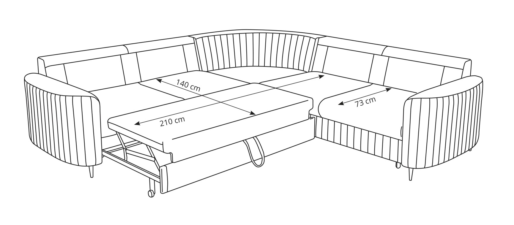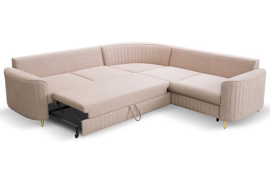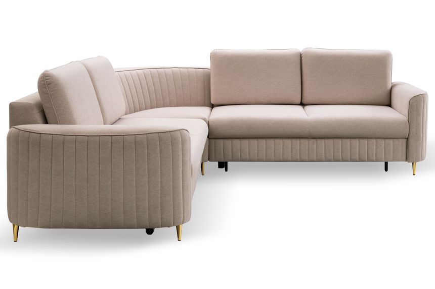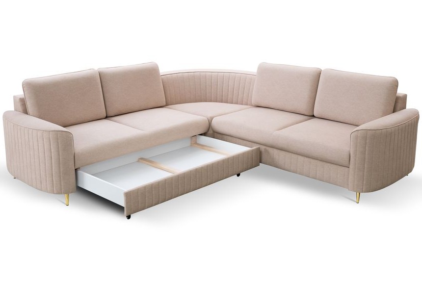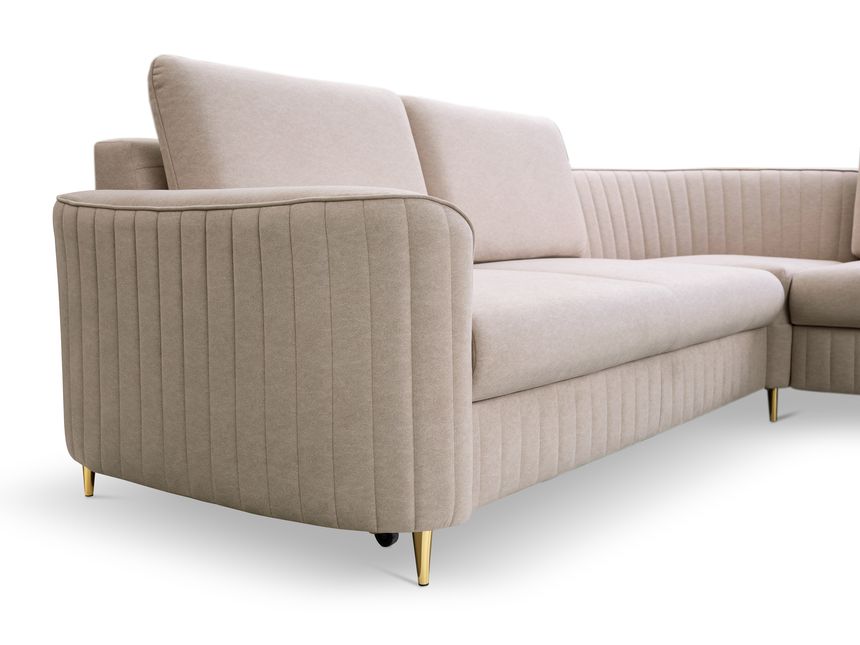 Диван кутовий на ніжках LAREN з функцією сну з шухлядою складає ідеальний тандем разом з Пуфом LARENДиван кутовий розкладний LAREN з функцією сну з шухлядою - це диван, який зачаровує своїм неповторним гламурним стилем, який підкреслюється золотистими металевими ніжками висотою 10 см. На боках меблів розташована ніжна вертикальна строчка, що прикрашена декоративною окантовкою, що надає їм елегантності та легкості. Ці меблі мають функцію розкладання "Дельфін", яка дозволяє їх перетворити в простору зону відпочинку. Вбудований контейнер для постільної білизни також може вмістити додаткову ковдру або плед. Комфорт сидіння забезпечують гофровані пружини та пінополіуретан. Ці меблі мають чотири великі подушки для спини і доступні в широкому асортименті оббивних тканин, що дозволяє вибрати саме те, що підходить до вашого стилю.