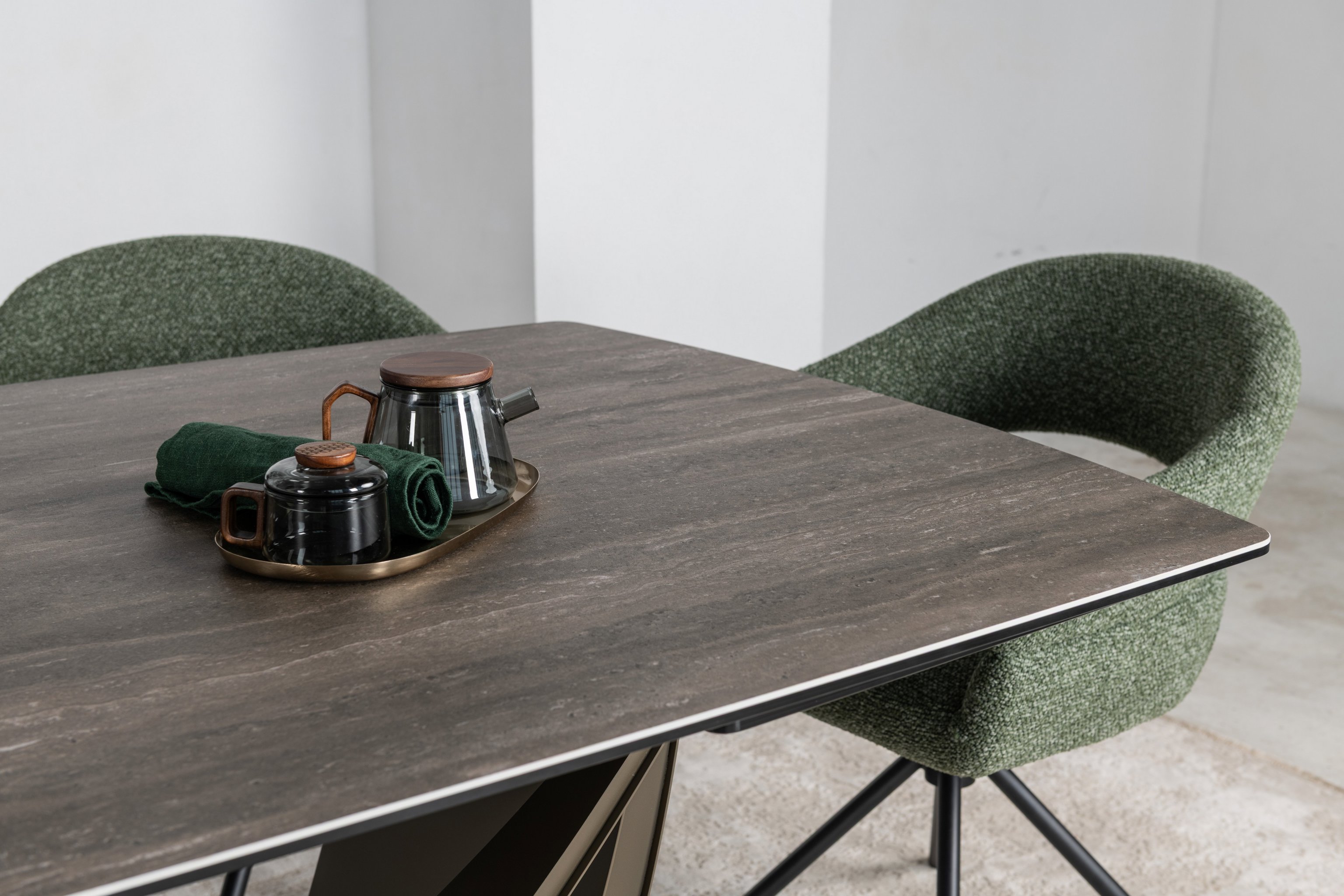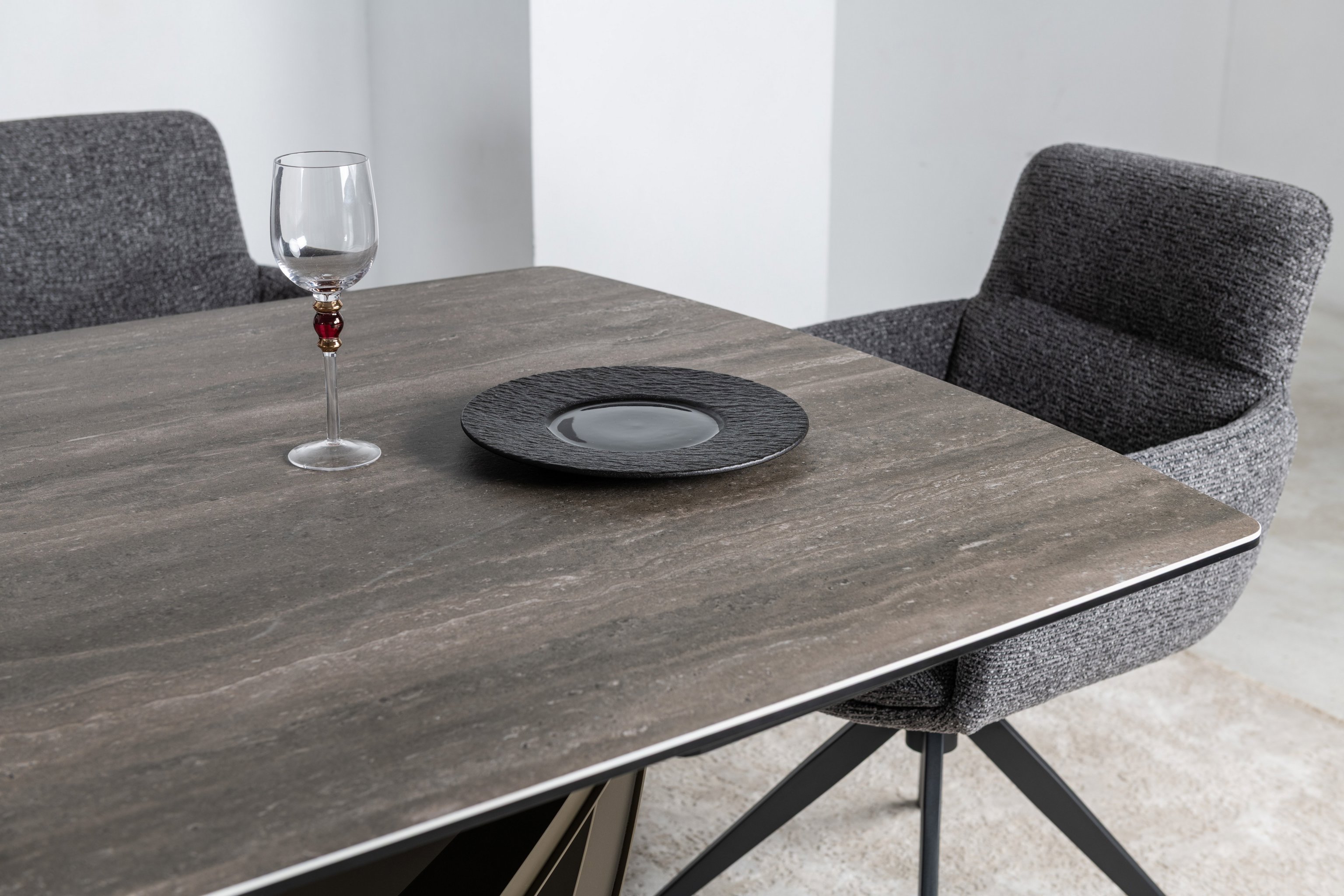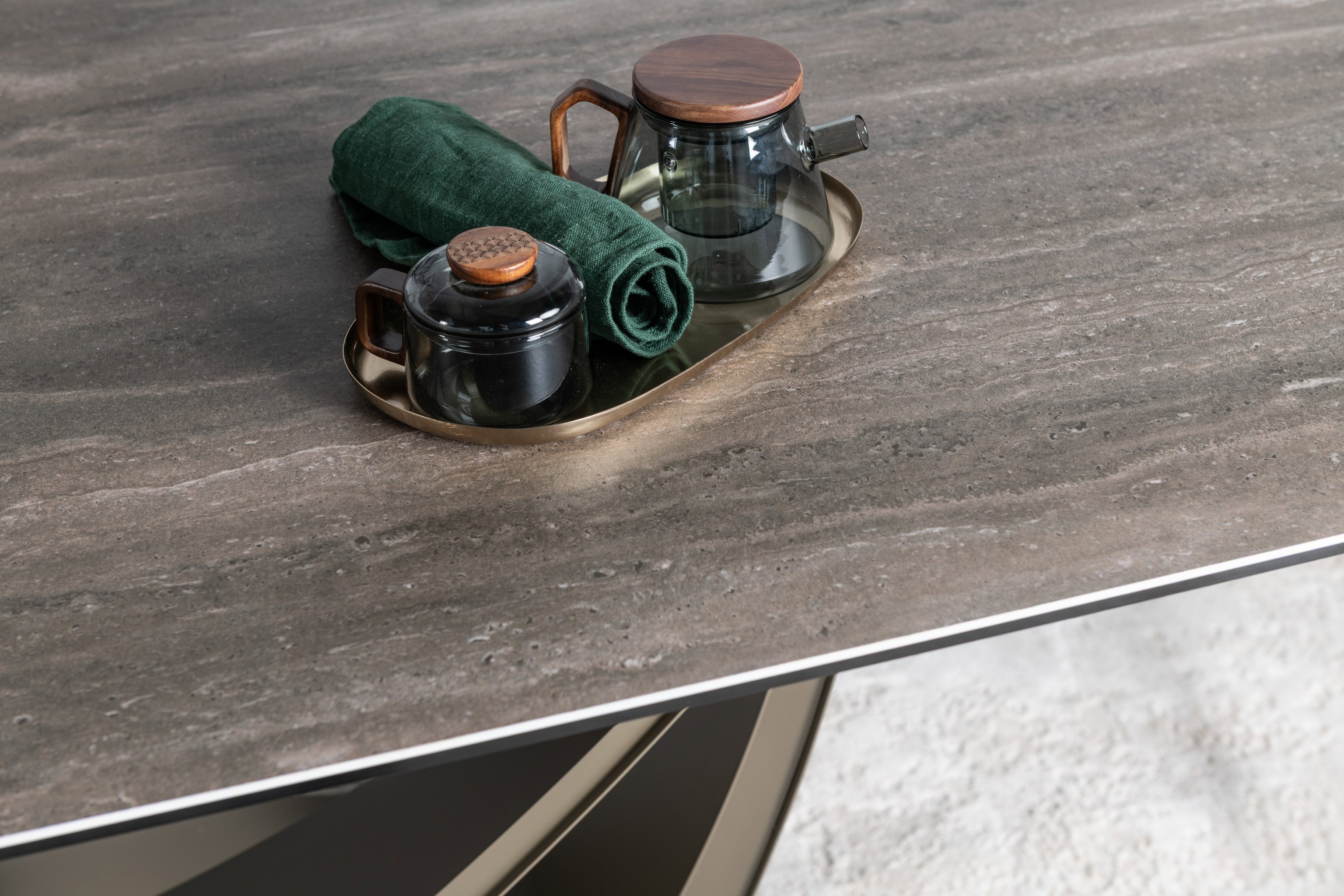 Стільниця виготовлена з високоякісної матової кераміки, посиленої гартованим склом. Вона не лише виглядає ефектно, а й є практичною — стійка до подряпин, перепадів температур і забруднень.