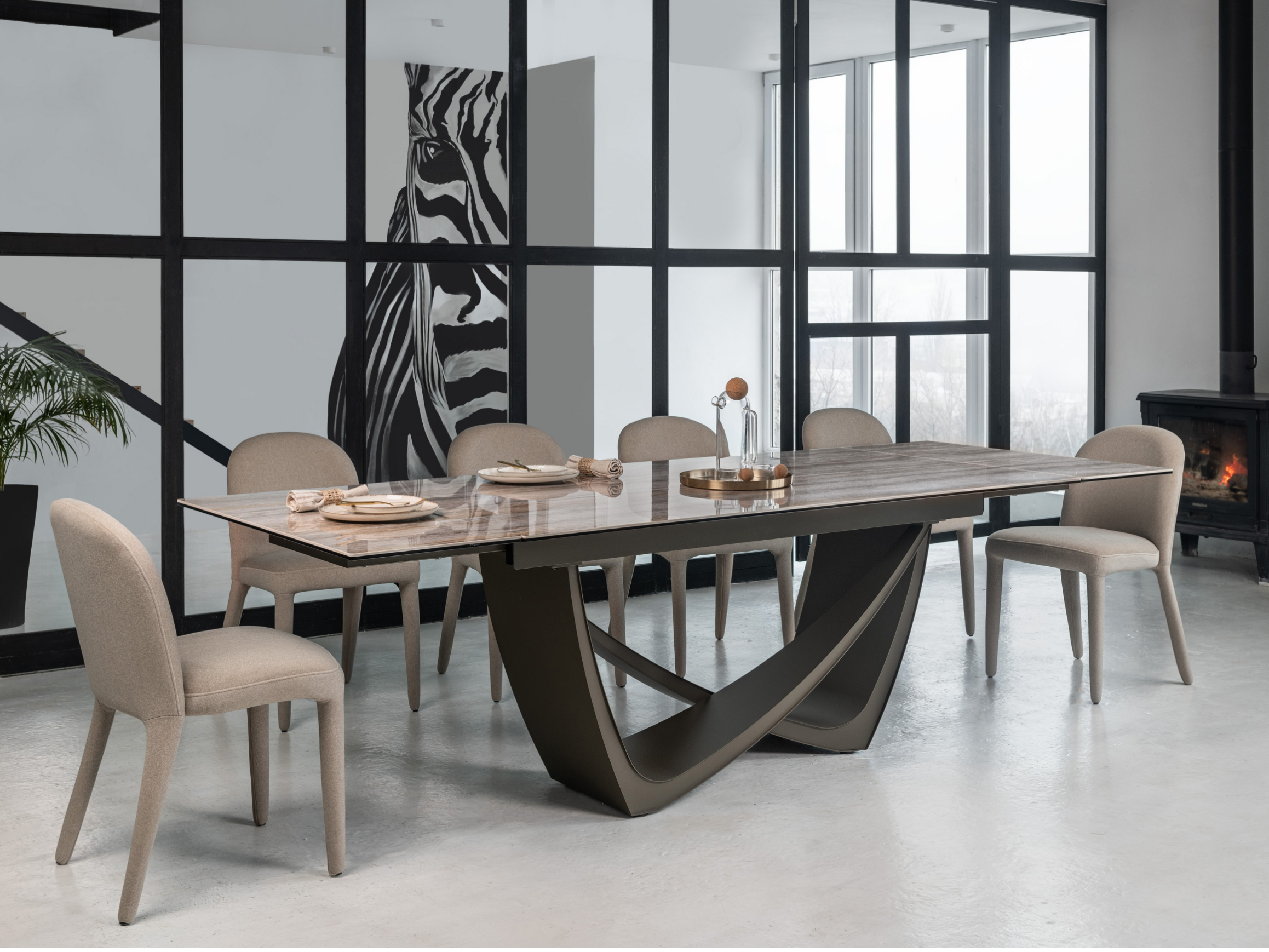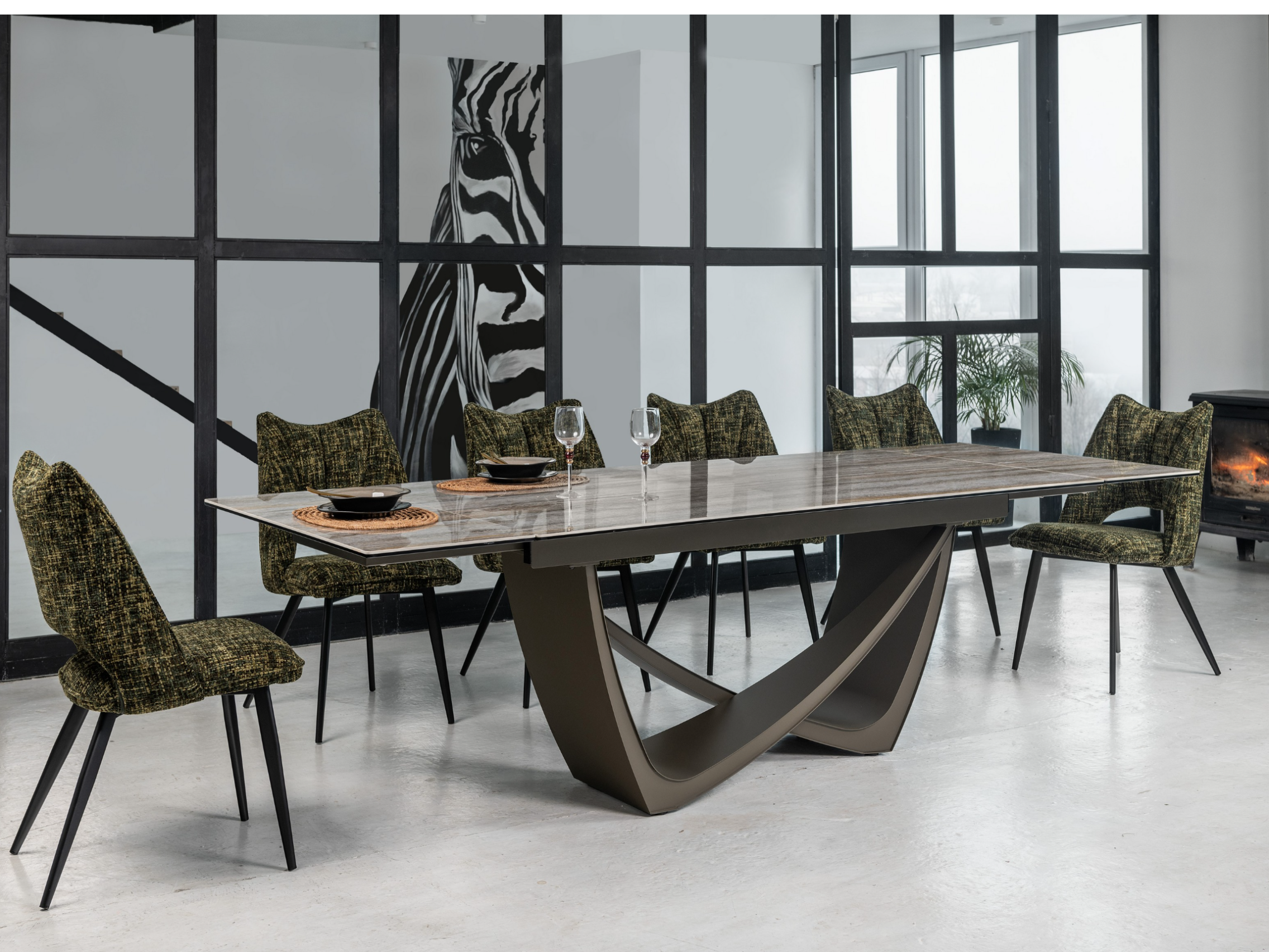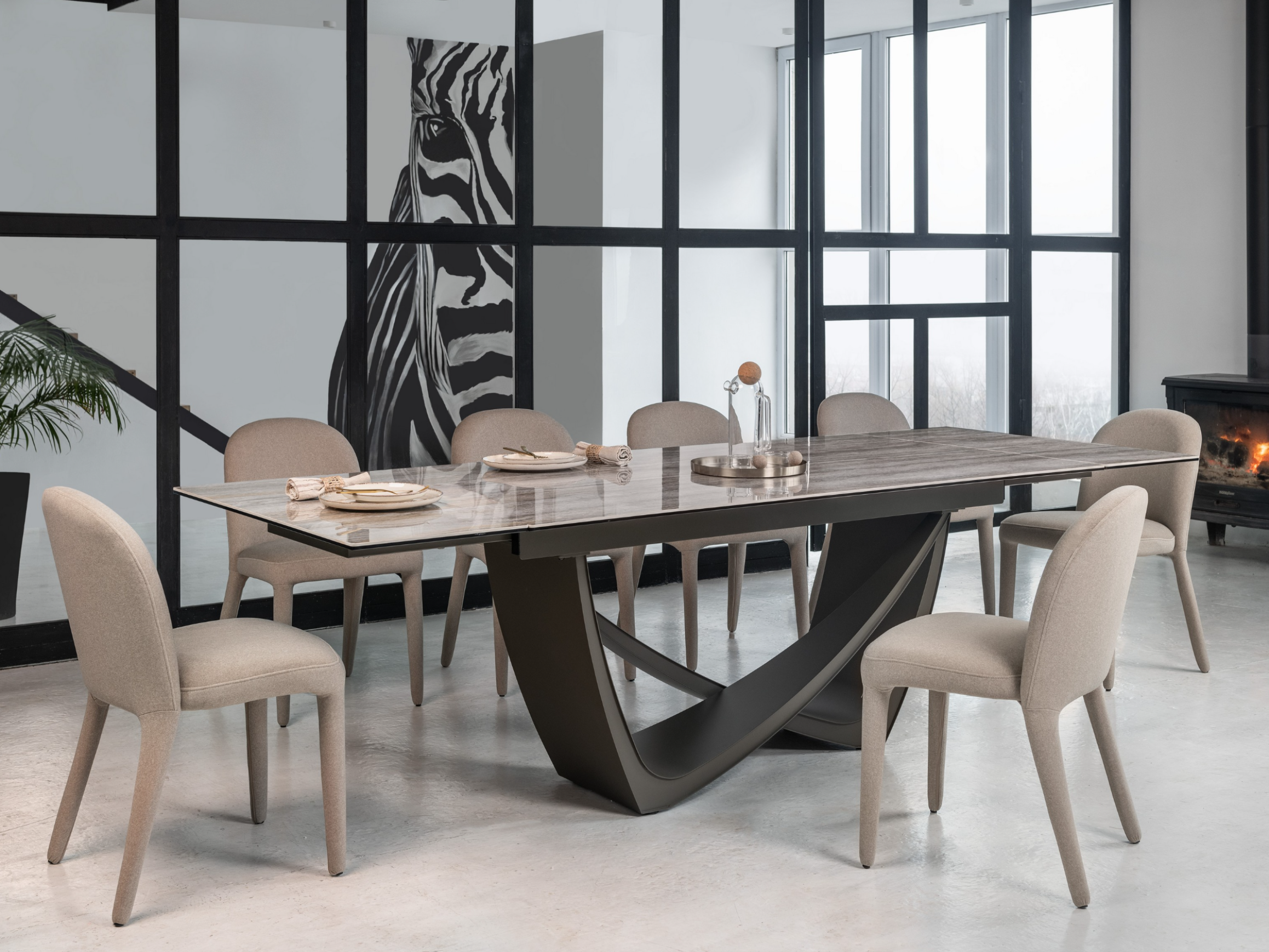 Стільниця поєднує глянцеву кераміку та гартоване скло, що робить її дуже стійкою до тепла, перепадів температур і вигорання на сонці. Фарбований метал основи також додає стійкості та надійності конструкції.