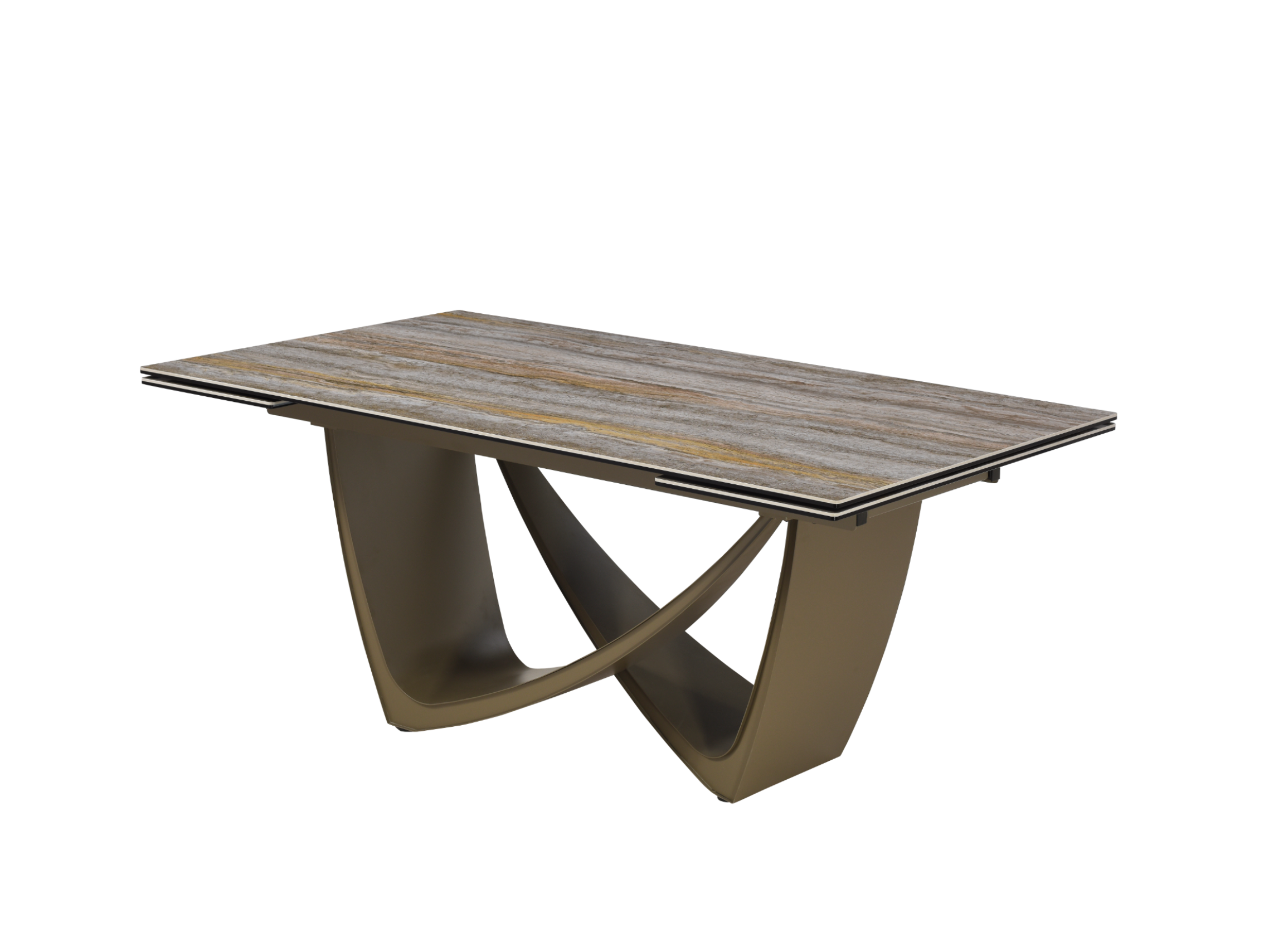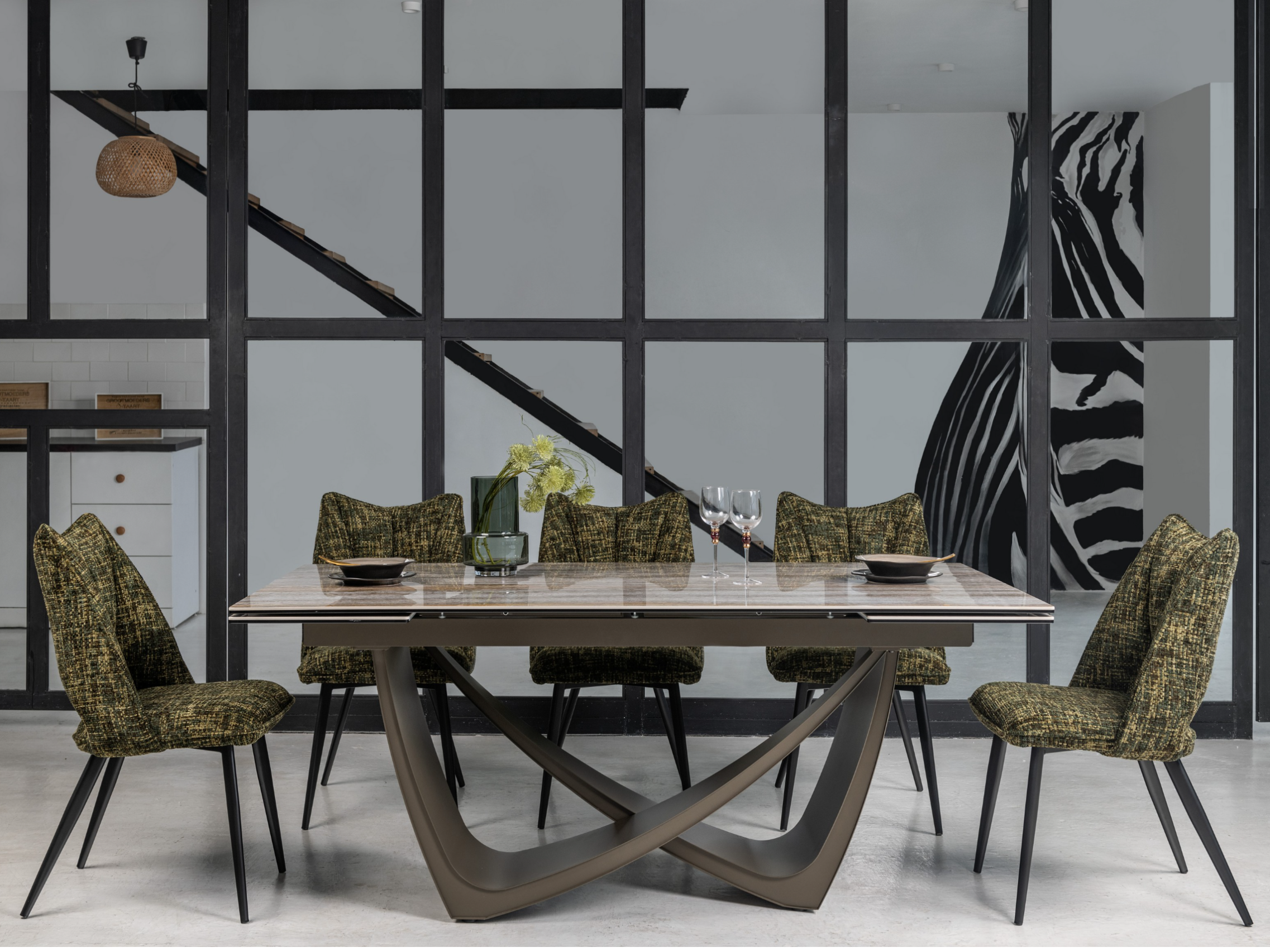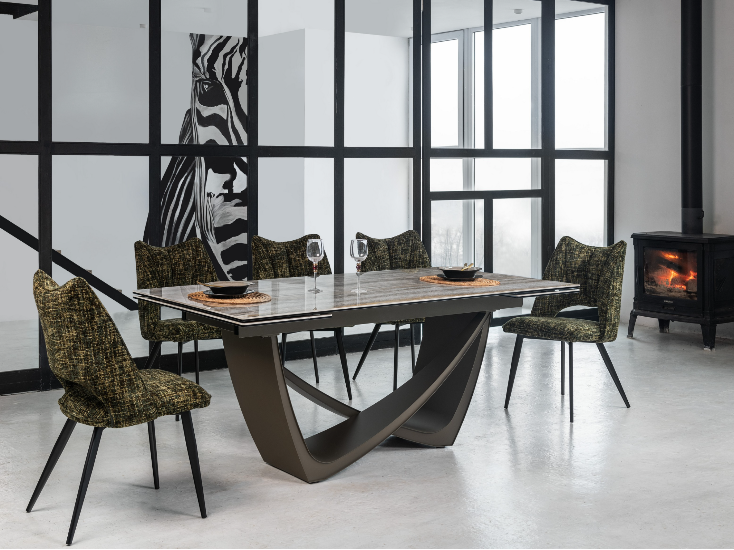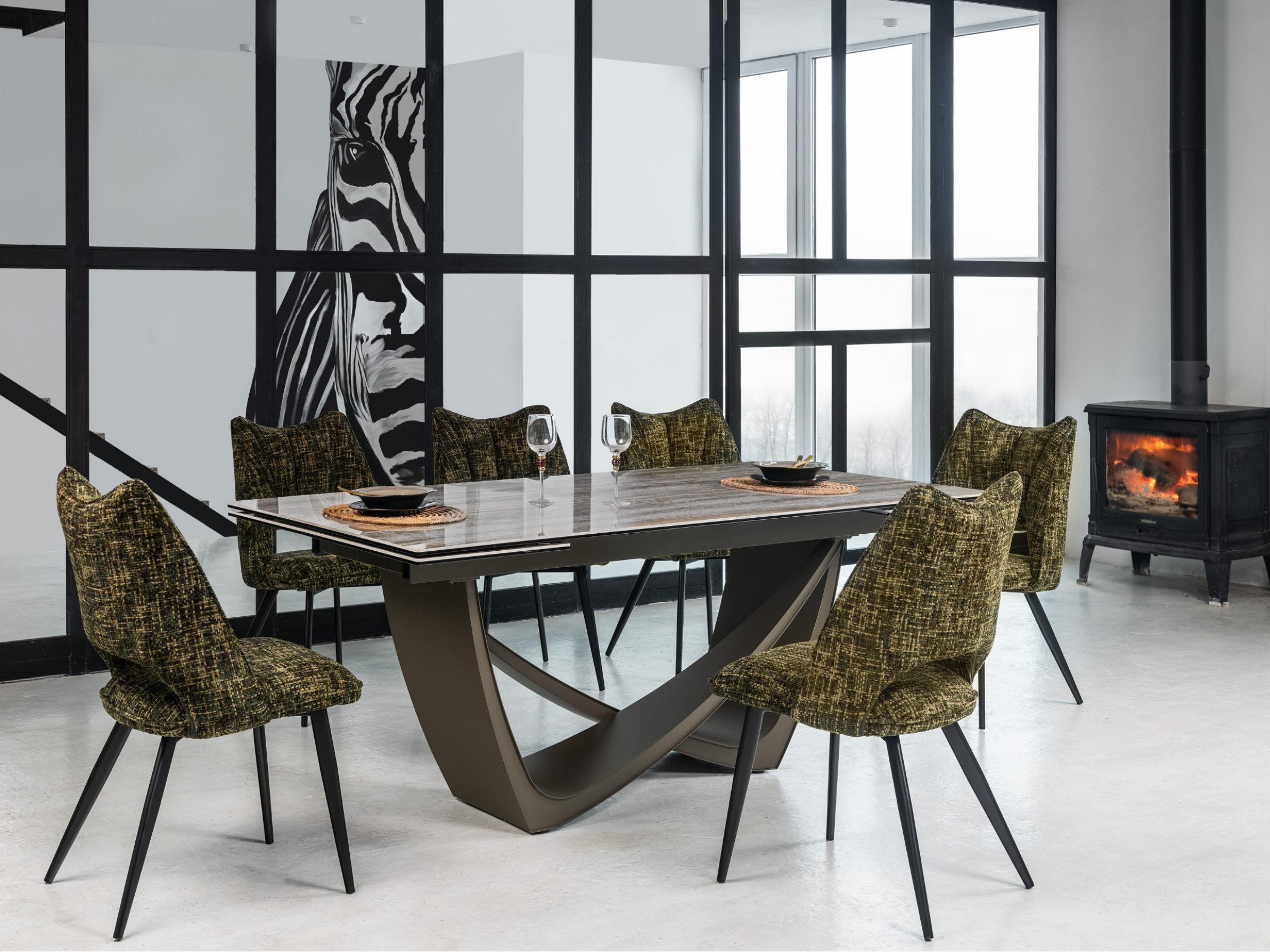 Стільниця поєднує глянцеву кераміку та гартоване скло, що робить її дуже стійкою до тепла, перепадів температур і вигорання на сонці. Фарбований метал основи також додає стійкості та надійності конструкції.