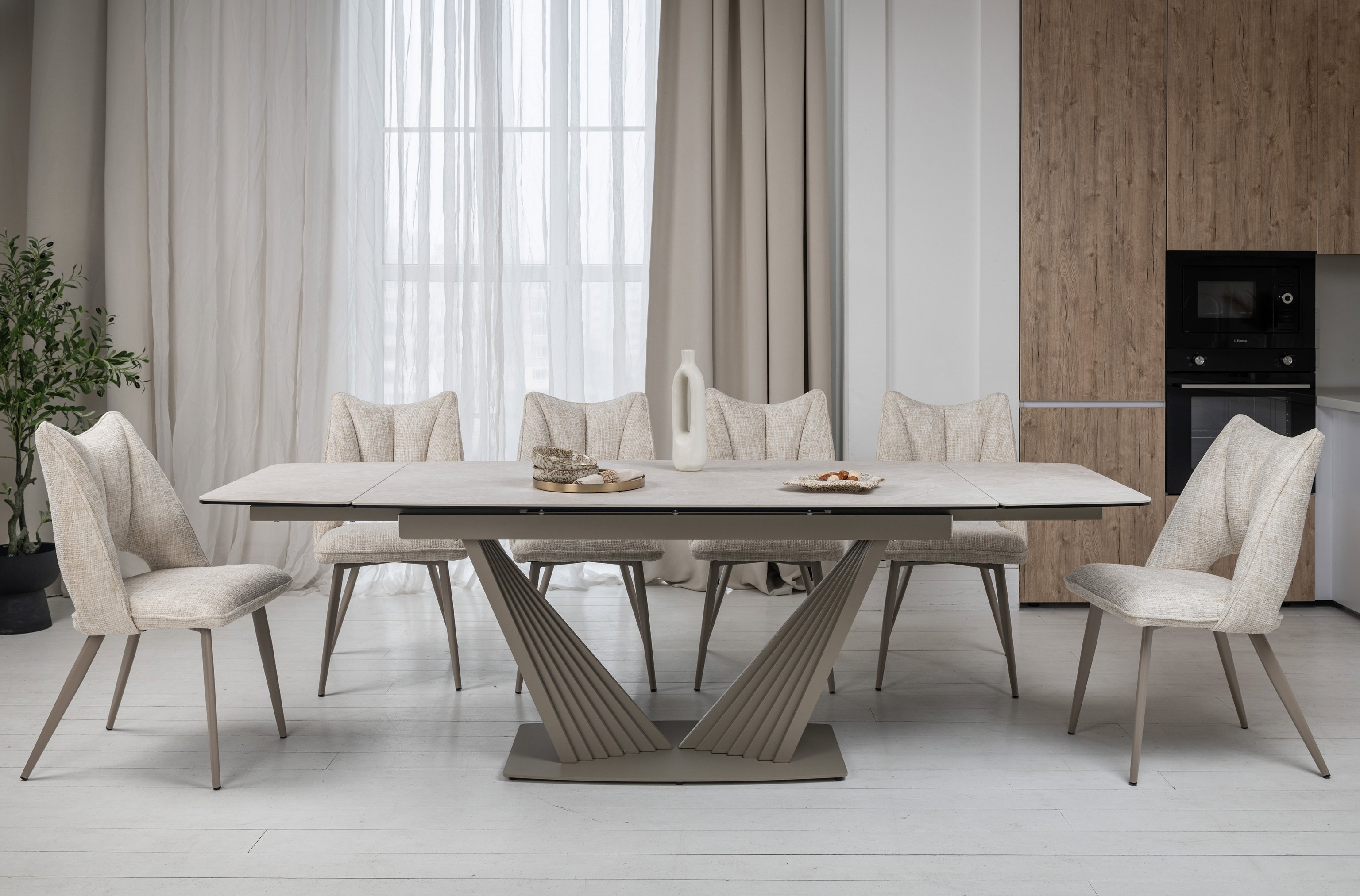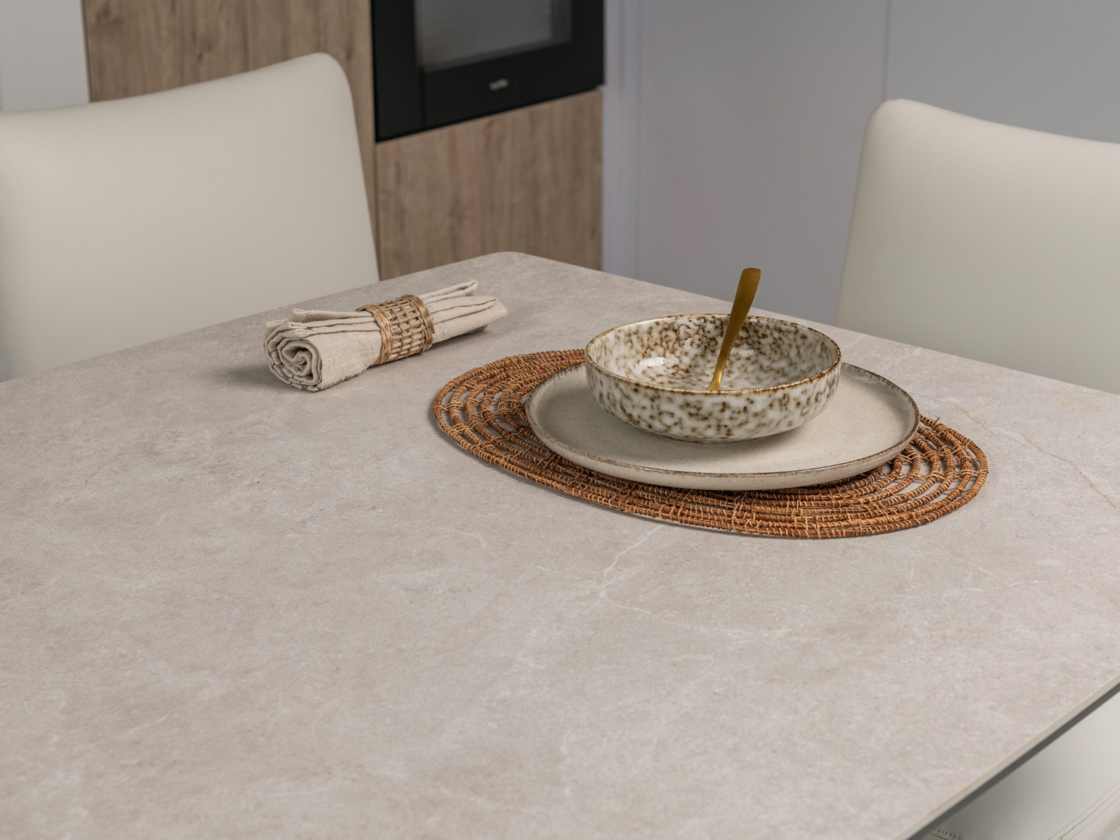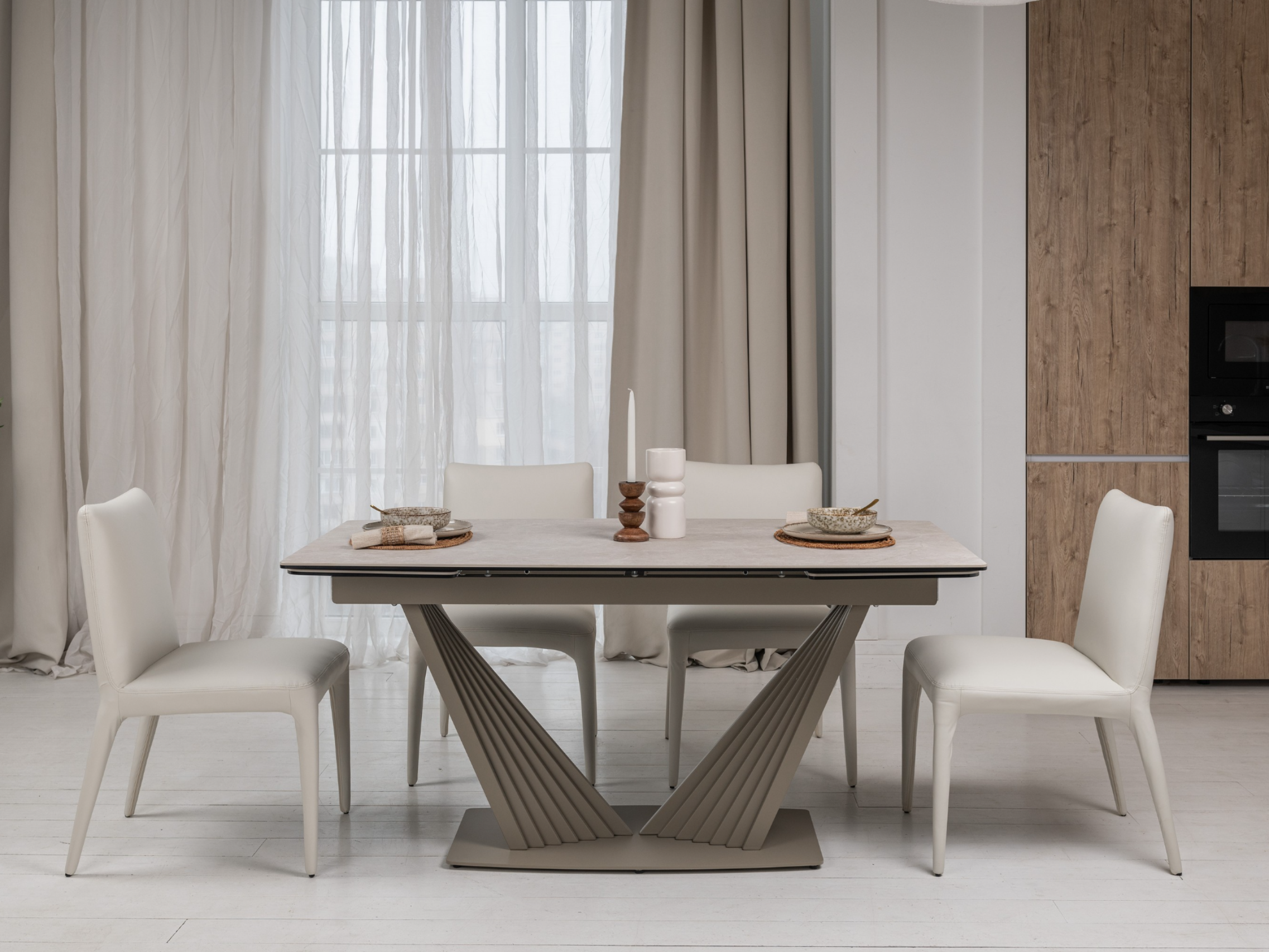 Матова керамічна поверхня потребує мінімального догляду – достатньо простої очистки, що робить стіл практичним у повсякденному використанні.