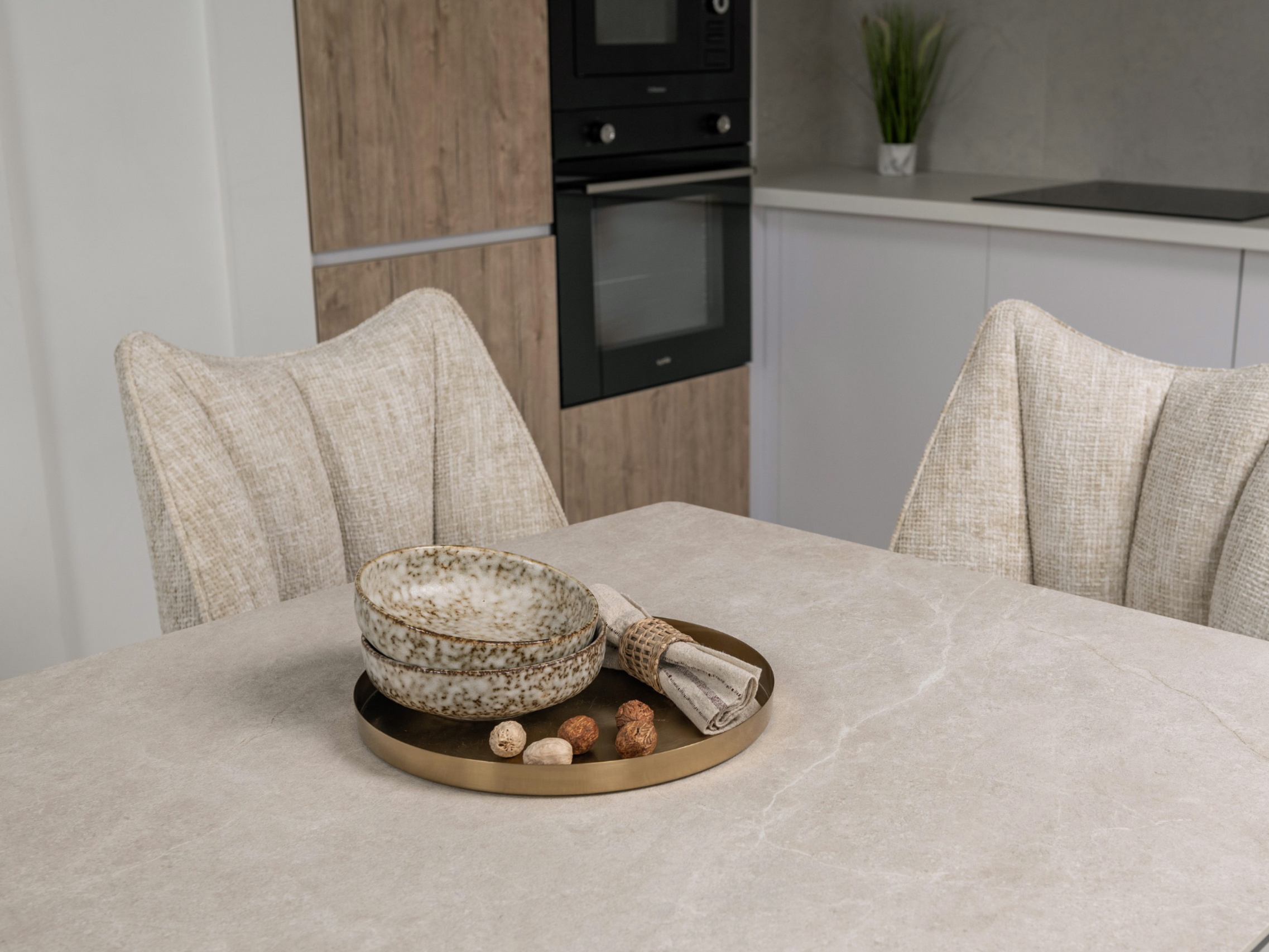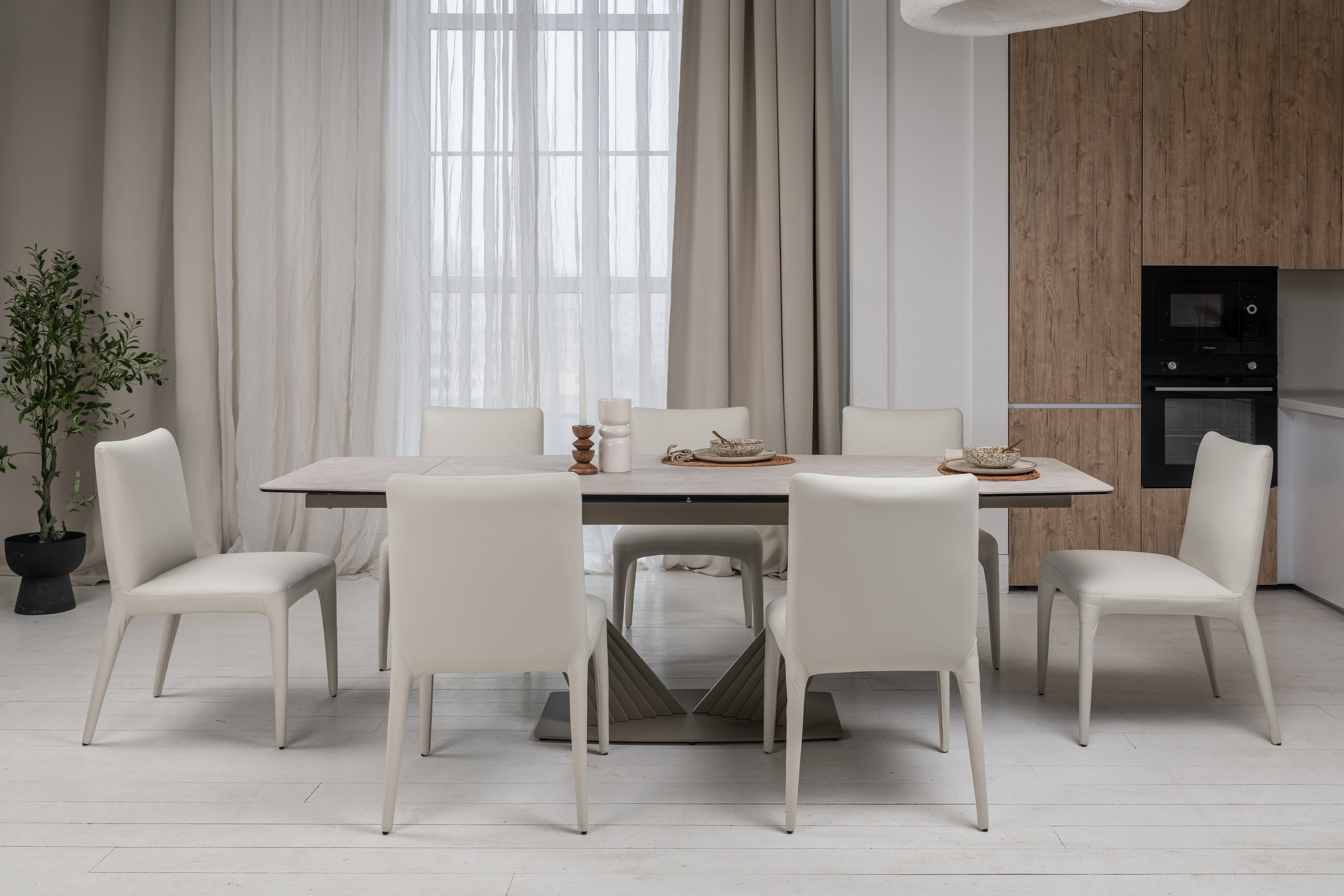 Матова кераміка у поєднанні з гартованим склом забезпечує не лише естетичний вигляд, а й практичність. Ця комбінація матеріалів дуже стійка до подряпин, ударів, плям та високих температур, що дозволяє використовувати стіл без додаткового захисту.
