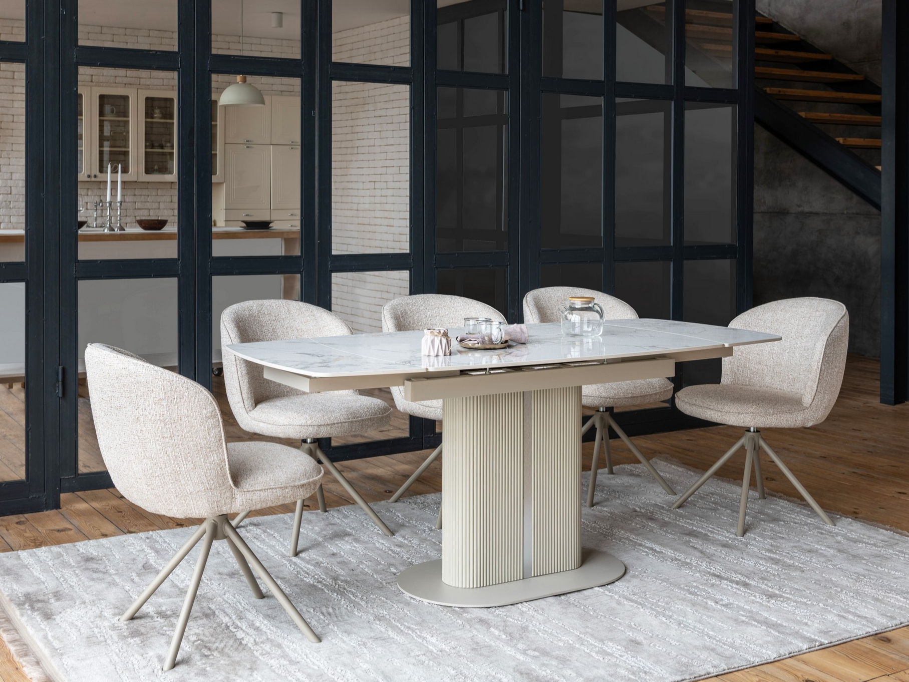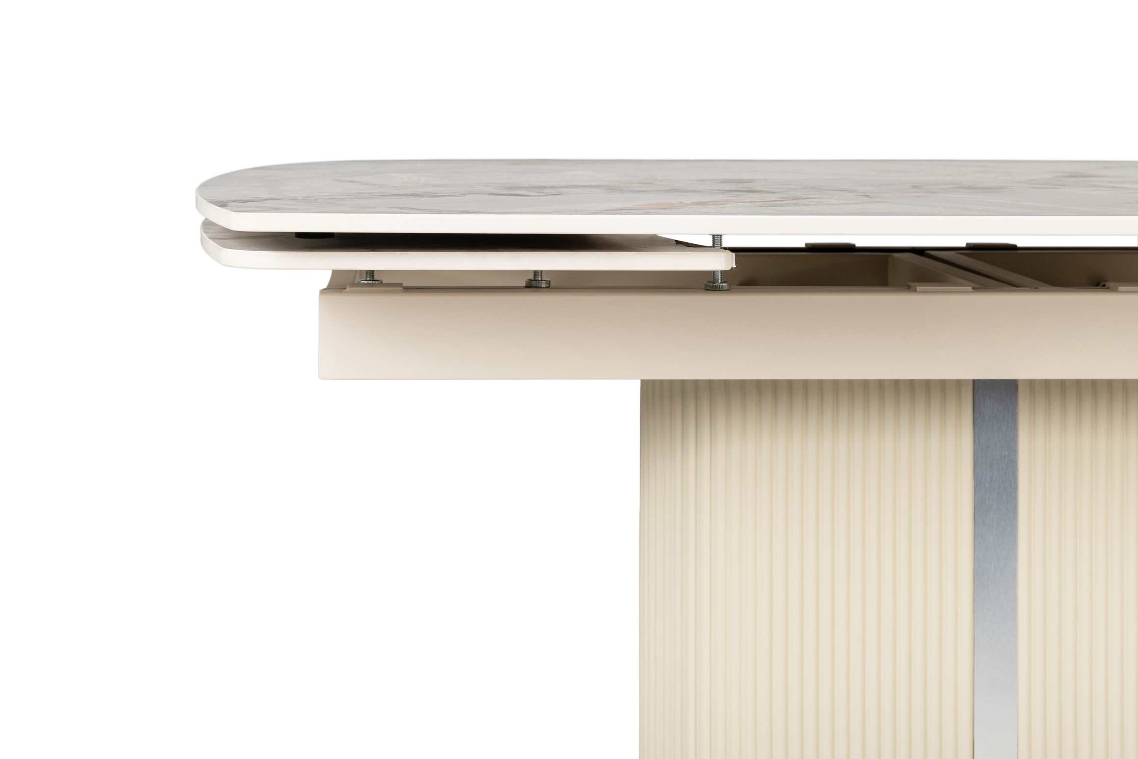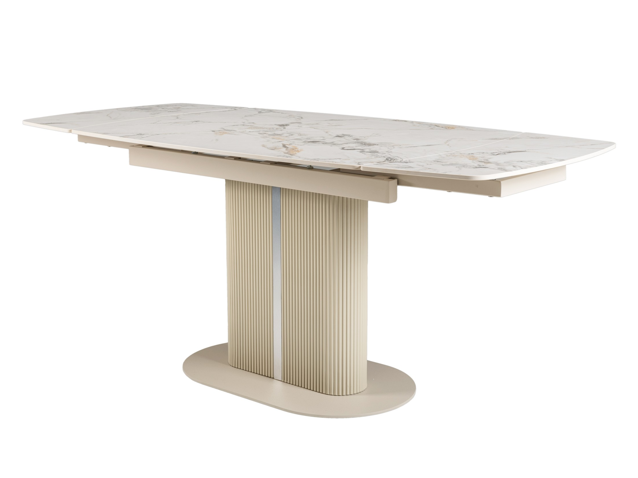 Основа поєднує пофарбований МДФ і метал у бежевому тоні, додаючи конструкції легкості та водночас надійності. Прямокутна форма та збалансовані пропорції дозволяють столу гармонійно вписатися в сучасний мінімалізм, скандинавський стиль чи більш класичний інтер’єр, роблячи його центральним елементом кімнати.