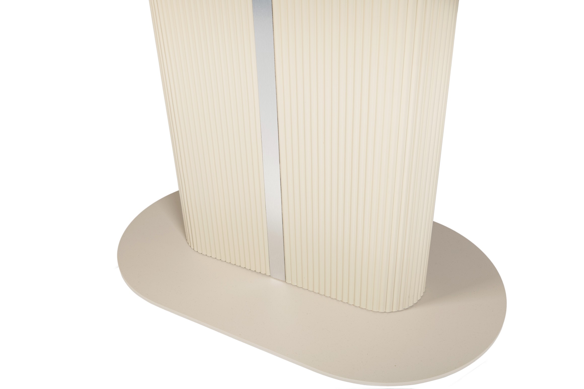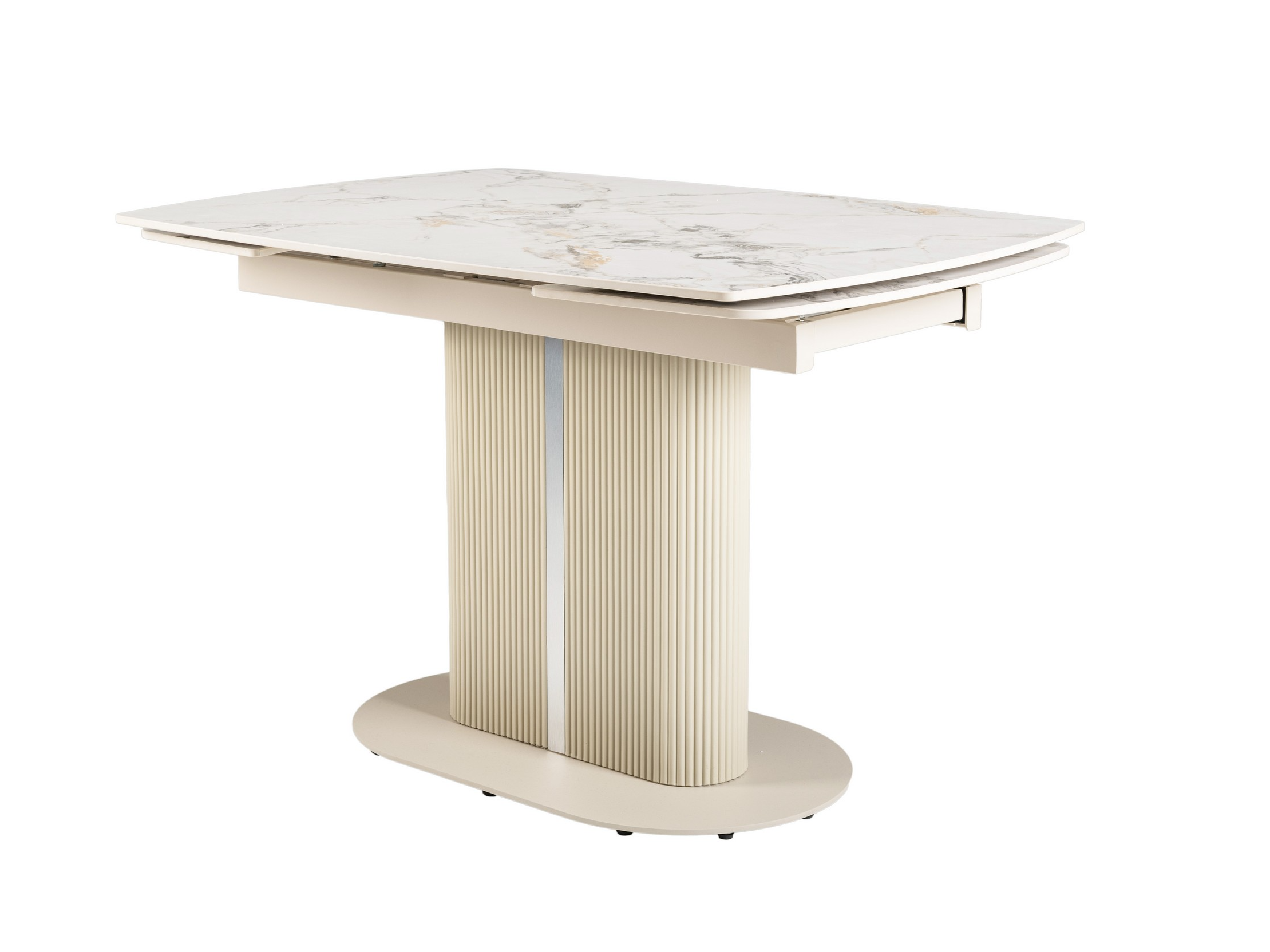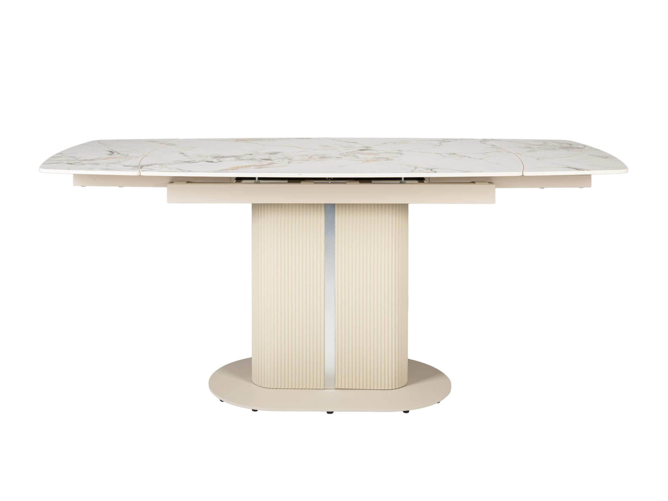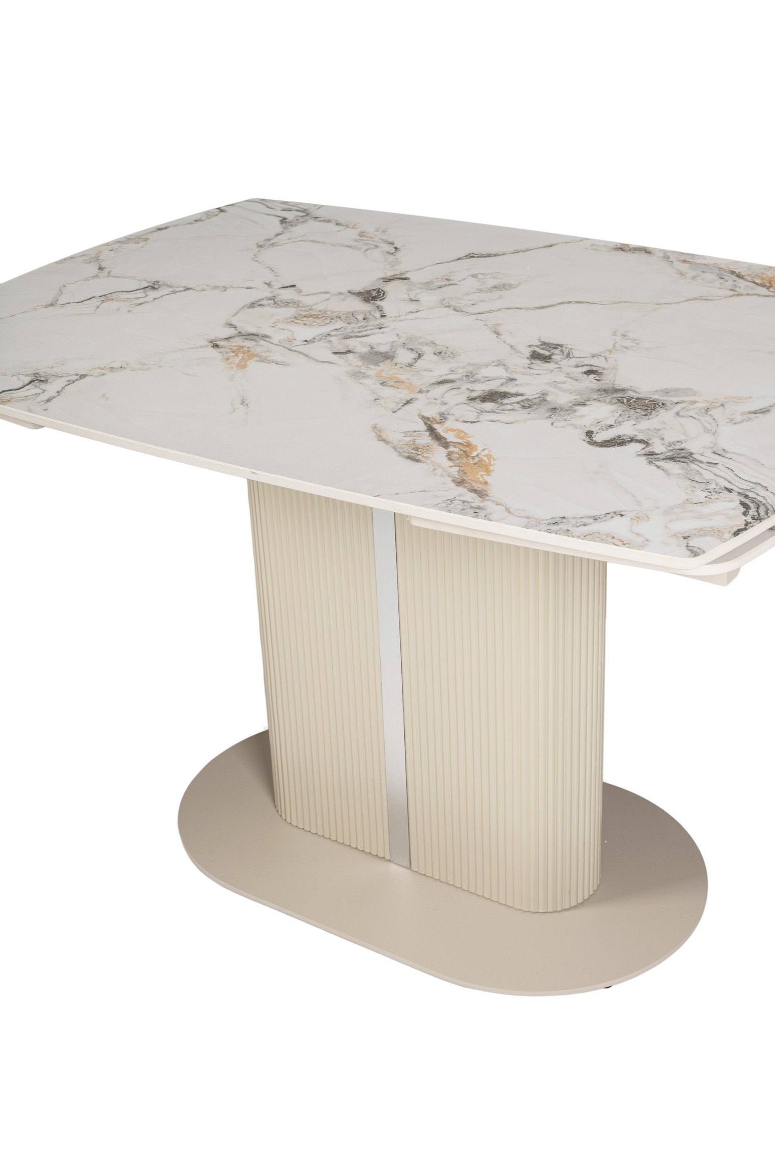 Основа поєднує пофарбований МДФ і метал у бежевому тоні, додаючи конструкції легкості та водночас надійності. Прямокутна форма та збалансовані пропорції дозволяють столу гармонійно вписатися в сучасний мінімалізм, скандинавський стиль чи більш класичний інтер’єр, роблячи його центральним елементом кімнати.