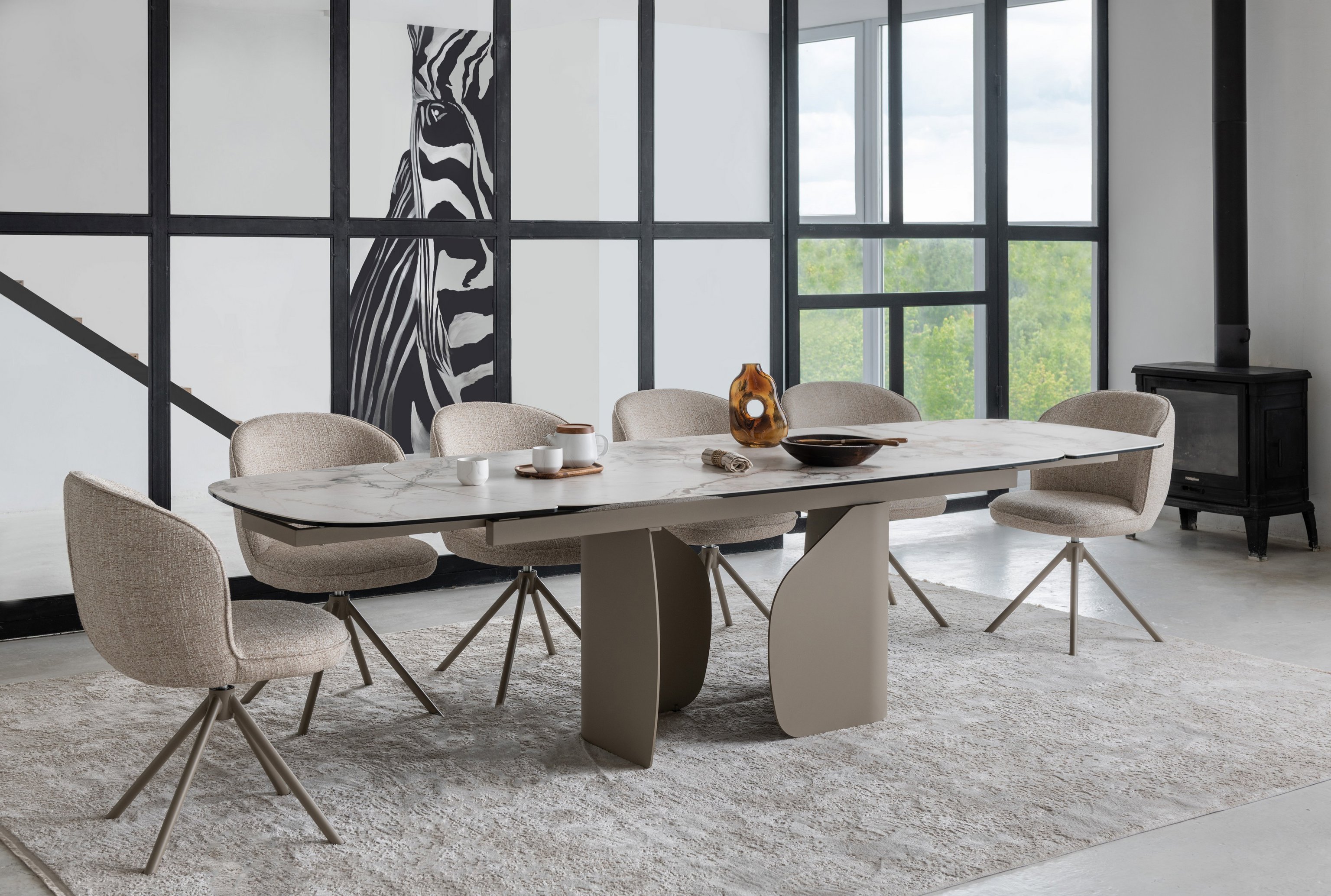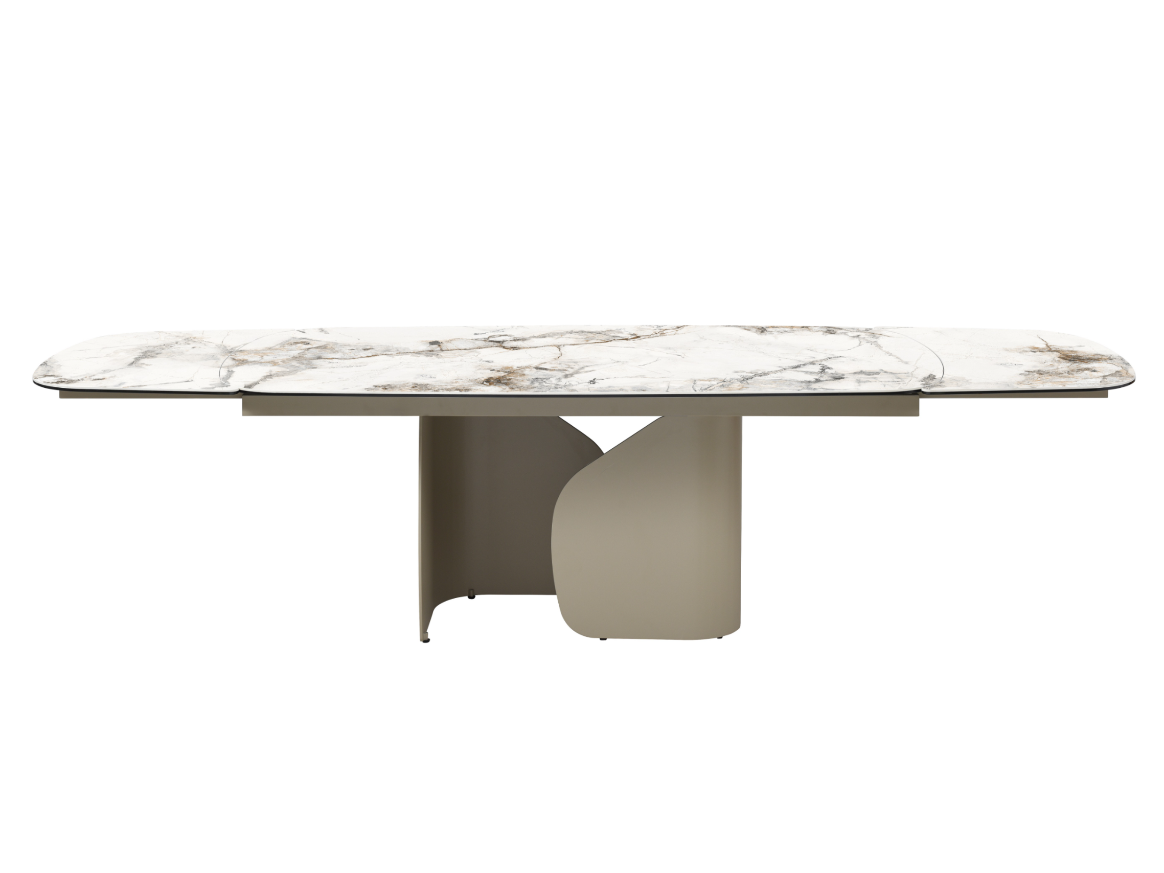 Механізм розкладки столу — боковий — дозволяє збільшити довжину стільниці з 200 см до 300 см, що робить стіл надзвичайно зручним для великих компаній або сімейних зборів. Основа з фарбованого металу гарантує надійність і стабільність конструкції, додаючи їй сучасного вигляду.