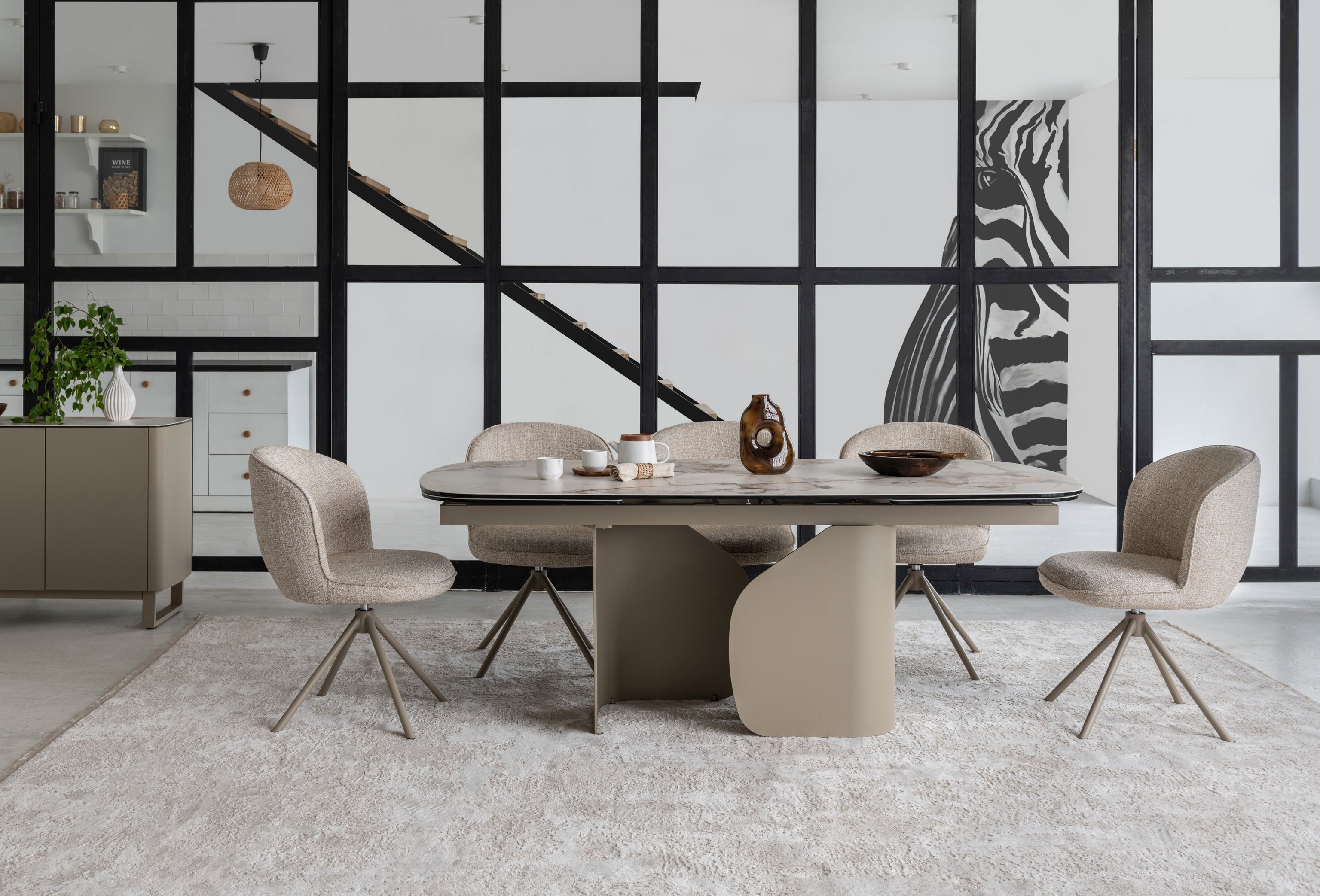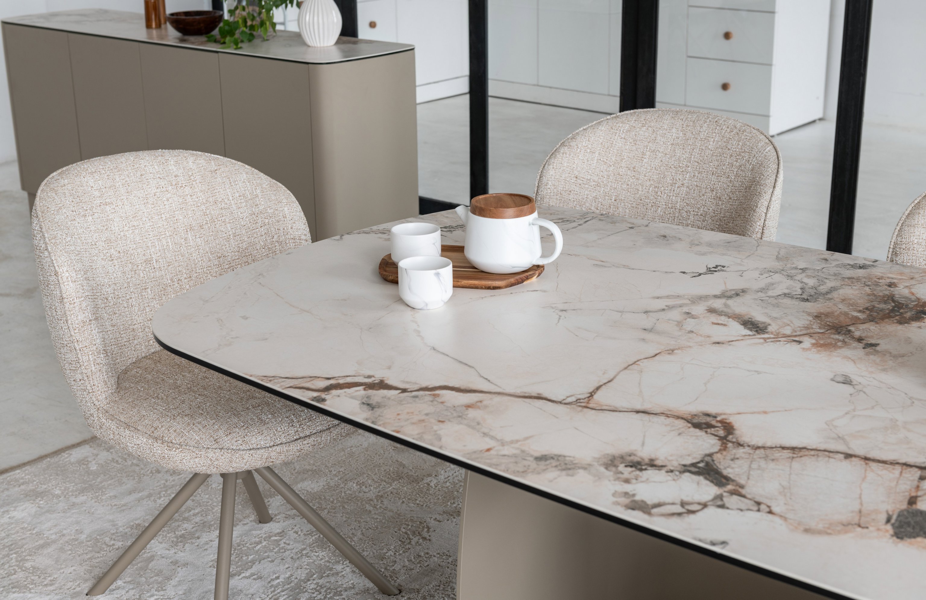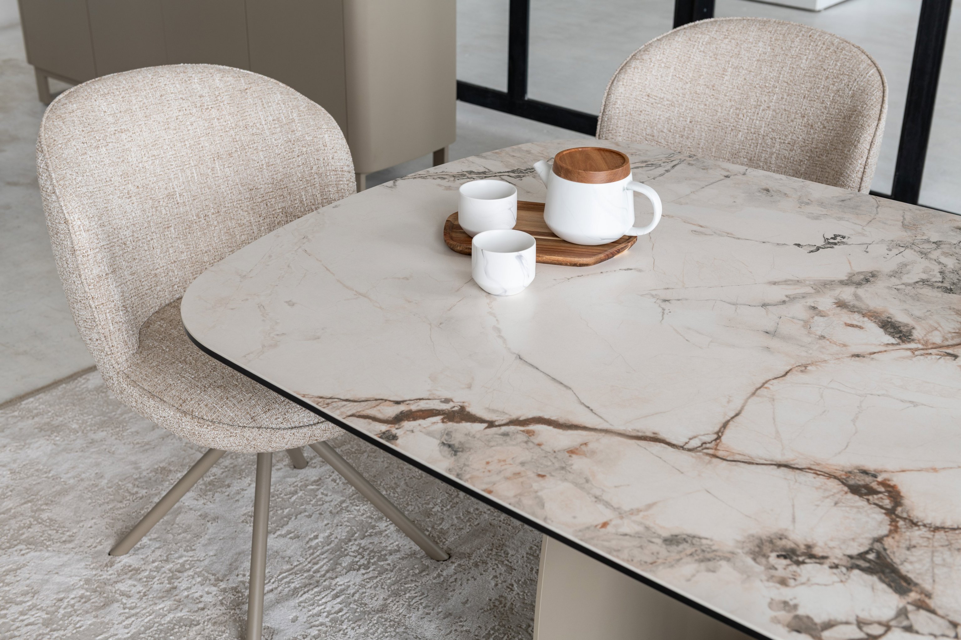 Керамічний стіл "Крістіано" TML-1300 в кольорі аврора голд + бежевий поєднує в собі елегантність та функціональність. Його прямокутна стільниця, виконана з матової кераміки та гартованого скла, надає виробу витонченого вигляду та надає йому високу міцність і стійкість до механічних пошкоджень. Цей стіл легко витримує щоденне використання, зберігаючи бездоганний вигляд завдяки своїй стійкості до подряпин, вологи та високих температур.