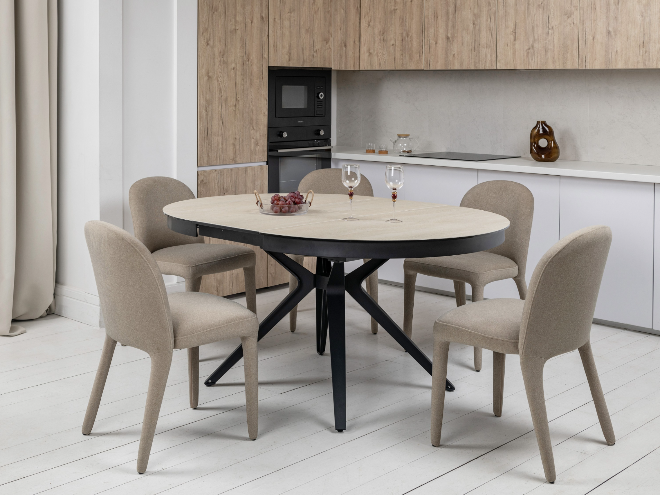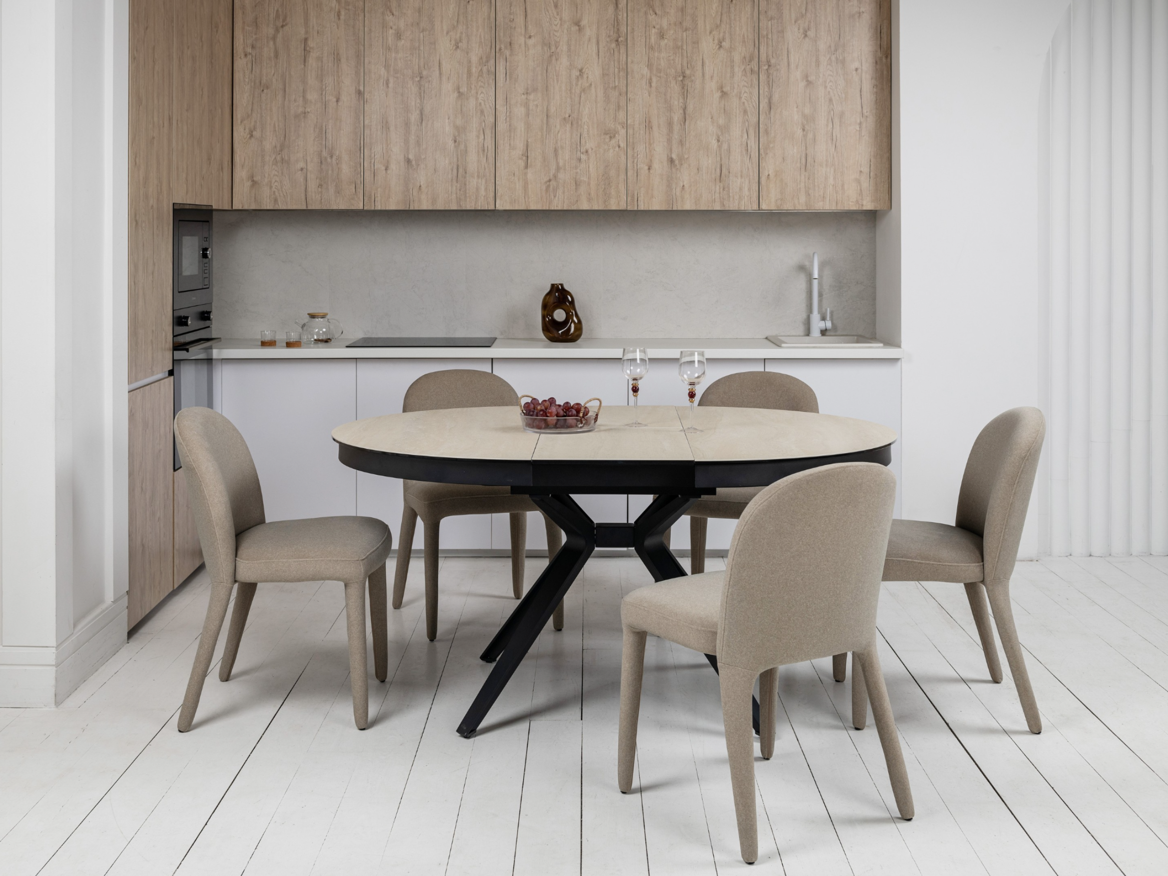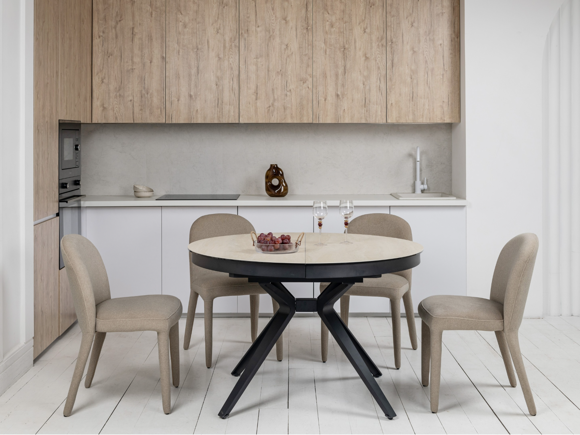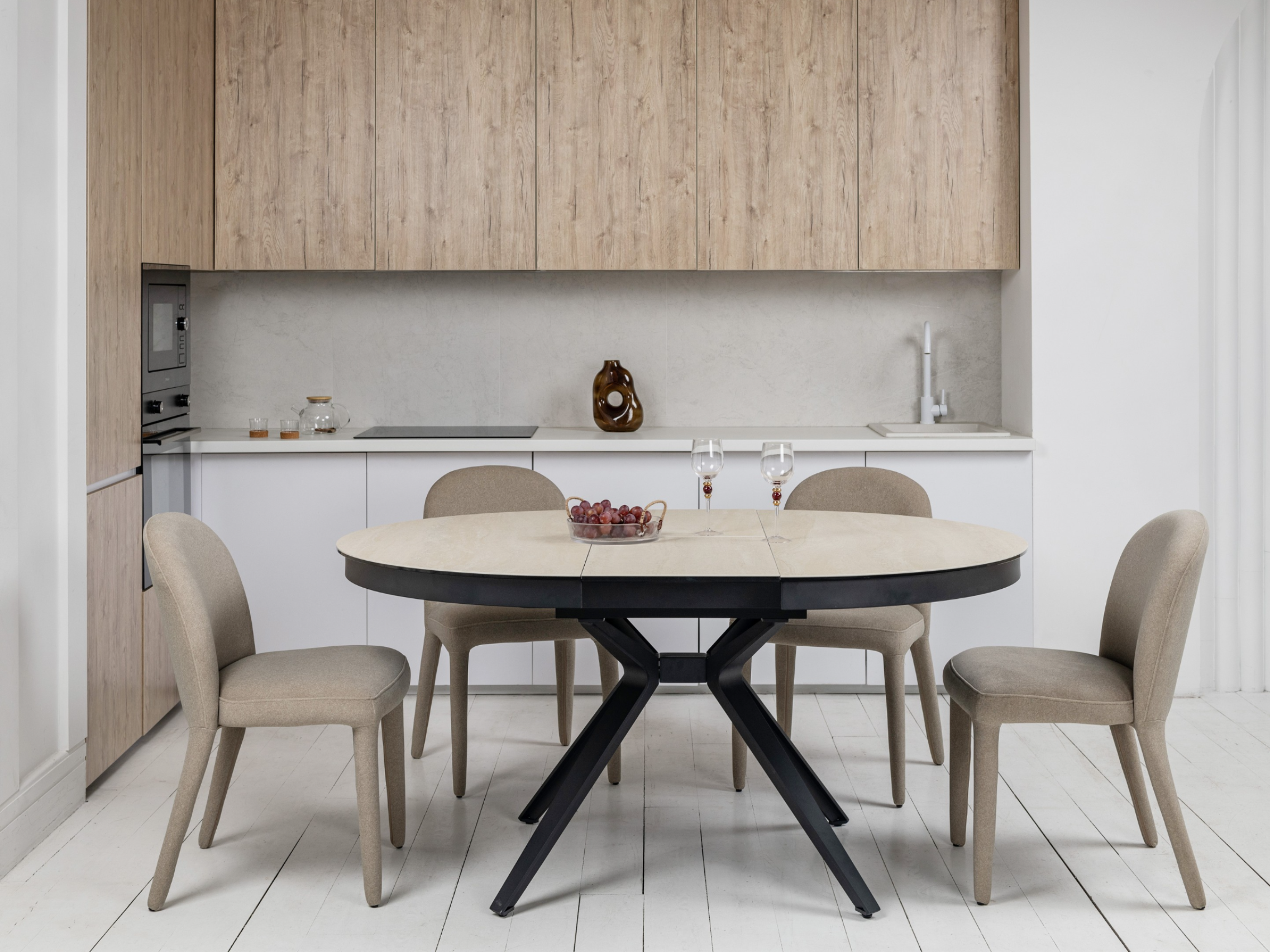 Механізм розкладки “книжка-автомат” робить розкладання стола надзвичайно простим і зручним. Завдяки цьому механізму стіл можна легко розкласти з круглої форми діаметром 120 см до максимальної довжини 160 см, що робить його універсальним для різних ситуацій.