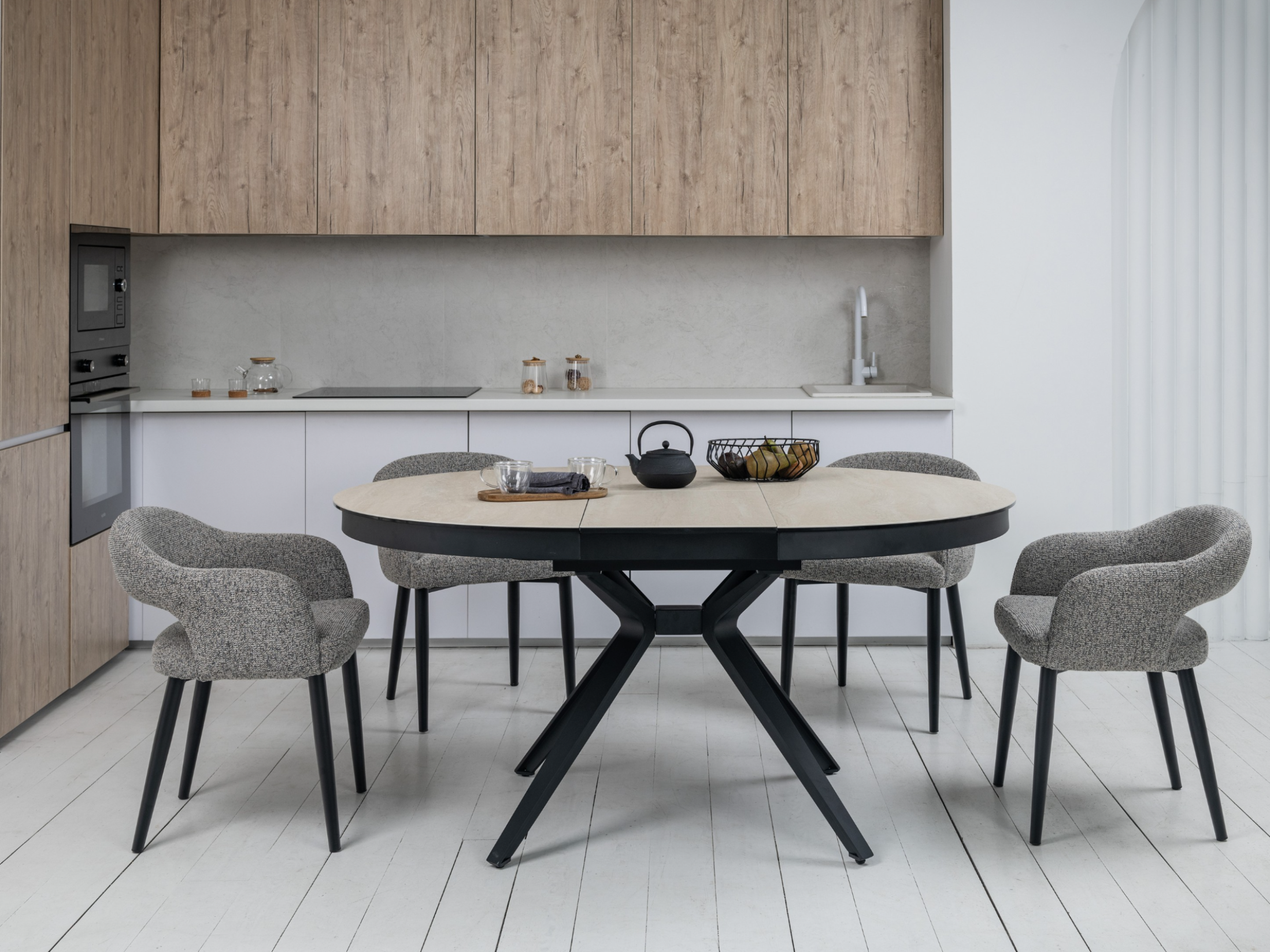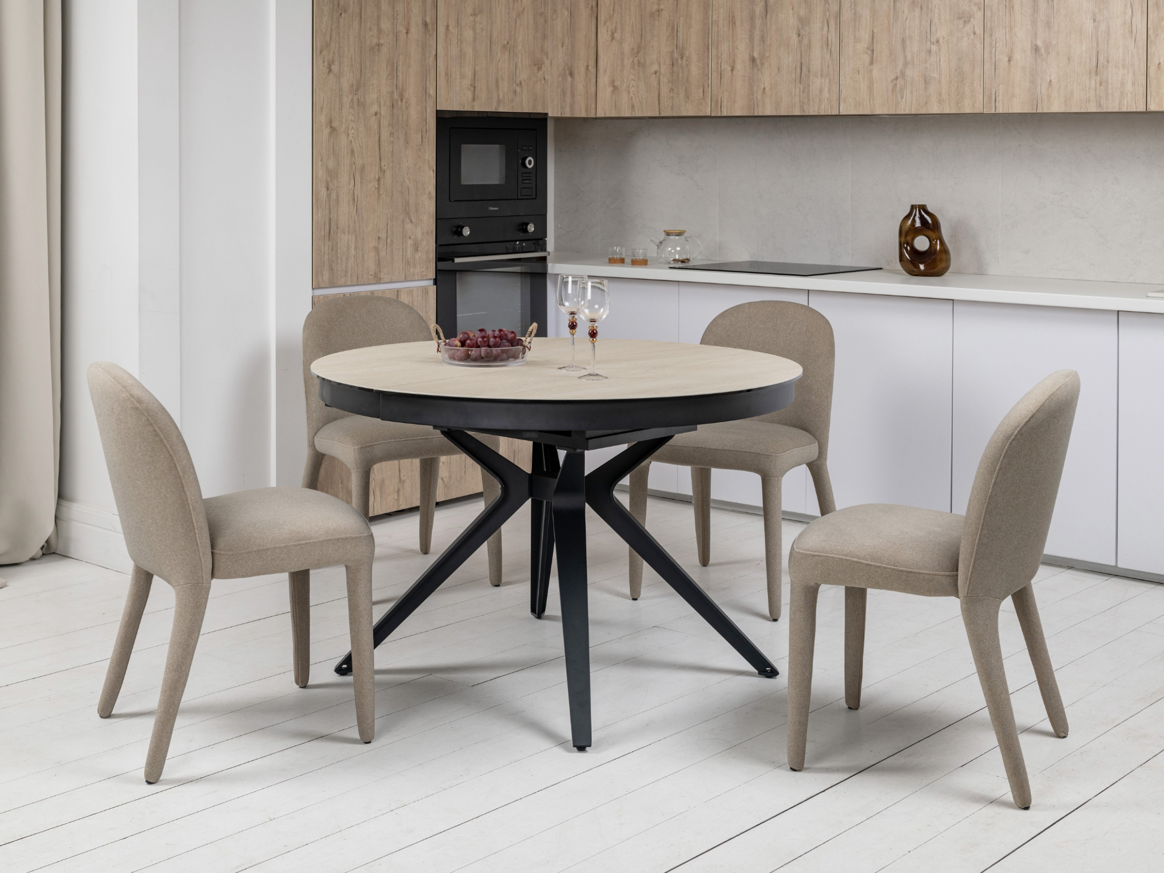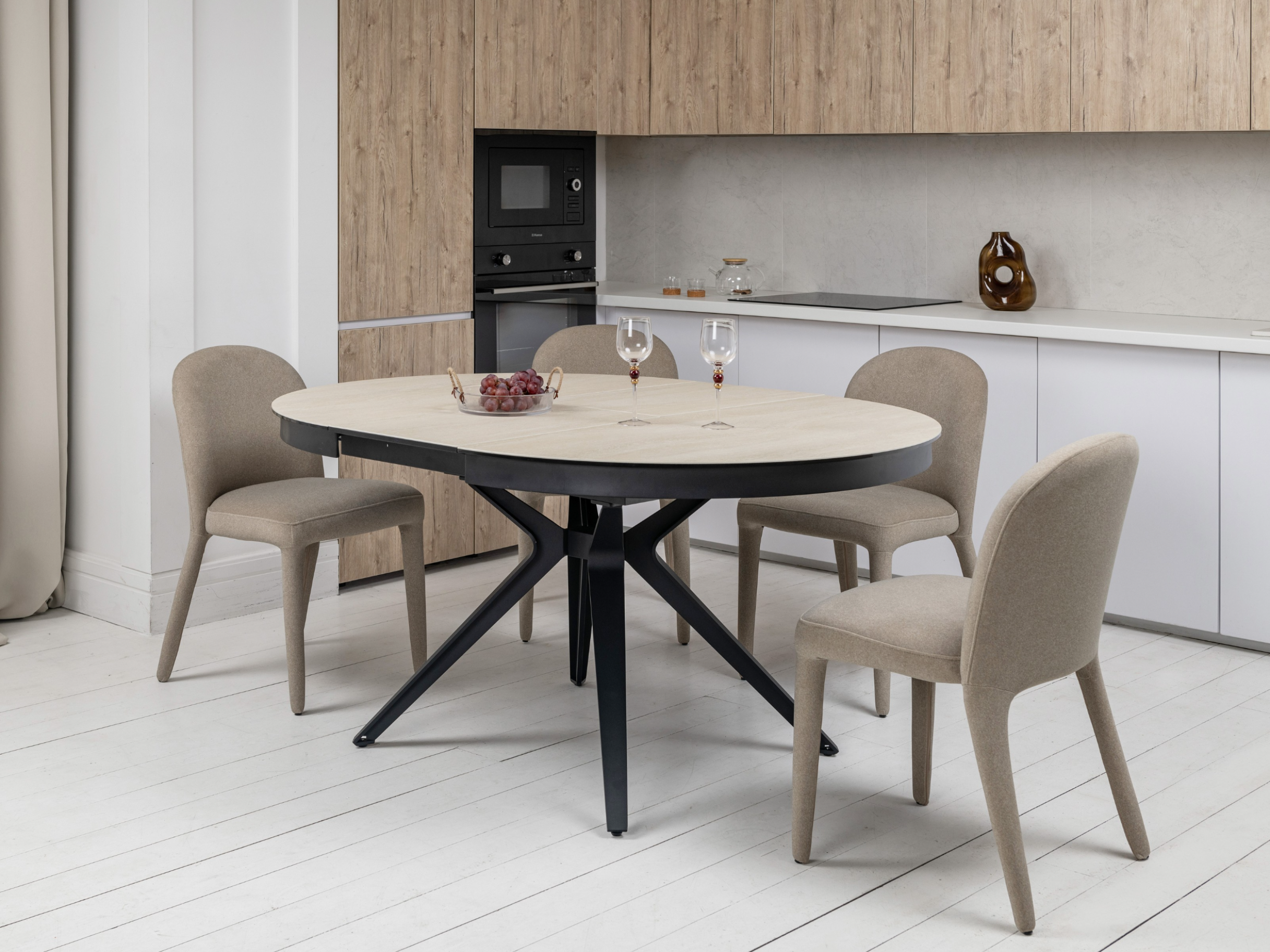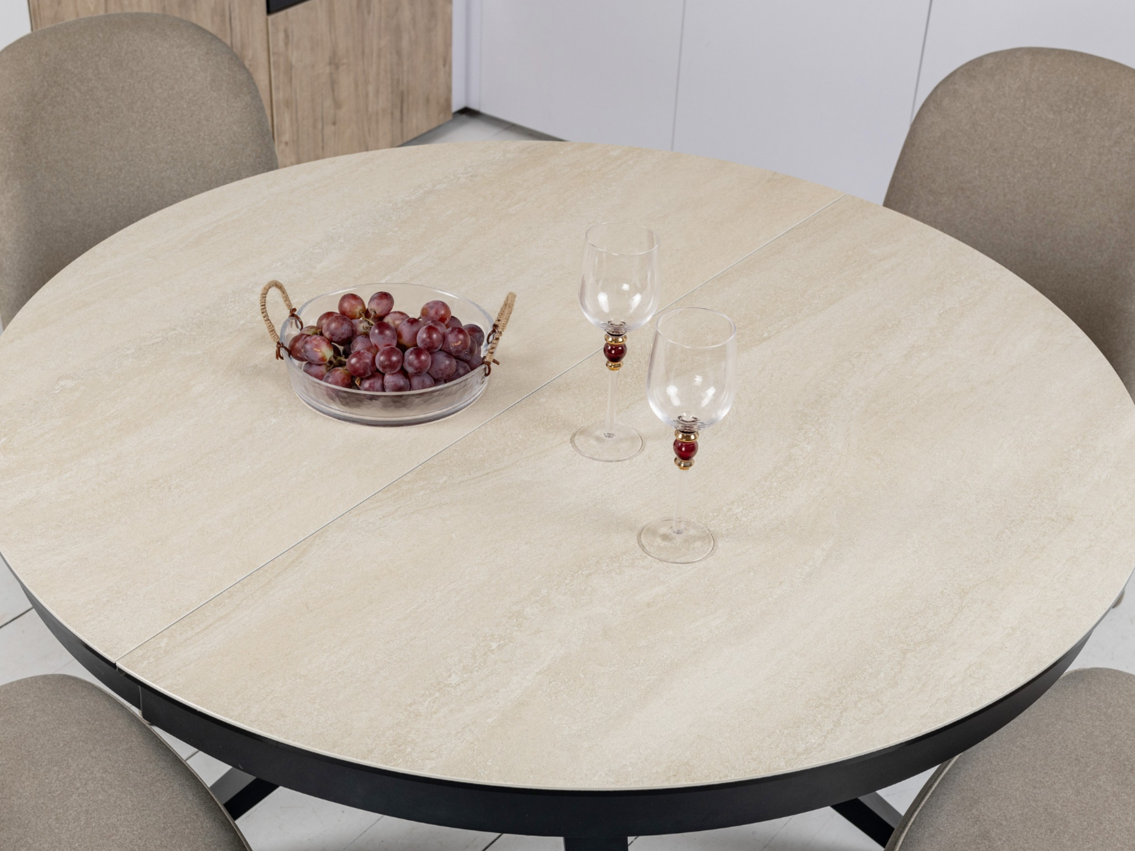 Механізм розкладки “книжка-автомат” робить розкладання стола надзвичайно простим і зручним. Завдяки цьому механізму стіл можна легко розкласти з круглої форми діаметром 120 см до максимальної довжини 160 см, що робить його універсальним для різних ситуацій.