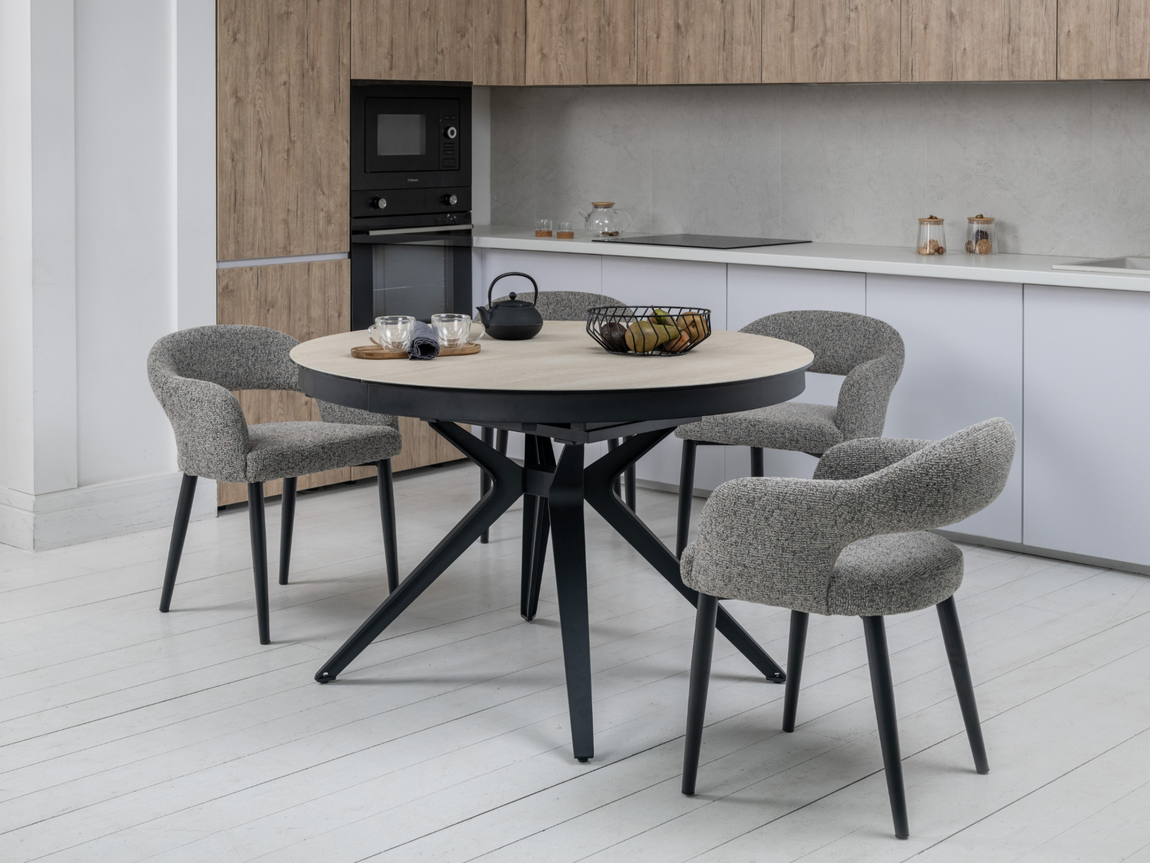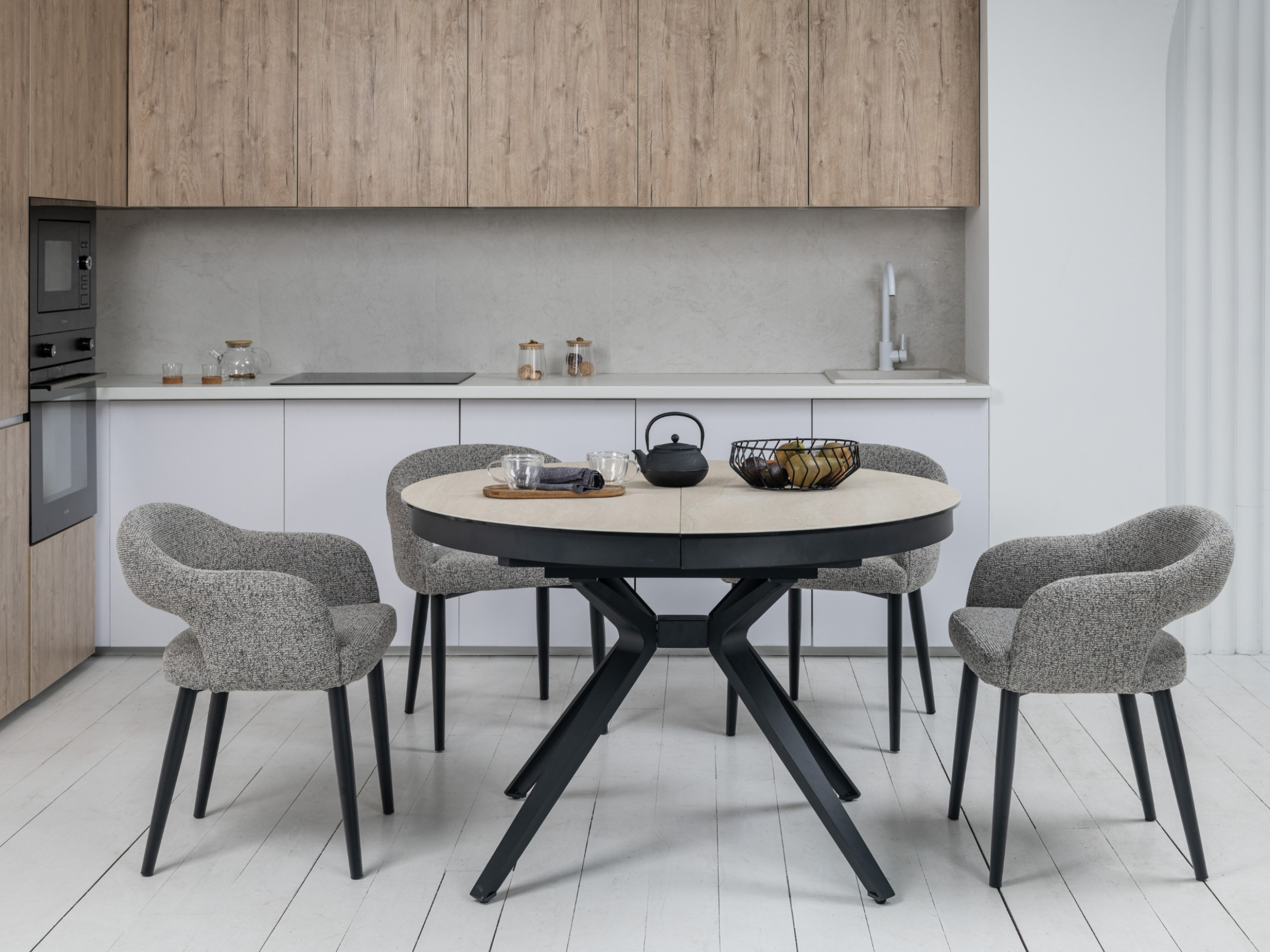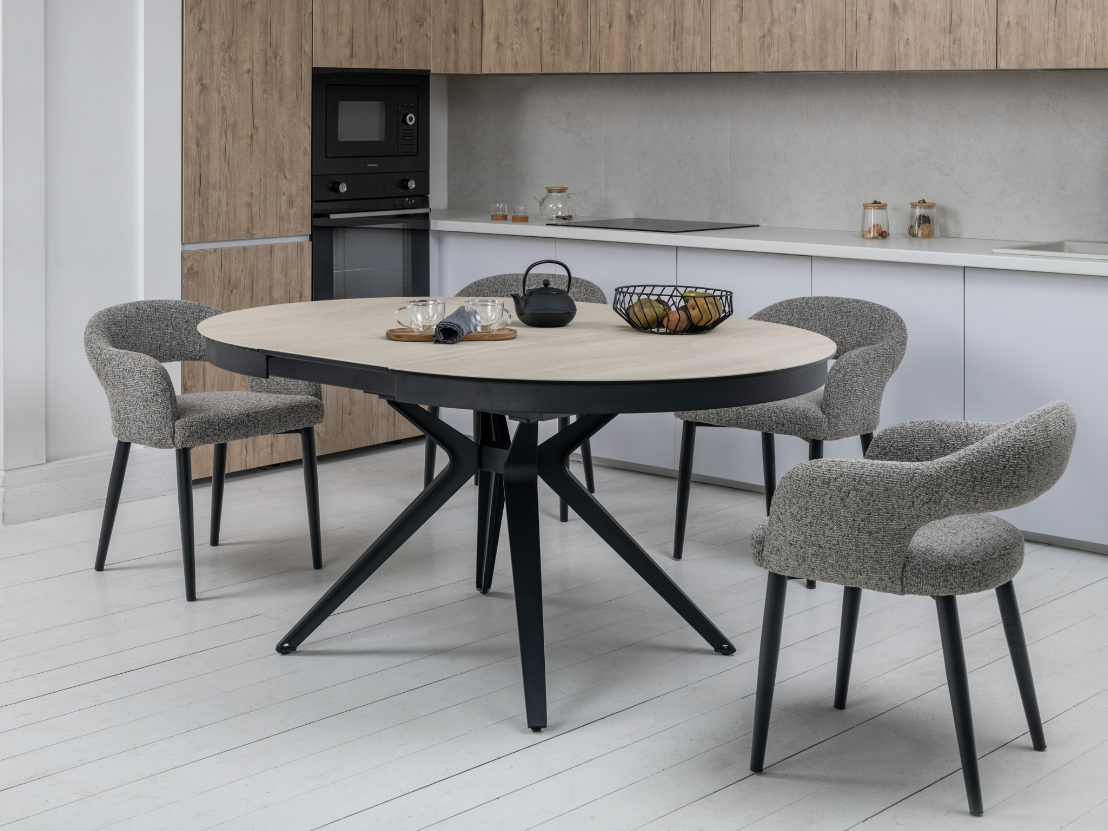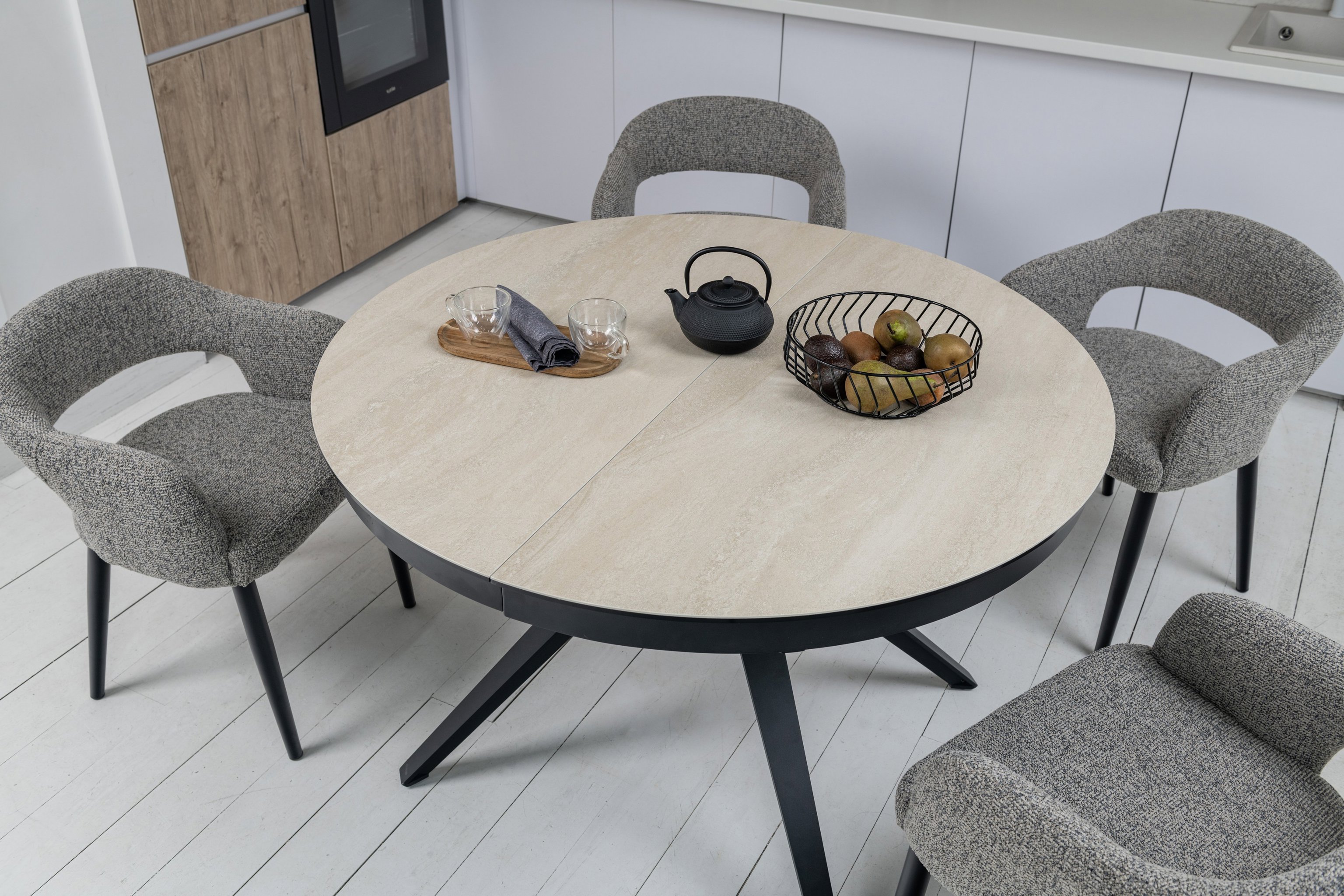 Механізм розкладки “книжка-автомат” робить розкладання стола надзвичайно простим і зручним. Завдяки цьому механізму стіл можна легко розкласти з круглої форми діаметром 120 см до максимальної довжини 160 см, що робить його універсальним для різних ситуацій.