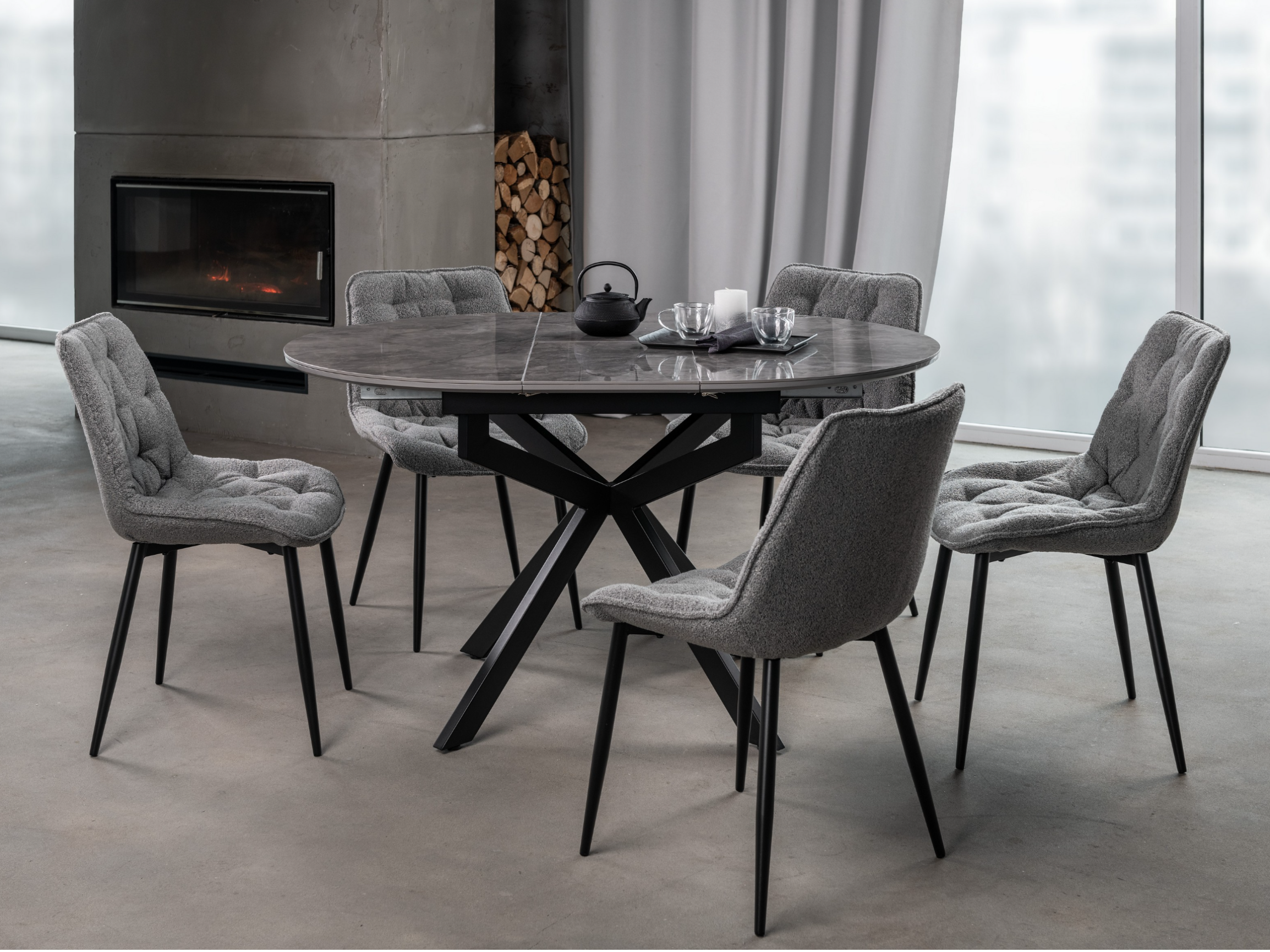 Завдяки механізму розкладки "книжка-автомат", стіл легко трансформується з компактного круглого діаметра 105 см у більш просторий овальний формат з максимальною довжиною 138 см. Це дозволяє використовувати його як у щоденних сімейних вечорах, так і для прийому гостей, забезпечуючи зручність і функціональність.