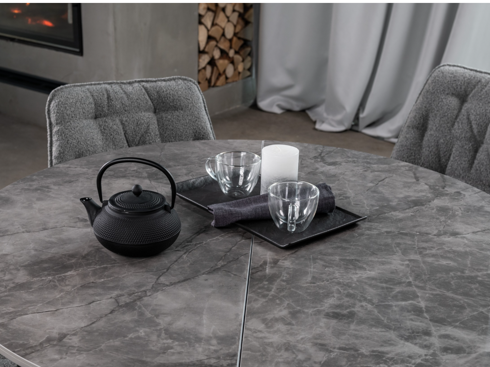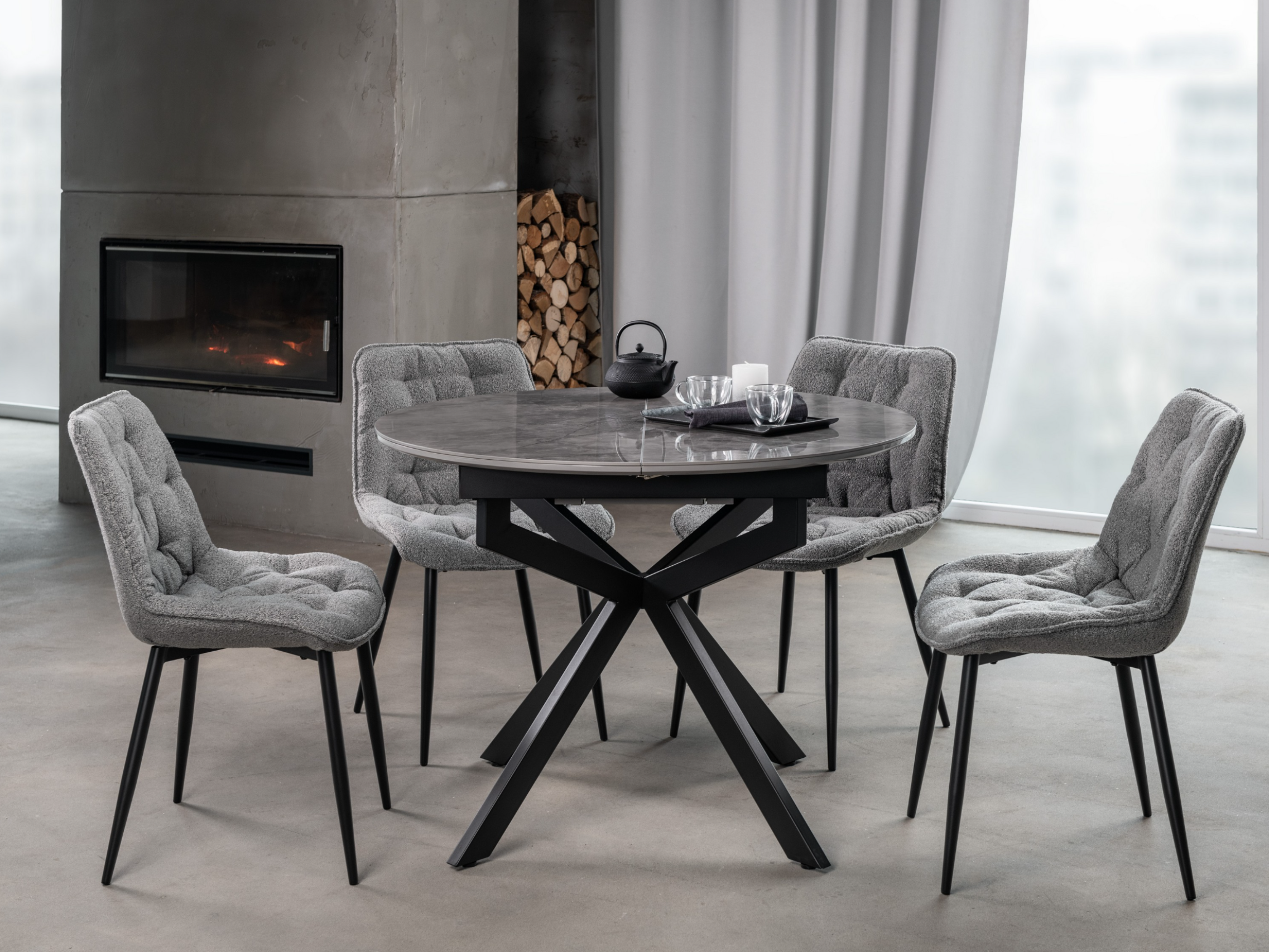 Керамічний стіл Офелія TML-1250 спайдер грей + чорний — це вишуканий меблевий елемент, який створює атмосферу сучасної розкоші та затишку. Його кругла стільниця виконана з глянцевої кераміки у благородному кольорі "спайдер грей", що імітує текстуру натурального каменю. Глибокі сірі відтінки з витонченими прожилками надають столу характерного шарму, який привертає увагу та гармонійно доповнює сучасні інтер’єри.