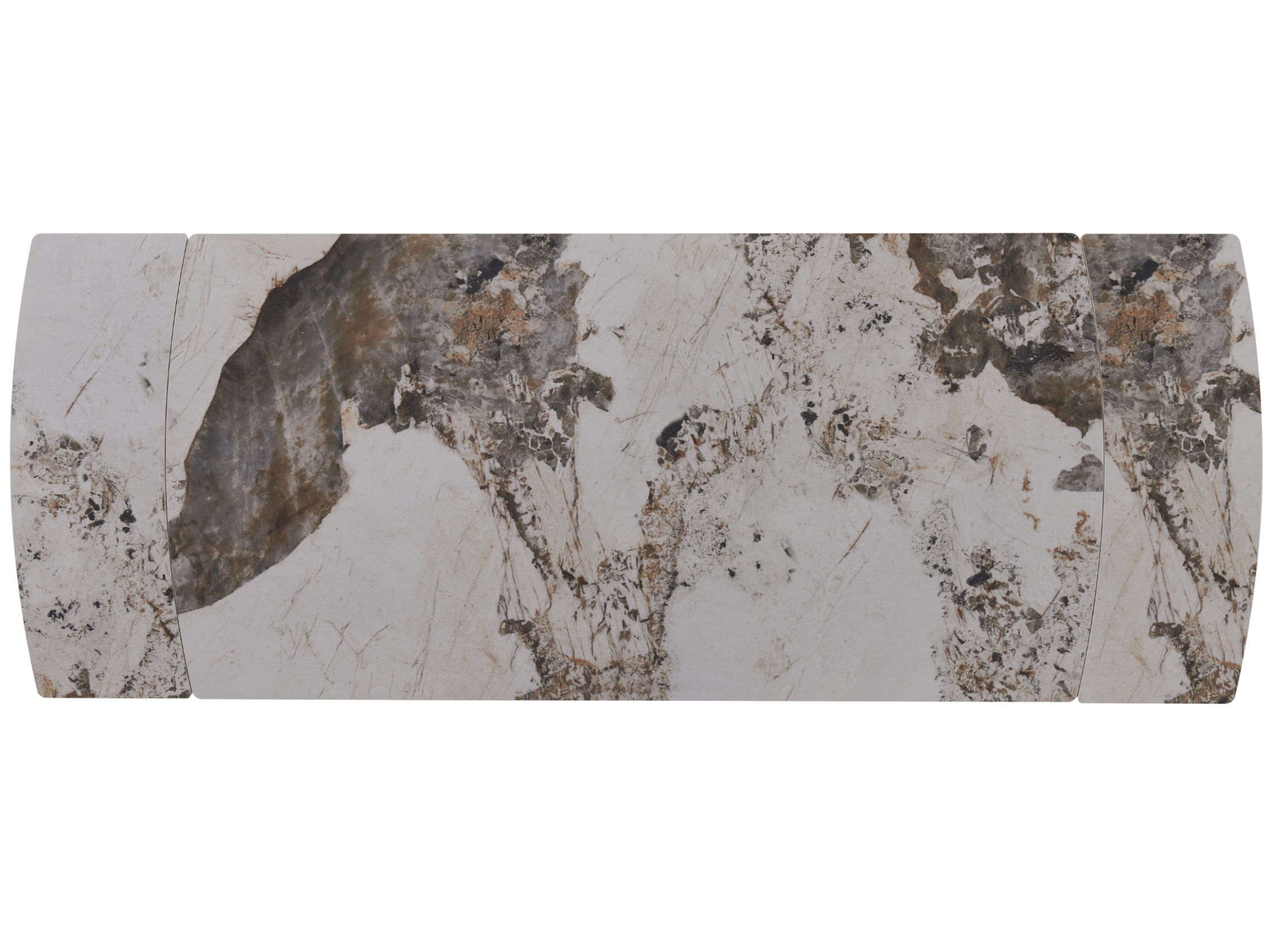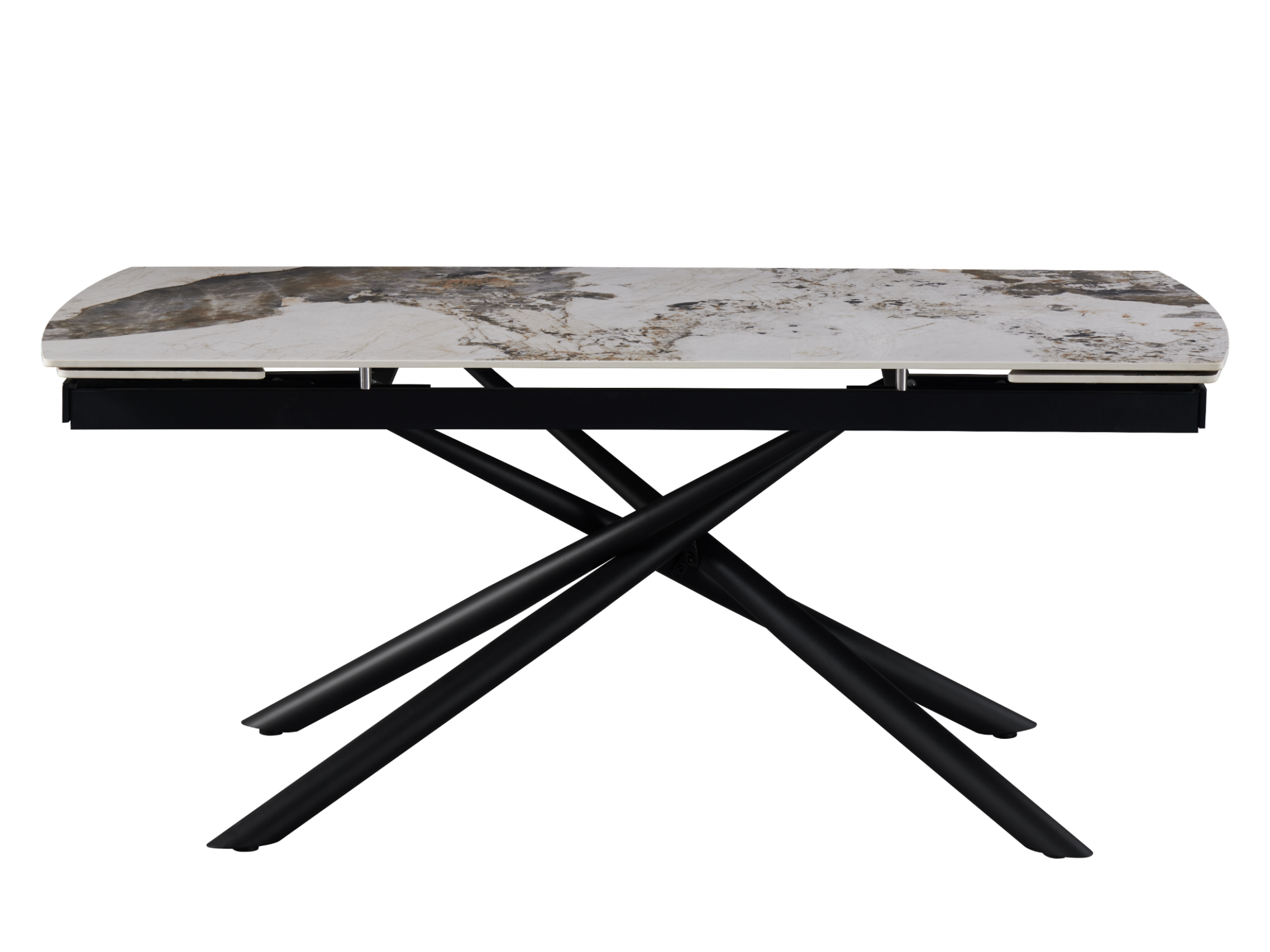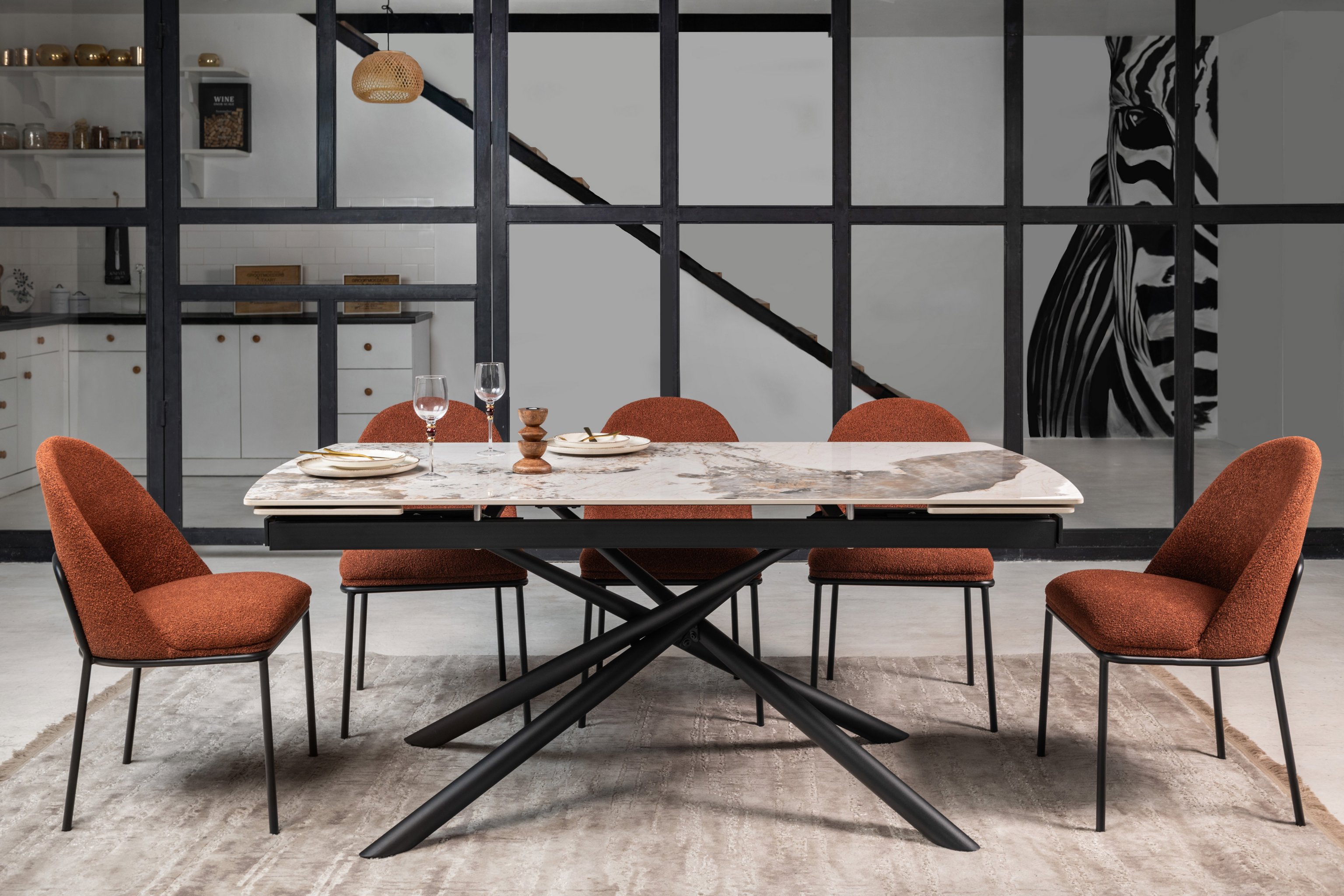 Кераміка в кольорі патагонія з природними прожилками виглядає розкішно та елегантно, а чорна металева основа додає контрасту, підкреслюючи сучасний стиль. Це поєднання створює враження витонченості та елегантності.