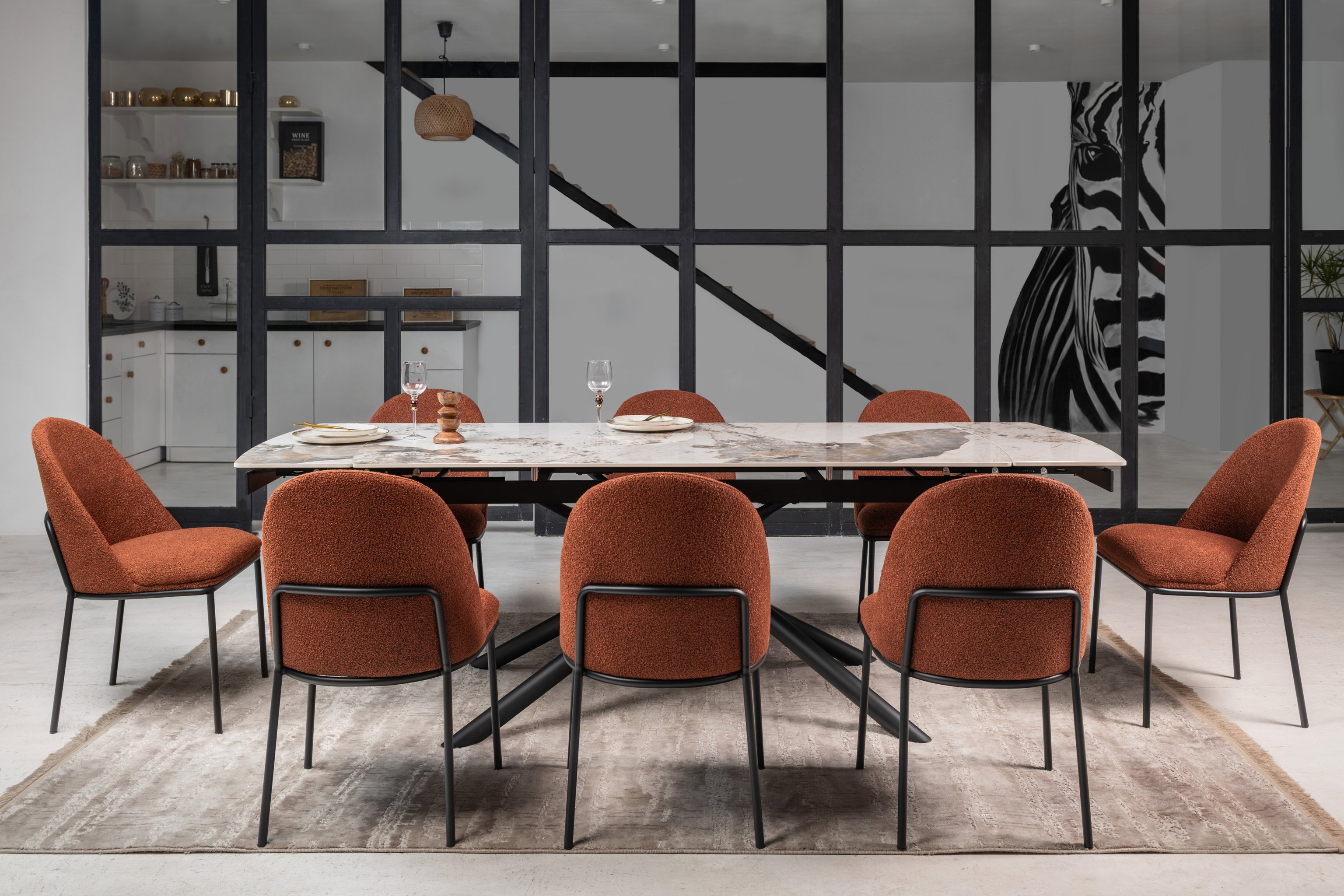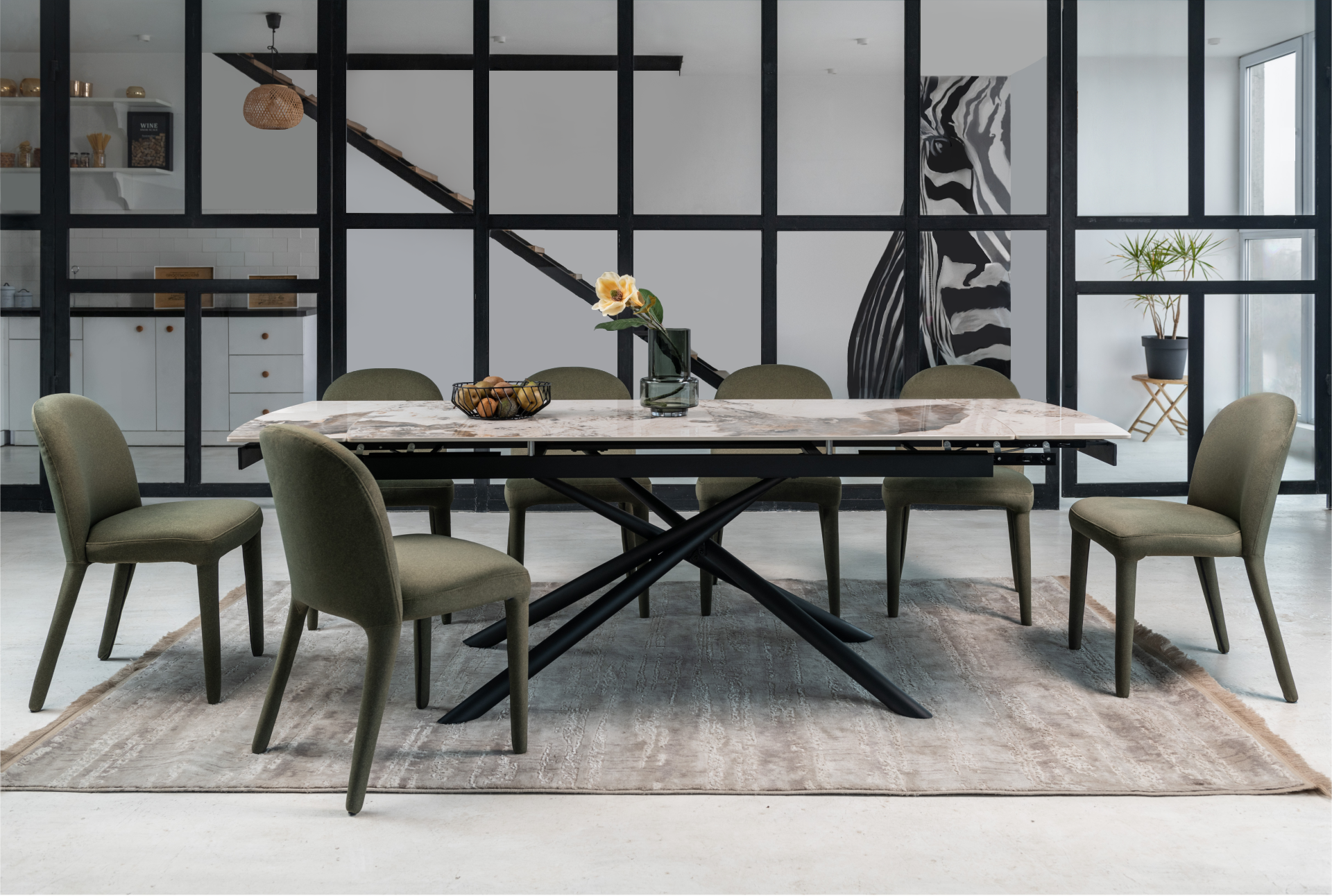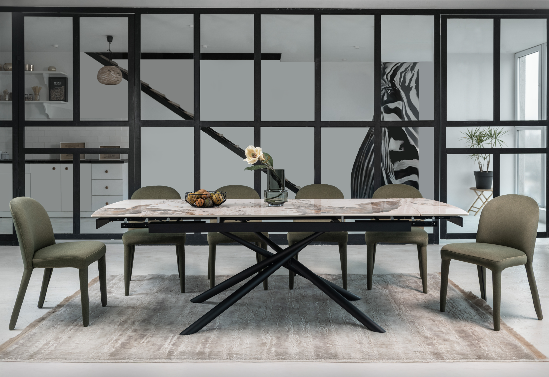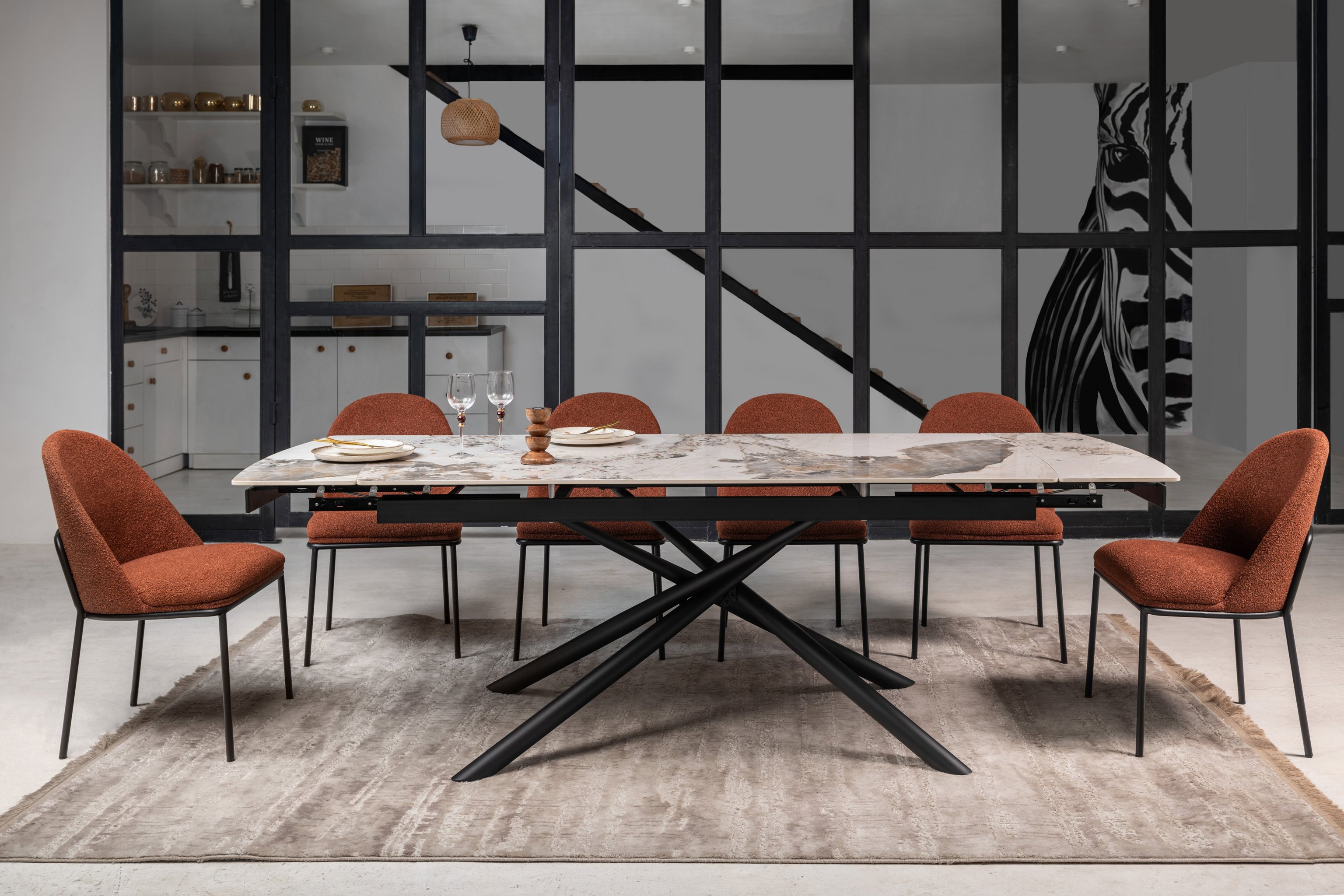 Кераміка в кольорі патагонія з природними прожилками виглядає розкішно та елегантно, а чорна металева основа додає контрасту, підкреслюючи сучасний стиль. Це поєднання створює враження витонченості та елегантності.