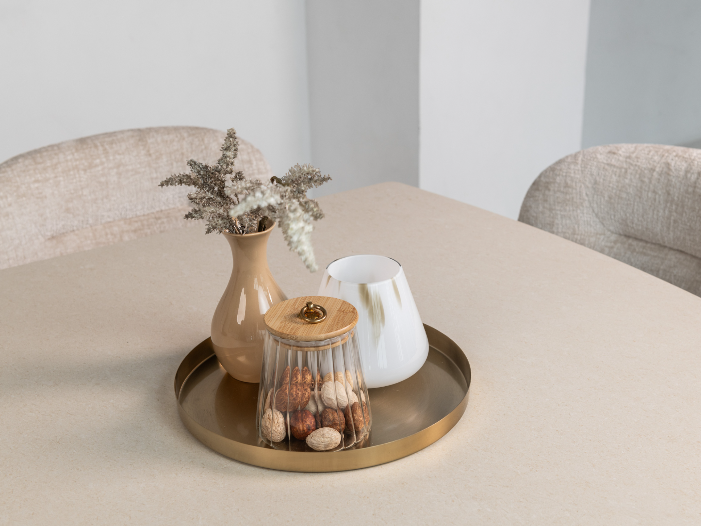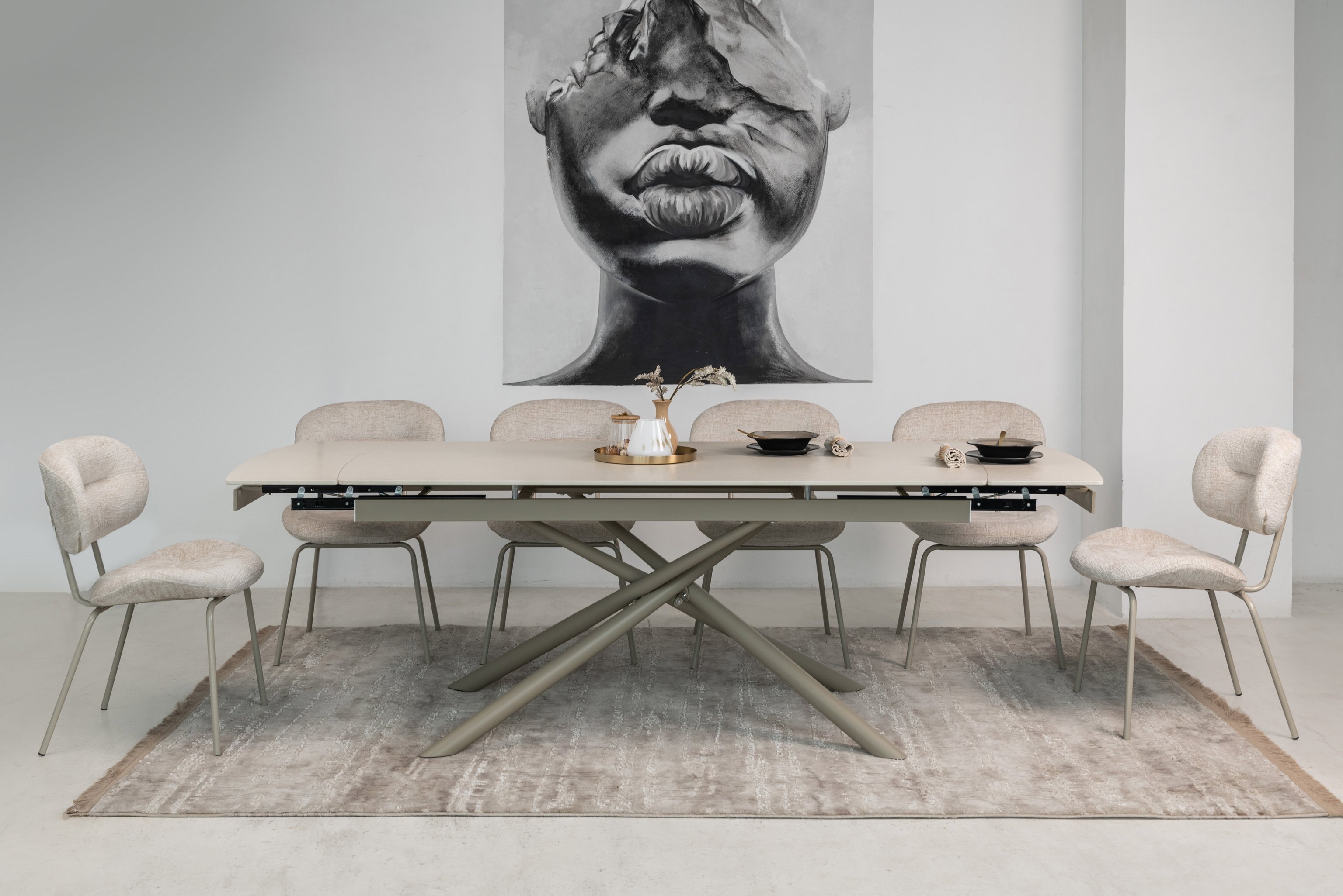 Стільниця в кольорі "венеція делікато" гармонійно поєднується з металевою основою в кольорі "капучино", створюючи елегантний та затишний вигляд. Нейтральний тон стільниці додає світла і простору, а теплий відтінок основи забезпечує візуальний баланс і комфорт. Це поєднання універсальне й легко вписується в інтер’єри різних стилів, додаючи їм сучасності та витонченості.