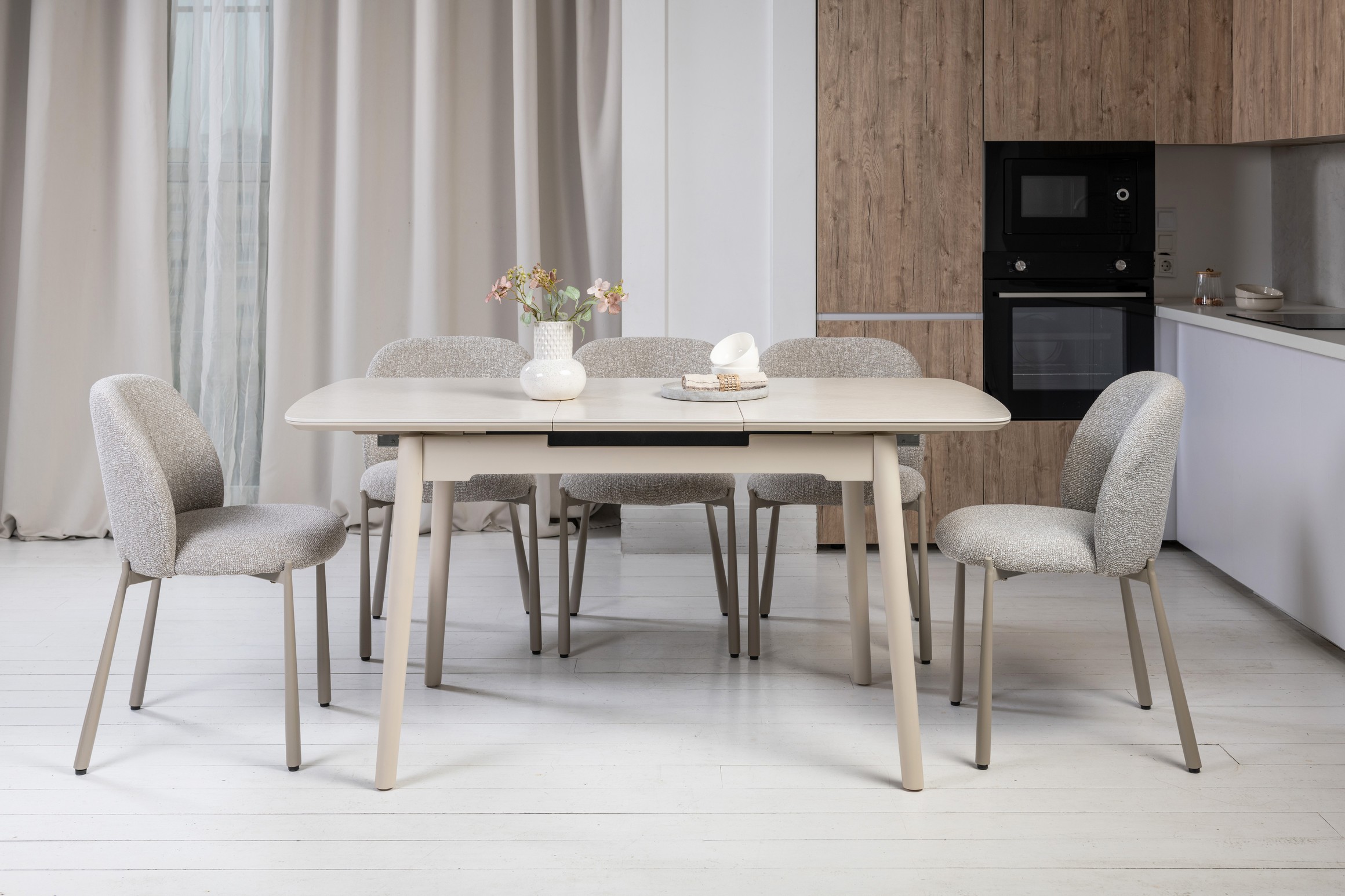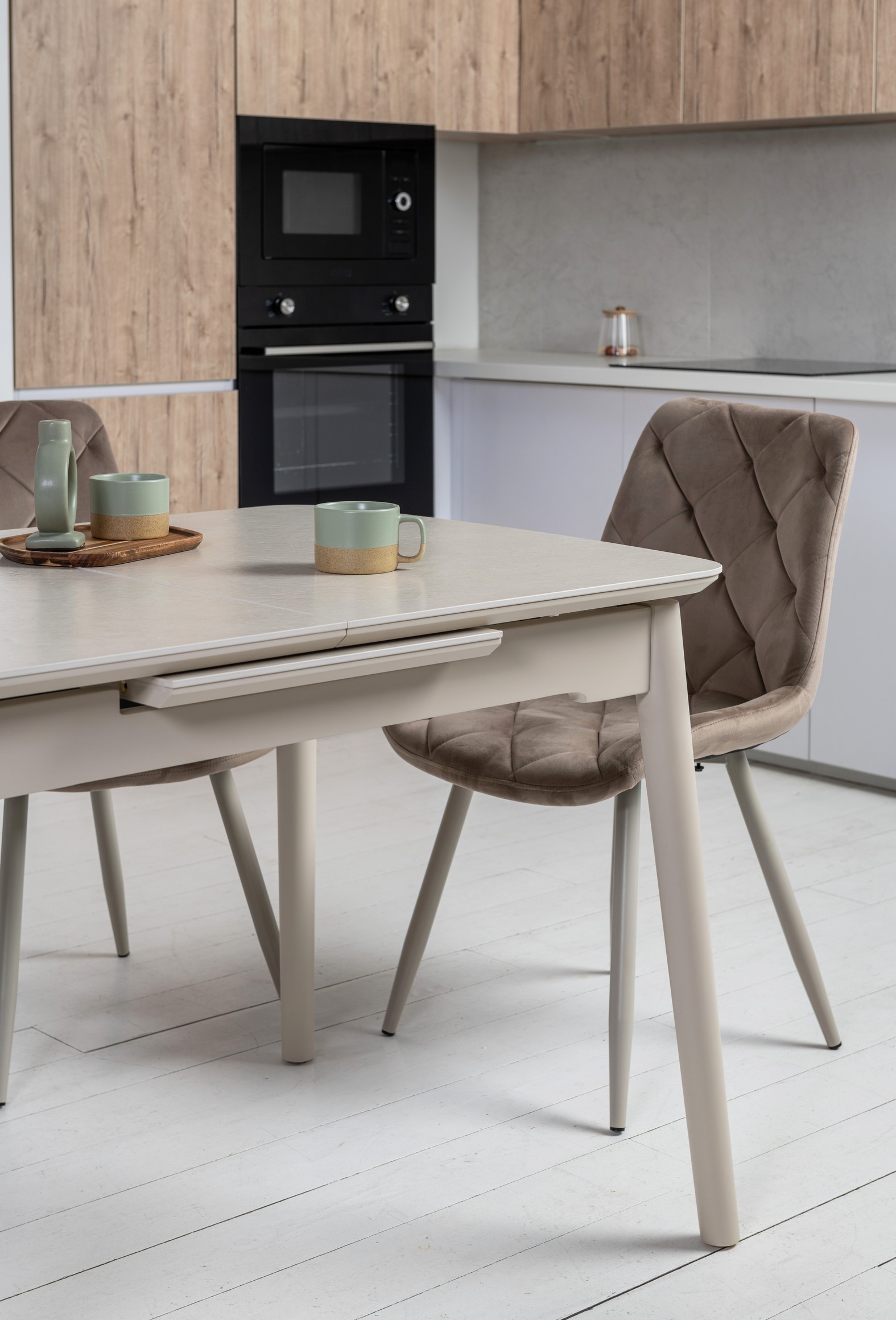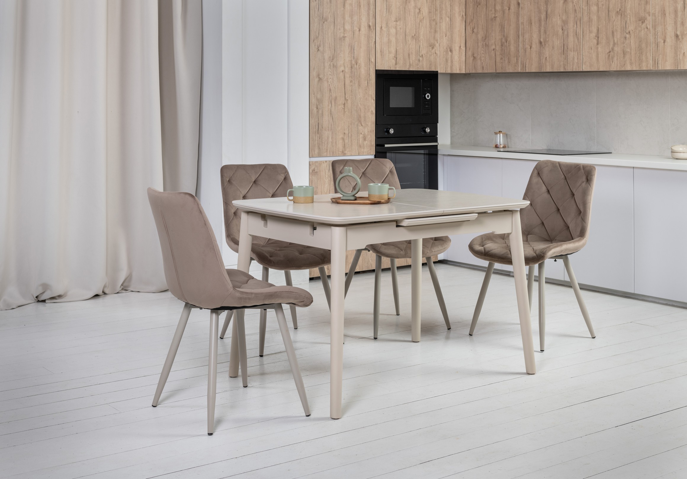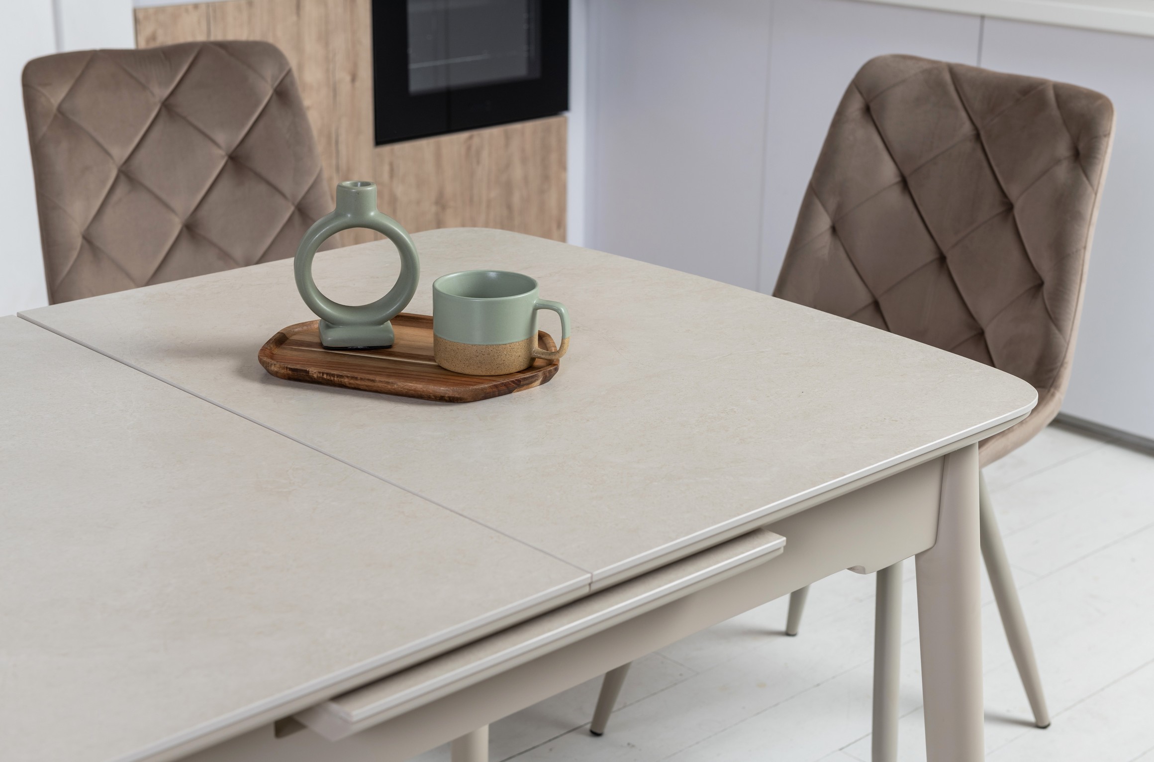 Стільниця з матової кераміки та МДФ вирізняється стійкістю до подряпин, плям і перепадів температур, зберігаючи бездоганний вигляд роками. Вбудований автоматичний механізм розкладання дозволяє легко збільшити довжину стола до 160 см — ідеальне рішення для прийому гостей або святкових подій.