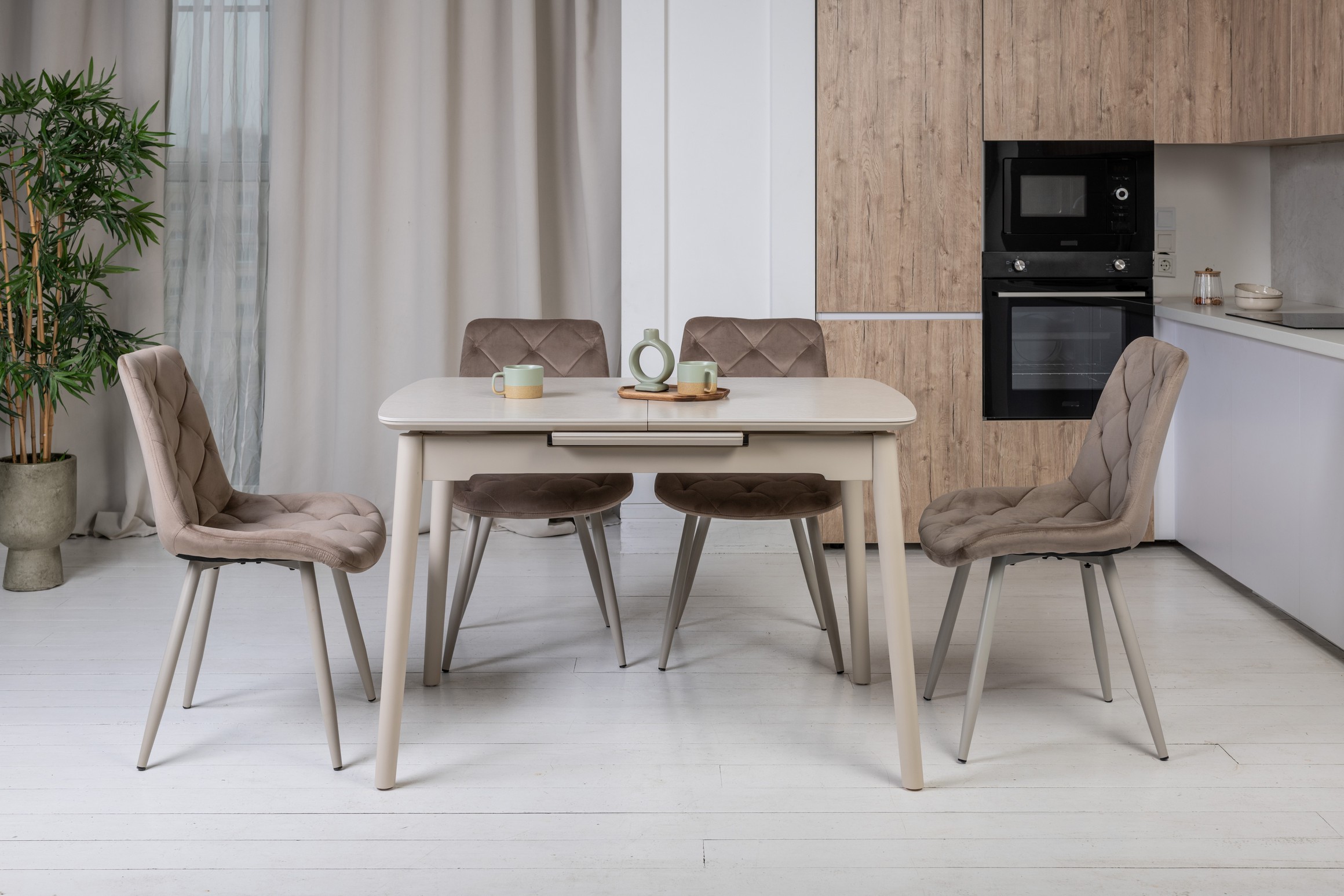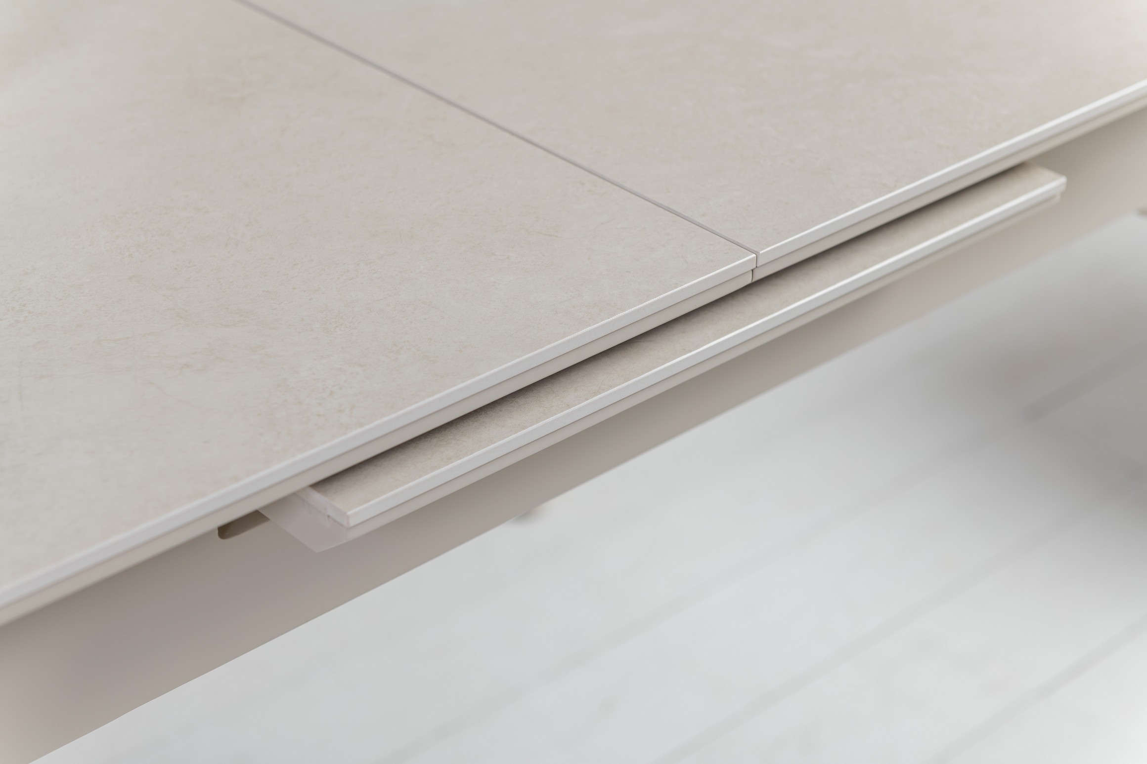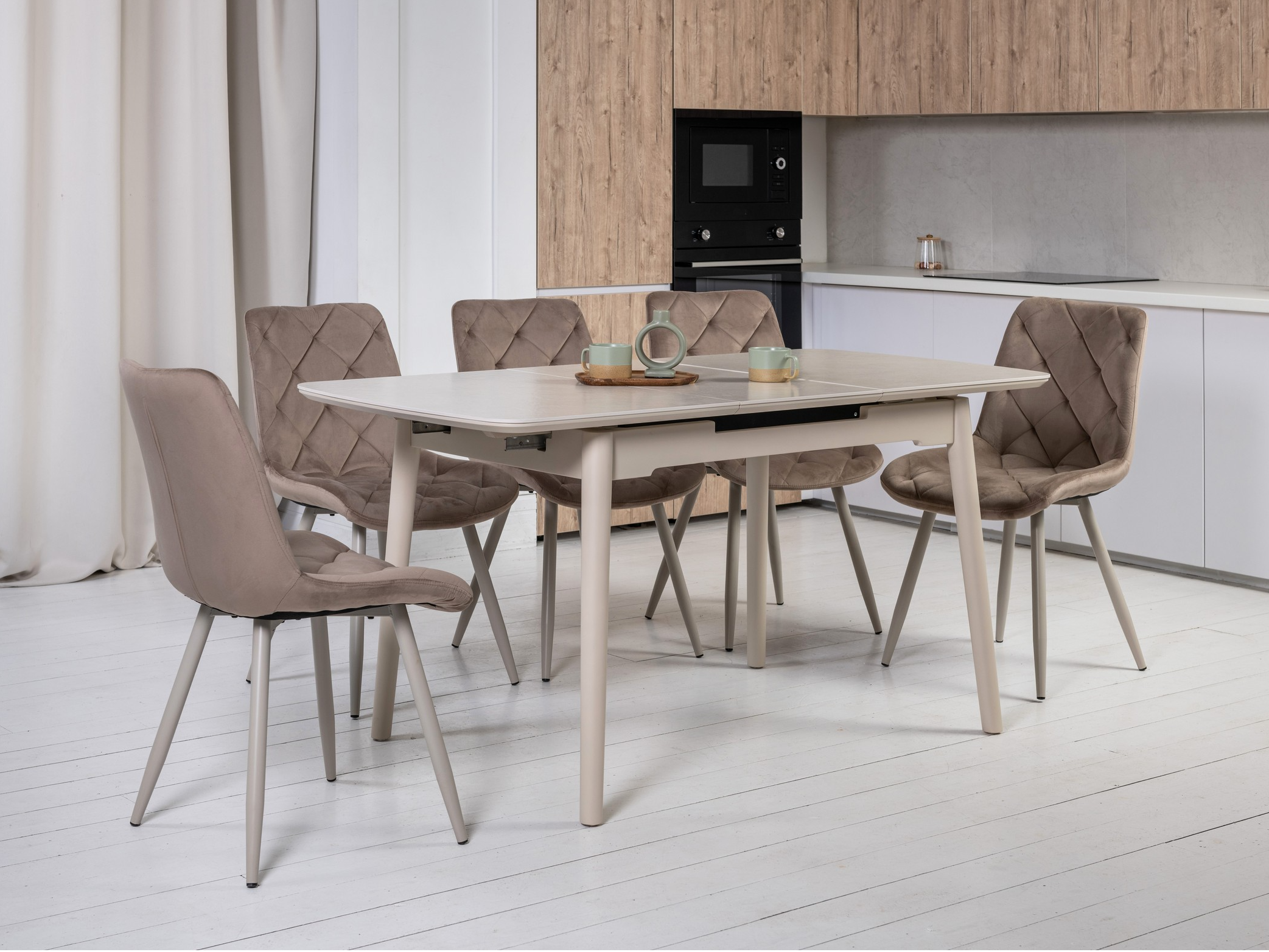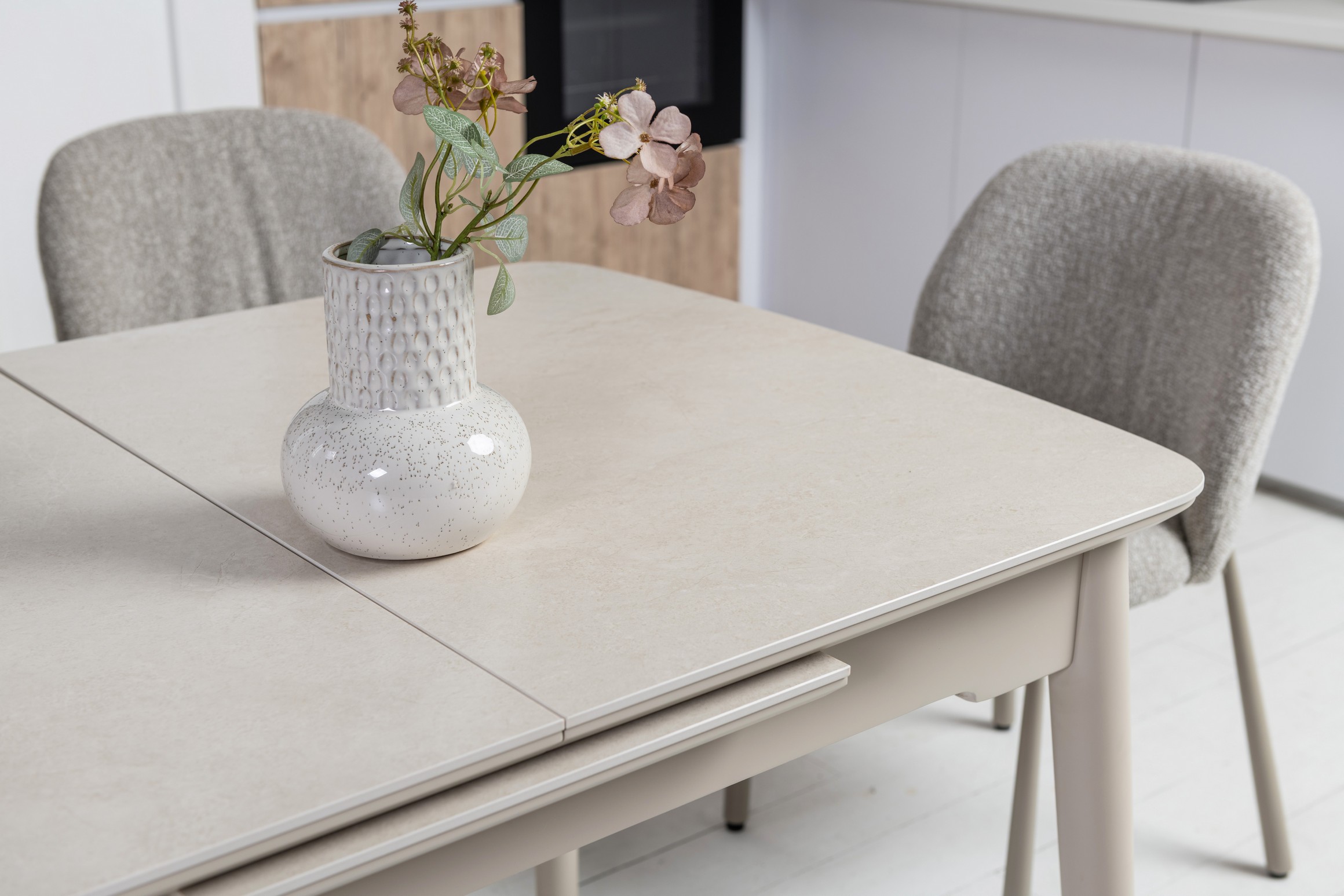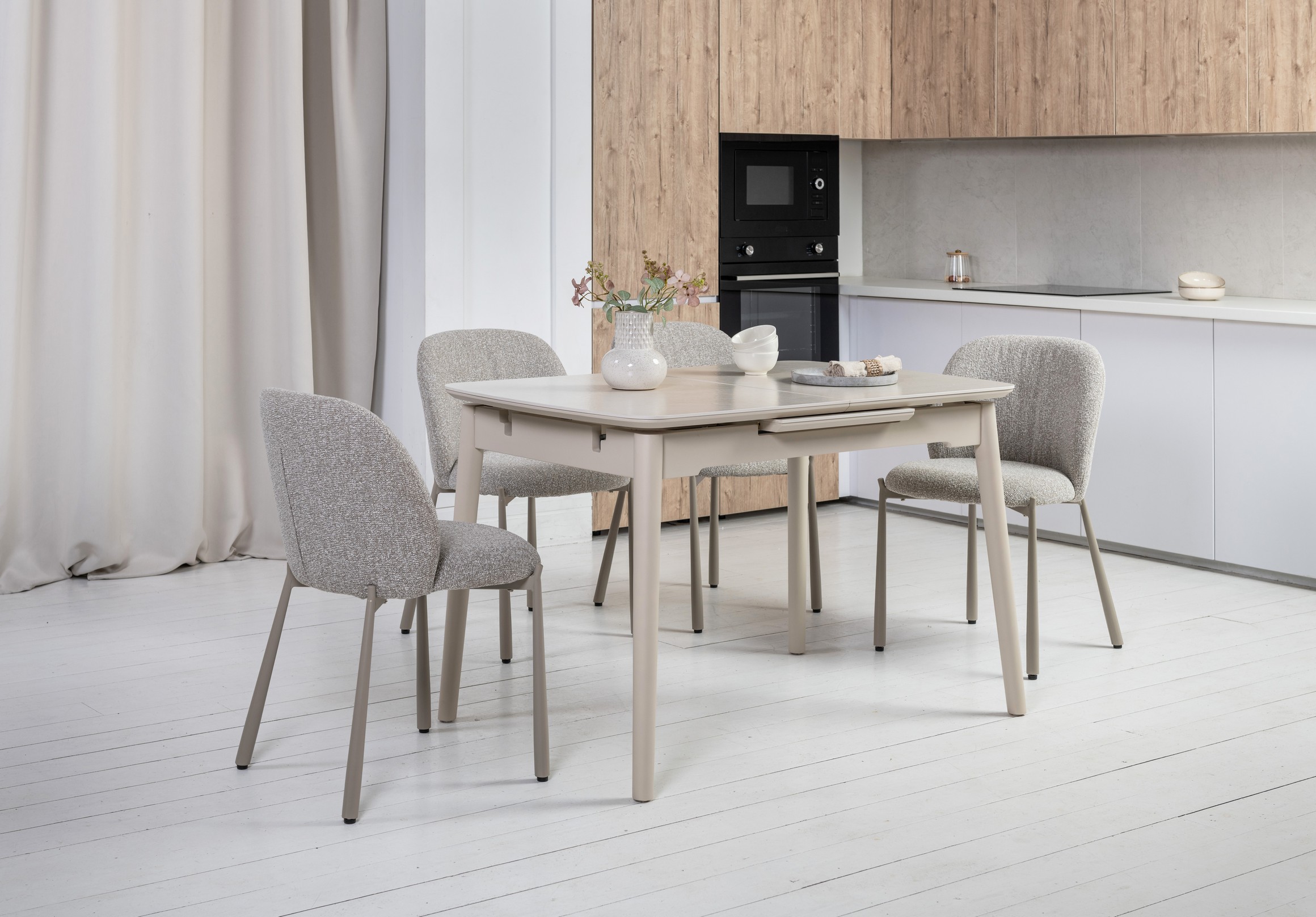 Стільниця з матової кераміки та МДФ вирізняється стійкістю до подряпин, плям і перепадів температур, зберігаючи бездоганний вигляд роками. Вбудований автоматичний механізм розкладання дозволяє легко збільшити довжину стола до 160 см — ідеальне рішення для прийому гостей або святкових подій.