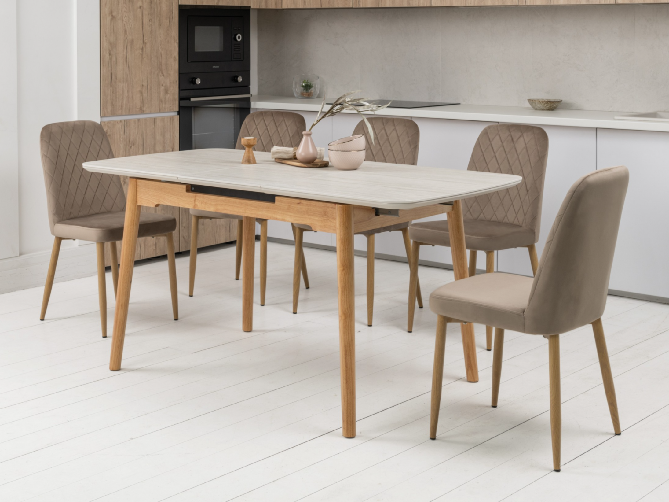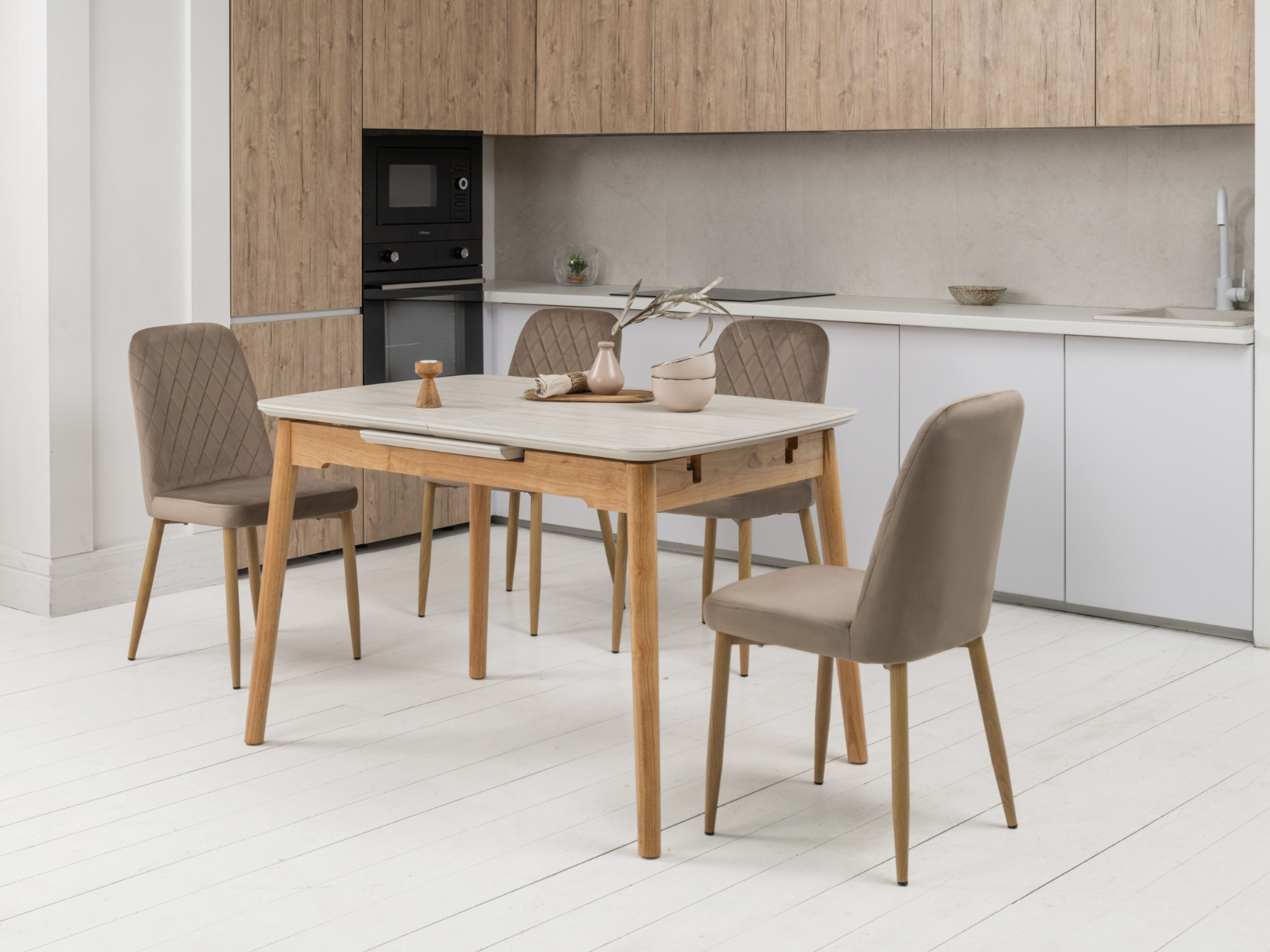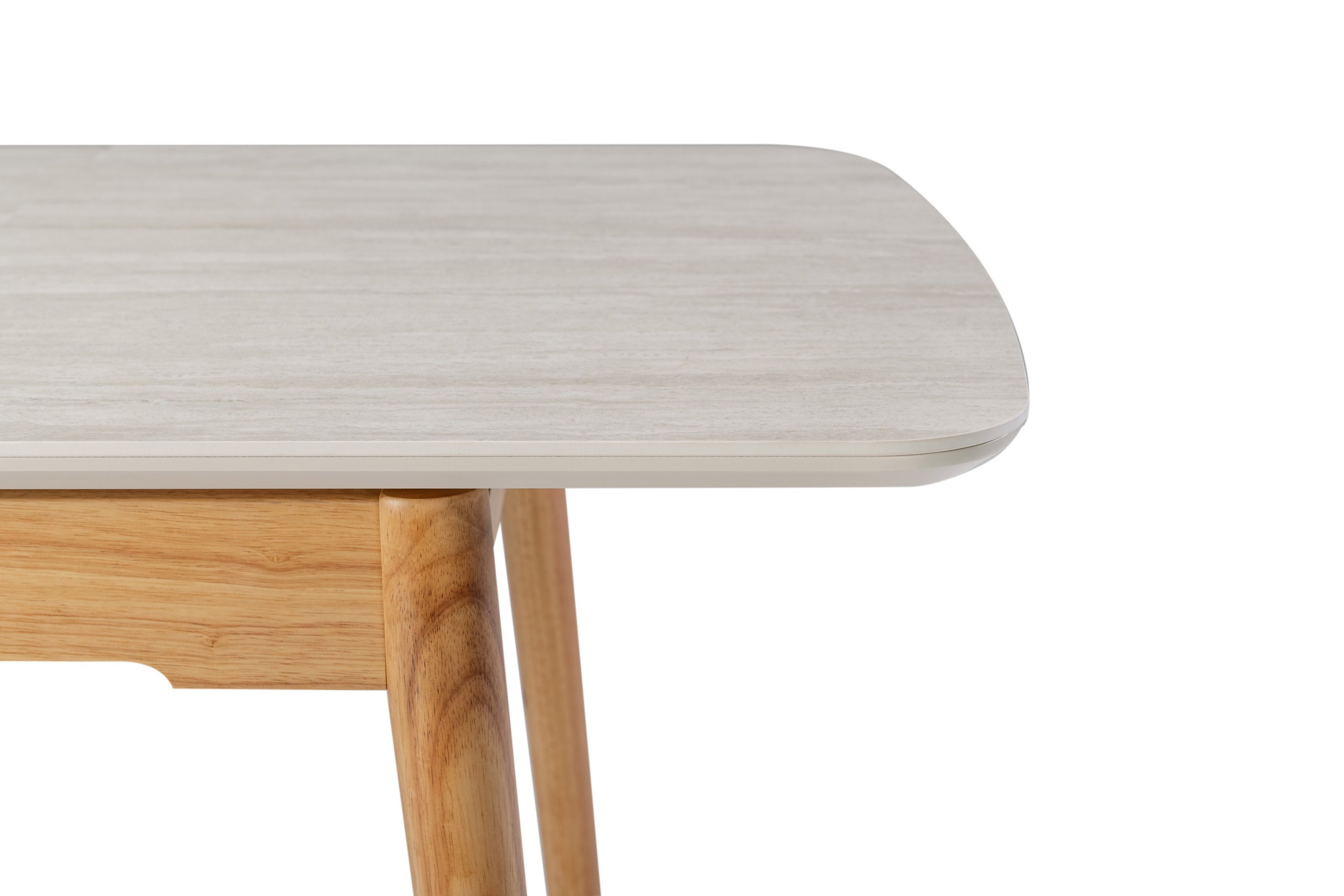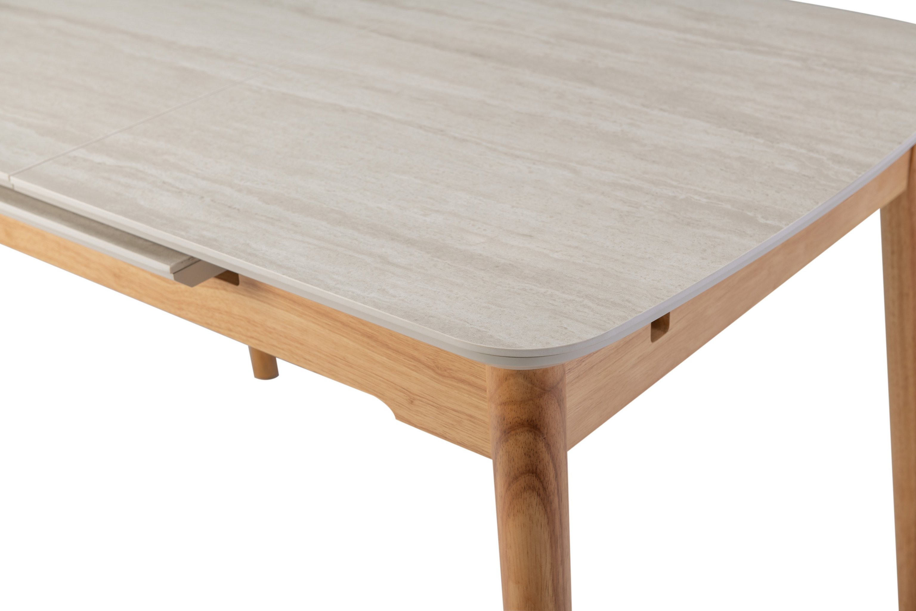 Основа столу виконана з дерева дуб, що додає конструкції природного тепла і гармонійно поєднується з кольором стільниці. Дерев'яна основа забезпечує міцність і стабільність столу, створюючи відчуття надійності та довговічності.