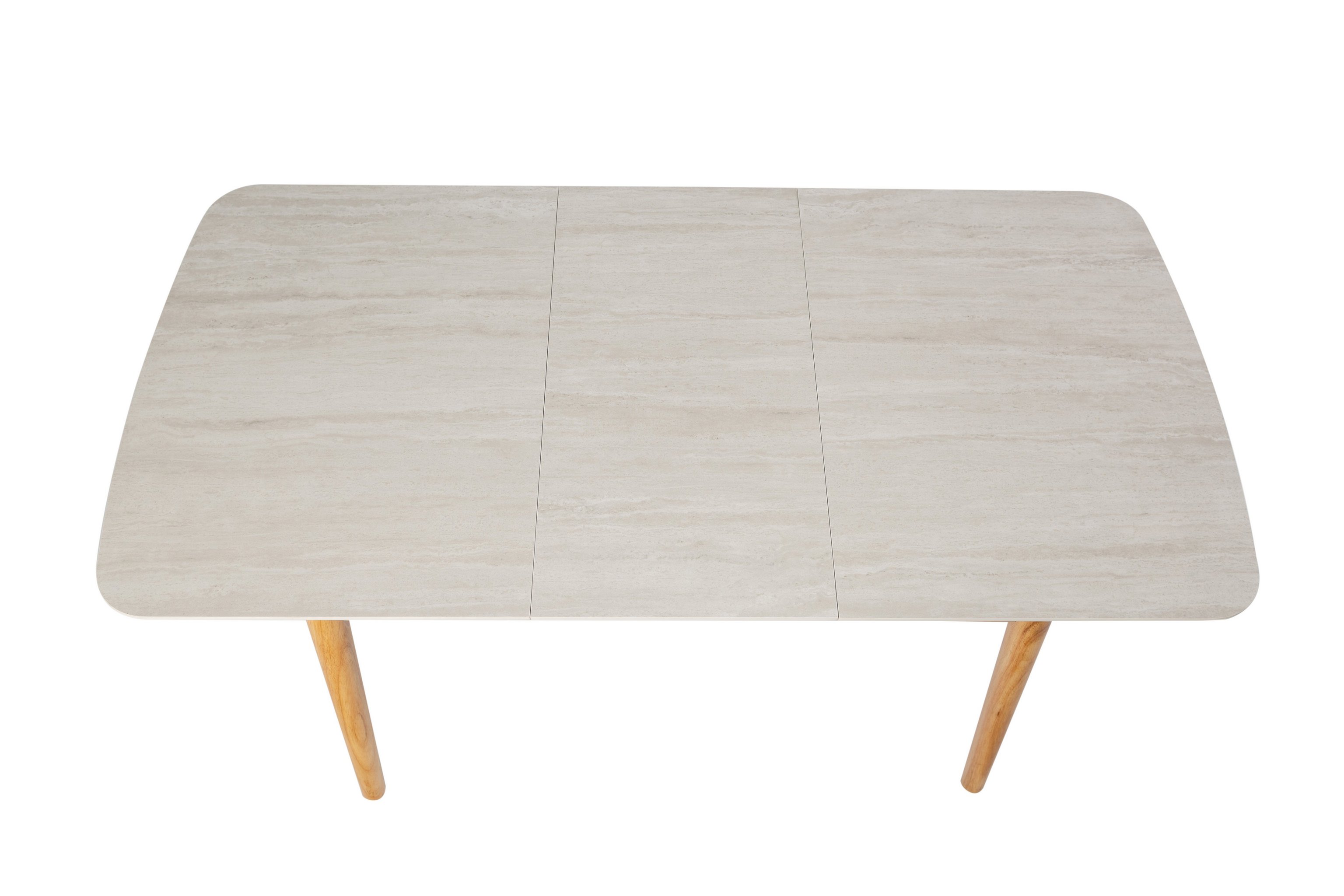Стільниця виконана в кольорі "травертін", що нагадує природний камінь з його характерними текстурами і відтінками. Цей колір надає столу елегантності та підкреслює природну красу матеріалів.