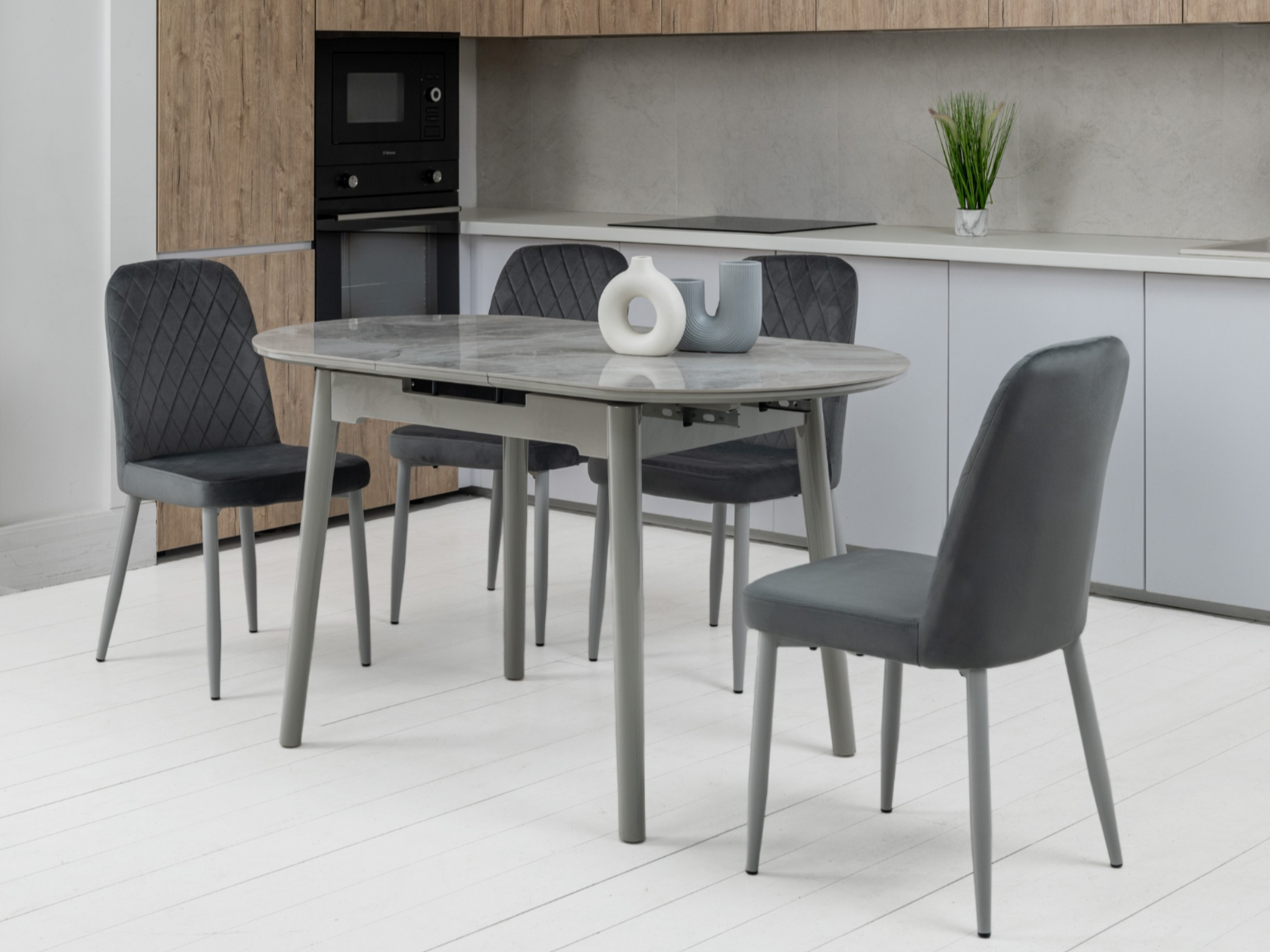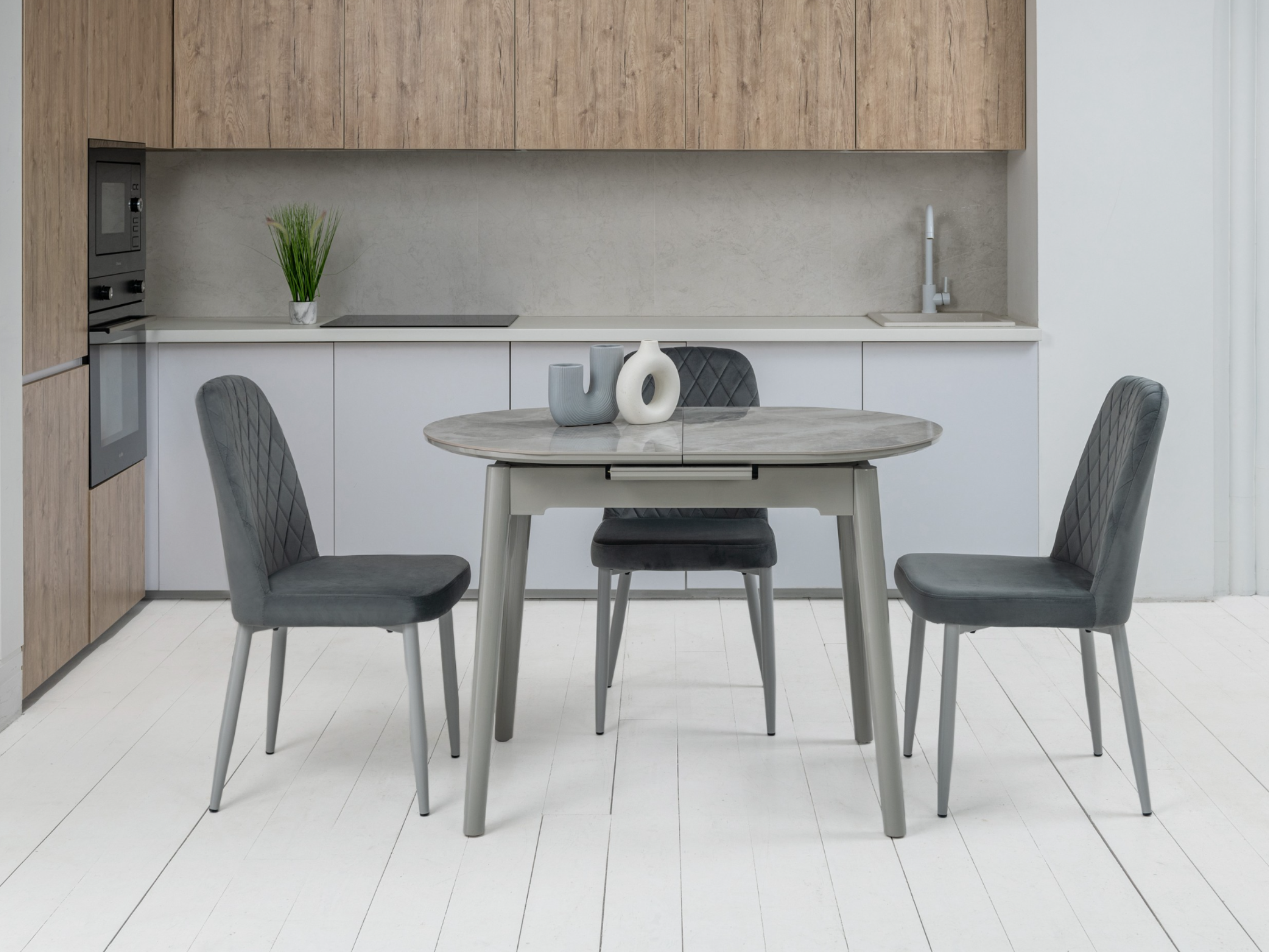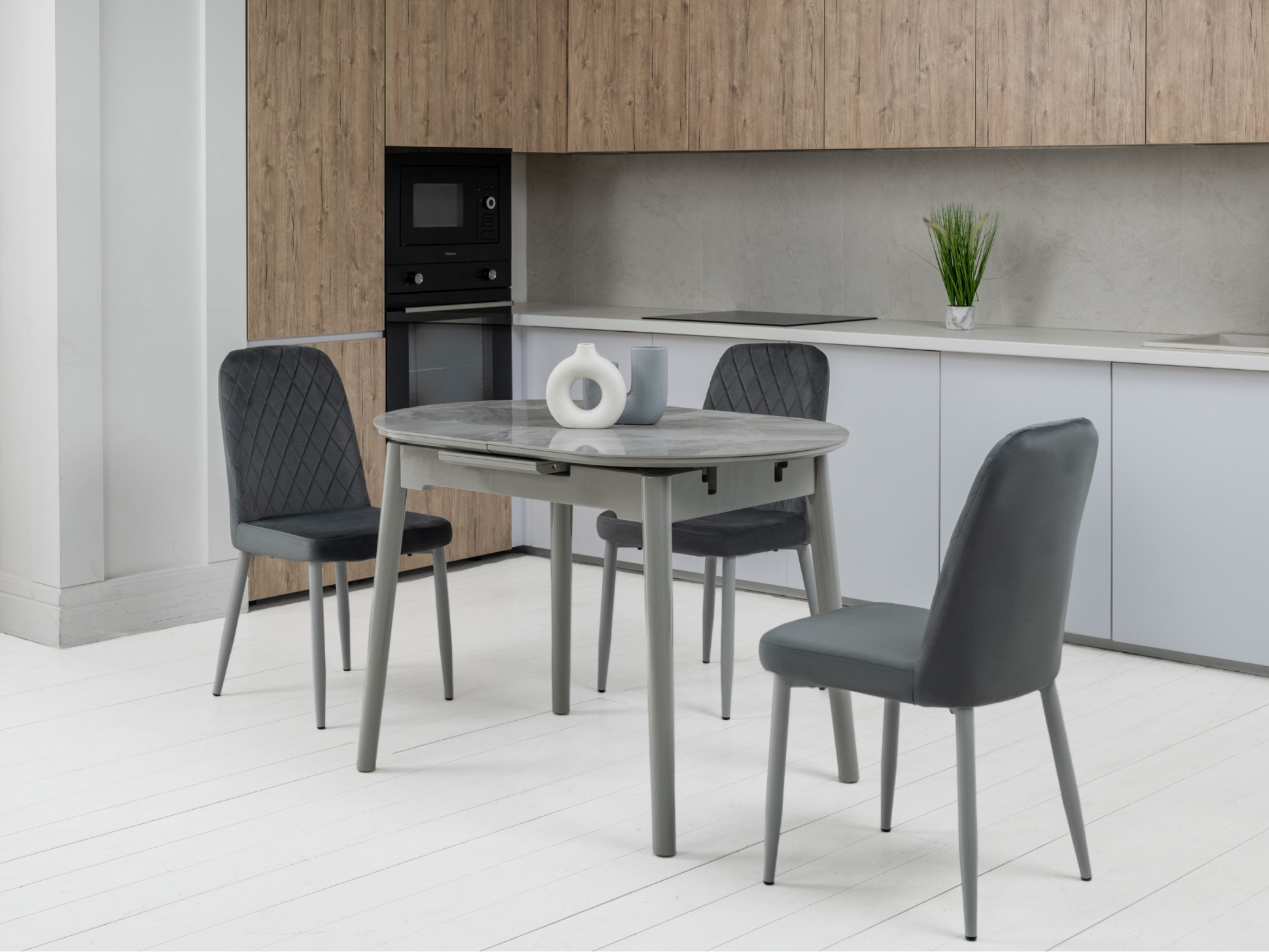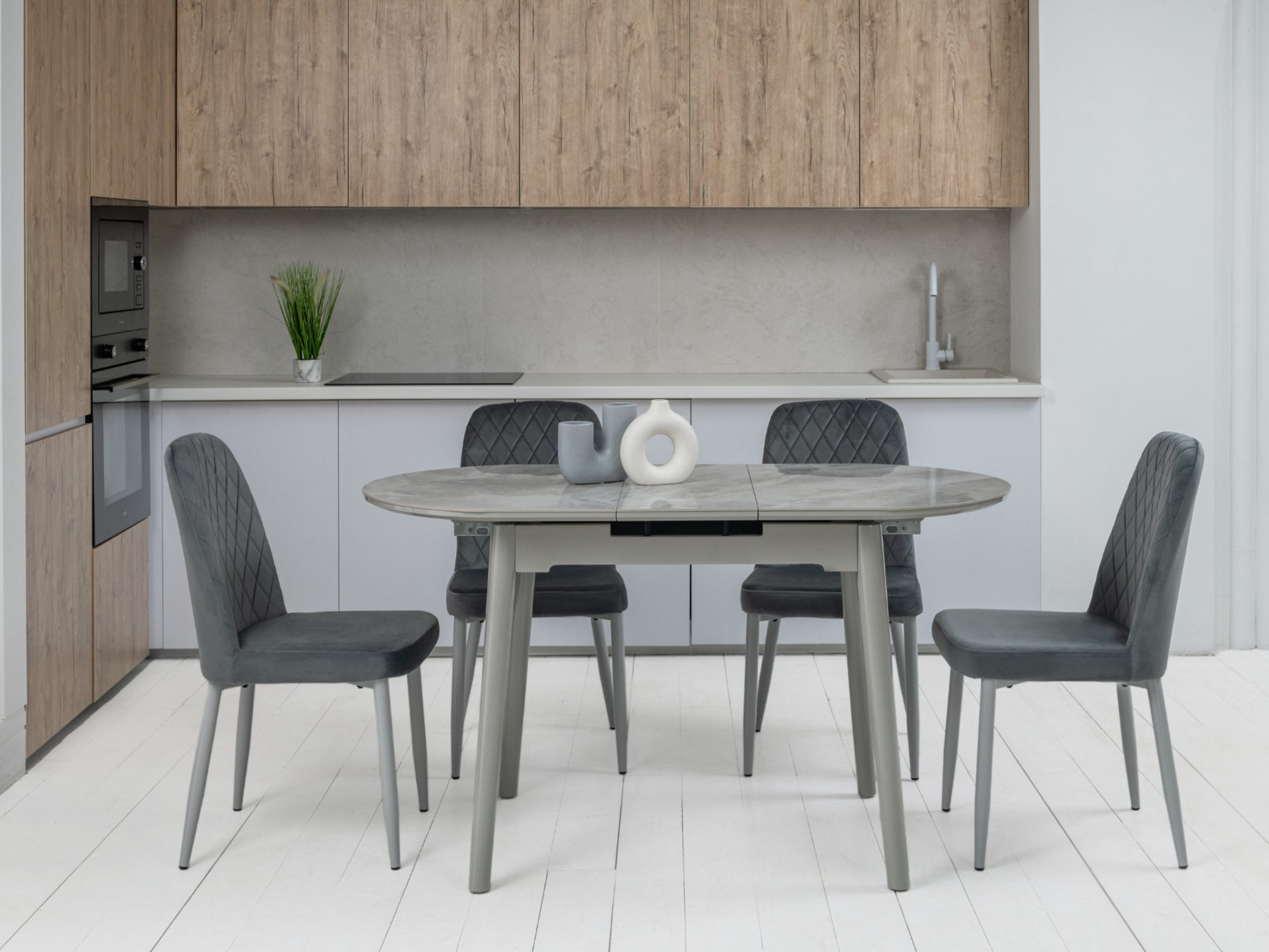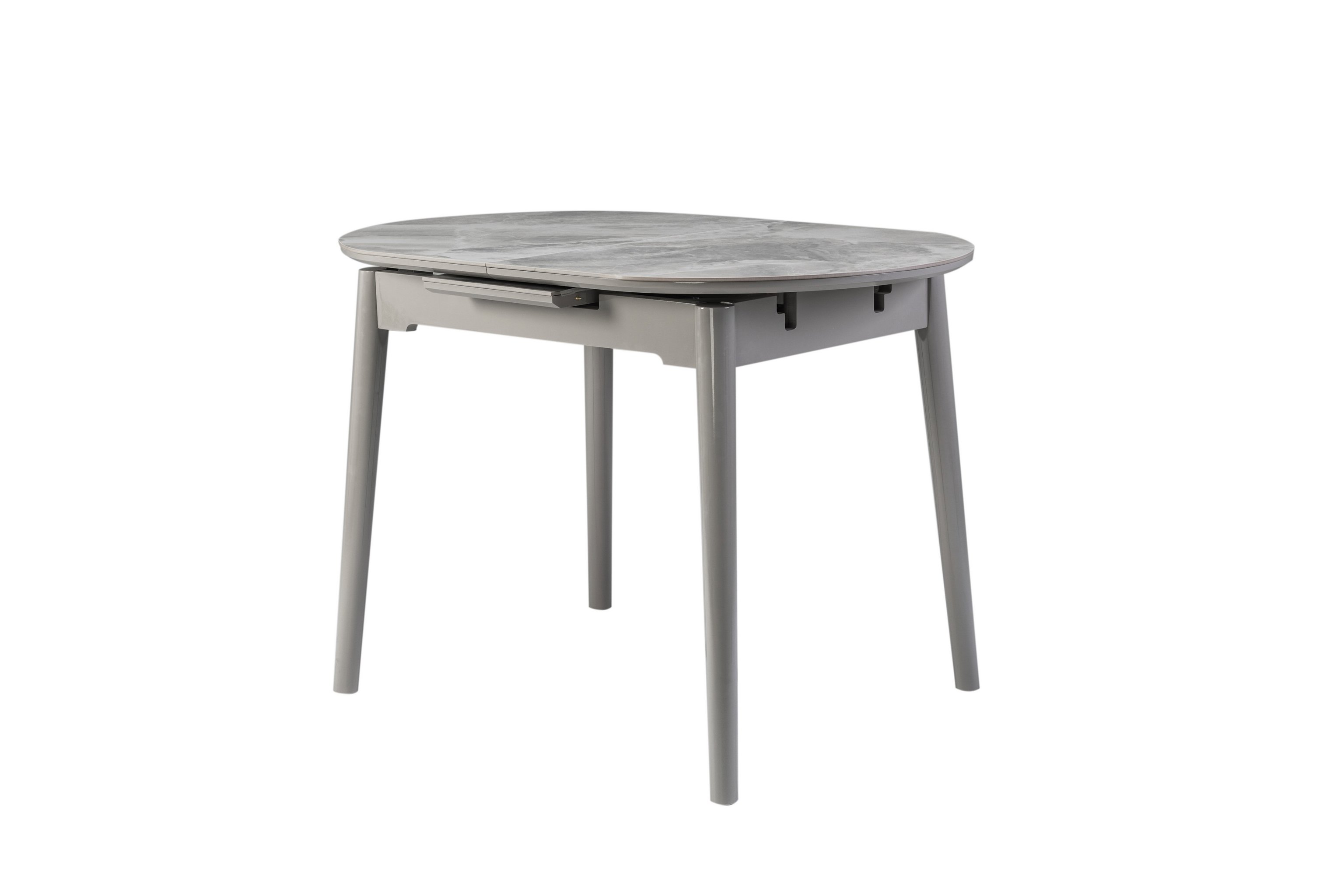 Завдяки своїй компактній овальній формі і розмірам - 110 см у довжину і 75 см у ширину, цей стіл ідеально підходить для маленьких їдалень. Розкладна конструкція з максимальною довжиною стільниці 140 см робить його ще більш практичним для різних подій - від сімейних обідів до вечірок з друзями.