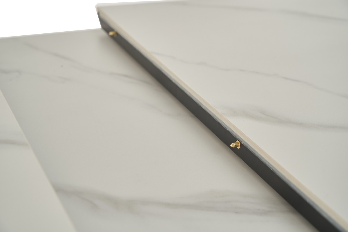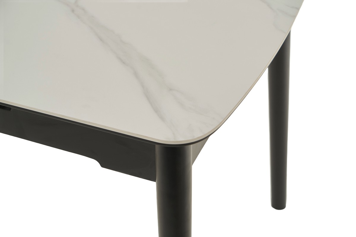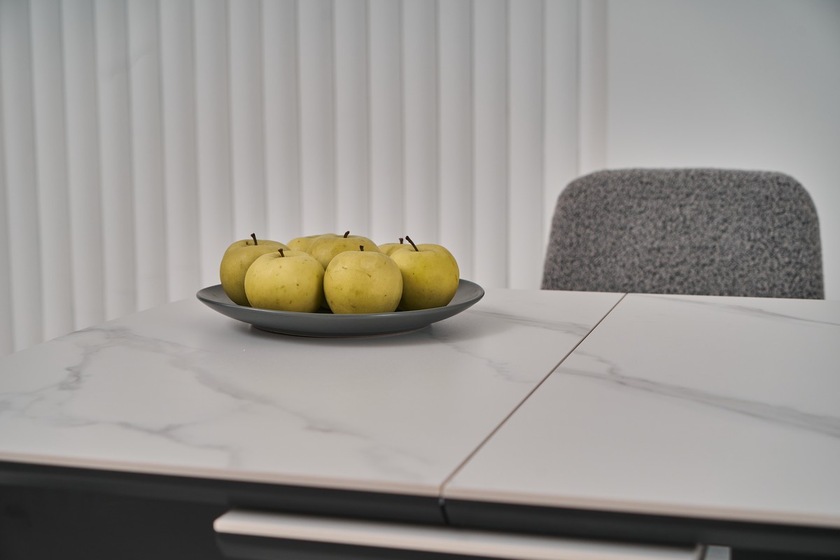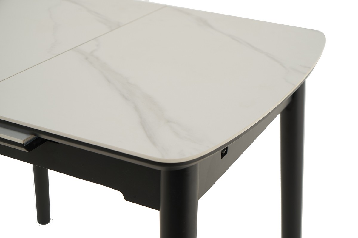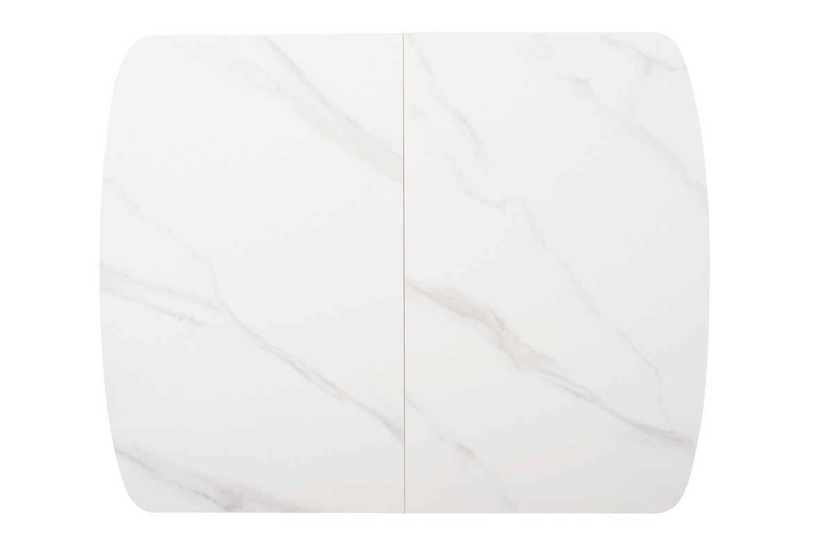 Стільниця та вкладка виготовлені з матової кераміки та матового МДФ, що надає їм елегантного та сучасного вигляду. Колір «білий мармур» імітує природний камінь з його характерними прожилками і відтінками, додаючи столу вишуканості. Матова поверхня запобігає появі блисків, створюючи м’яку та затишну атмосферу.