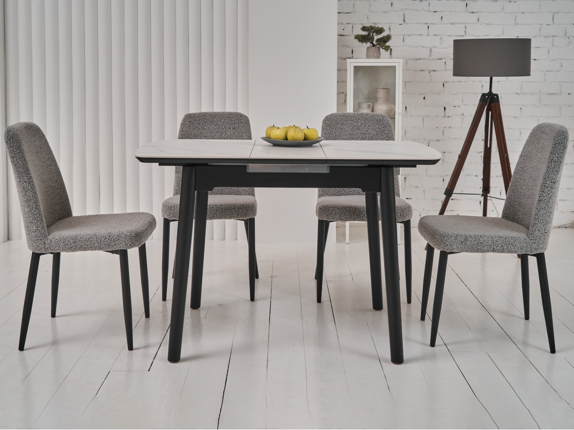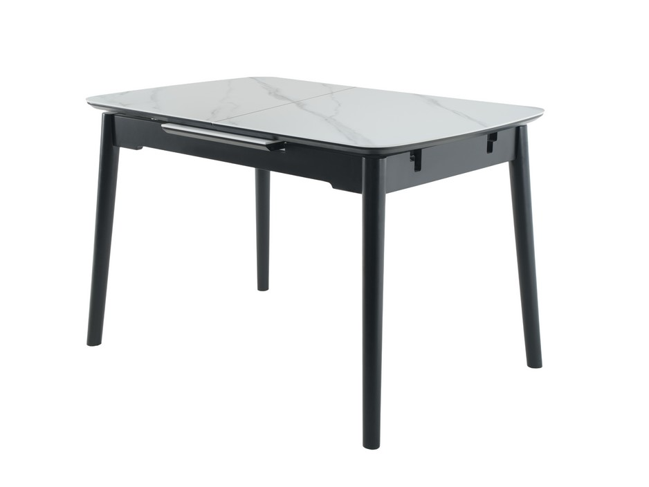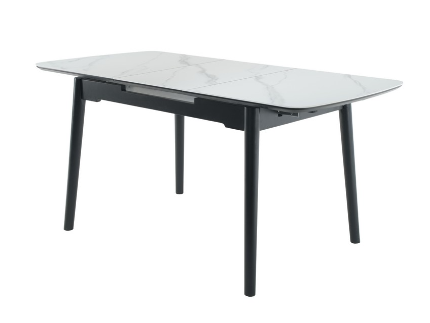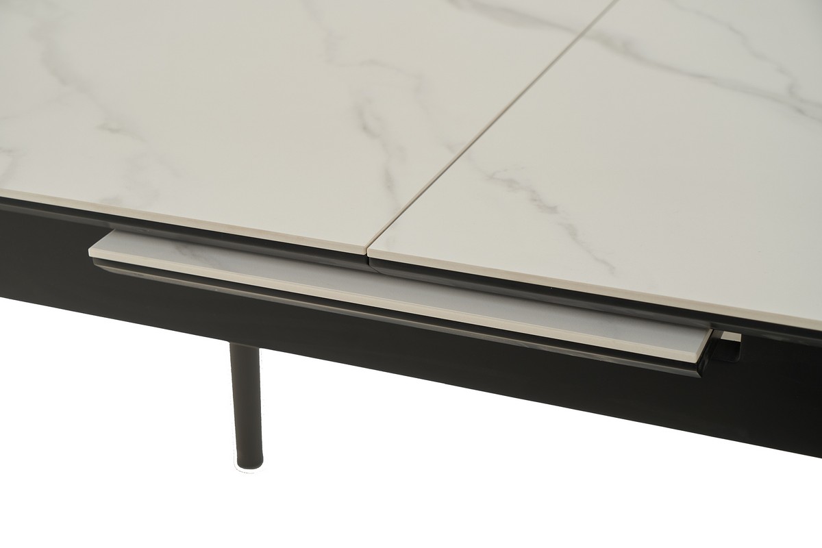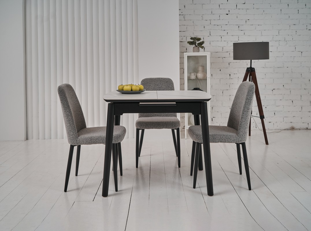Стільниця та вкладка виготовлені з матової кераміки та матового МДФ, що надає їм елегантного та сучасного вигляду. Колір «білий мармур» імітує природний камінь з його характерними прожилками і відтінками, додаючи столу вишуканості. Матова поверхня запобігає появі блисків, створюючи м’яку та затишну атмосферу.