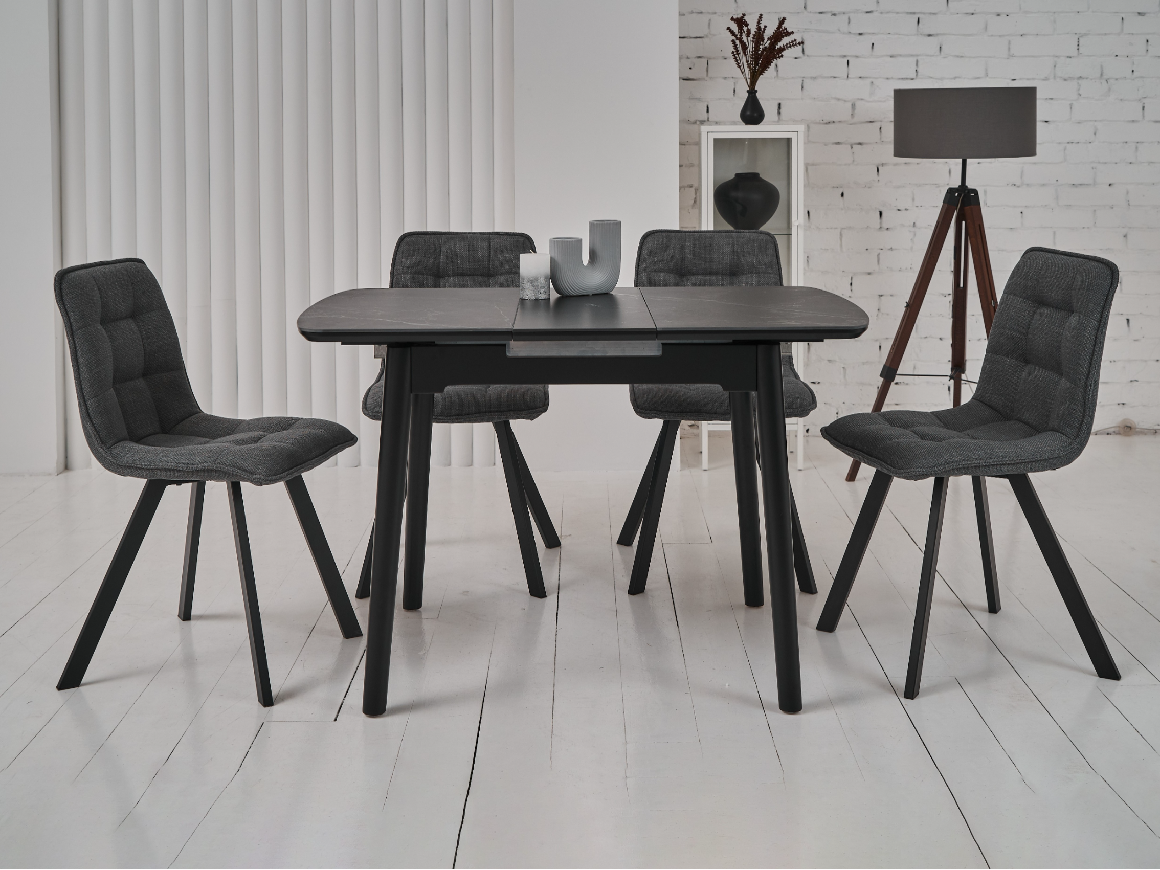 Автоматичний розкладний механізм дозволяє легко збільшувати довжину столу з 90 см до 120 см, надаючи додатковий простір для прийому гостей або сімейних обідів. Такий стіл ідеально підходить для використання в невеликих кухнях або столових зонах завдяки своїм компактним розмірам і функціональності. TM-87-1 у кольорі «чорний онікс» стане стильним акцентом у будь-якому сучасному інтер'єрі.