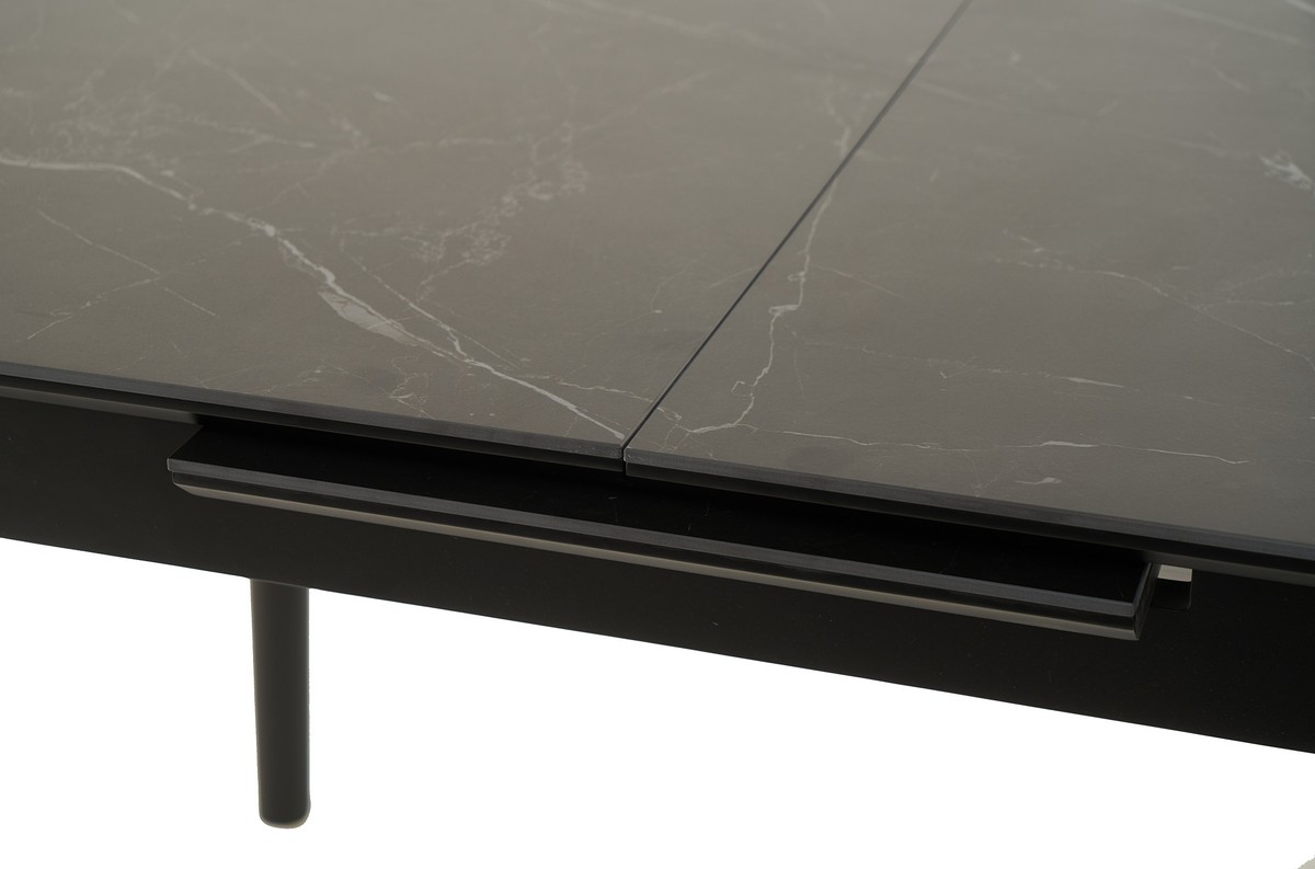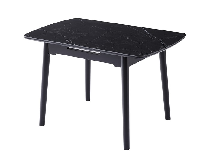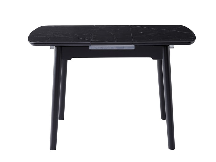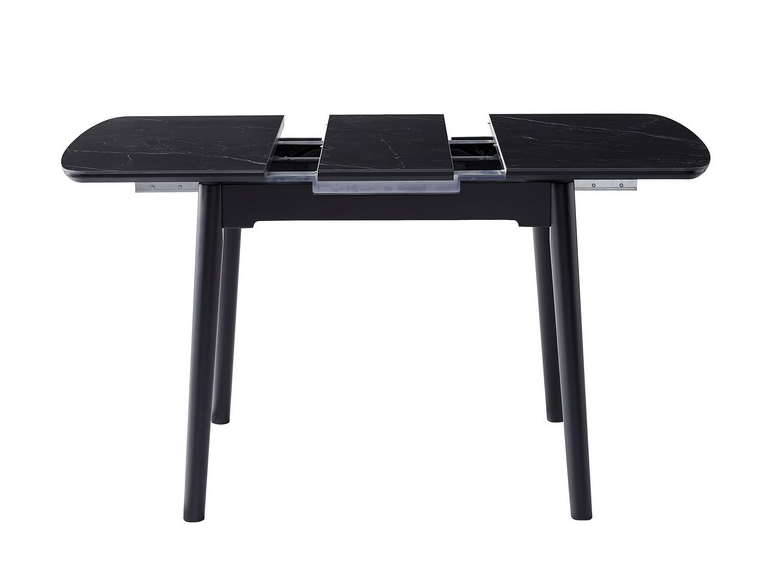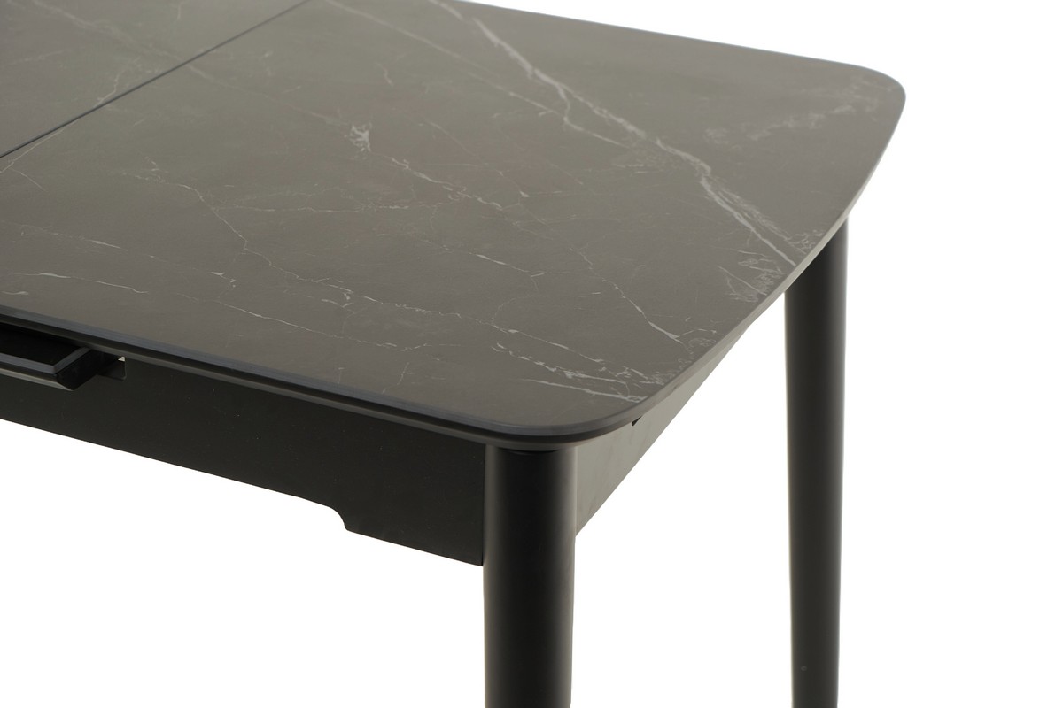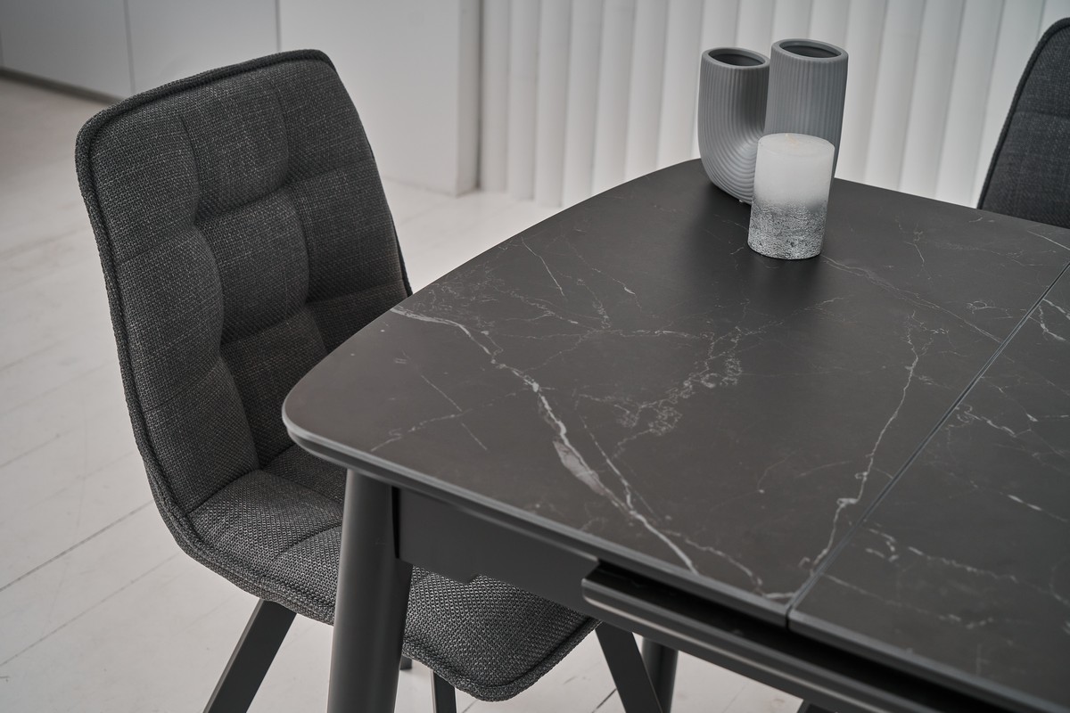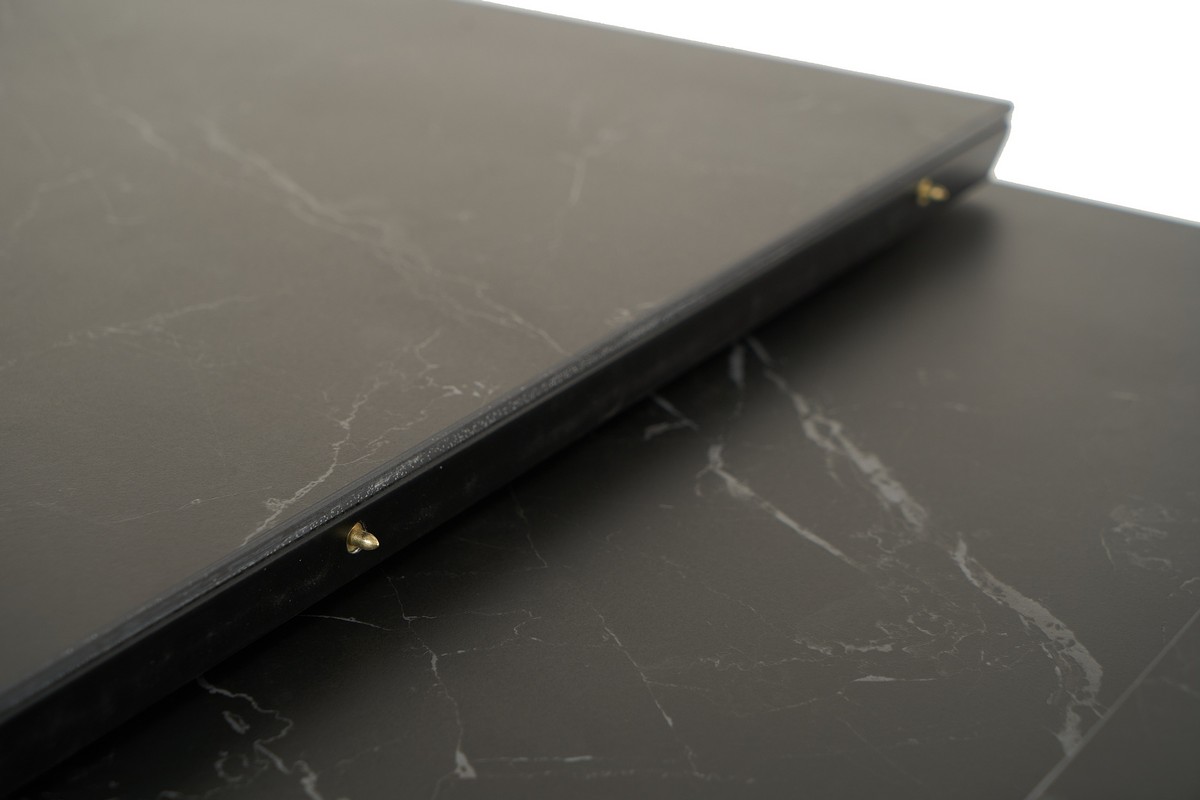 Столешниця та вкладка виготовлені з матової кераміки та матового МДФ, що надає їм елегантного та витонченого вигляду. Колір «чорний онікс» нагадує глибину і блиск природного оніксу, створюючи відчуття розкоші і сучасного шику. Матова поверхня запобігає появі відблисків, що додає столу практичності і дозволяє створити затишну атмосферу.