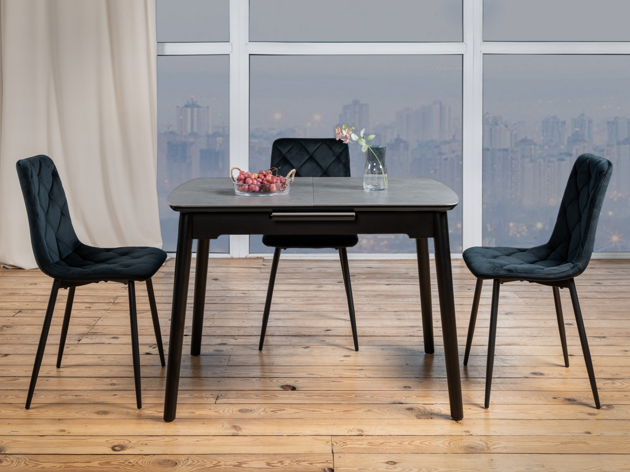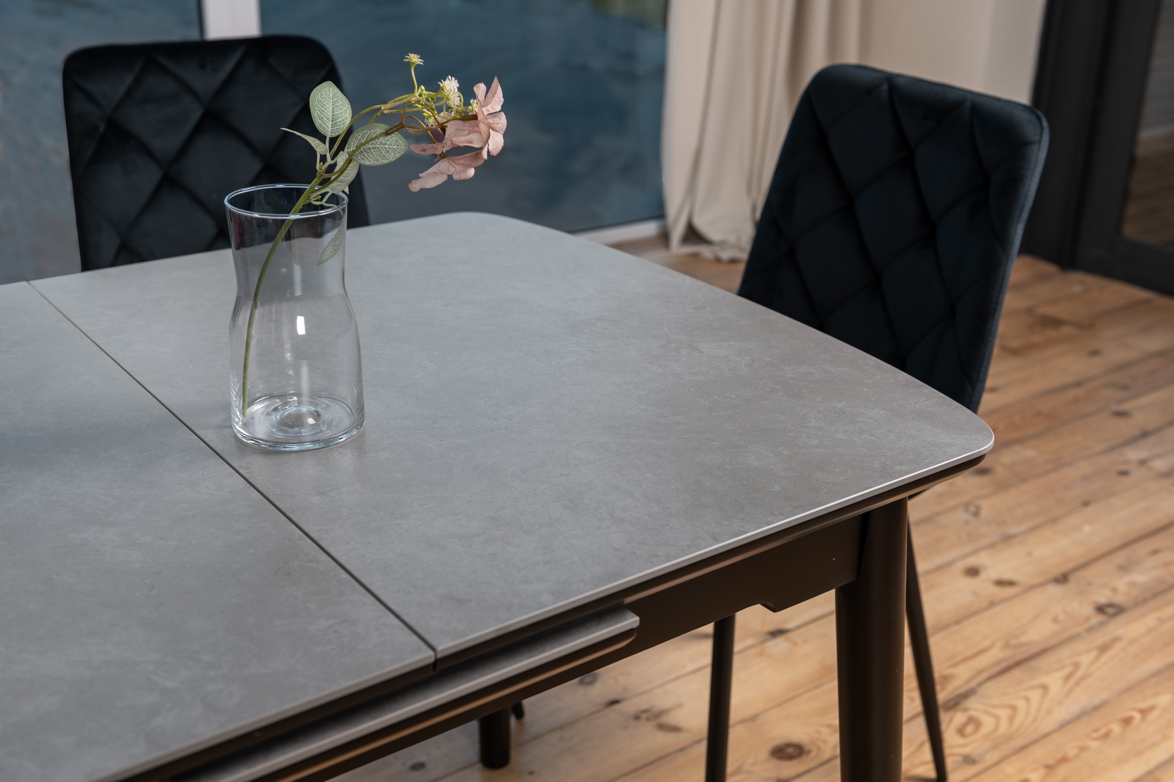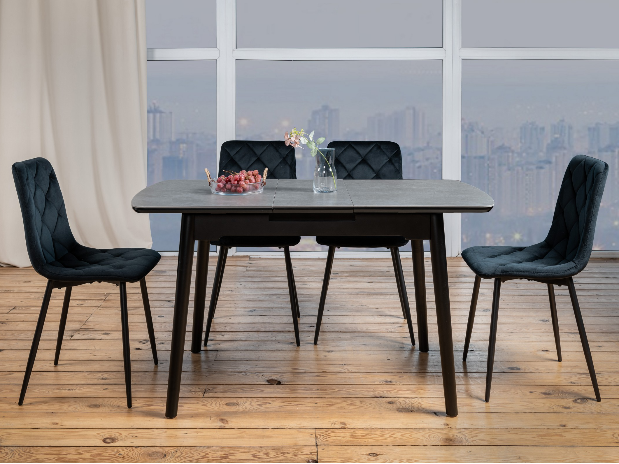 Обідній керамічний стіл ТМ-87 в кольорі гріджіо латте - це теплий і затишний відтінок, який гармонійно поєднується з різними елементами інтер'єру. Ось кілька ідей, з якими можна комбінувати столешницю в цьому кольорі: