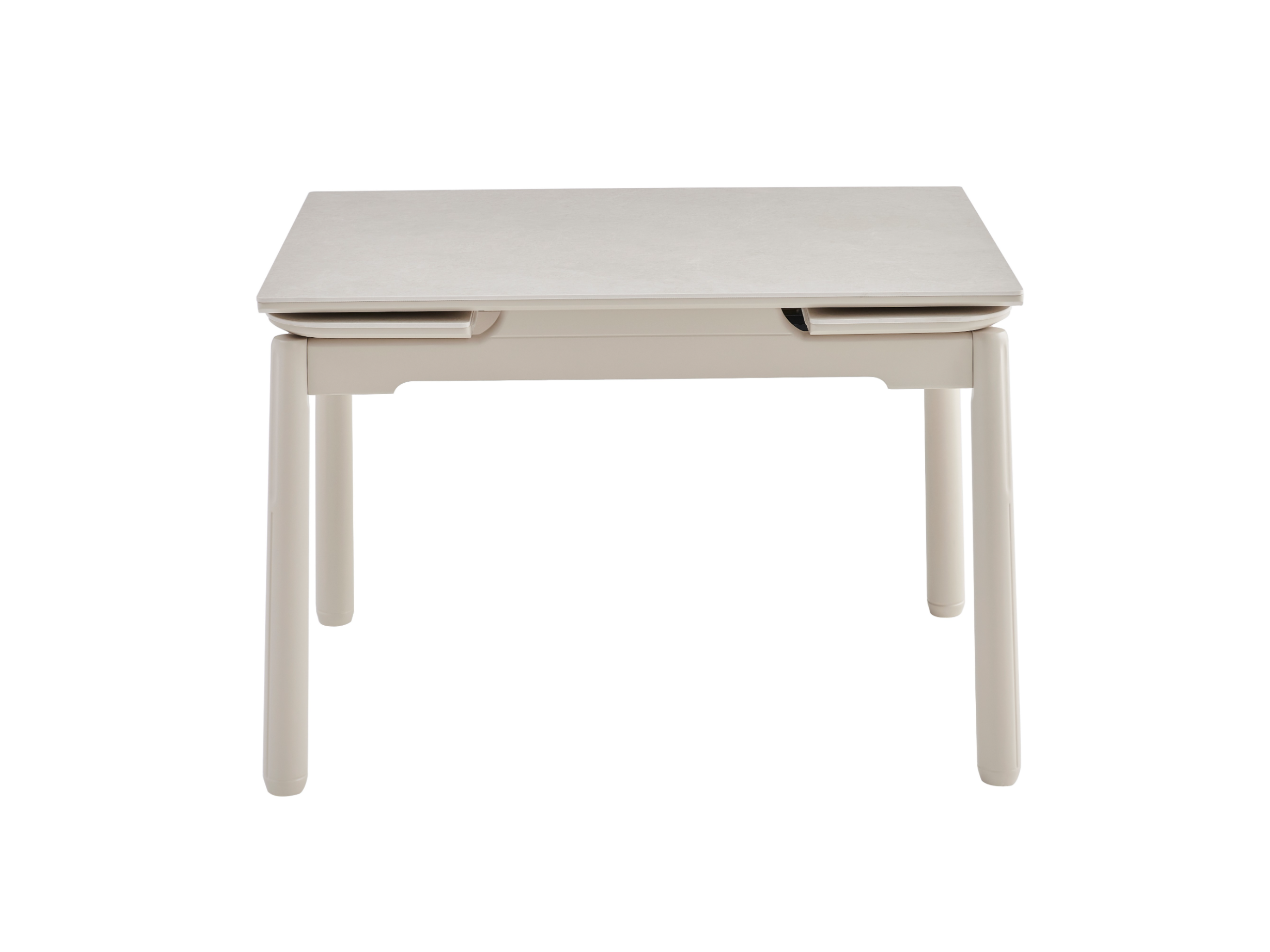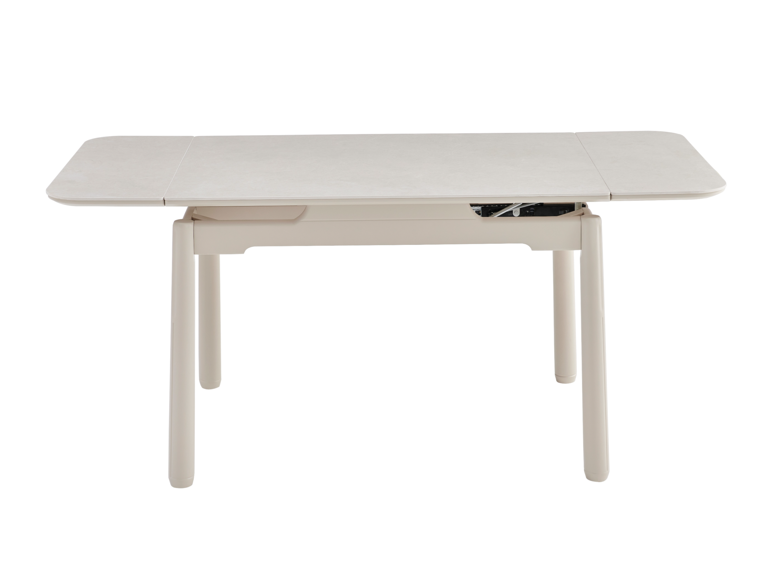 Стільниця з матової кераміки кольору крема саббія, доповнена міцною основою з пофарбованого дерева у відтінку капучино, виглядає гармонійно та елегантно. Її поверхня стійка до подряпин, плям і впливу високих температур — ідеальне рішення для щоденного використання.
