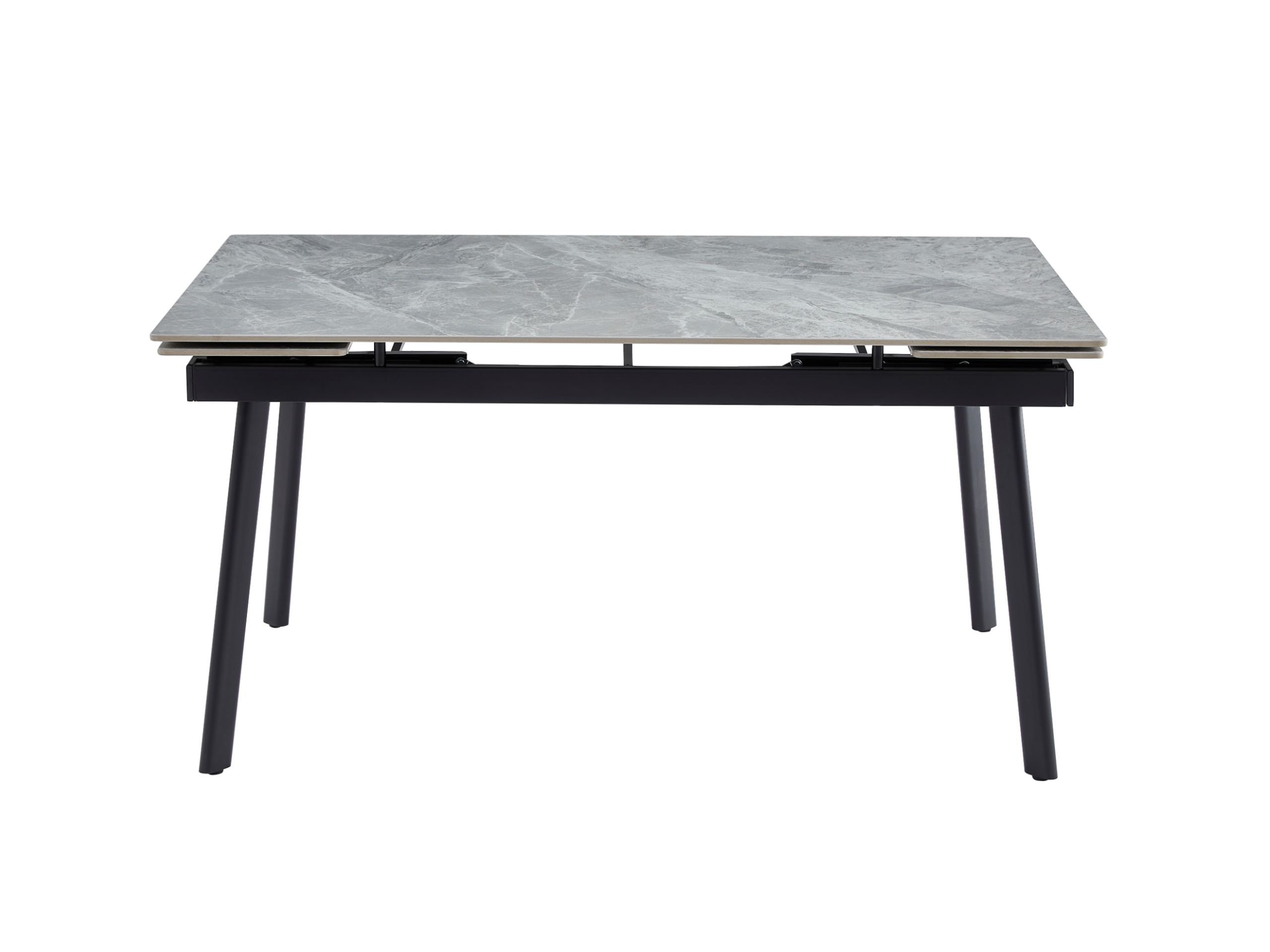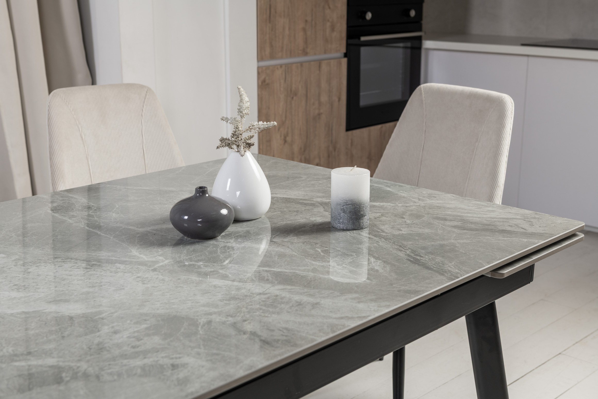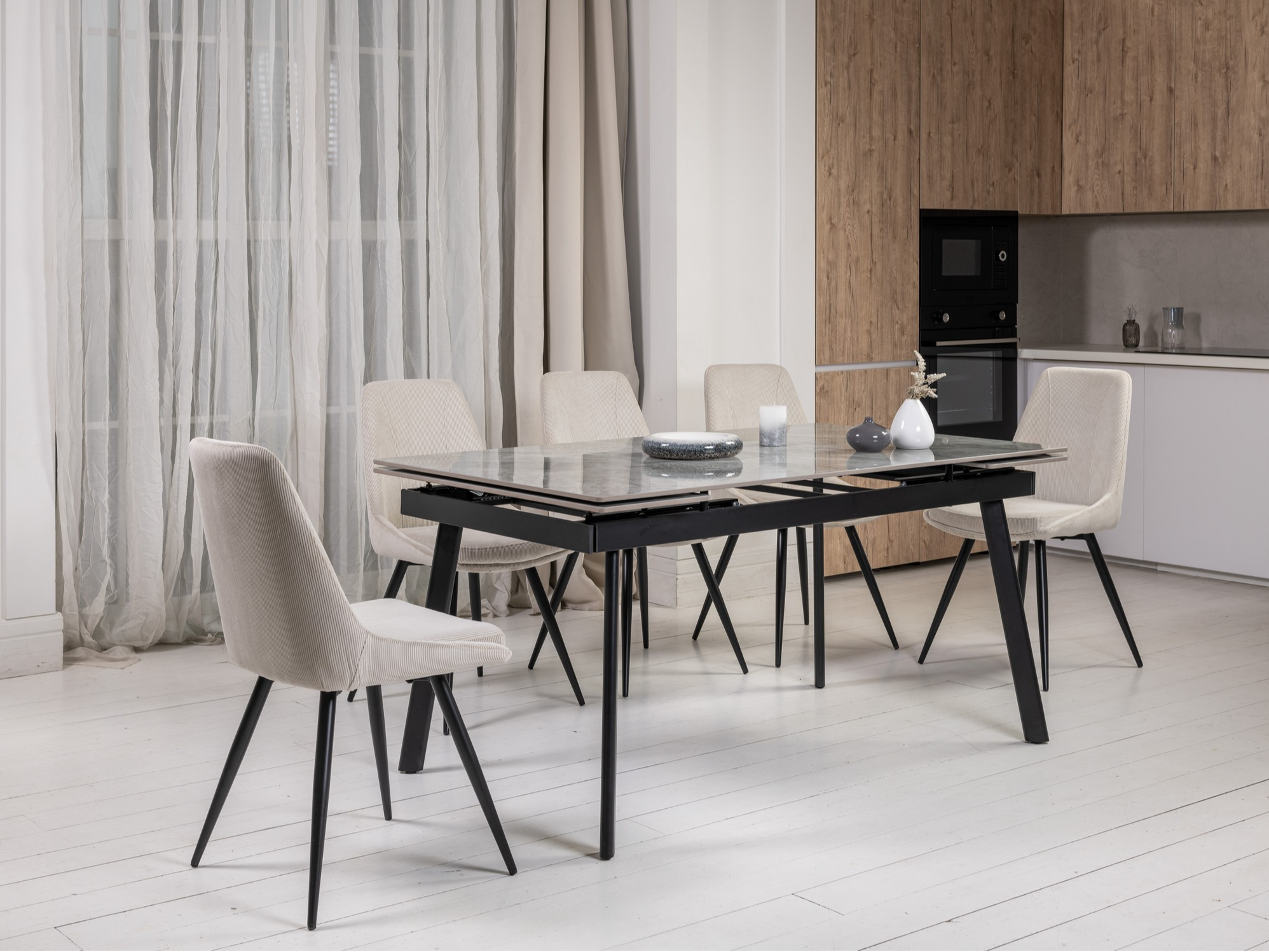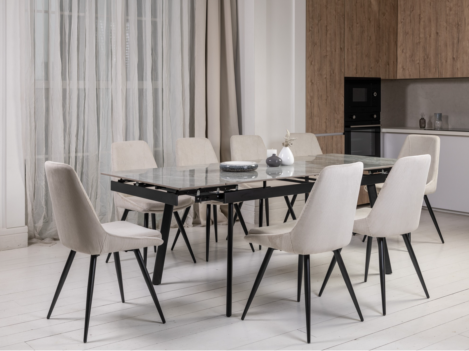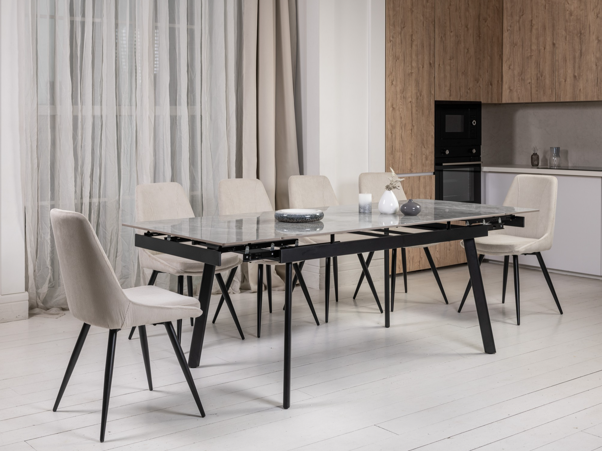 Завдяки боковому механізму розкладання стіл легко трансформується з 150 до 210 см, забезпечуючи комфортне розміщення гостей як у повсякденному житті, так і під час святкових подій. Глянцева керамічна стільниця стійка до високих температур, а міцна металева конструкція гарантує надійність і довговічність.