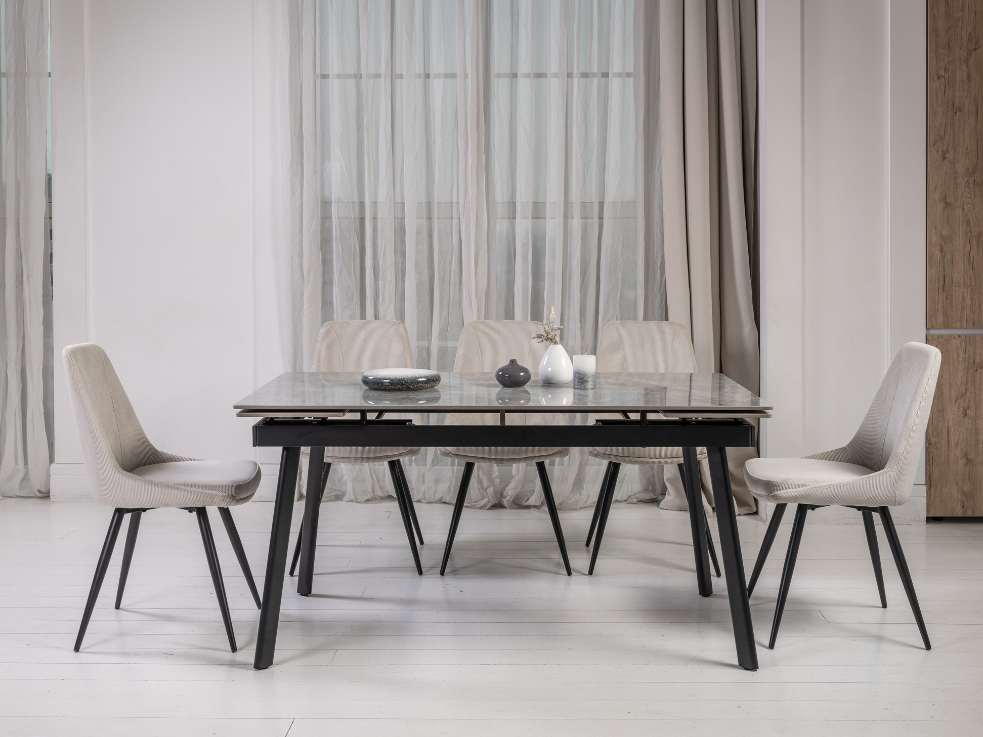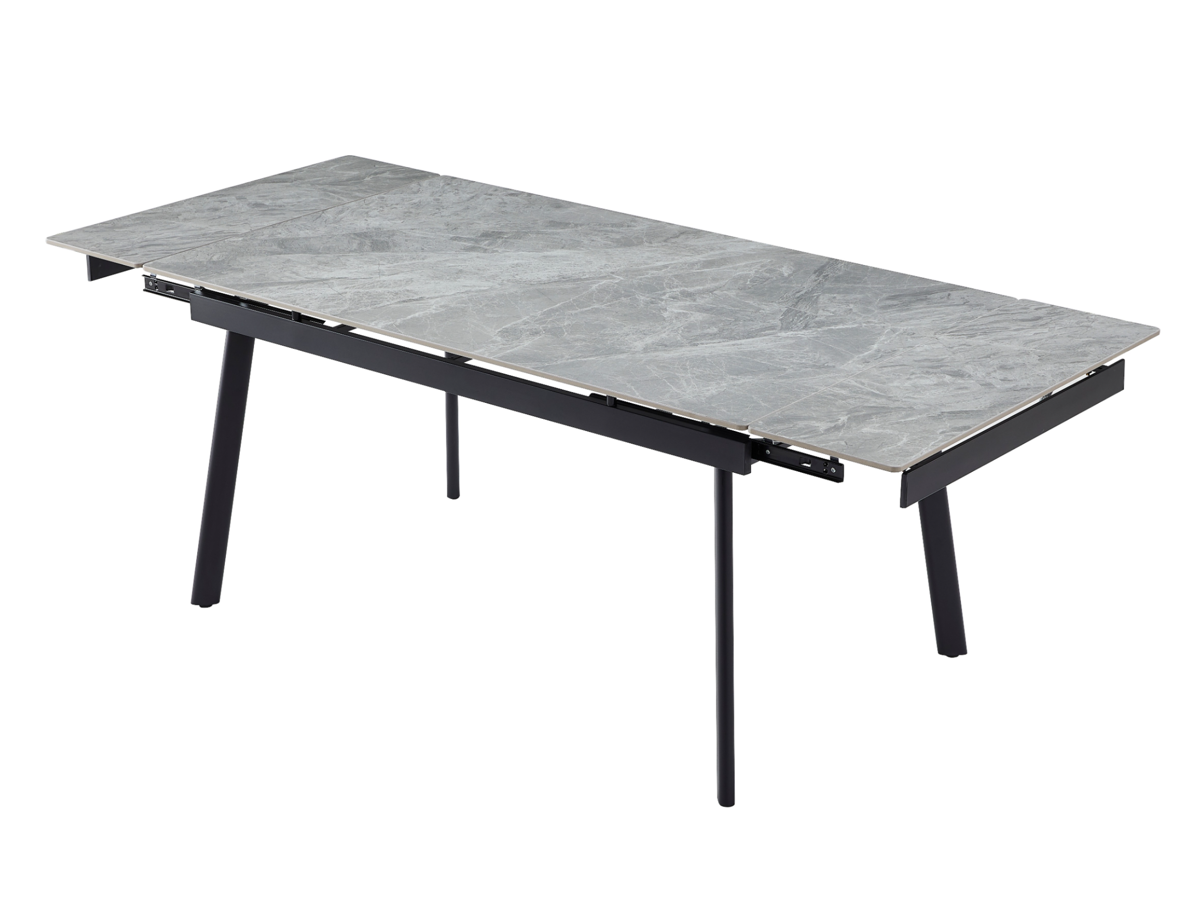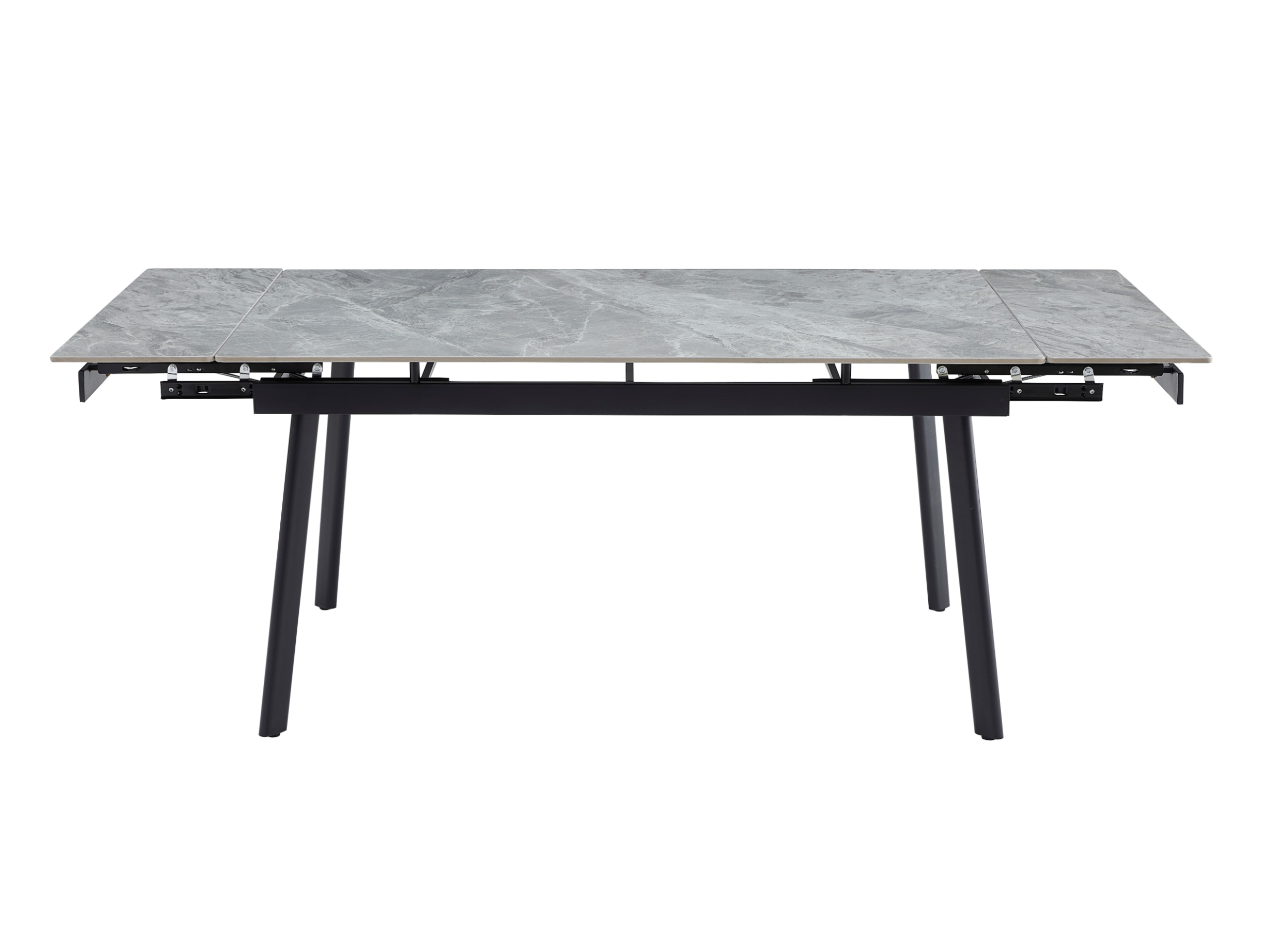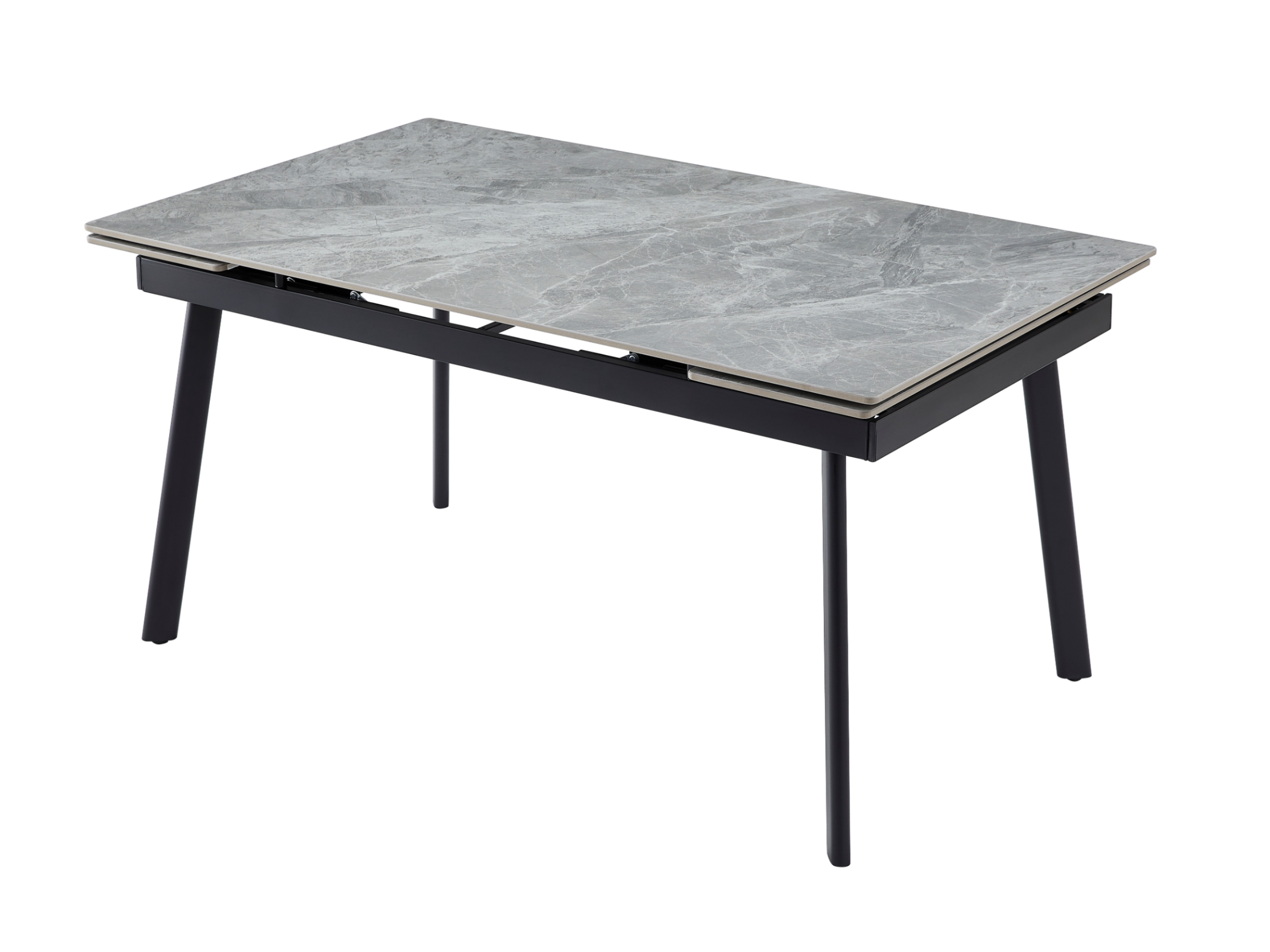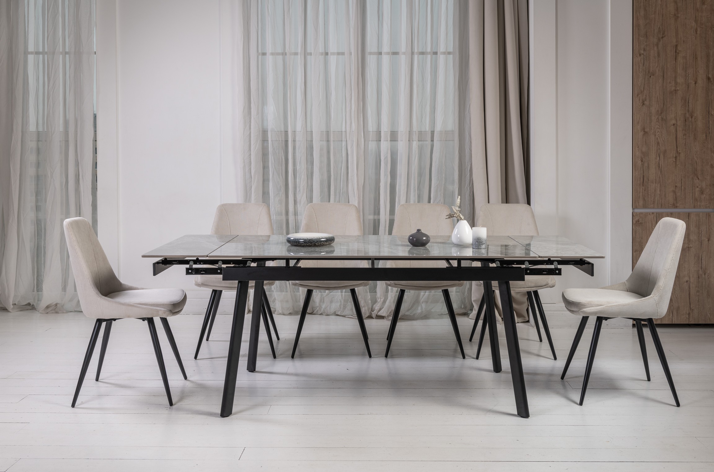 Завдяки боковому механізму розкладання стіл легко трансформується з 150 до 210 см, забезпечуючи комфортне розміщення гостей як у повсякденному житті, так і під час святкових подій. Глянцева керамічна стільниця стійка до високих температур, а міцна металева конструкція гарантує надійність і довговічність.