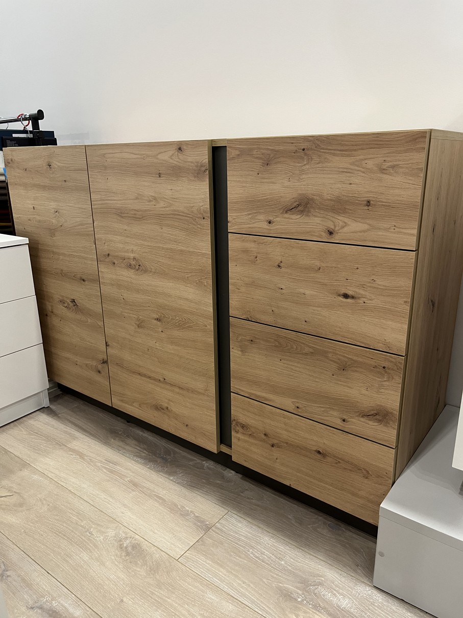 Комод Arco 2D4S/138 Perfect Home Польща оснащений двома розпашними дверцятами та чотирма місткими шухлядами. Завдяки такій конструкції, це дуже практичний предмет меблів. Він ідеально підійде як шафа для білизни в спальні, а також як буфет у вітальні. Білі прості геометричні фасади, розділені стрічкою в кольорі дуб грандсон, є характерною рисою всієї колекції меблів. Комод Marco поставляється в розібраному вигляді з інструкцією по збірці.