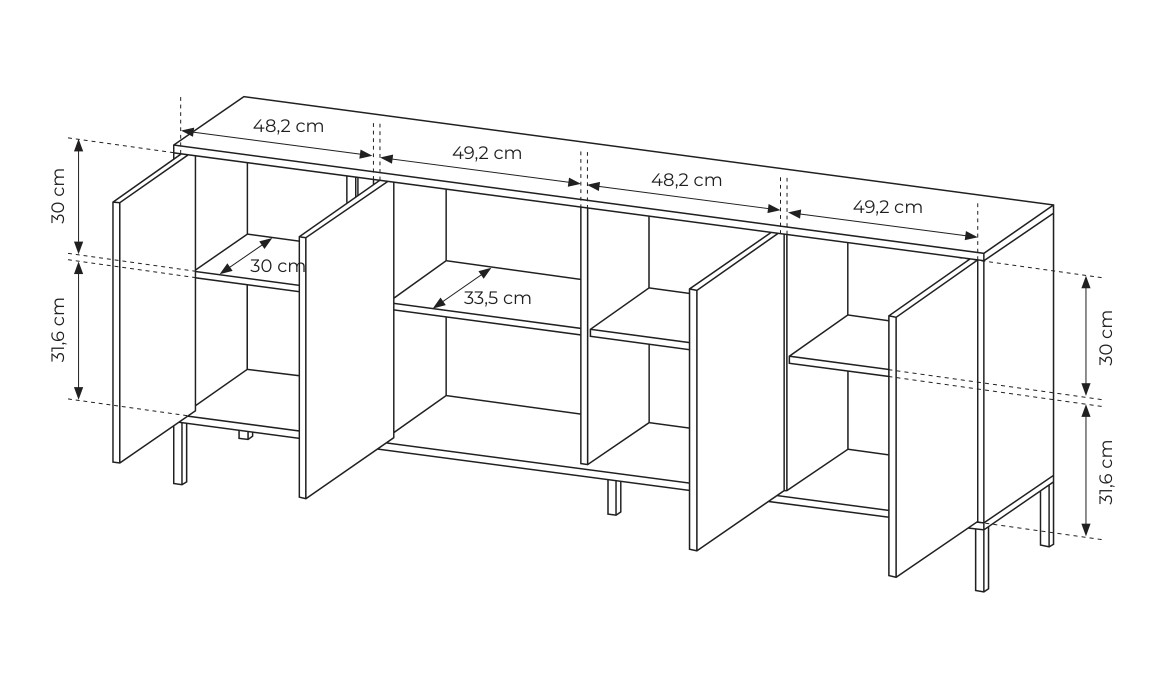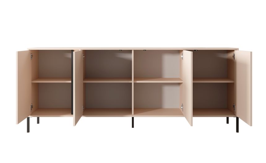 (Купується окремо) Підсвітка LED Dast 1pktФункціональний комод Dast 4D/203 Perfect Home Польща належить до однойменного меблевого гарнітура і виготовлений з меблевого щита - ламінованого. Комод оснащений чотирма розпашними дверцятами, за якими на полицях є достатньо місця для розміщення речей і дрібних предметів. Елегантний і сучасний характер меблів підкреслюється бежевим кольором. Комод поставляється в розібраному вигляді з чіткою інструкцією.