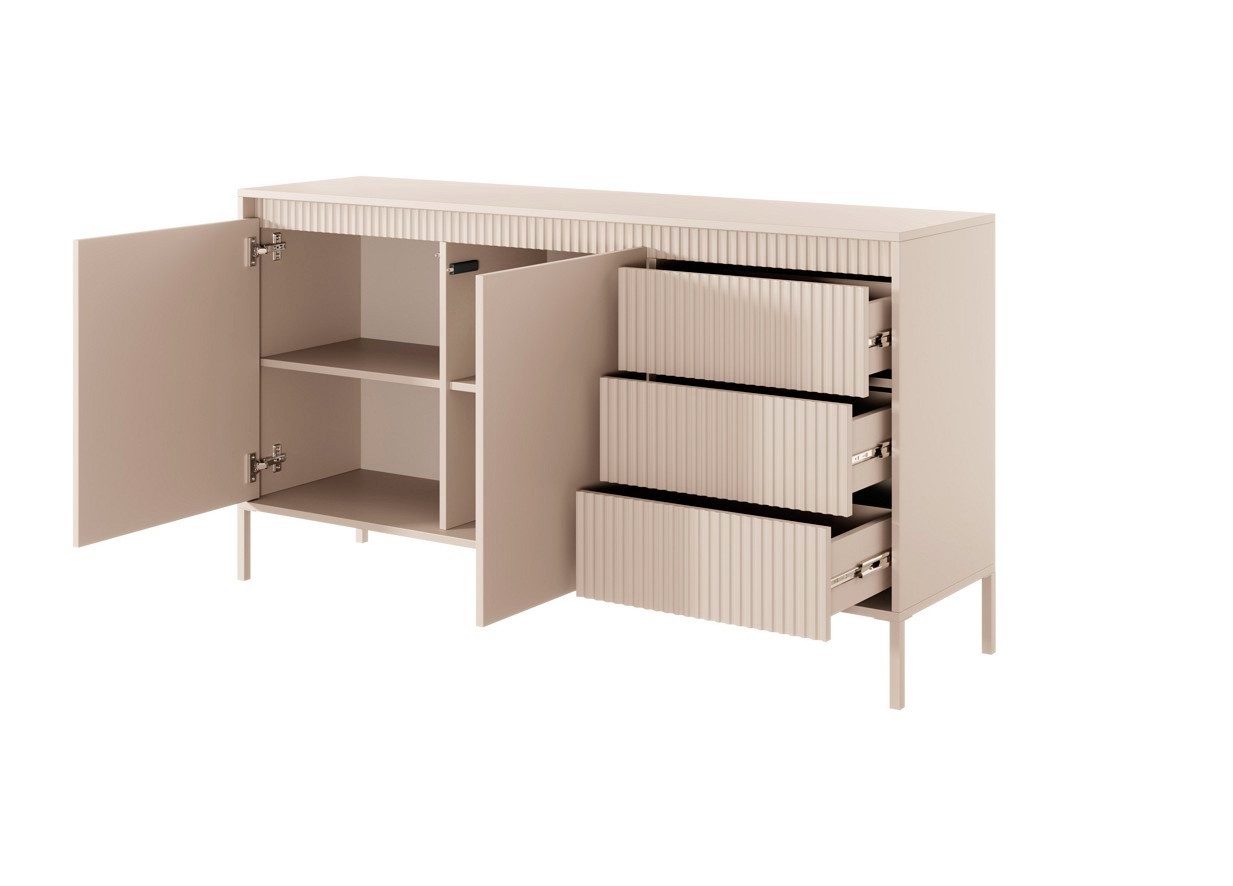 Комод SENSO 2D3S/153 (беж) – Надайте своєму простору новий вигляд за допомогою сучасного та стильного бежевого комоду SENSO, в якому гармонійно поєднуються практичність та вишуканість. Особливістю цього комода є модні та сучасні пази, які використовуються на деяких частинах фасадів МДФ і планки під верхньою стільницею, а також гладкі фасади, що розширюються до передньої частини. Металеві ніжки, пофарбовані в колір плити, та передні дверцята без ручок додадуть інтер'єру відчуття спокою та гармонії.
