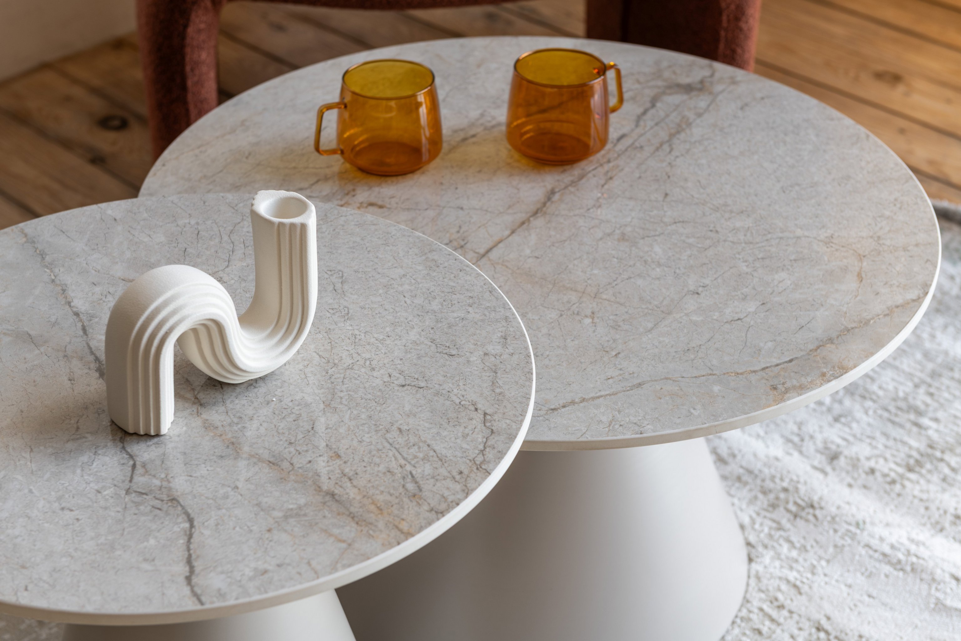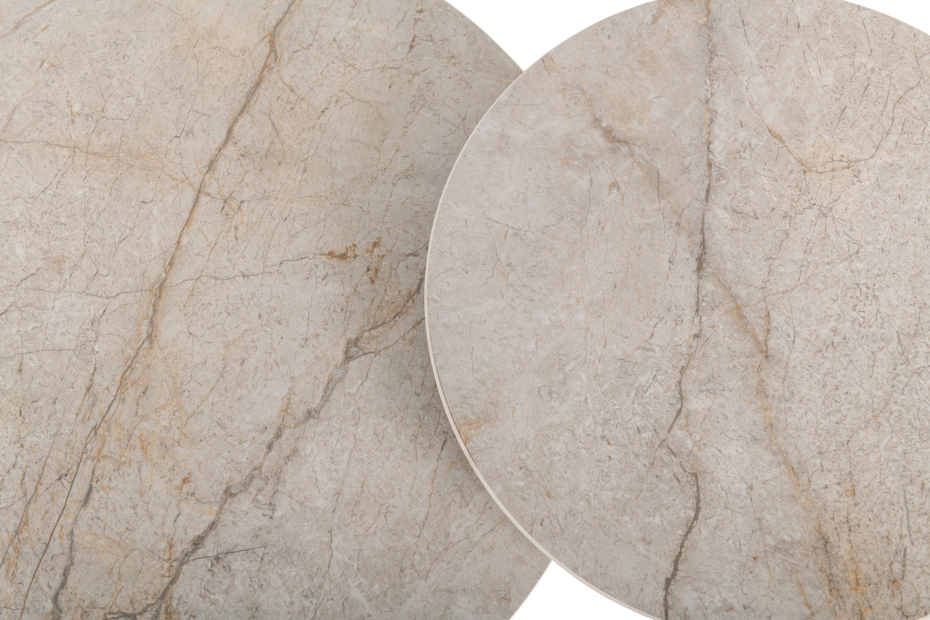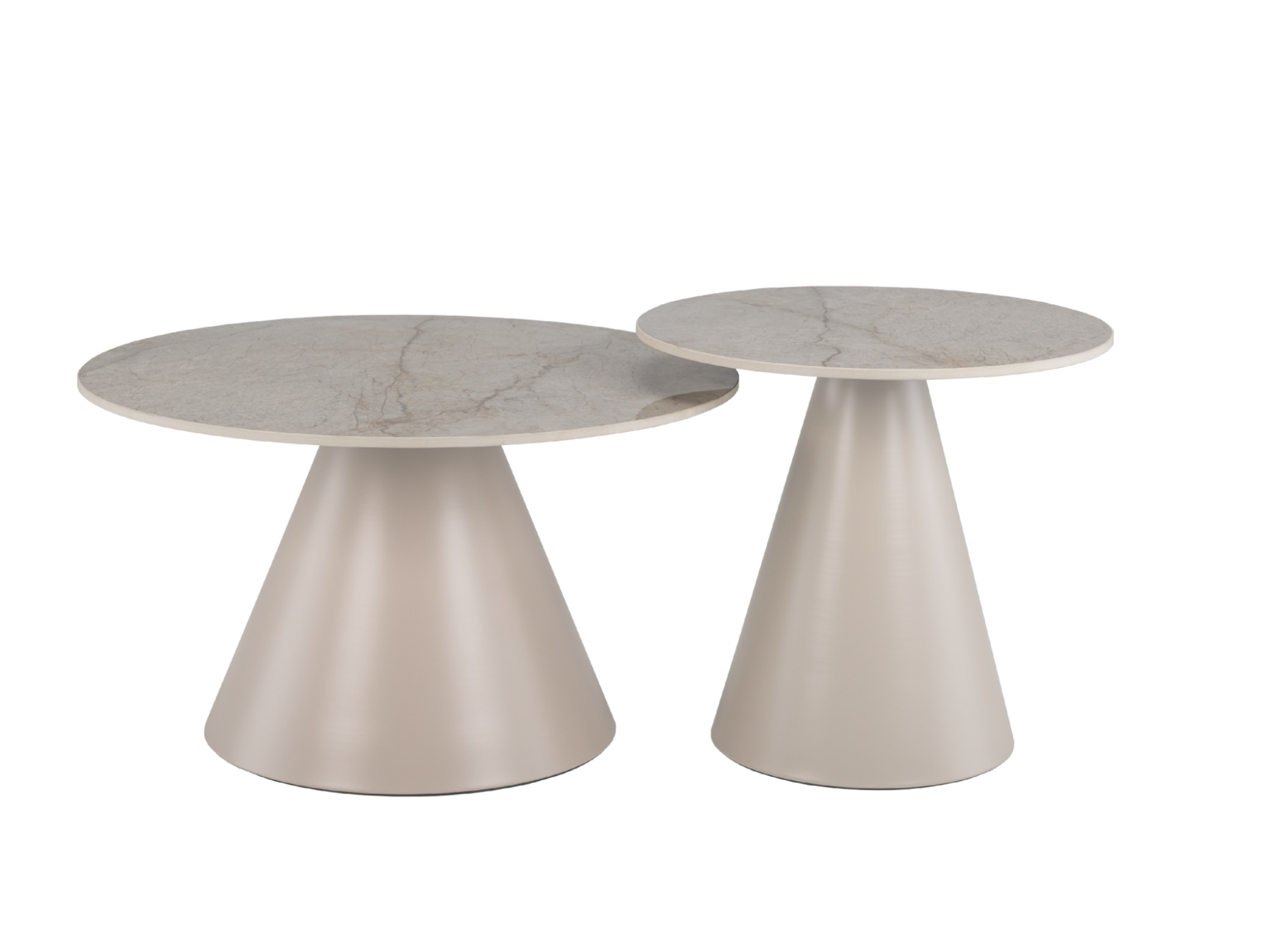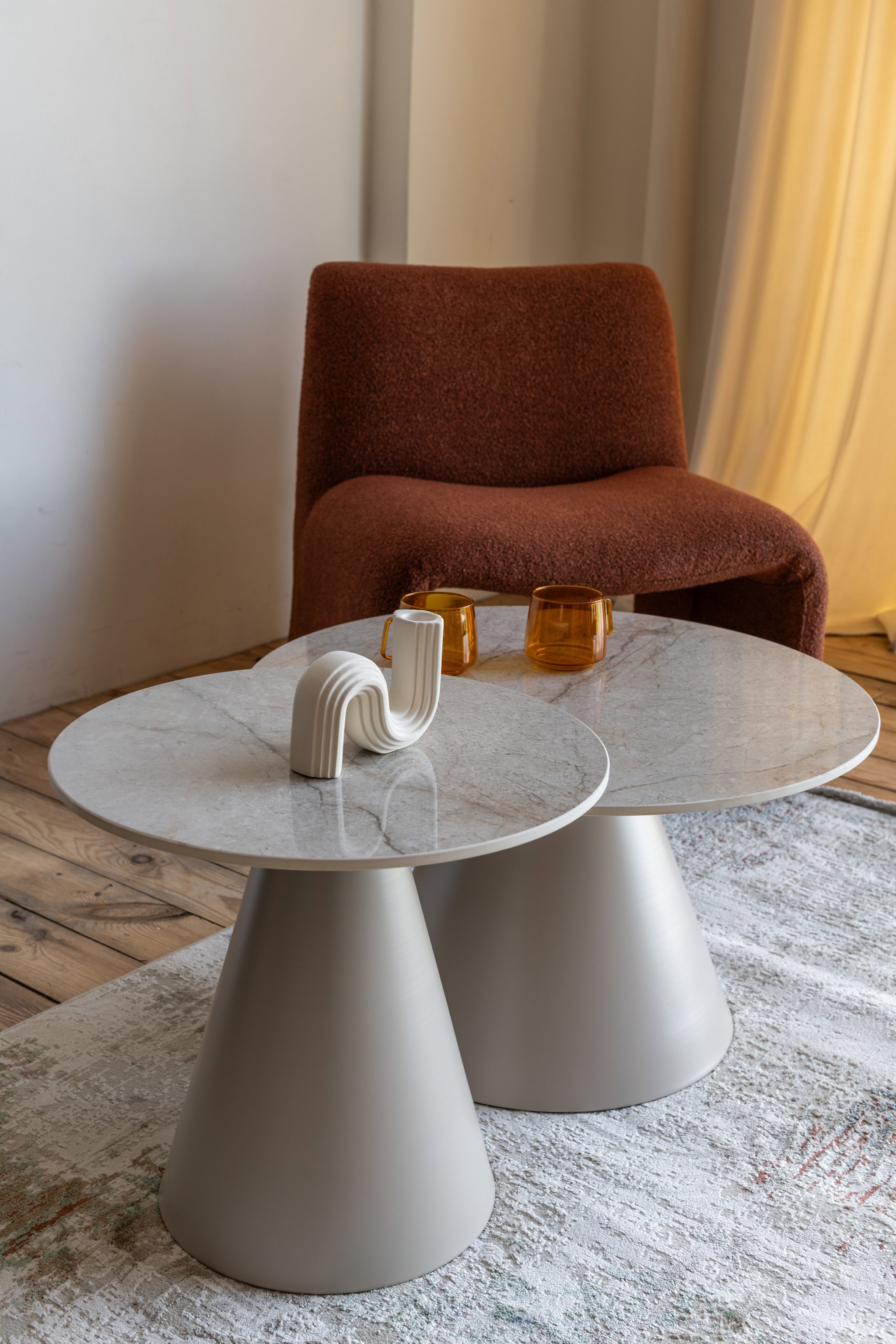 Стільниці виготовлені з глянцевої кераміки в елегантному відтінку містік грей, що надає виробу розкішного вигляду та забезпечує довговічність і простоту в догляді. Металева основа, пофарбована в колір капучино, додає стійкості та гармонійно поєднується із загальним дизайном. Завдяки поєднанню естетики та практичності, цей комплект стане стильним акцентом у вітальні, зоні відпочинку або офісі.