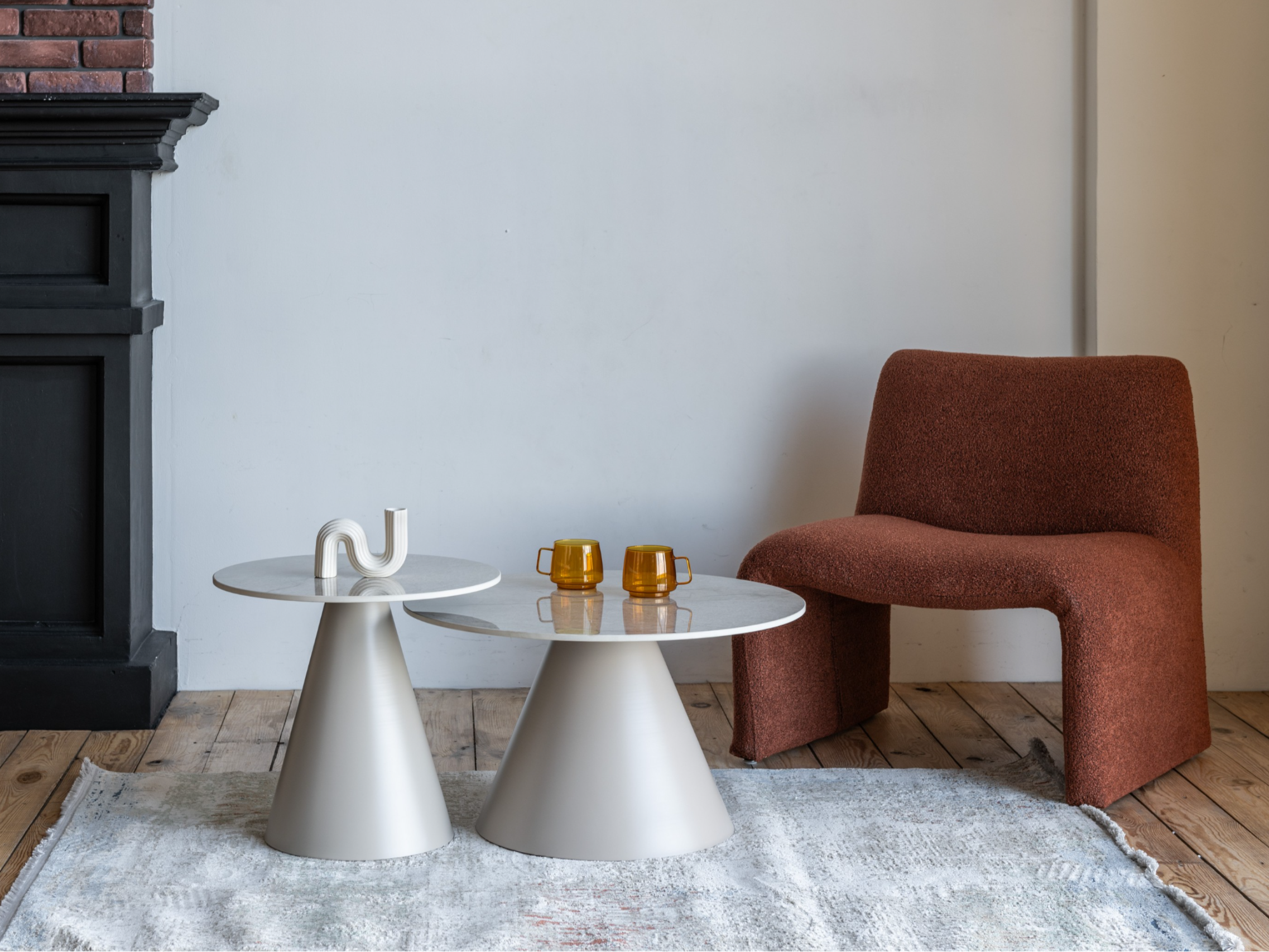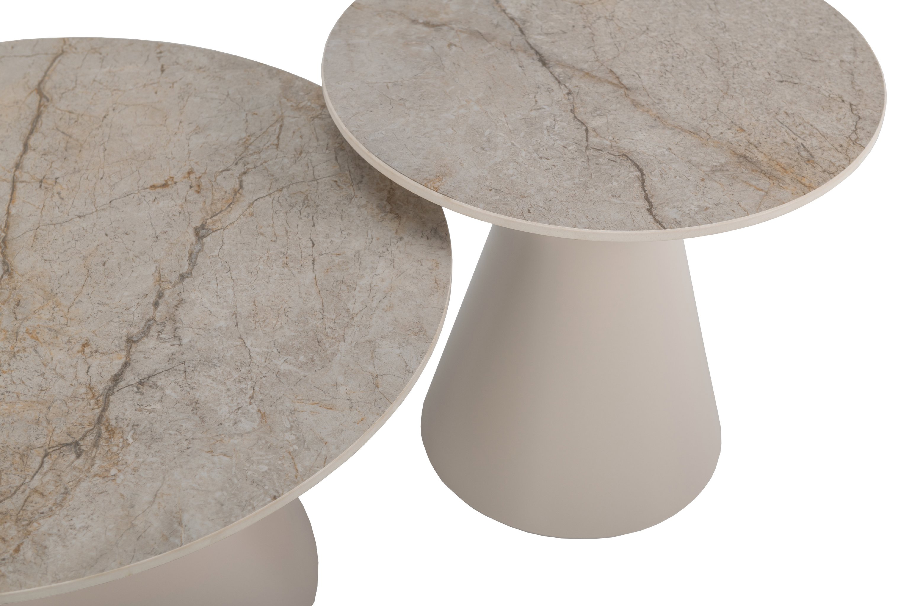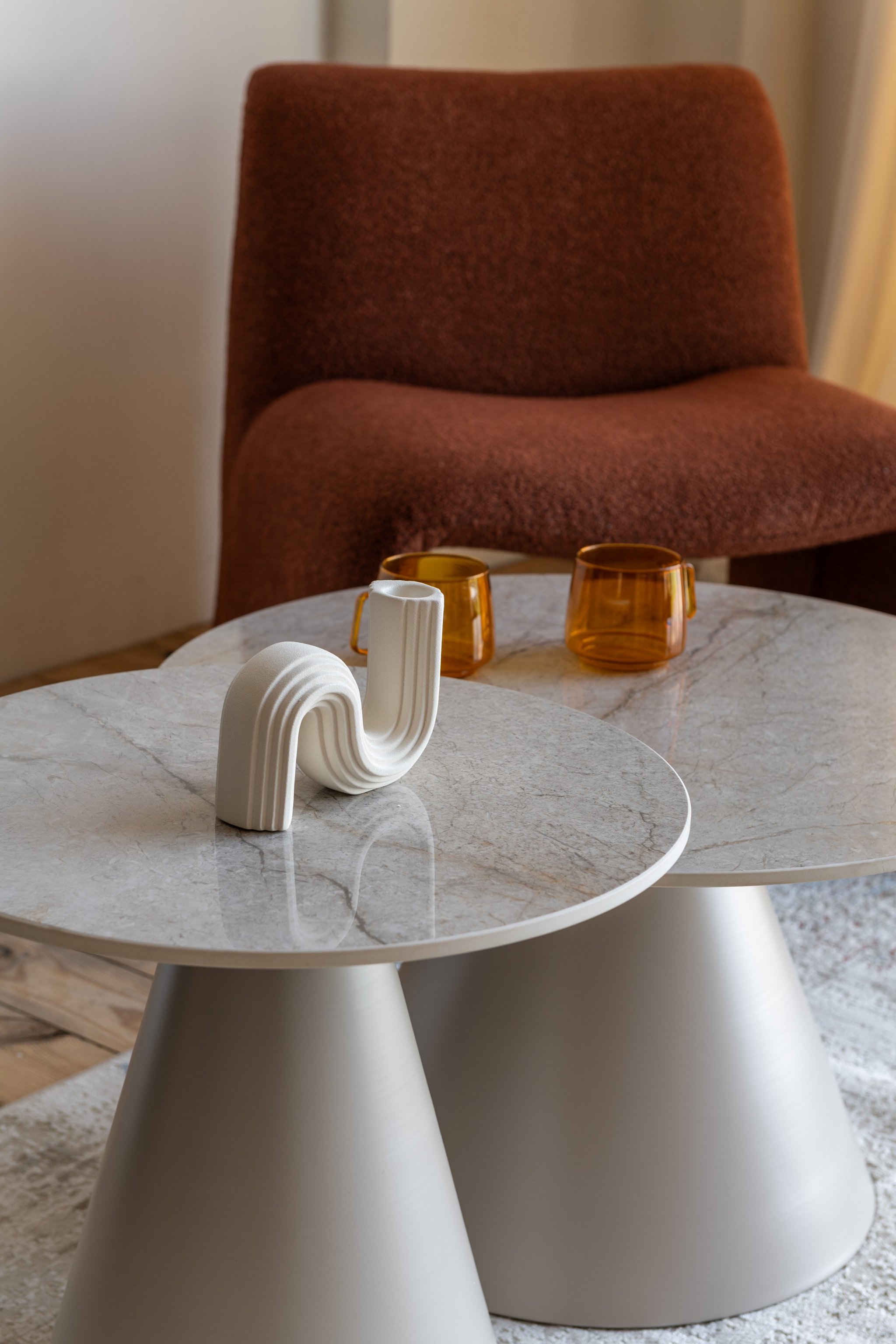 Стільниці виготовлені з глянцевої кераміки в елегантному відтінку містік грей, що надає виробу розкішного вигляду та забезпечує довговічність і простоту в догляді. Металева основа, пофарбована в колір капучино, додає стійкості та гармонійно поєднується із загальним дизайном. Завдяки поєднанню естетики та практичності, цей комплект стане стильним акцентом у вітальні, зоні відпочинку або офісі.