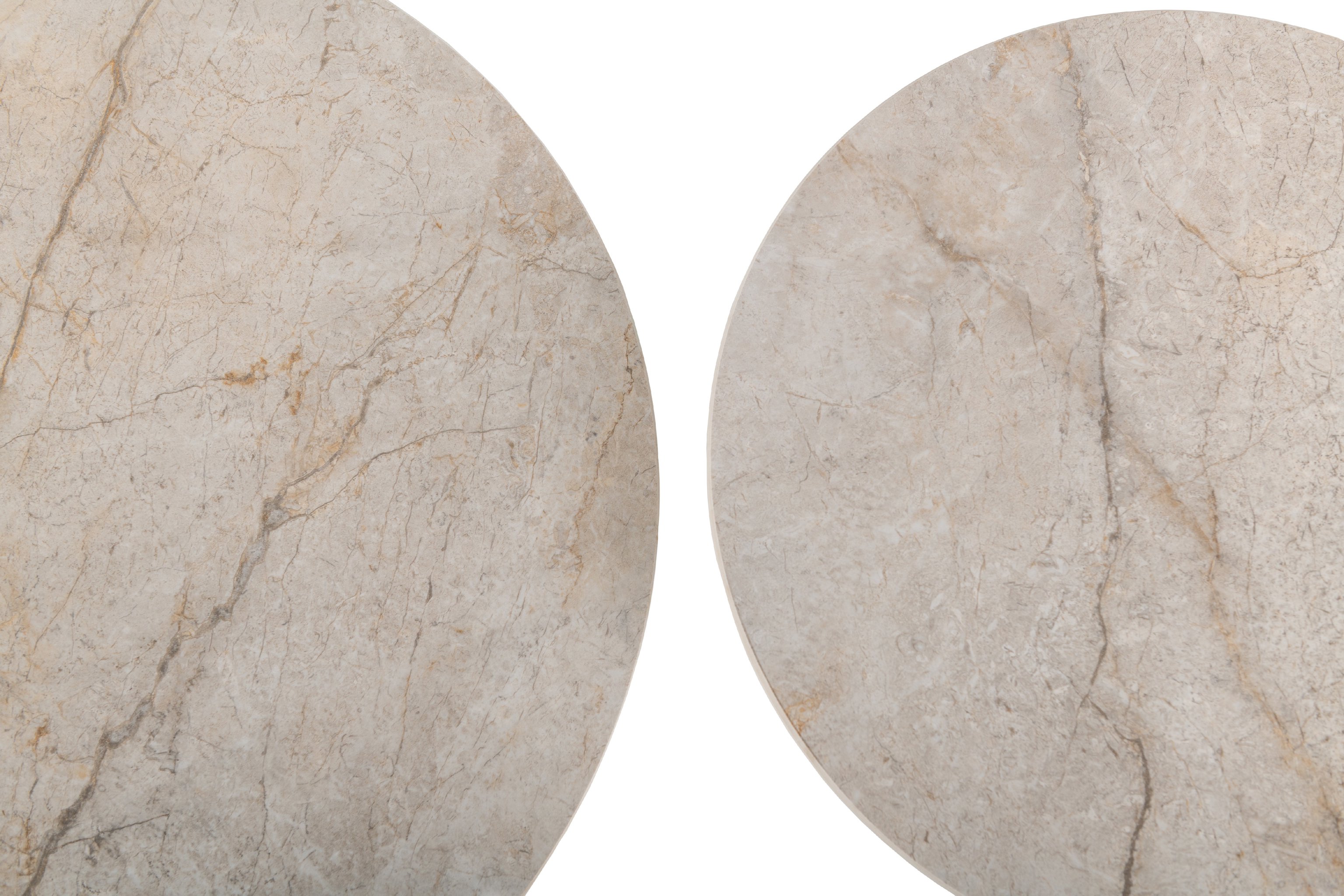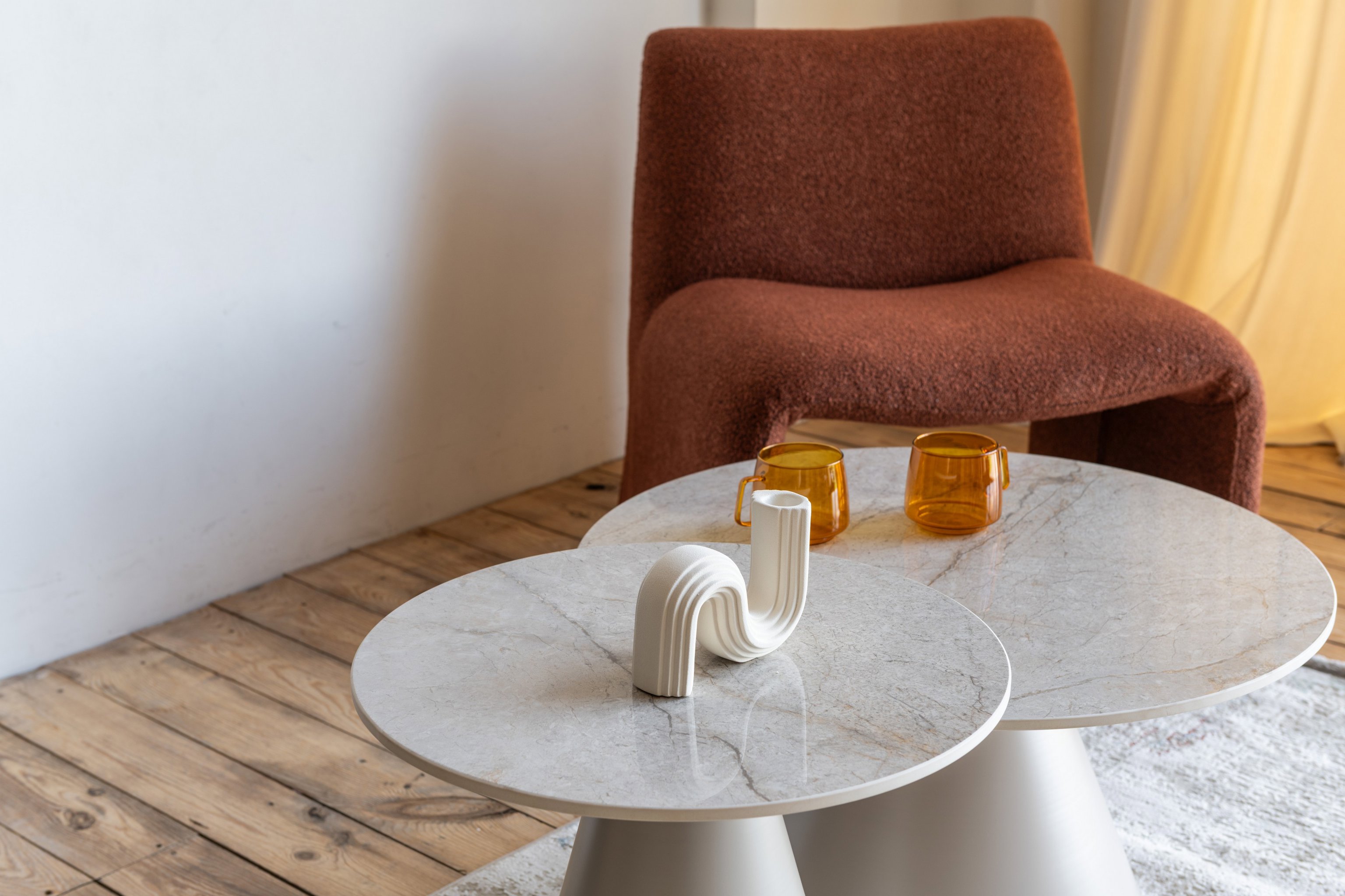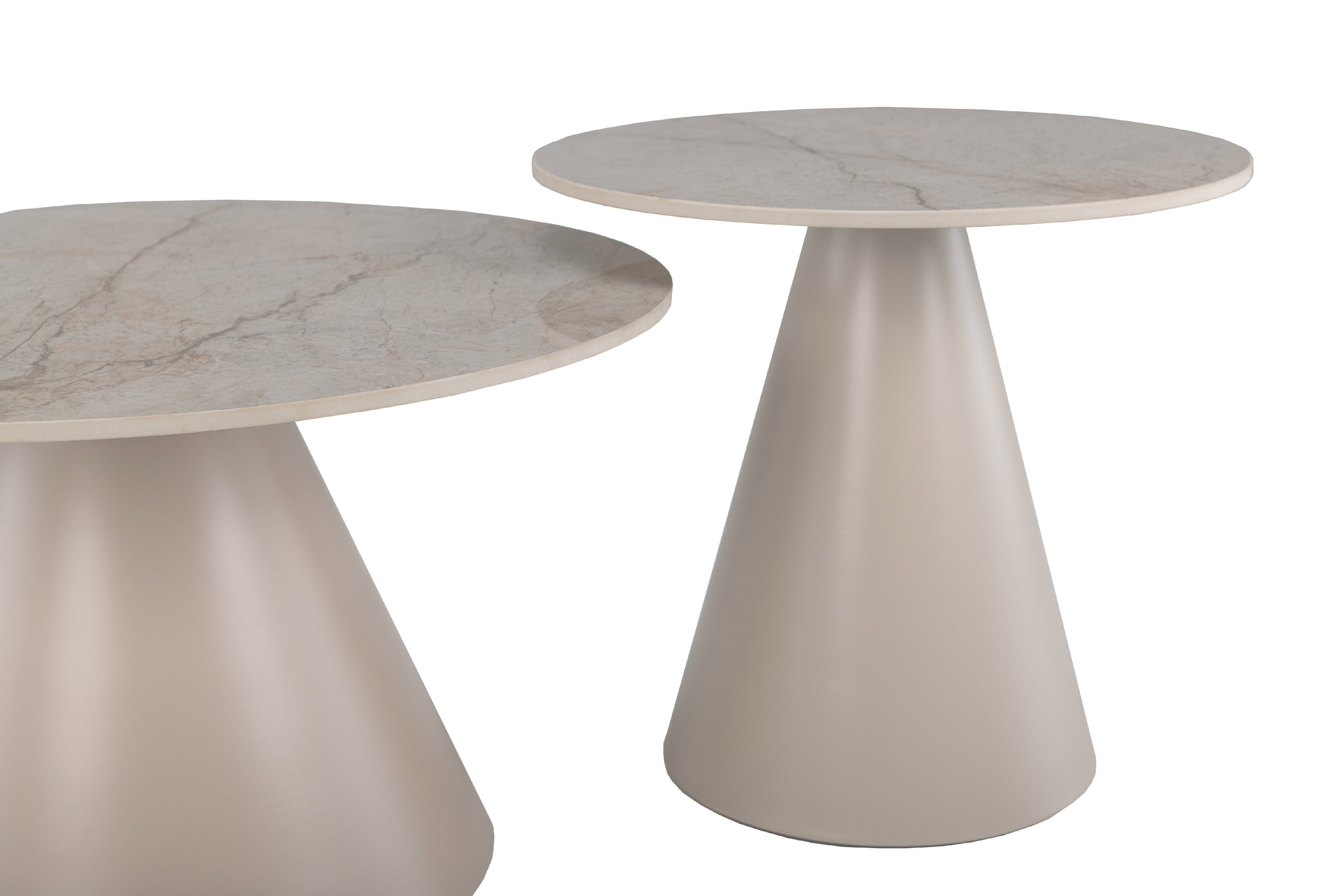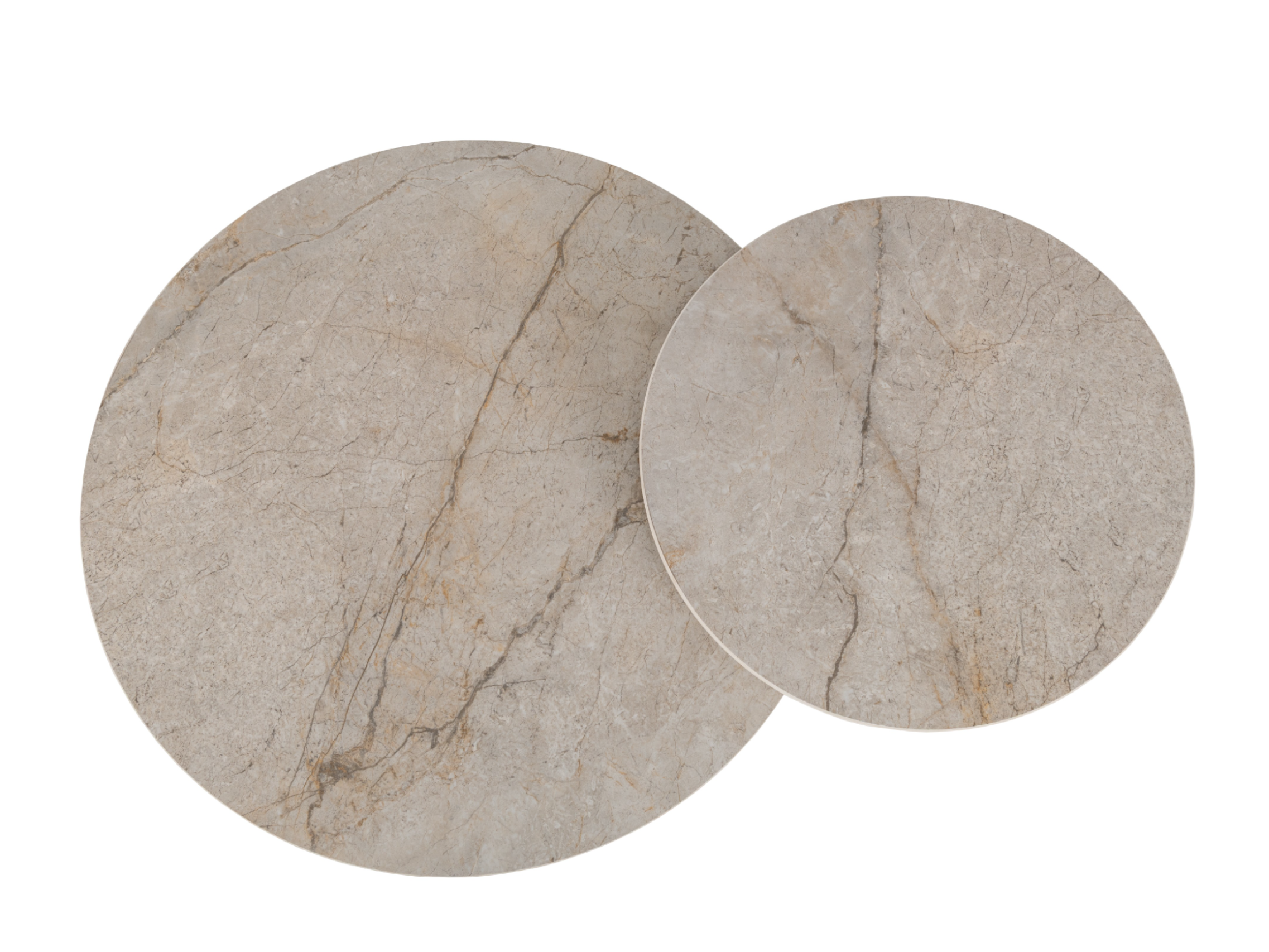 Стільниці виготовлені з глянцевої кераміки в елегантному відтінку містік грей, що надає виробу розкішного вигляду та забезпечує довговічність і простоту в догляді. Металева основа, пофарбована в колір капучино, додає стійкості та гармонійно поєднується із загальним дизайном. Завдяки поєднанню естетики та практичності, цей комплект стане стильним акцентом у вітальні, зоні відпочинку або офісі.