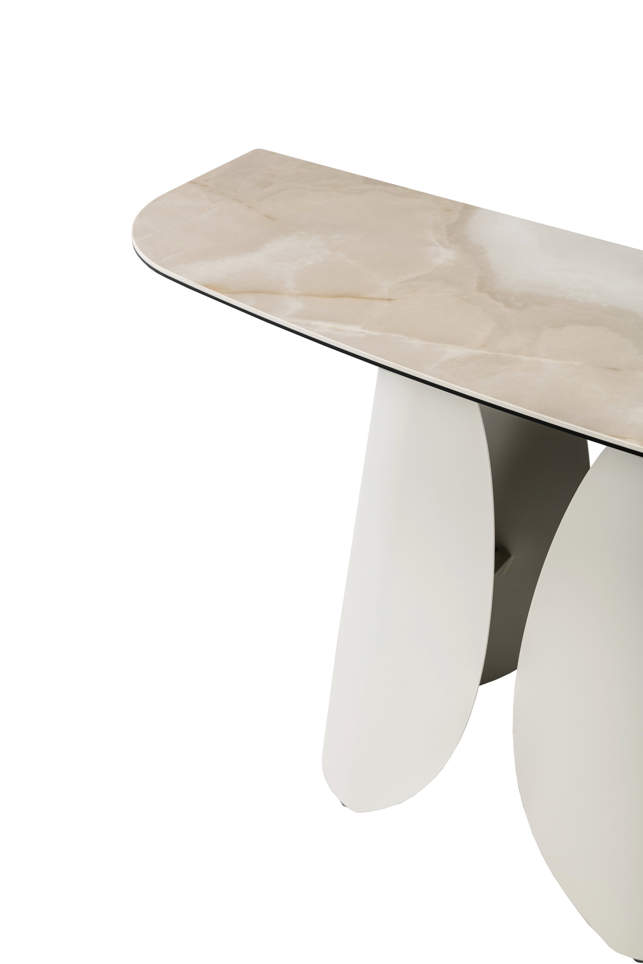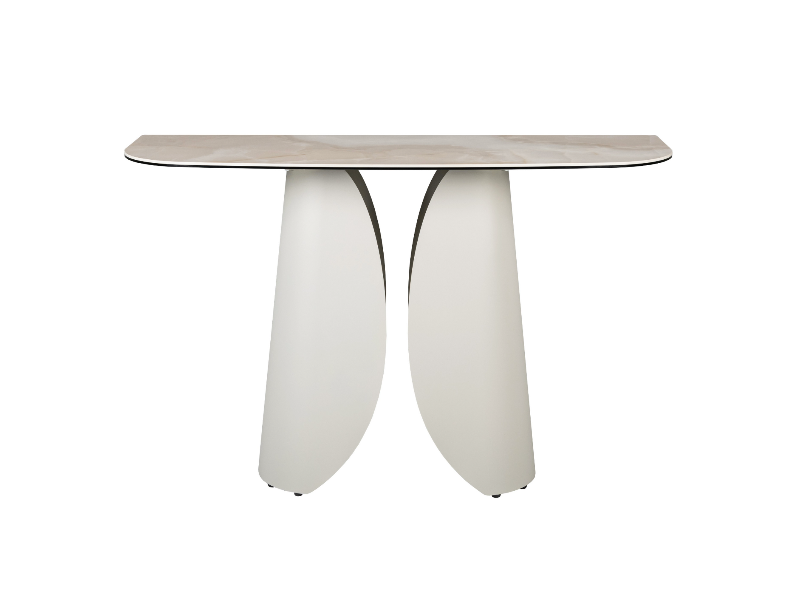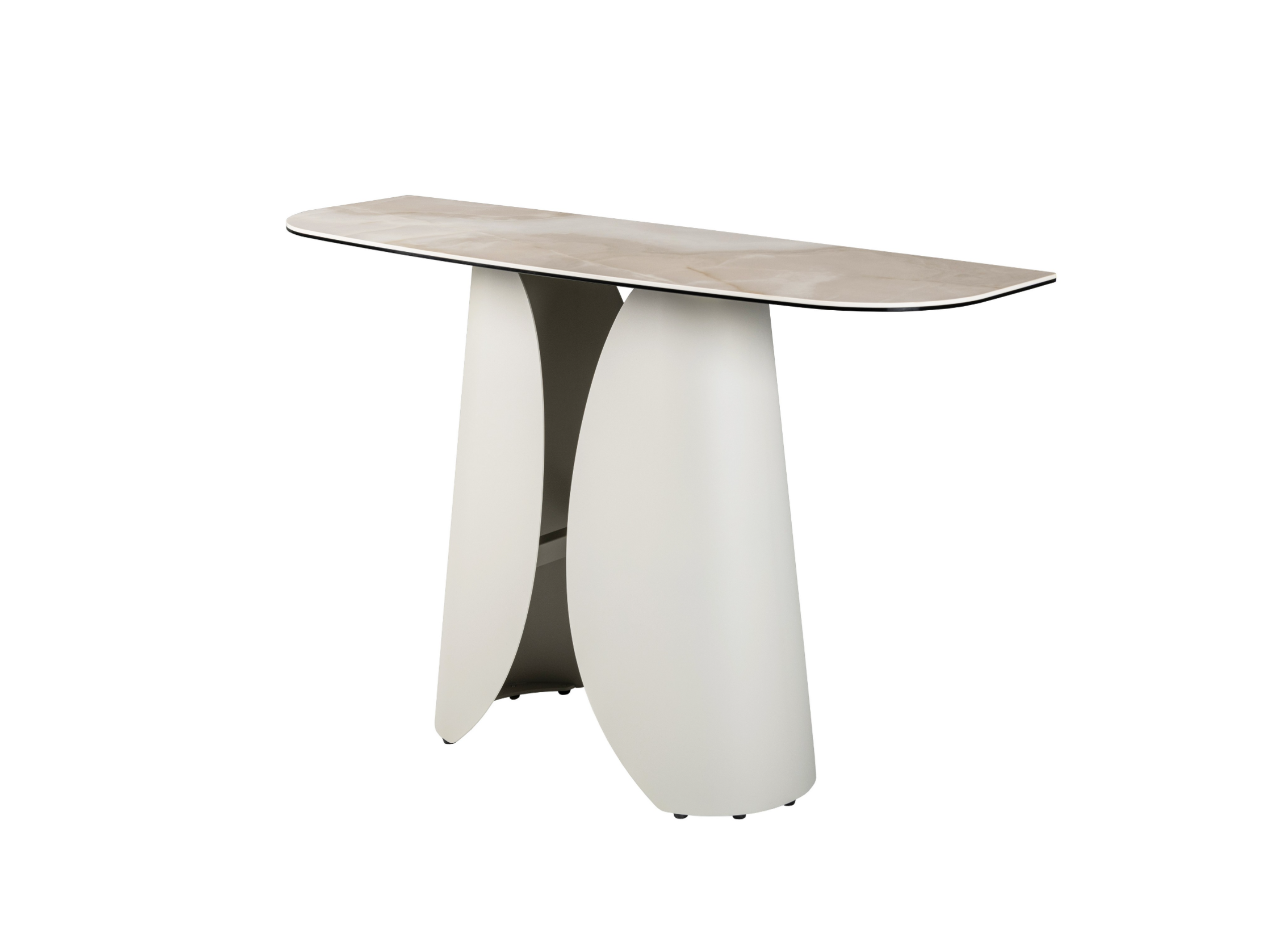 Металева основа, пофарбована в тон айворі, додає конструкції візуальної легкості, стабільності та сучасного шарму. Завдяки продуманим пропорціям, консоль виглядає витончено, але водночас зберігає практичність — на ній зручно розміщувати декор, книги чи освітлення.