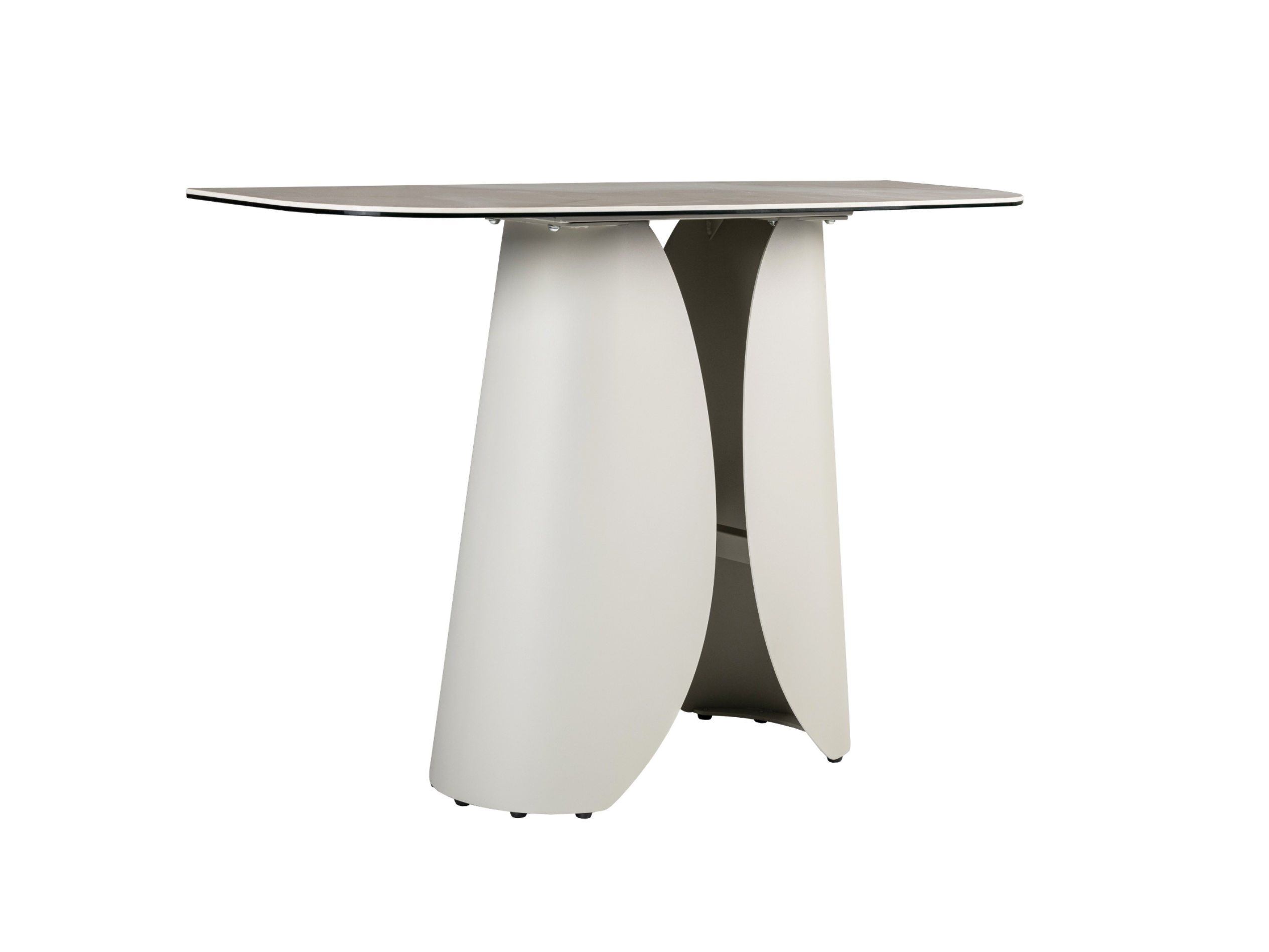 Стільниця з глянцевої кераміки у відтінку айворі онікс, поєднана з гартованим склом, зачаровує природною глибиною текстури та м’яким блиском, що нагадує світло на поверхні каменю.