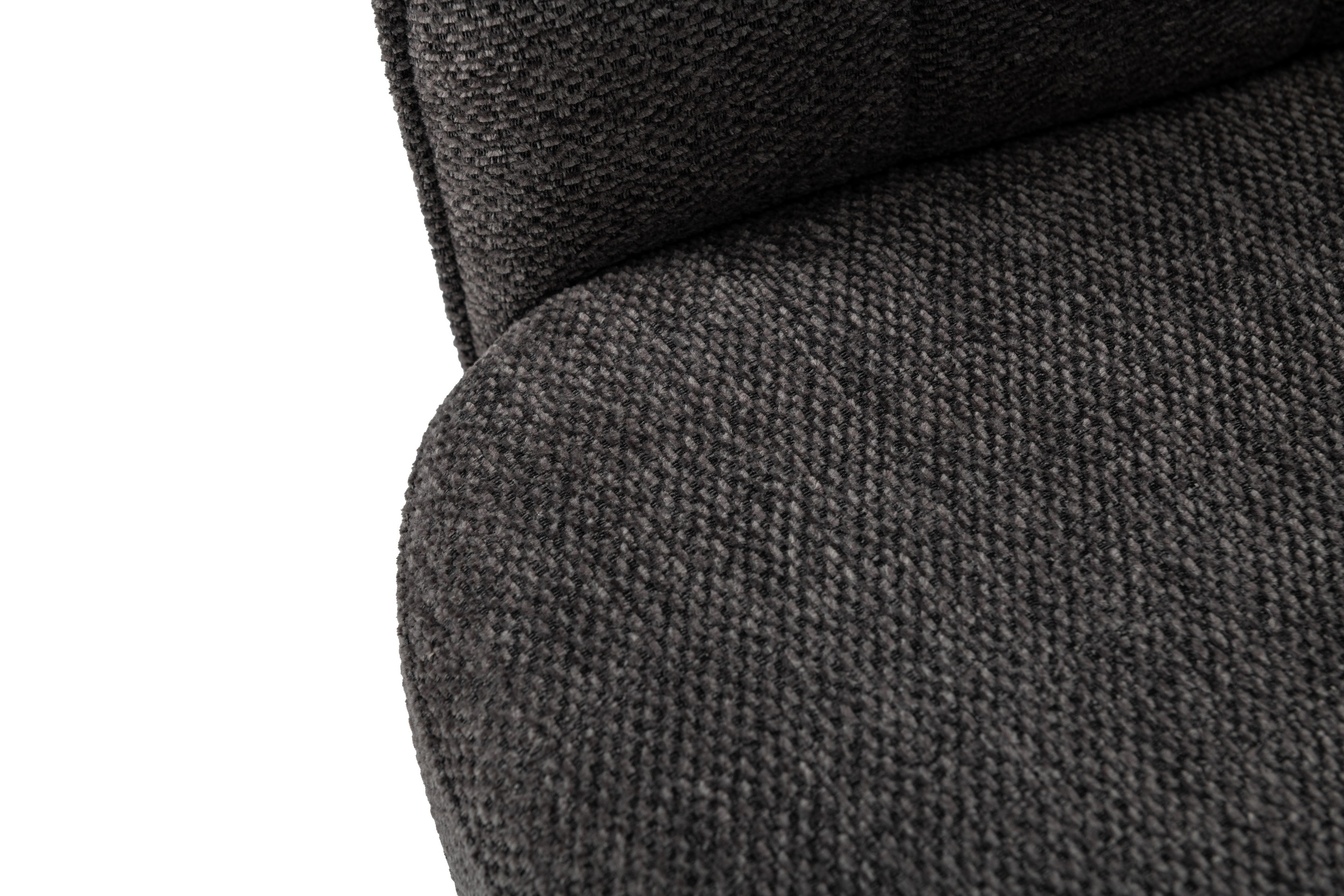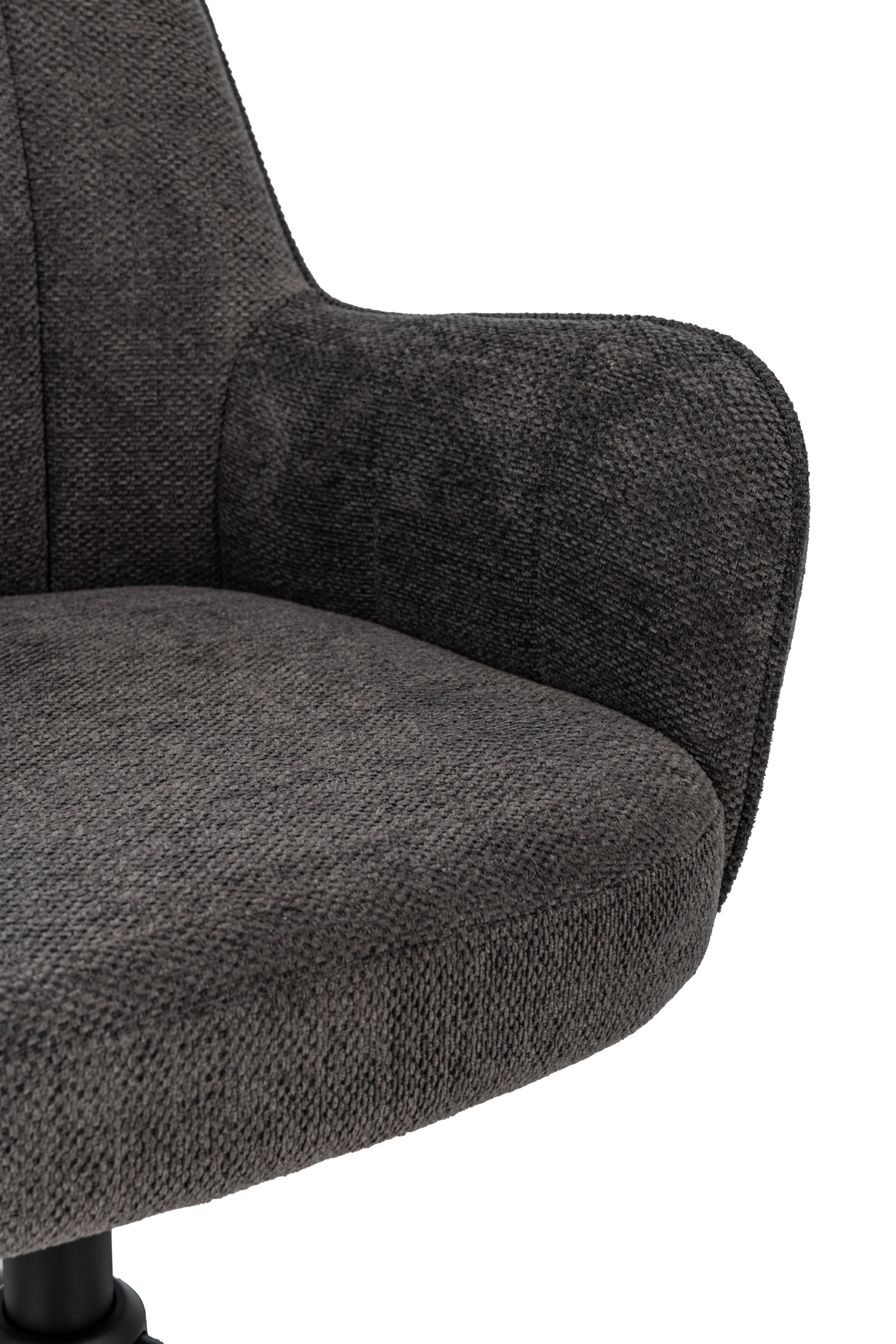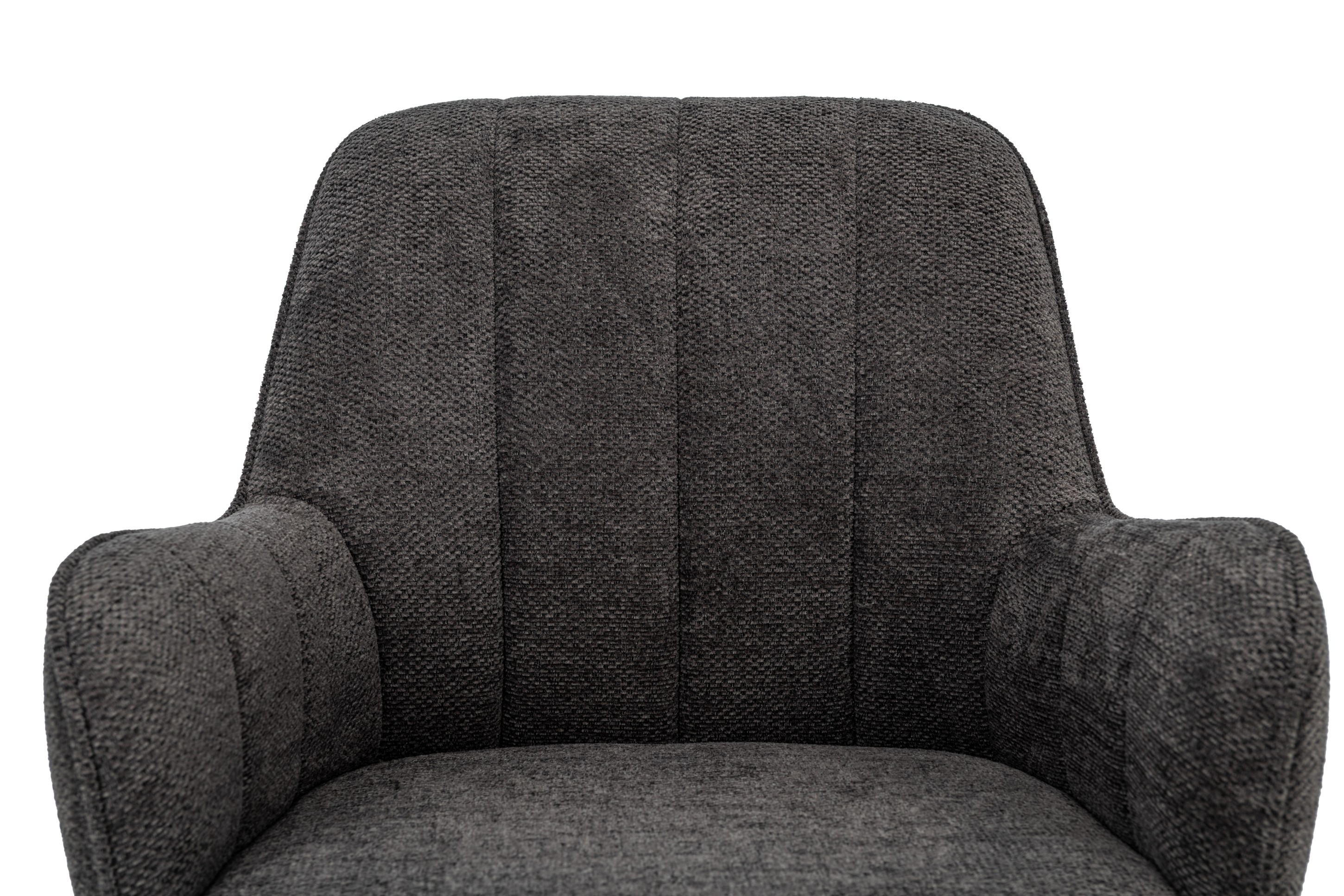 Оббивка з м’якого шенілу у відтінку темний графіт має приємну на дотик фактуру та вирізняється зносостійкістю, зберігаючи елегантний вигляд навіть після тривалого використання. Ергономічна форма спинки забезпечує підтримку хребта, а м’яке сидіння сприяє комфортному положенню тіла протягом робочого дня.