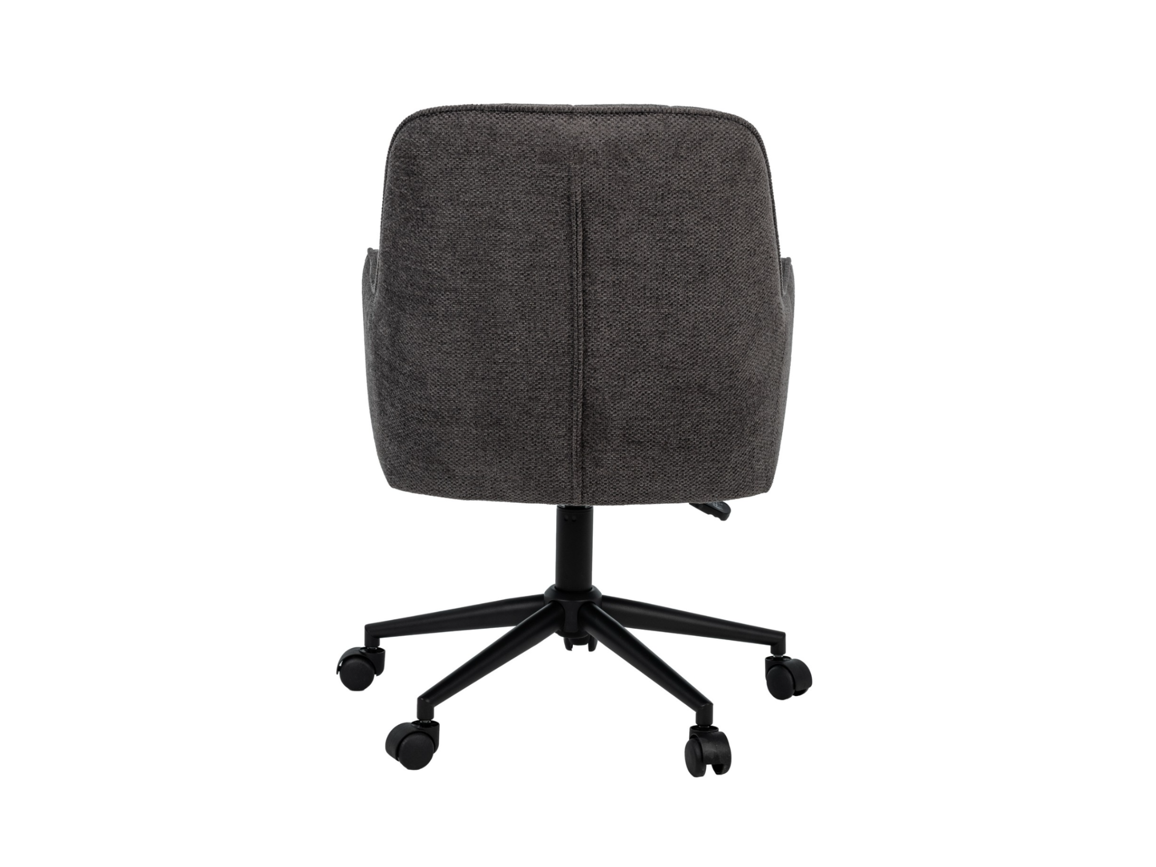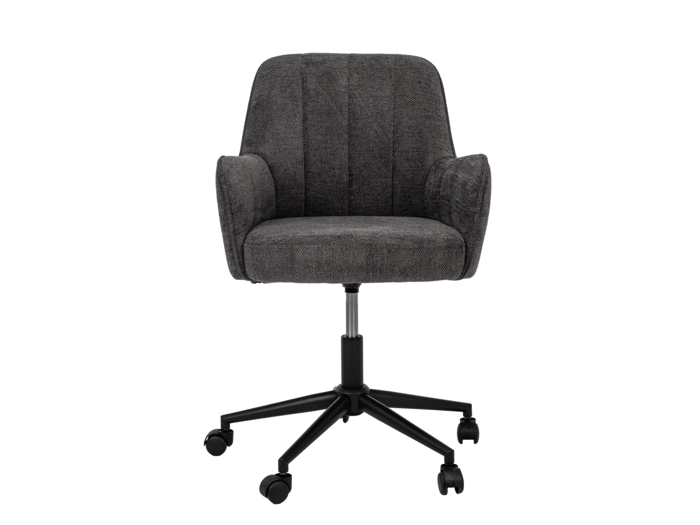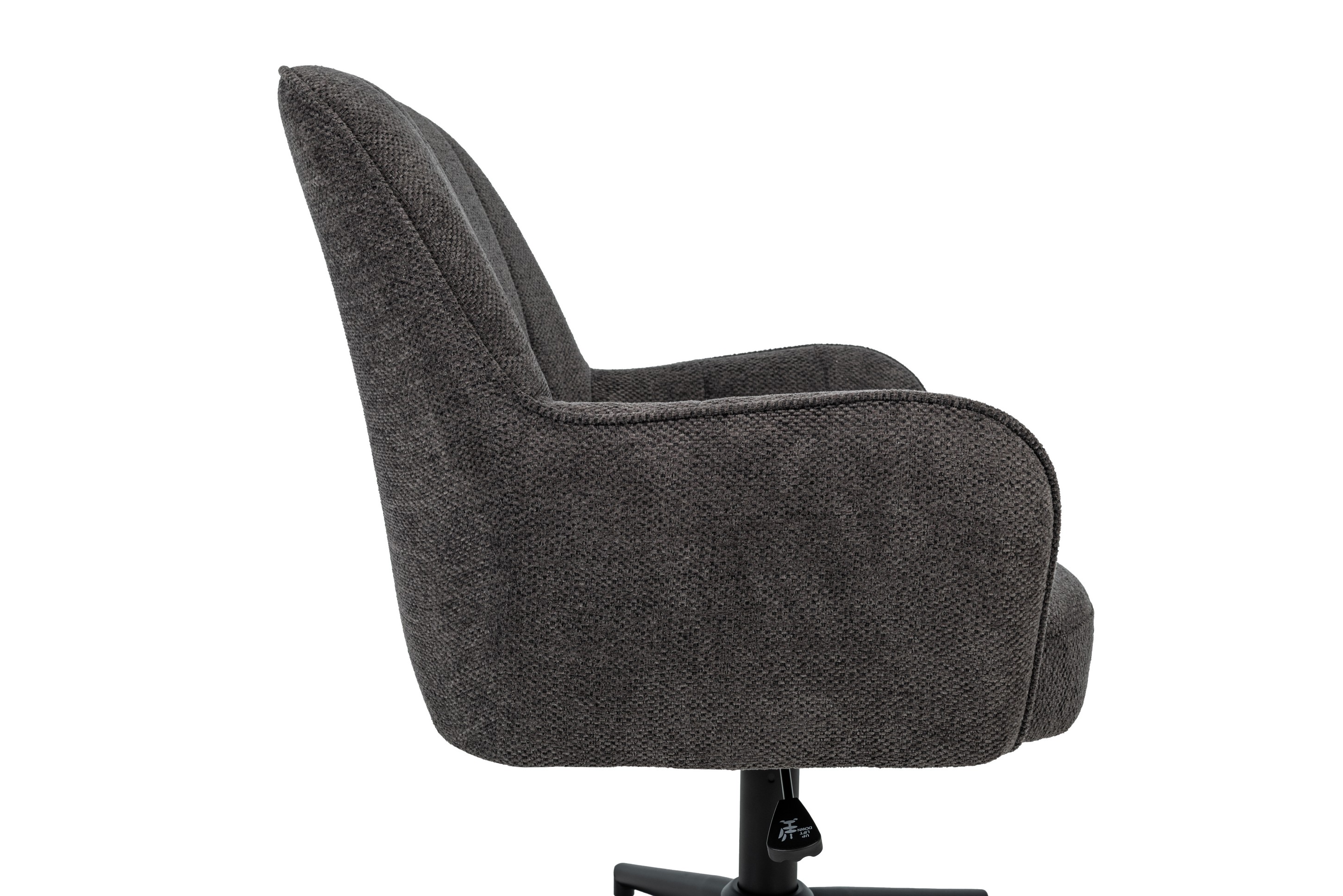 Оббивка з м’якого шенілу у відтінку темний графіт має приємну на дотик фактуру та вирізняється зносостійкістю, зберігаючи елегантний вигляд навіть після тривалого використання. Ергономічна форма спинки забезпечує підтримку хребта, а м’яке сидіння сприяє комфортному положенню тіла протягом робочого дня.