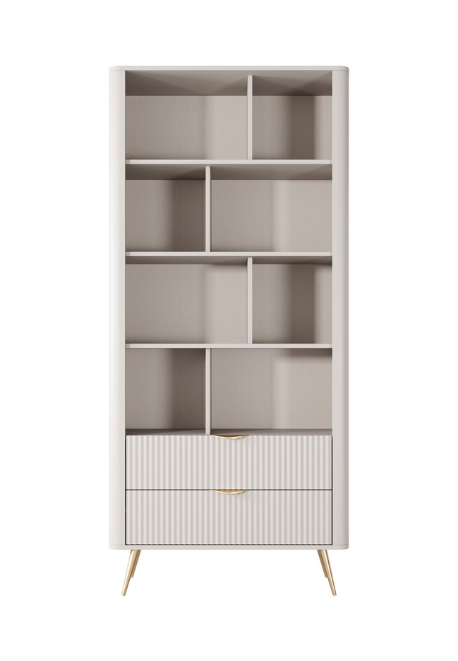 Стелаж Lante (беж) – Стелаж Lante який дуже гарно буде пасувати до Вашого інтер’єру. Теплий бежевий колір привносить в інтер'єр спокій і рівновагу, ідеально поєднуючись із золотими акцентами, роблячи кімнату затишною та елегантною водночас. Тим часом, вигнуті краї та рифлені фасади додають меблям сучасного та оригінального вигляду. Задня стінка книжкової шафи виготовлена з HDF бежевого кольору з текстурою під дерево. Lante - це набір, створений для тих, хто любить сучасні форми і витончені кольори в "витонченому" виконанні.