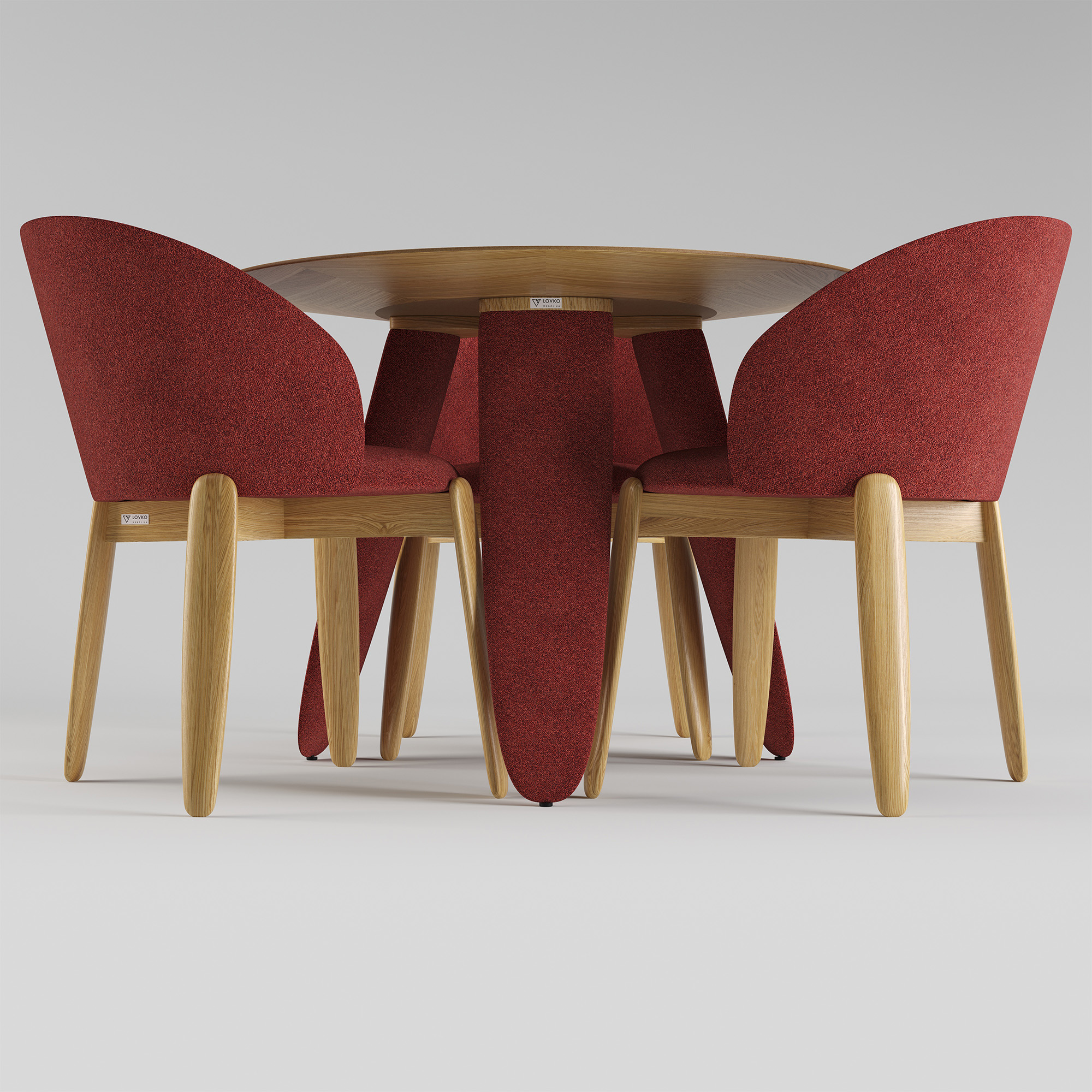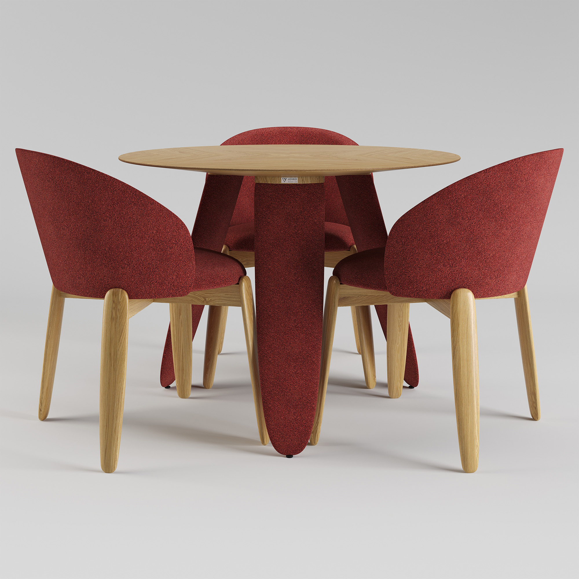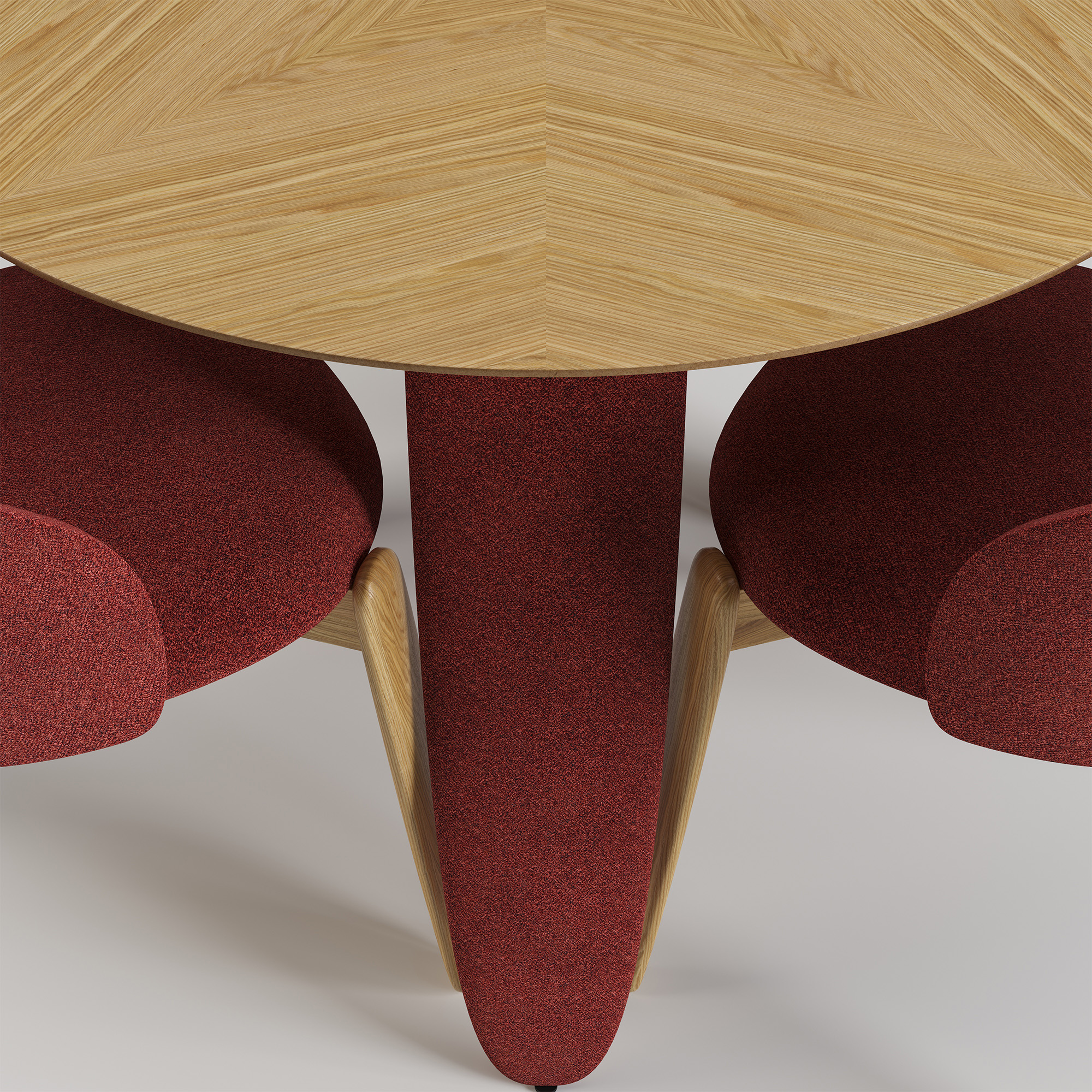 Три масивні ніжки незвичної форми створюють візуальну легкість і водночас стабільність конструкції. Вони виконані з деревини та обтягнуті тканиною, що додає м’якості лініям і робить дизайн теплішим і тактильнішим.