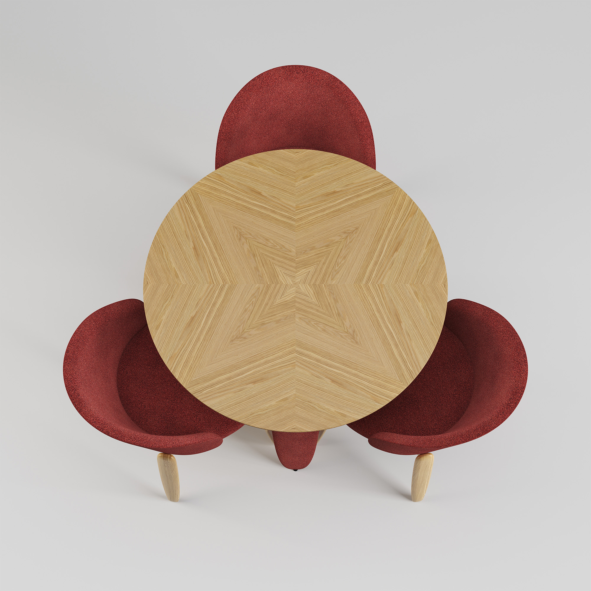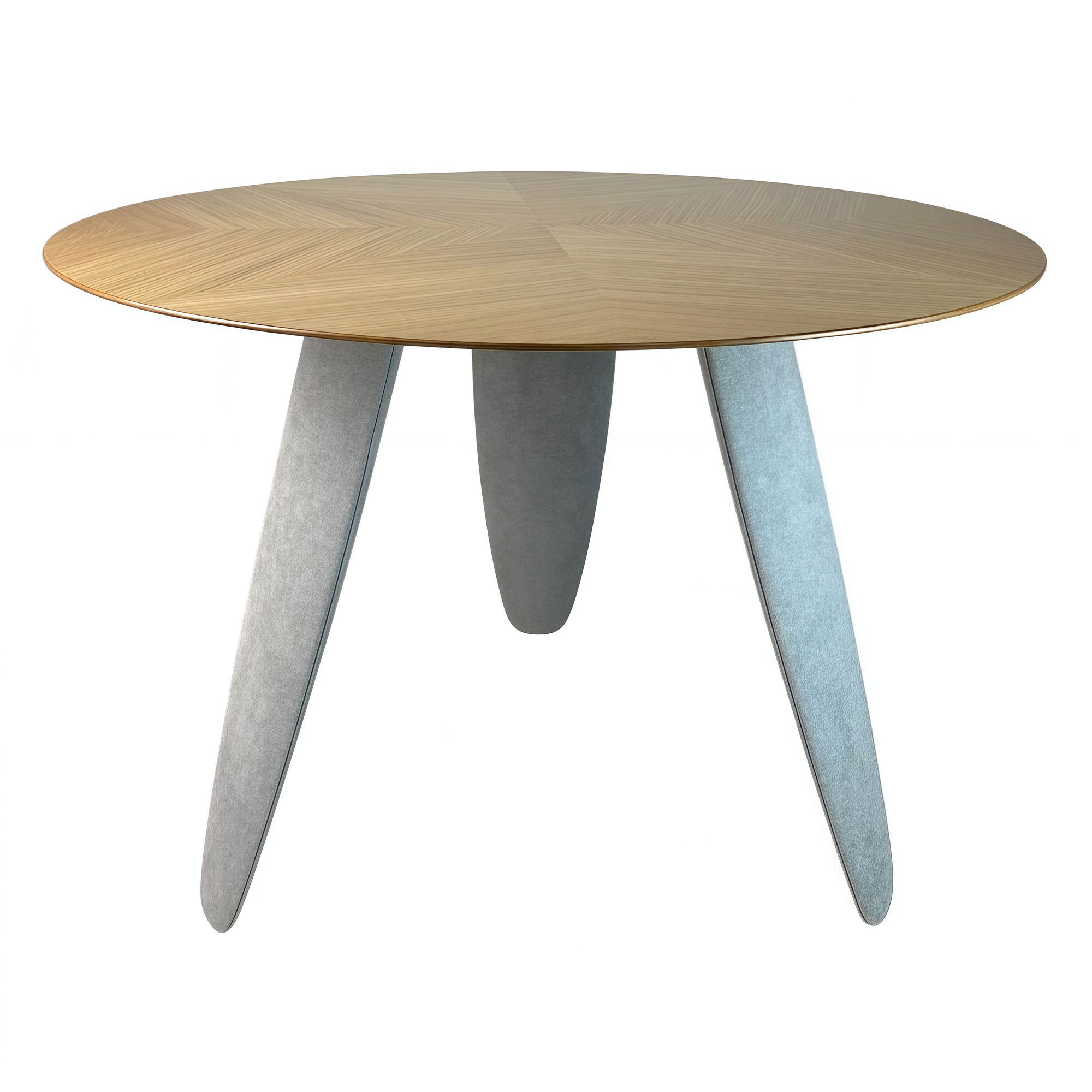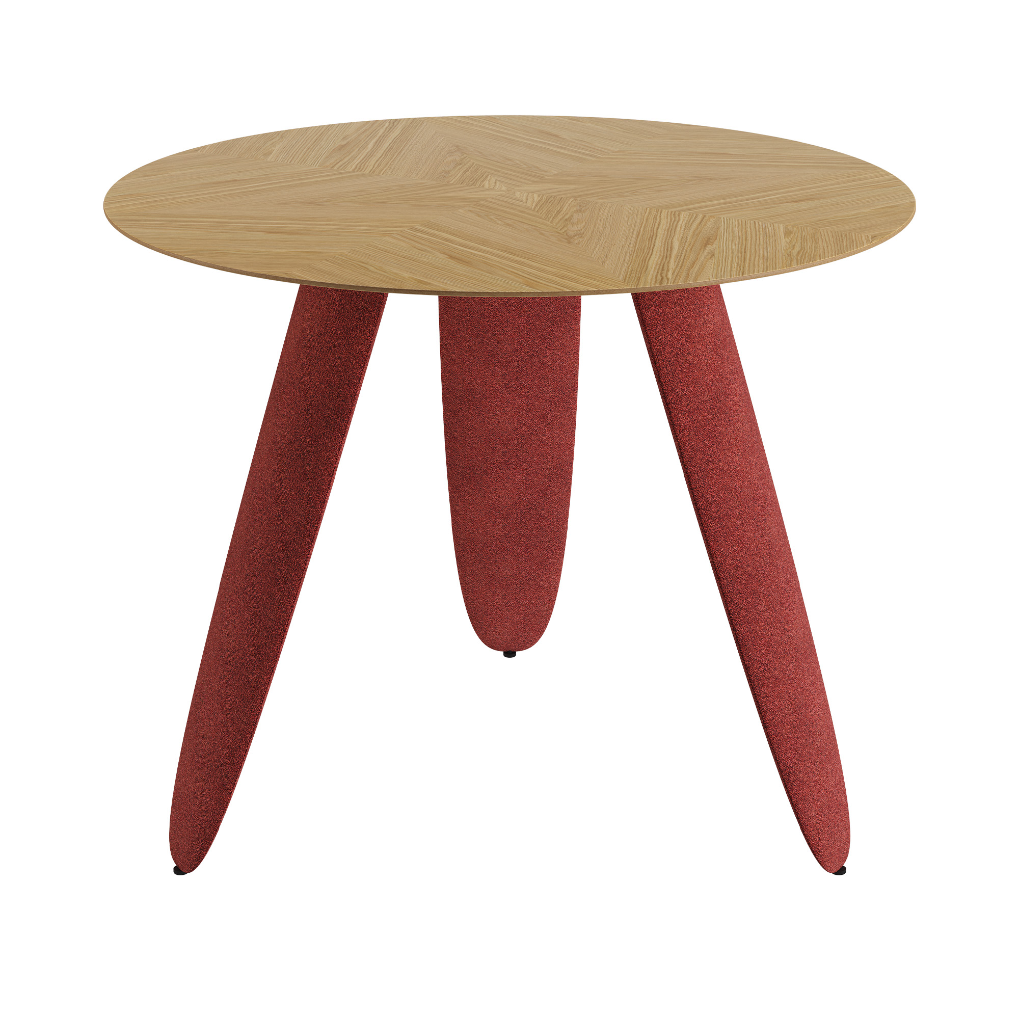 Три масивні ніжки незвичної форми створюють візуальну легкість і водночас стабільність конструкції. Вони виконані з деревини та обтягнуті тканиною, що додає м’якості лініям і робить дизайн теплішим і тактильнішим.