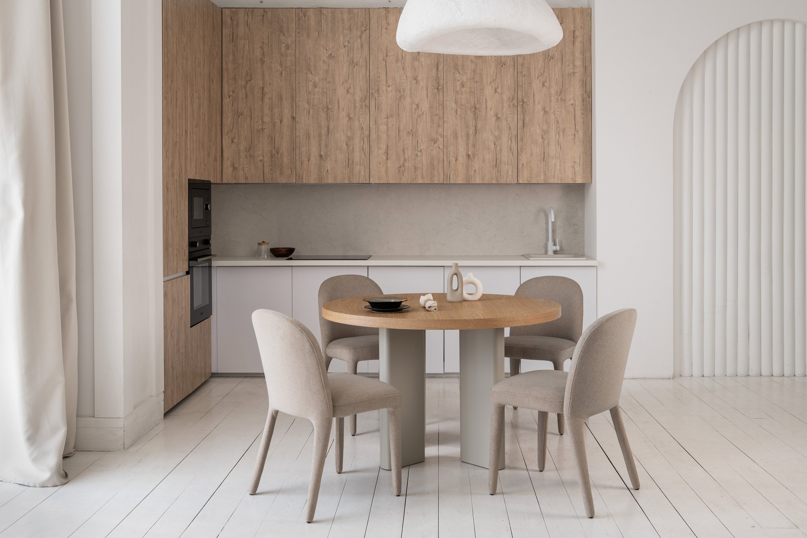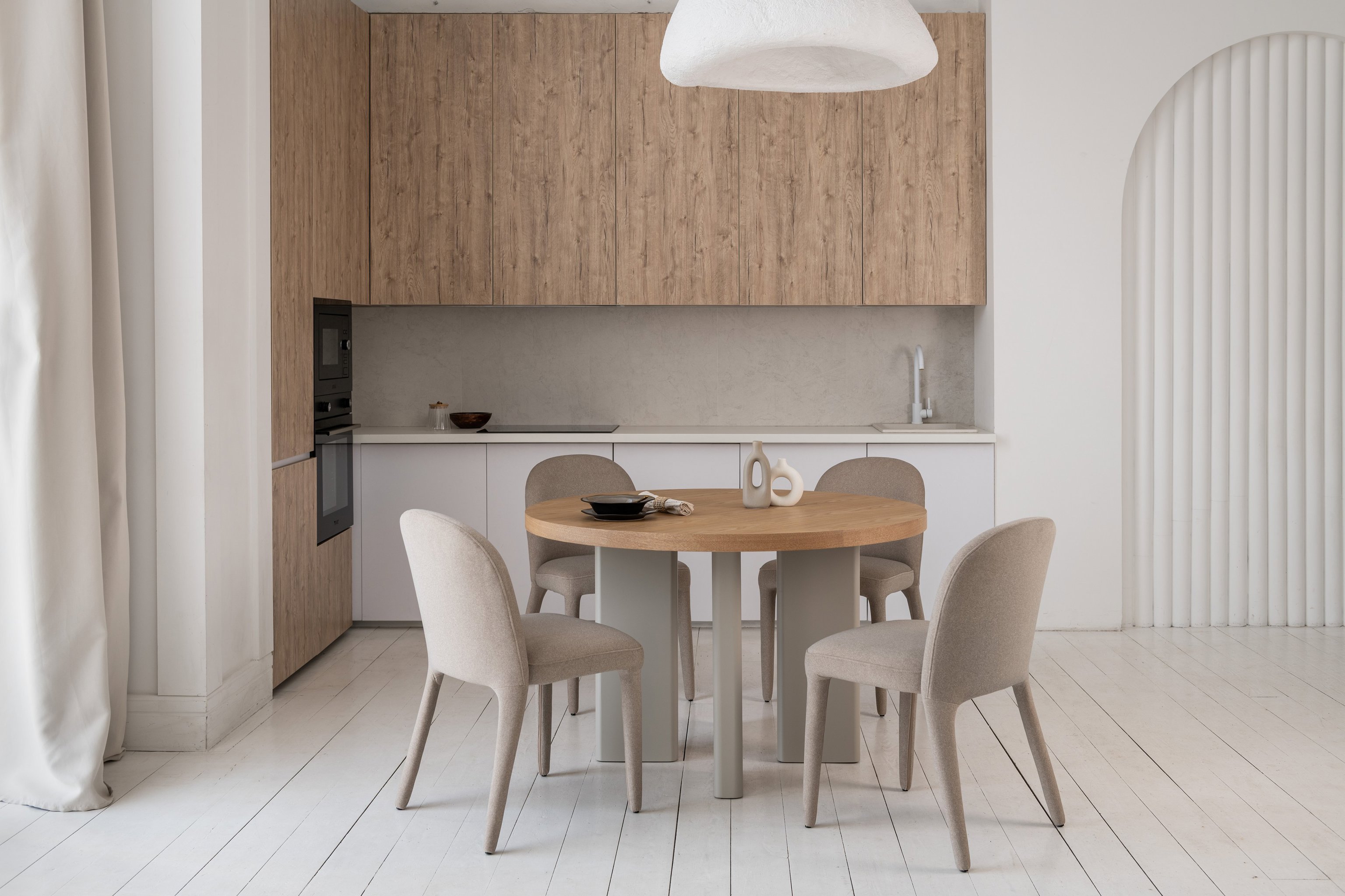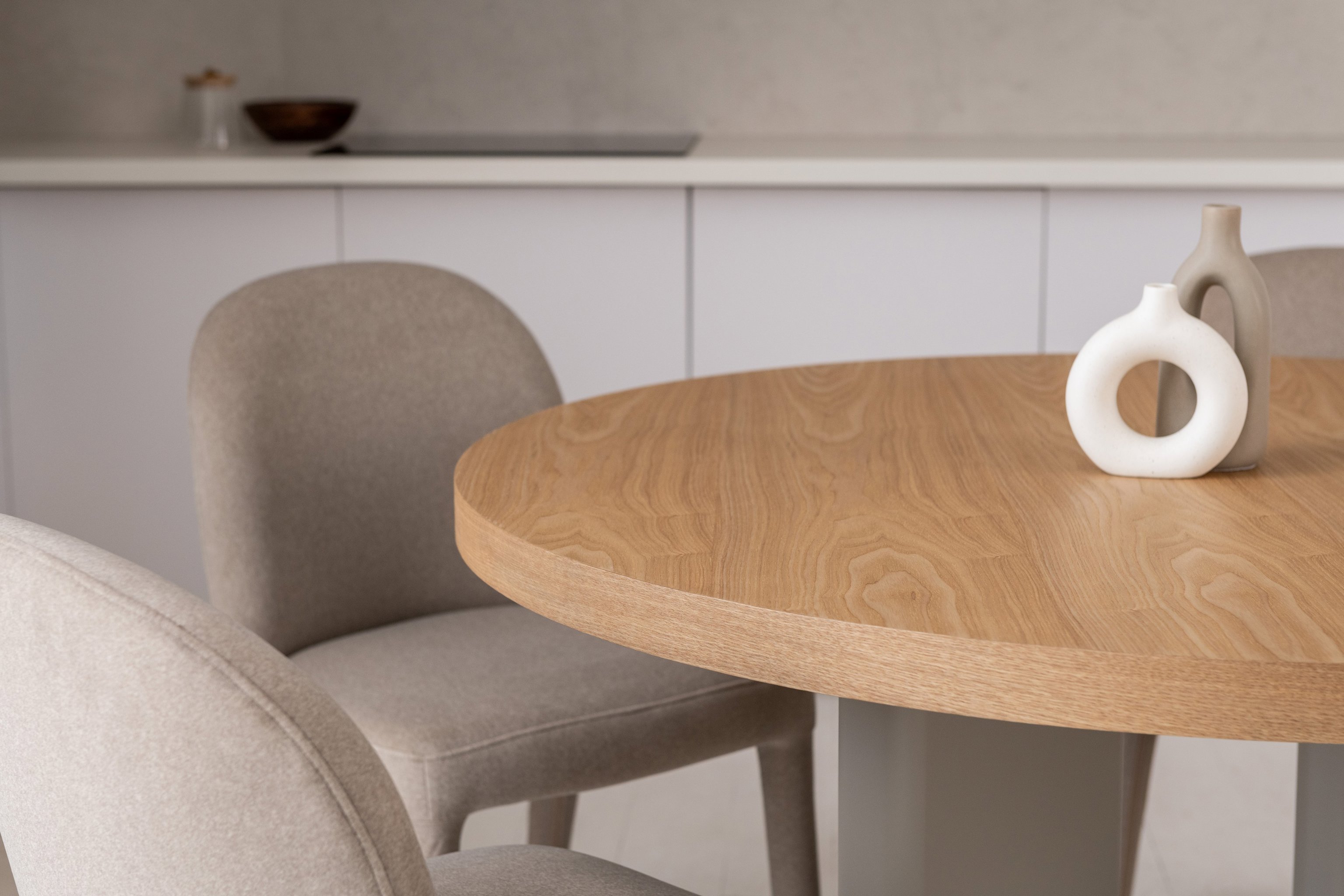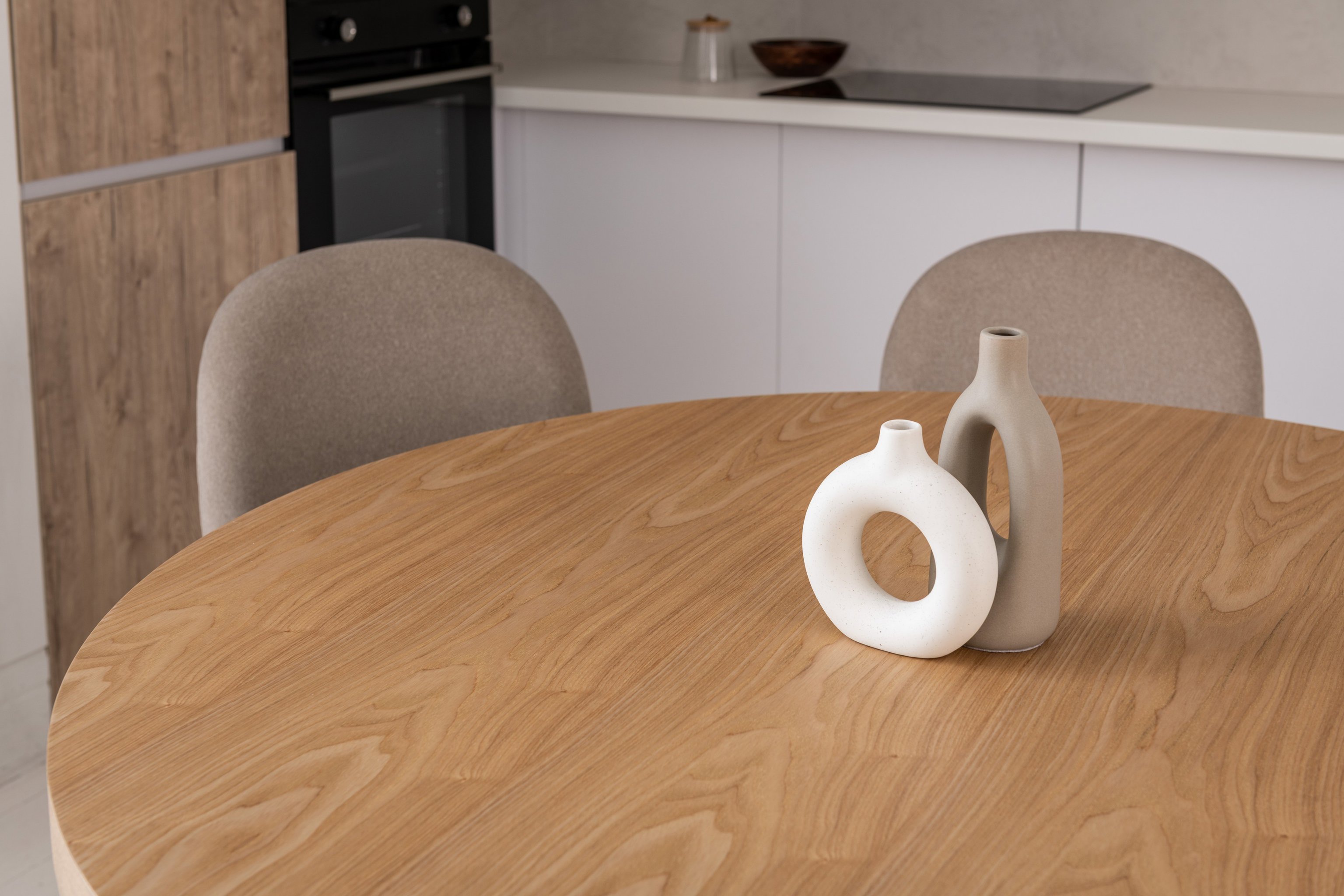 Кругла стільниця діаметром 120 см виготовлена зі шпонованого МДФ у відтінку “ясень”, що додає виробу природного шарму та тепла.