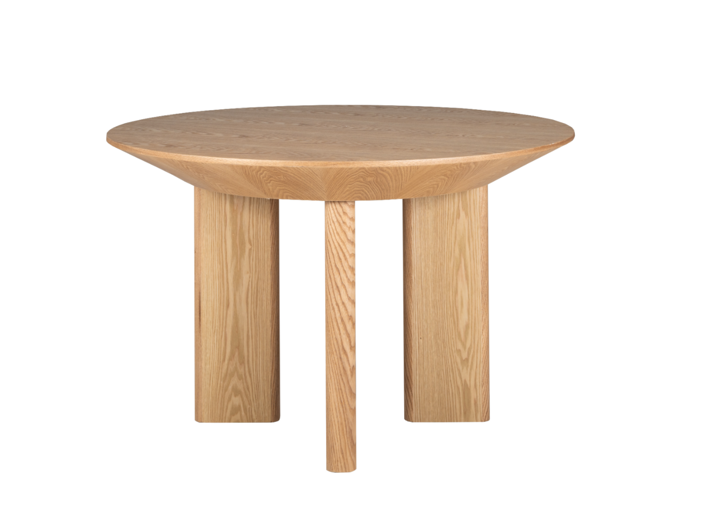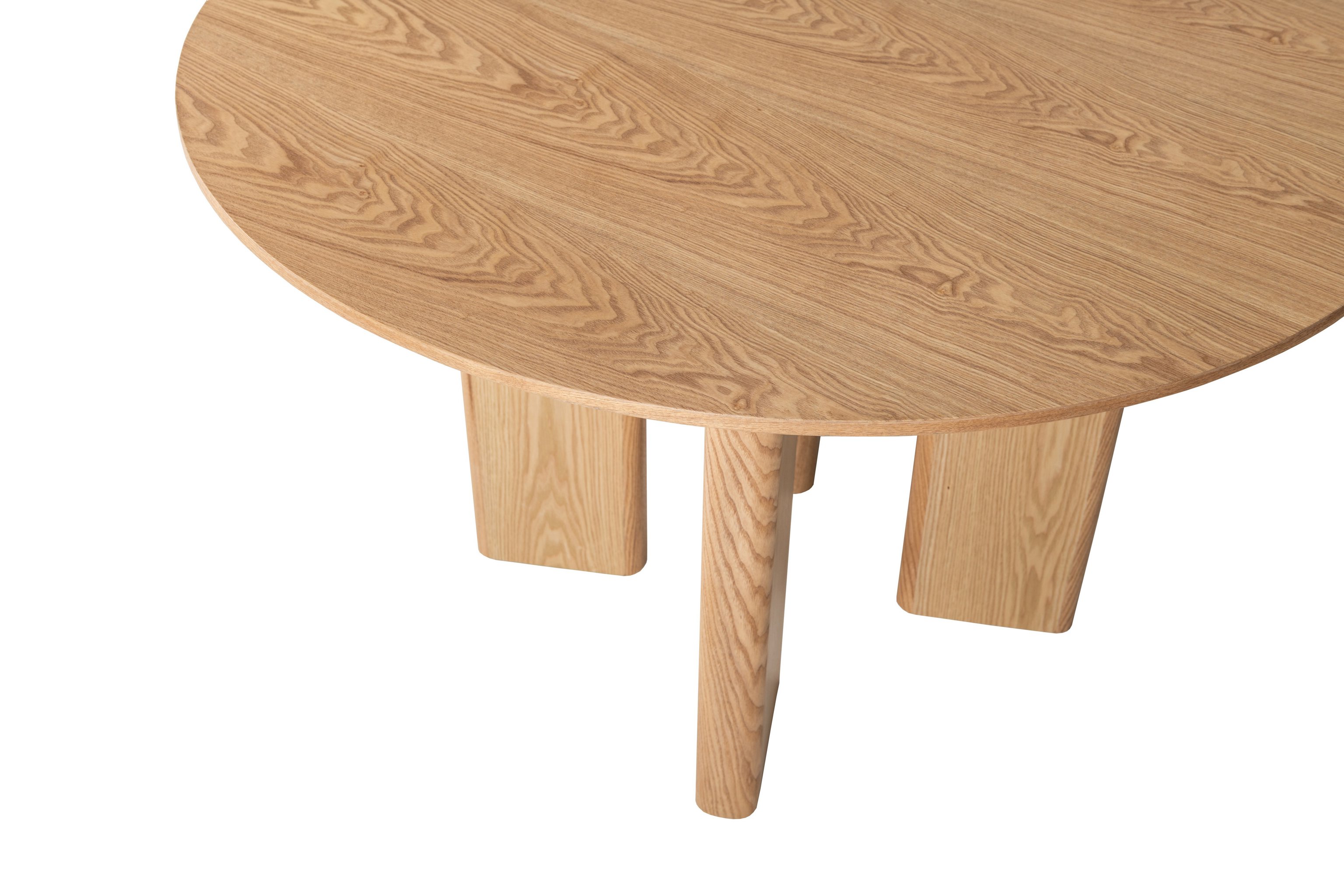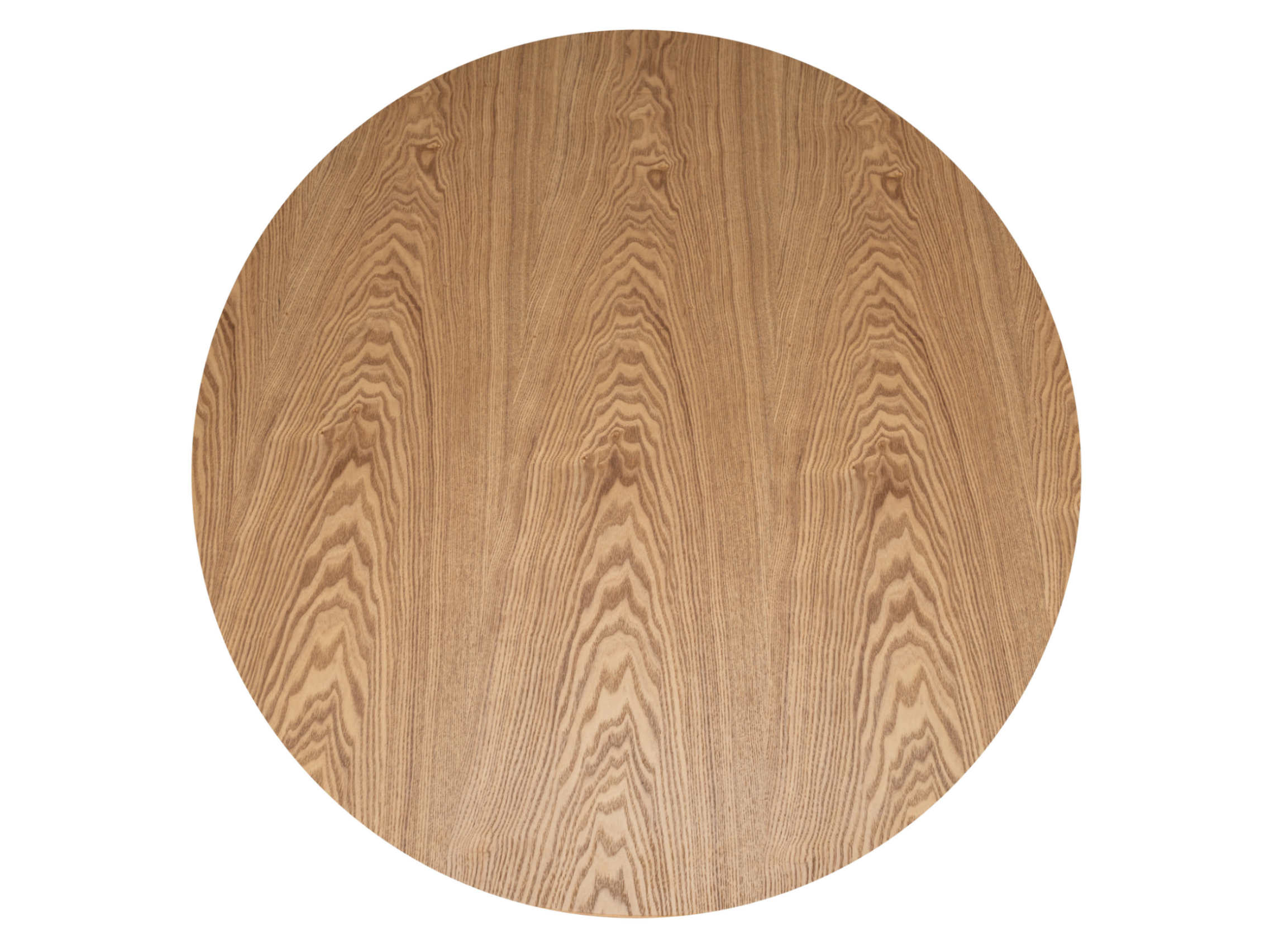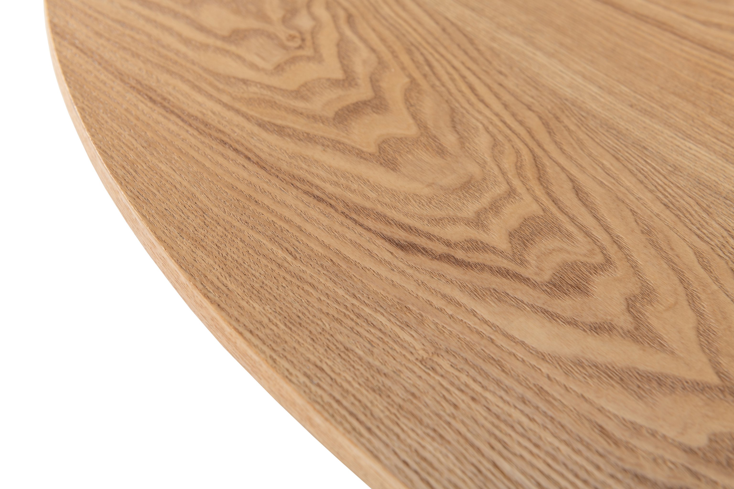 Кругла стільниця діаметром 120 см виконана зі шпонованого МДФ у природному відтінку "ясень", що додає інтер’єру тепла та затишку.
